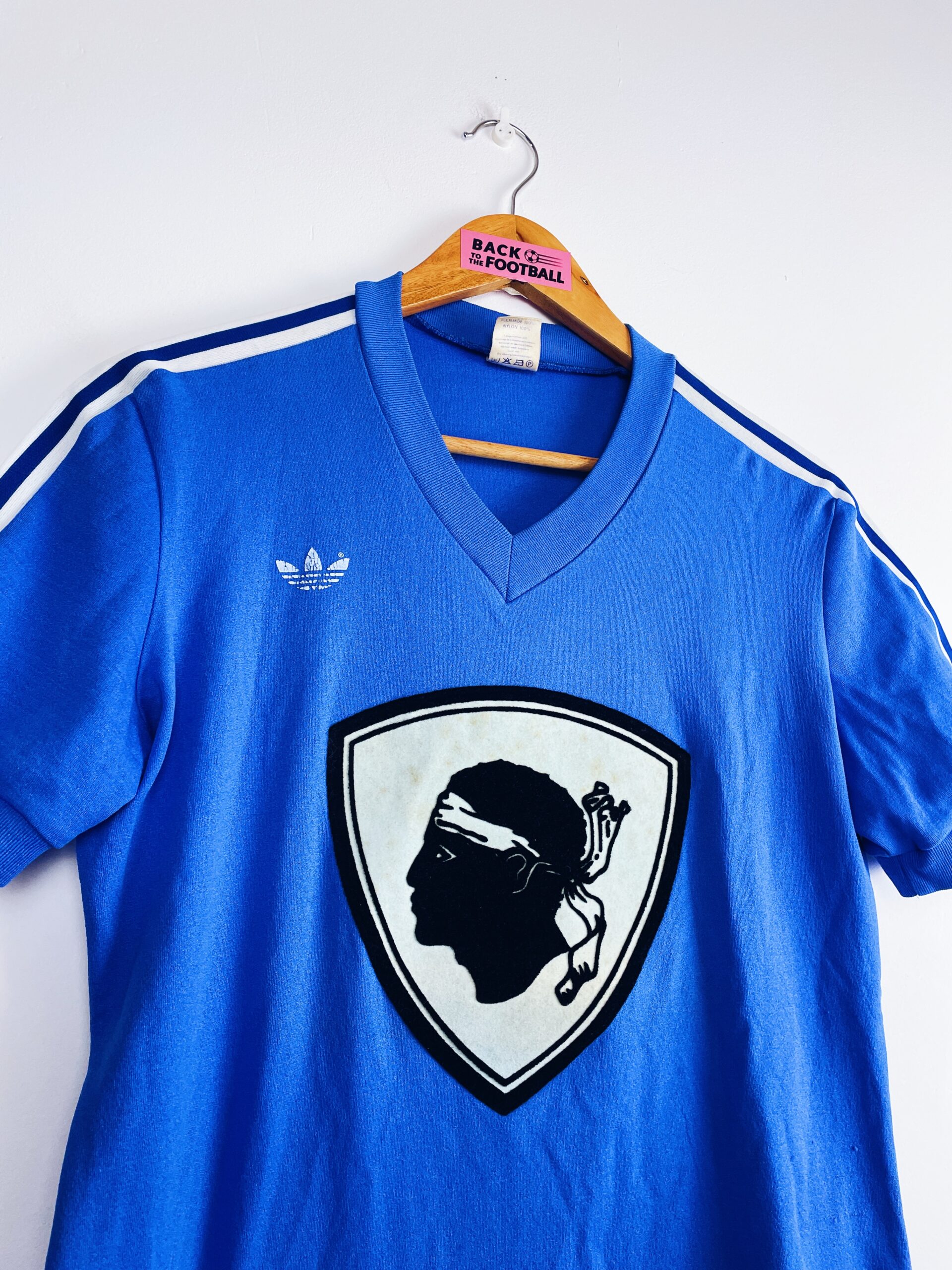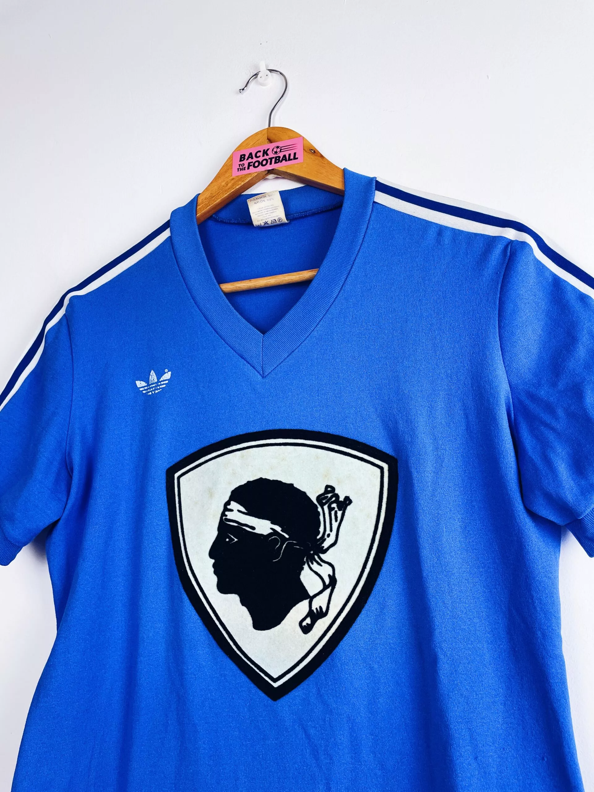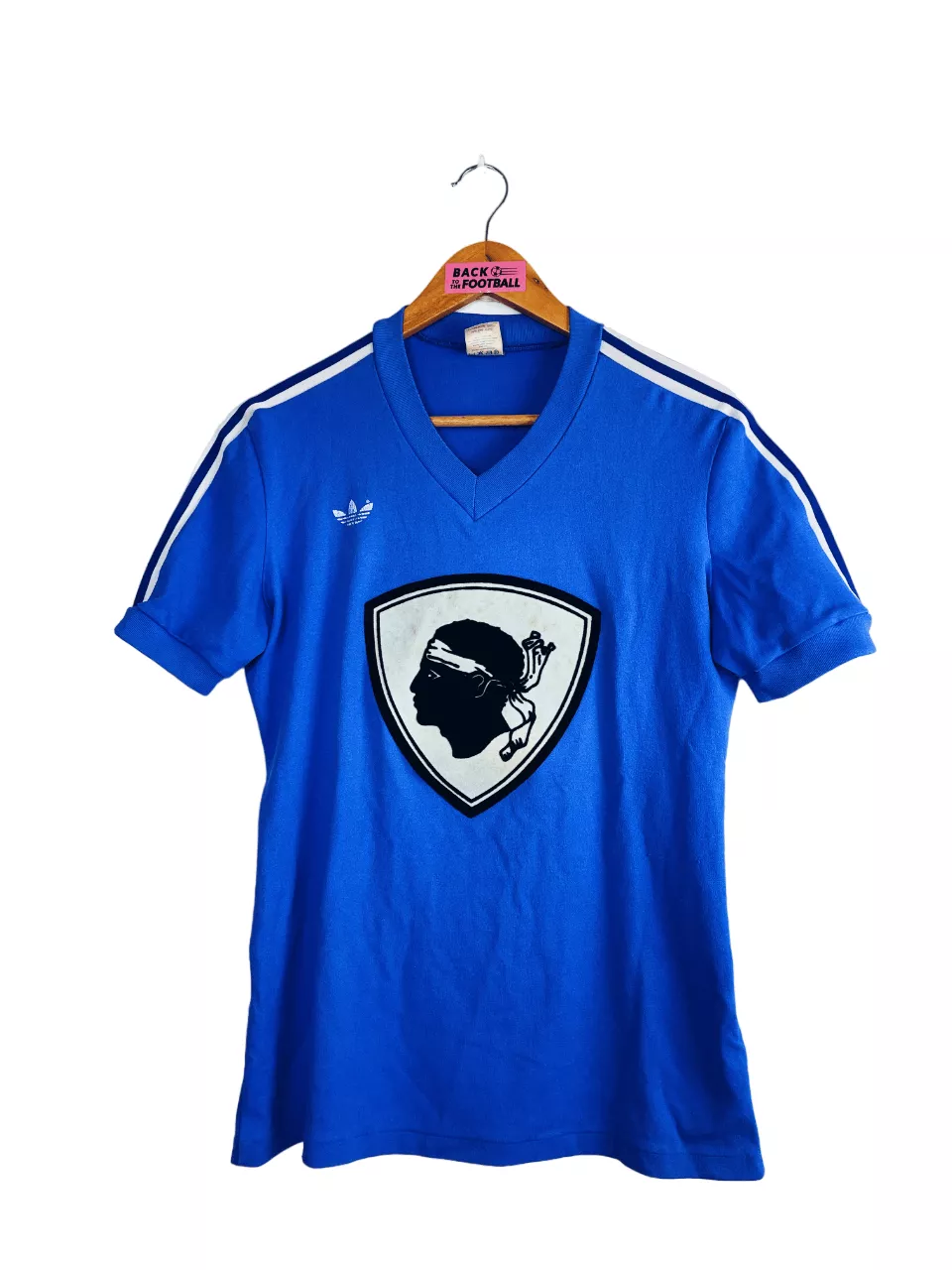 Taille : M Largeur : 51cm (aisselle à aisselle) Longueur : 67cm (base du col au bas) Si tu veux plus de détails, tu peux nous contacter par mail ou sur les réseaux 😉 Etat : 7.5/10, très bon état hormis le logo Adidas abimé, quelques traces sur la feutrine de la tête de Maure (voir photos) Le maillot : maillot vintage domicile du SC Bastia 1977/1978 (à l’époque le SEC Bastia). L’écusson à tête de Maure est en feutrine, le logo Adidas est floqué. Production Ventex donc made in France. Il y a eu beaucoup de différents maillots de…