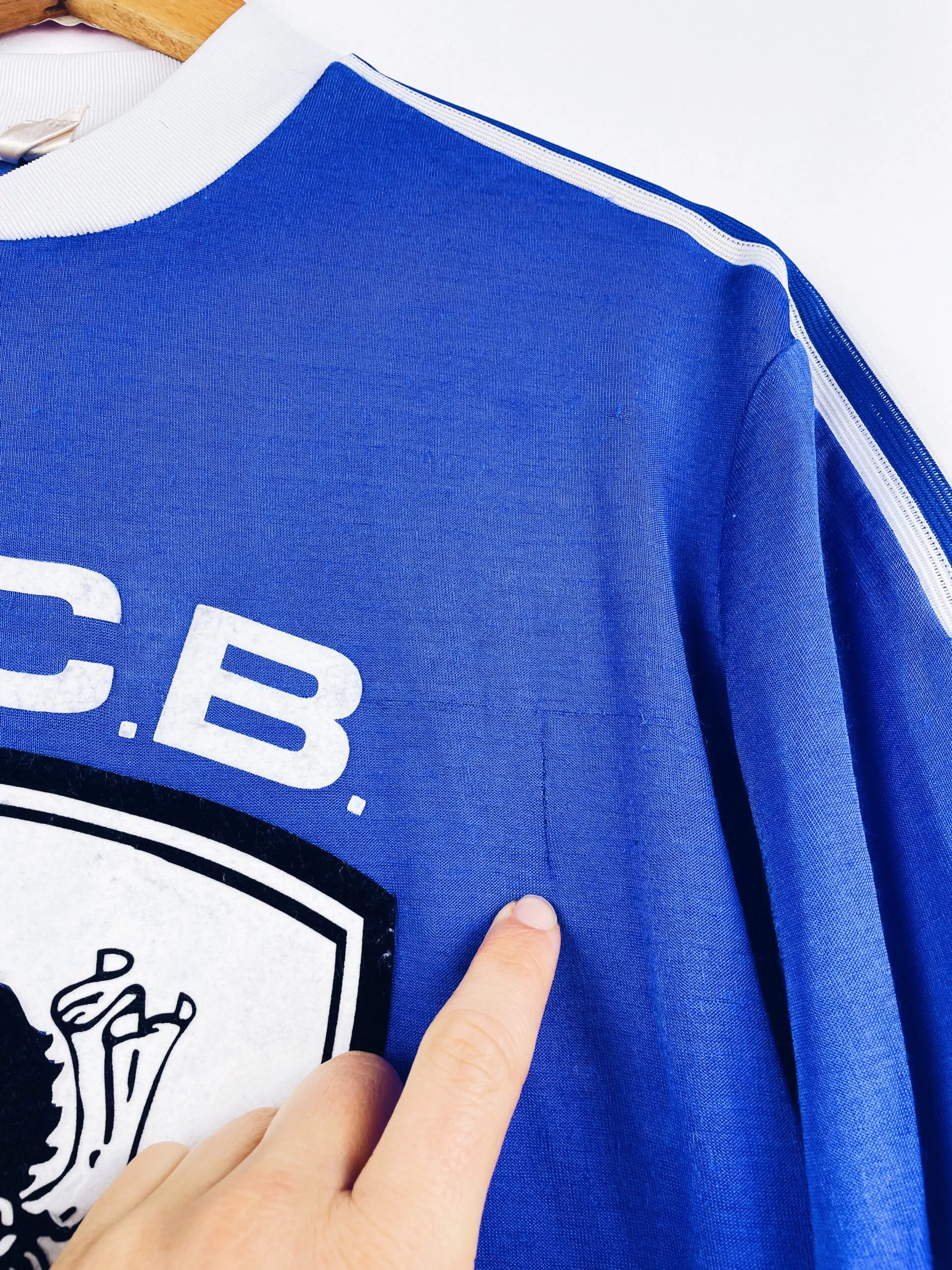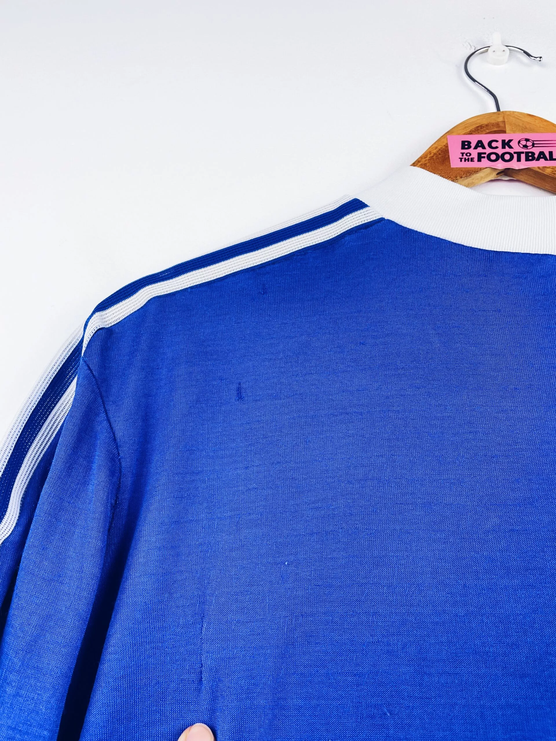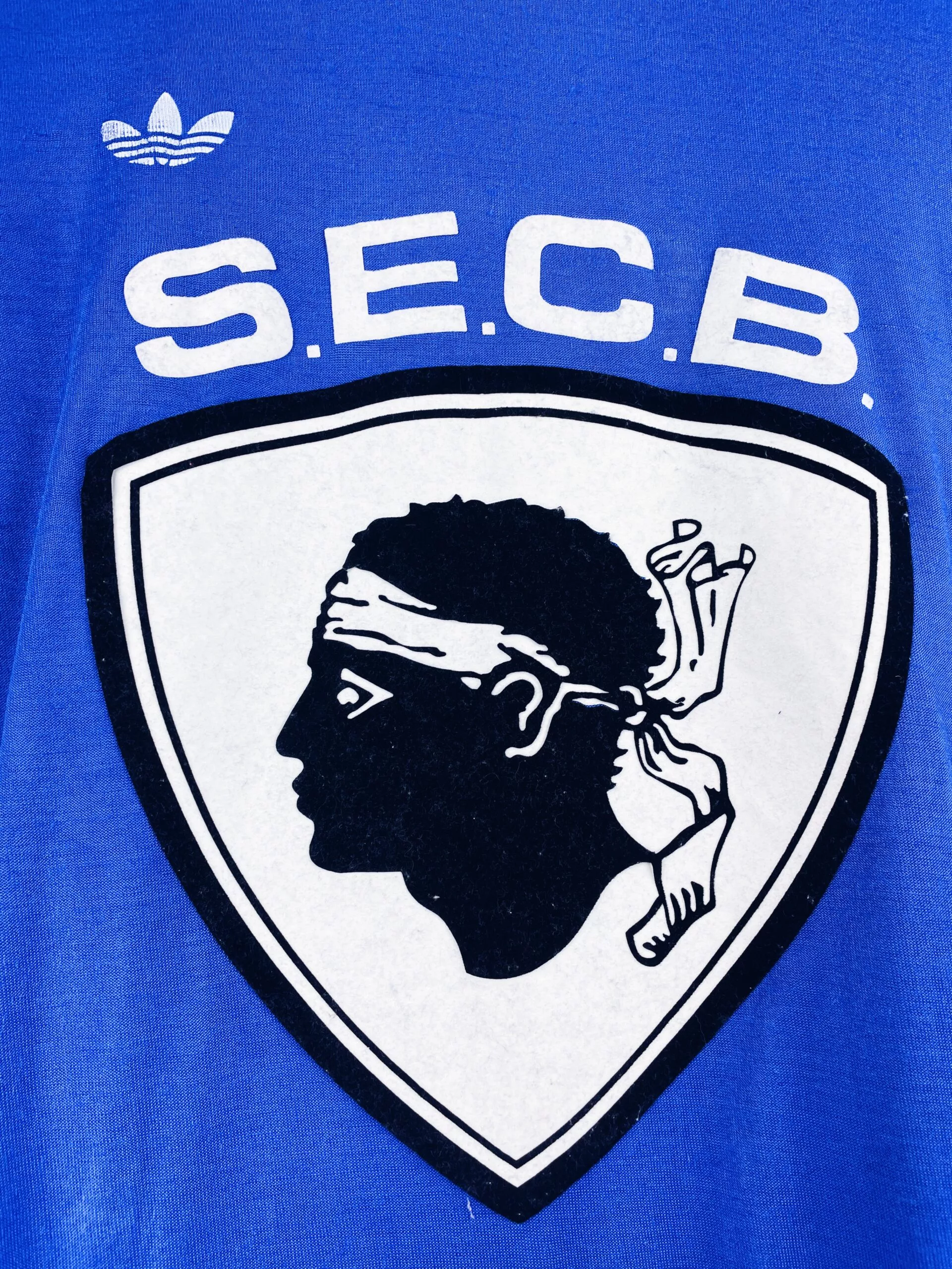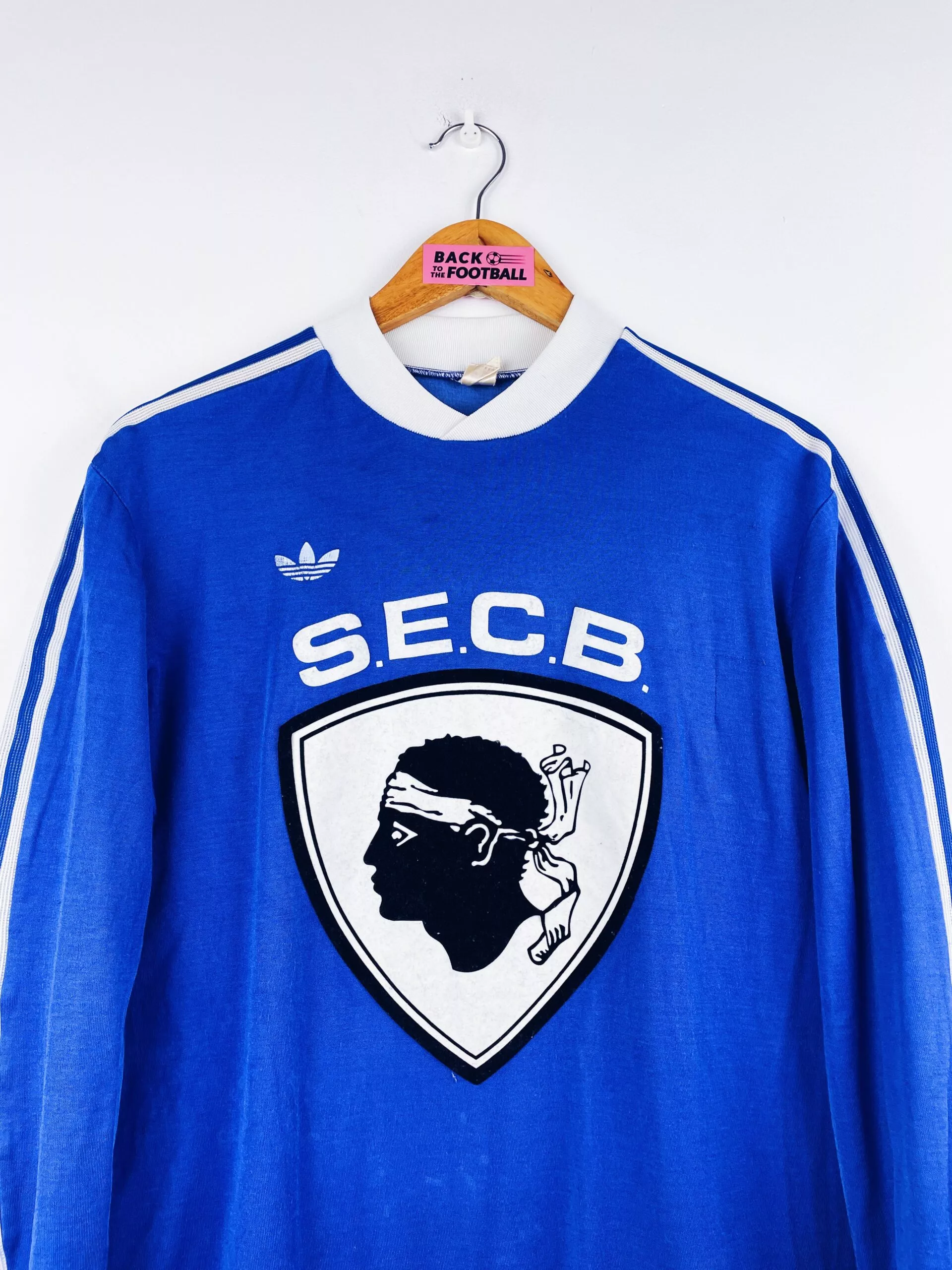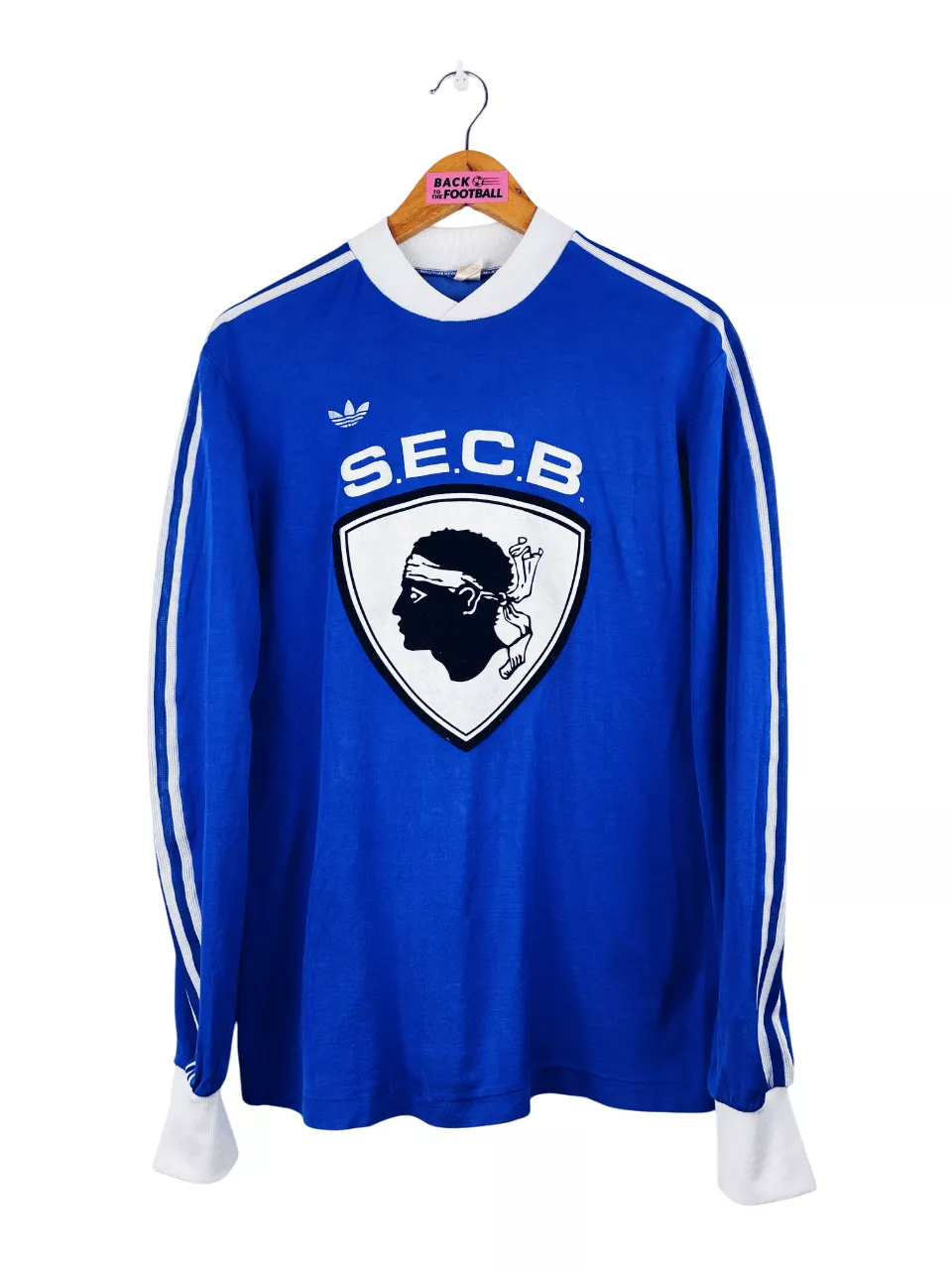Taille : M Largeur : 52cm (aisselle à aisselle) Longueur : 70cm (base du col au bas) Si tu veux plus de détails, tu peux nous contacter par mail ou sur les réseaux 😉 Etat : 7.5/10, très bon état pour son âge. Logo Adidas abimé, des accrocs (voir photos) Le maillot : maillot vintage domicile du SC Bastia 1977/1978 (à l’époque le SEC Bastia) manches longues. L’écusson à tête de Maure est en feutrine, le logo Adidas est floqué. Production Ventex donc made in France. Il y a eu beaucoup de différents maillots de Bastia dans ces années (col…