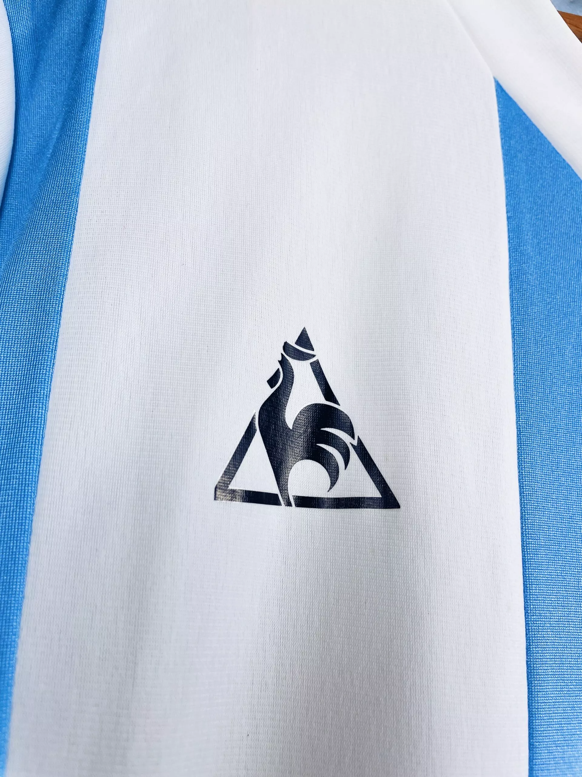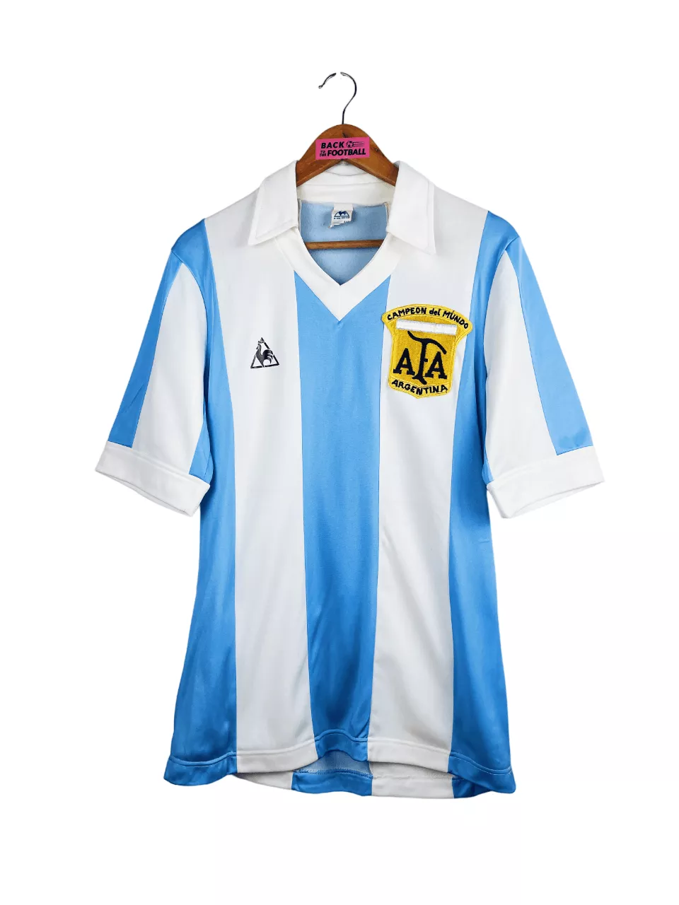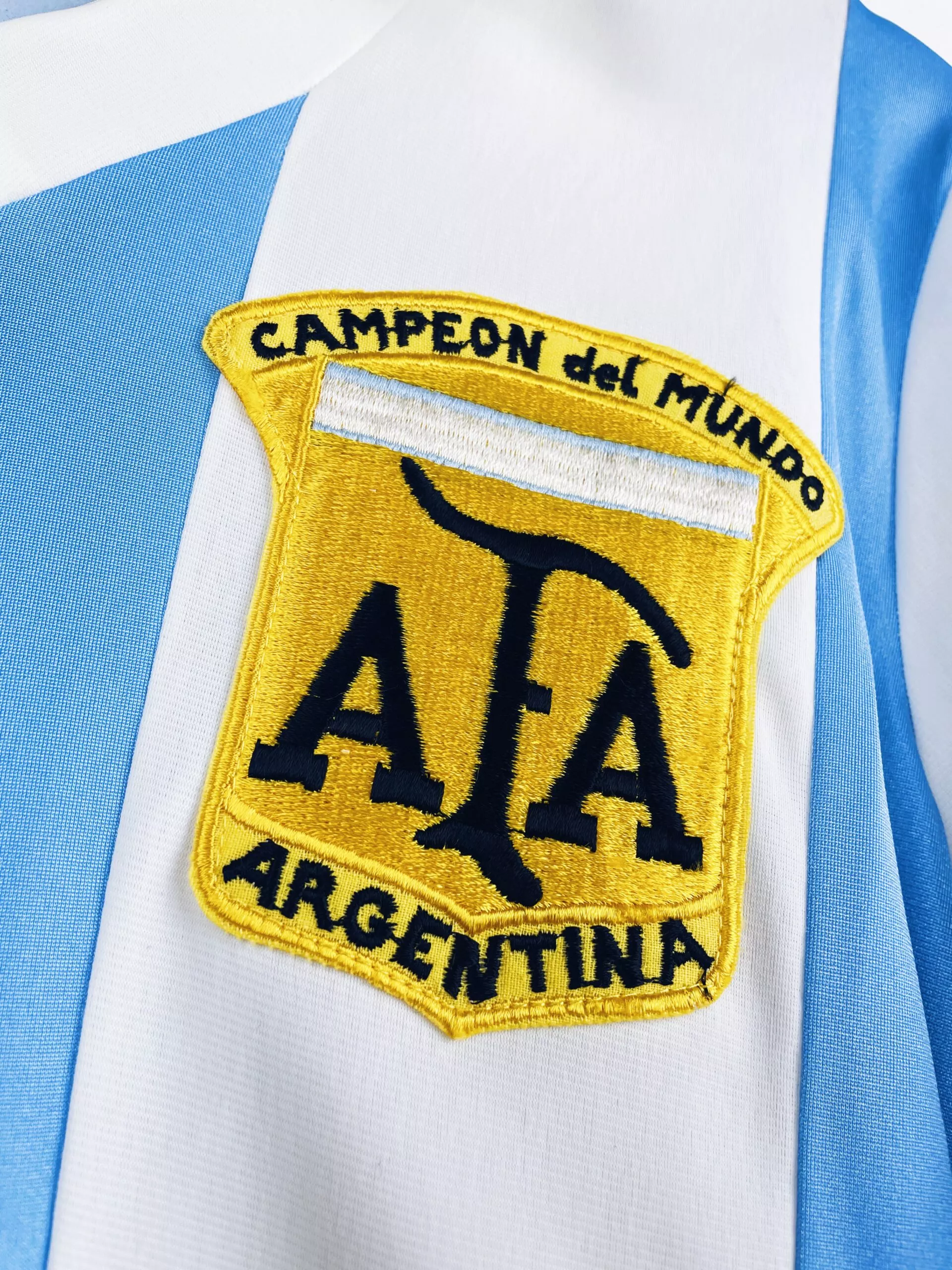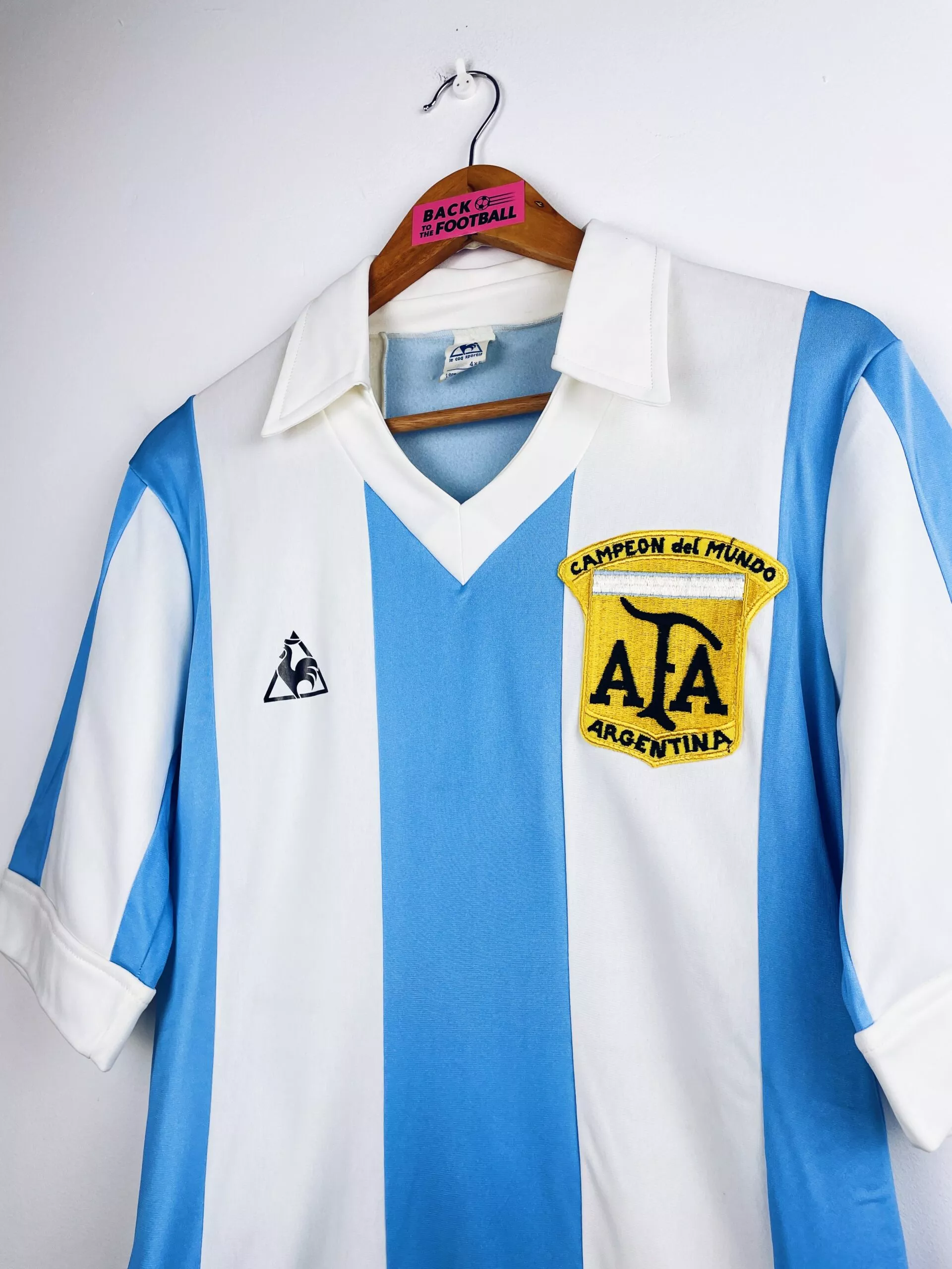 Taille : L (4×5) Si tu veux plus de détails, tu peux nous contacter par mail ou sur les réseaux 😉 Etat : 8.5/10, très bon état, micros traces à l’arrière du col (voir photo) Le maillot : maillot vintage domicile de l’Argentine 1980/1982. L’écusson spécial Campeon del Mundo est brodé, le logo Le Coq Sportif est floqué. Très beau maillot rétro de l’Argentine ! Histoire : le maillot a été produit pour célébrer la victoire de l’Albiceleste lors de la Coupe du Monde 1978. Les argentins avaient alors pris le dessus sur les hollandais après les prolongations, 3 buts…