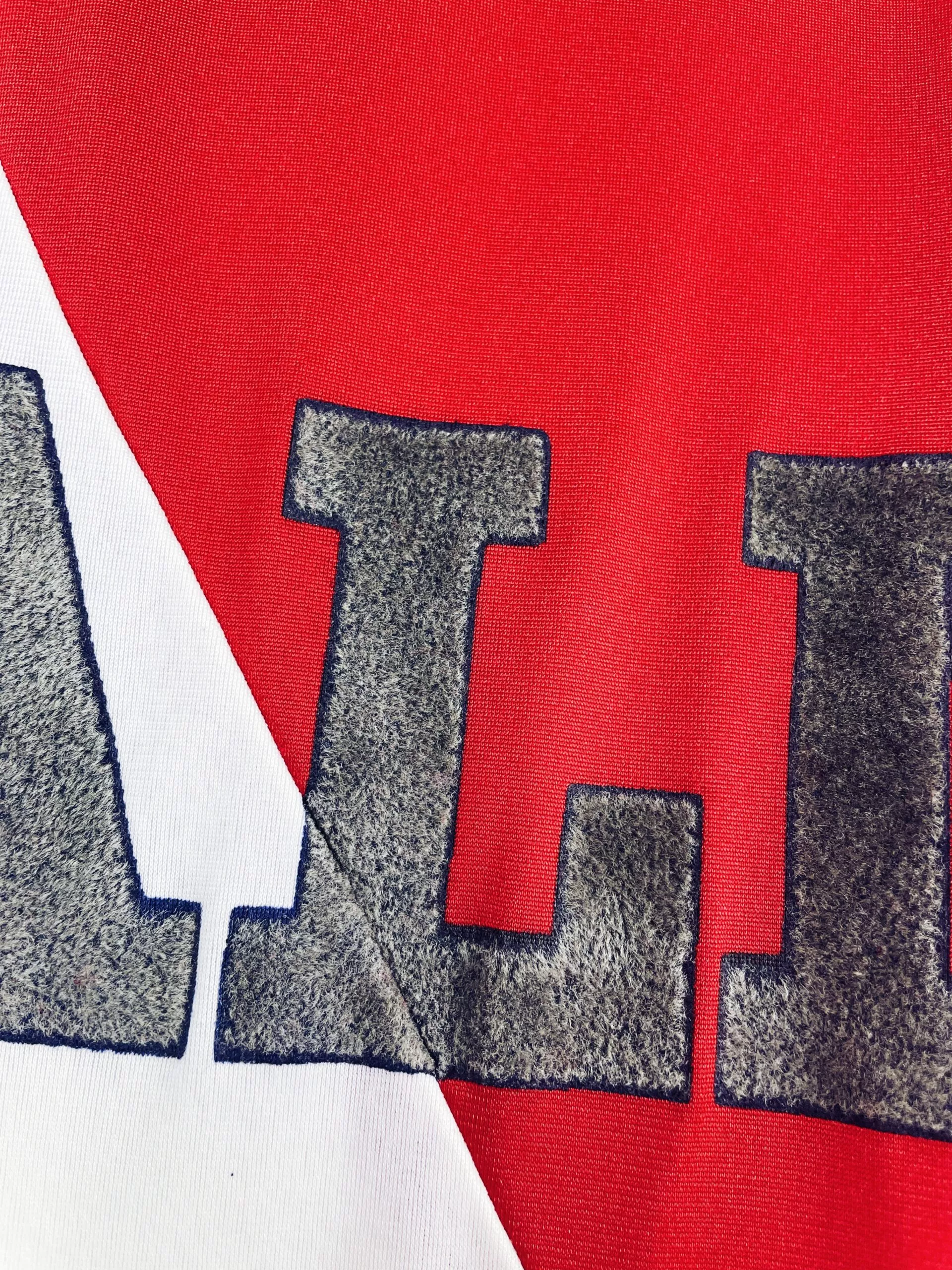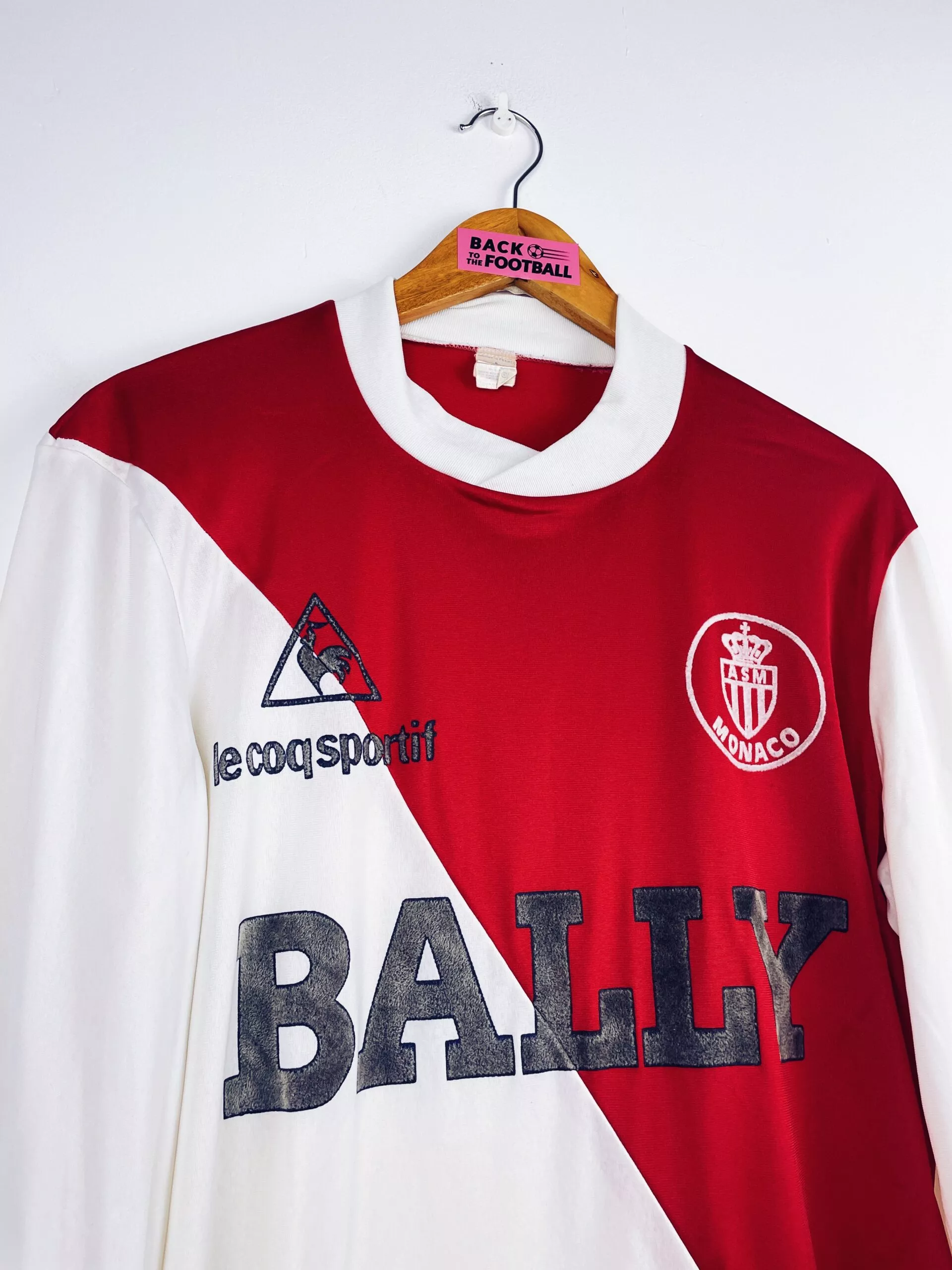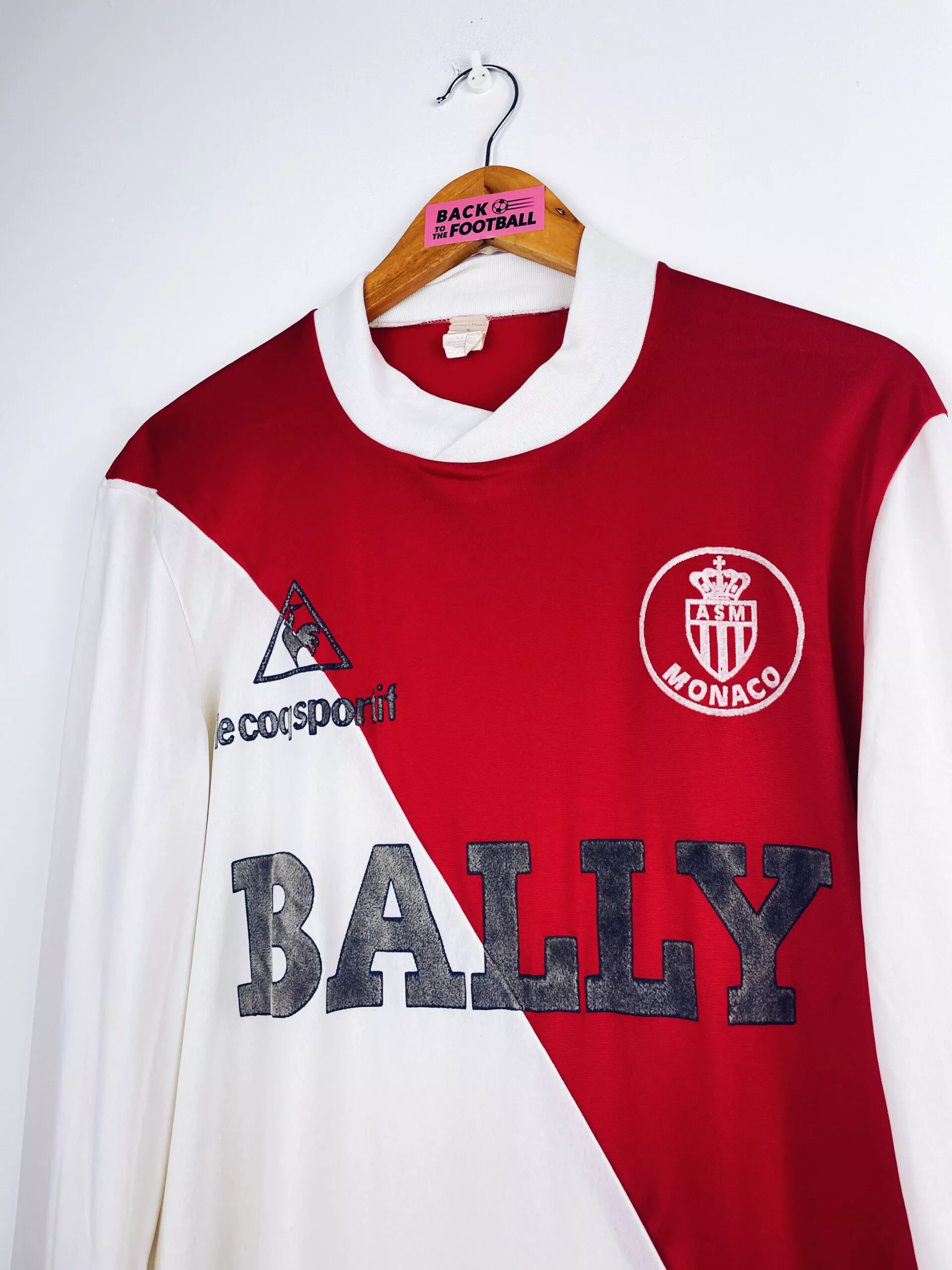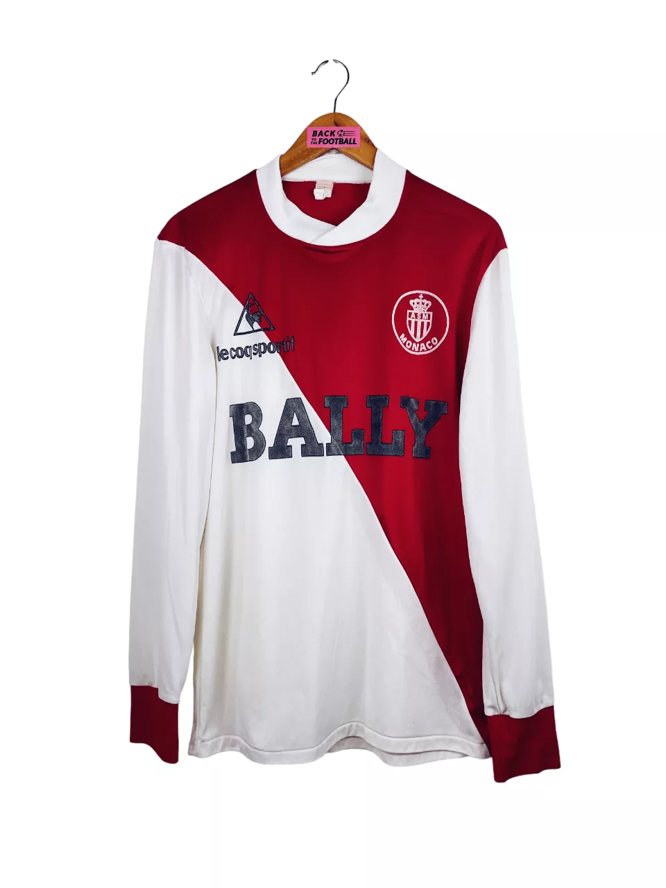 Taille : L (4×5) Si tu veux plus de détails, tu peux nous contacter par mail ou sur les réseaux 😉 Etat : 7.5/10, très bon état mais le noir de la feutrine a perdu de sa superbe, elle est devenue gris foncé (voir photos) Le maillot : maillot vintage domicile de l’AS Monaco 1982/1983 en manches longues. L’écusson, le logo Le Coq Sportif et le sponsor Bally sont en feutrine. Très beau maillot rétro de Monaco ! Histoire : l’ASM termine à la 6ème place de Division 1 et n’arrive donc pas à garder son titre. Les monégasques se…