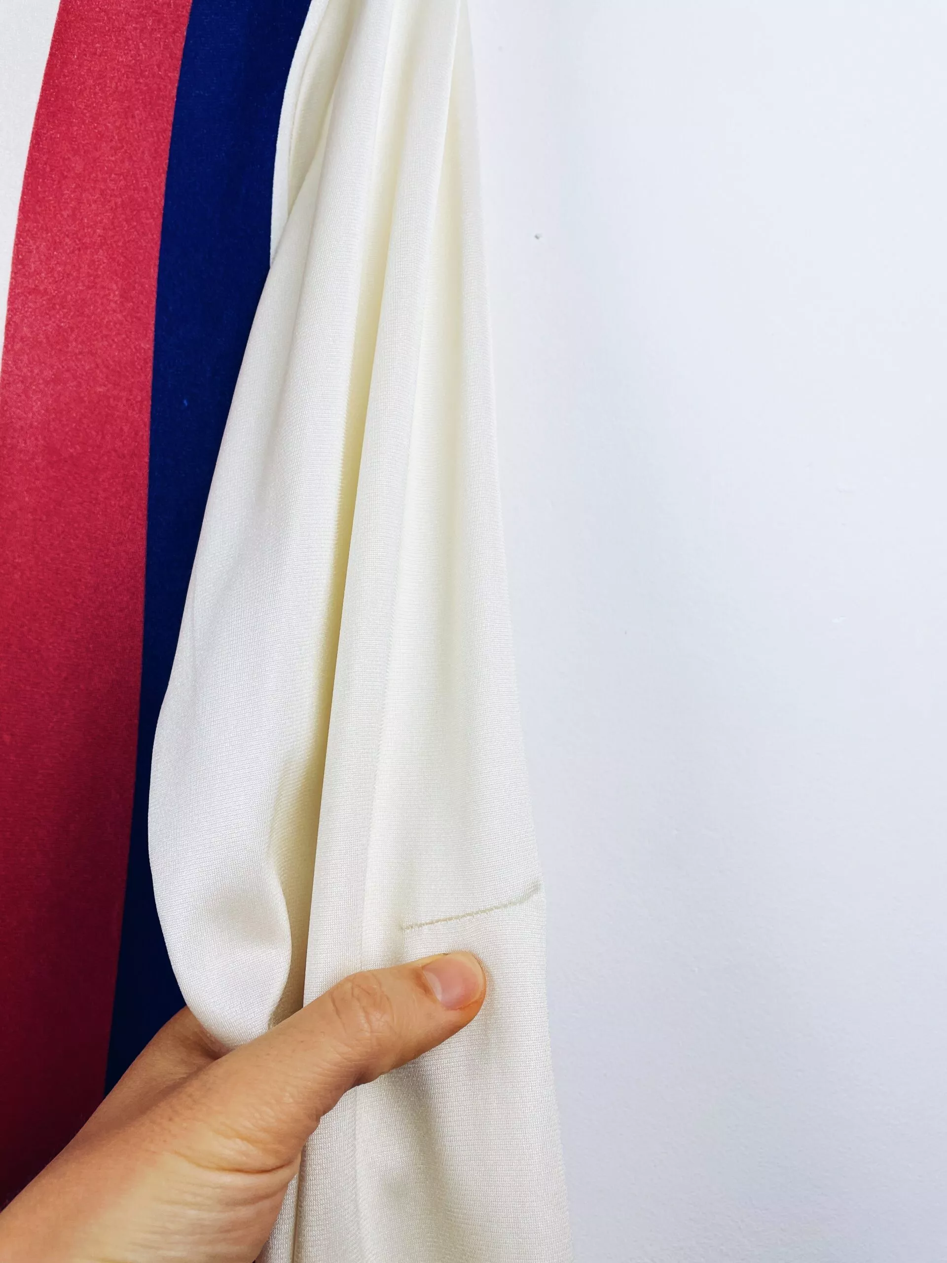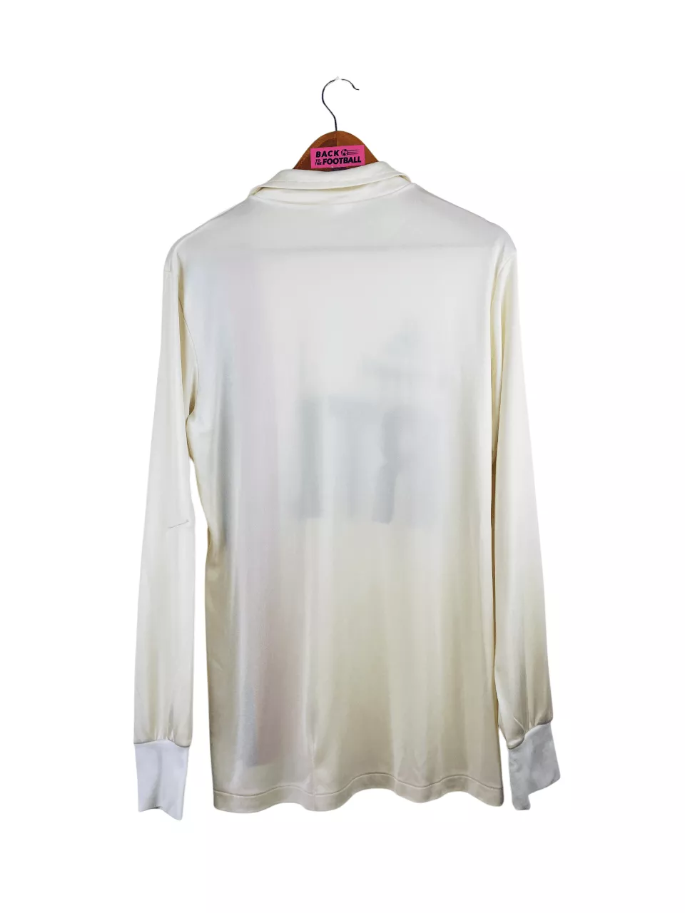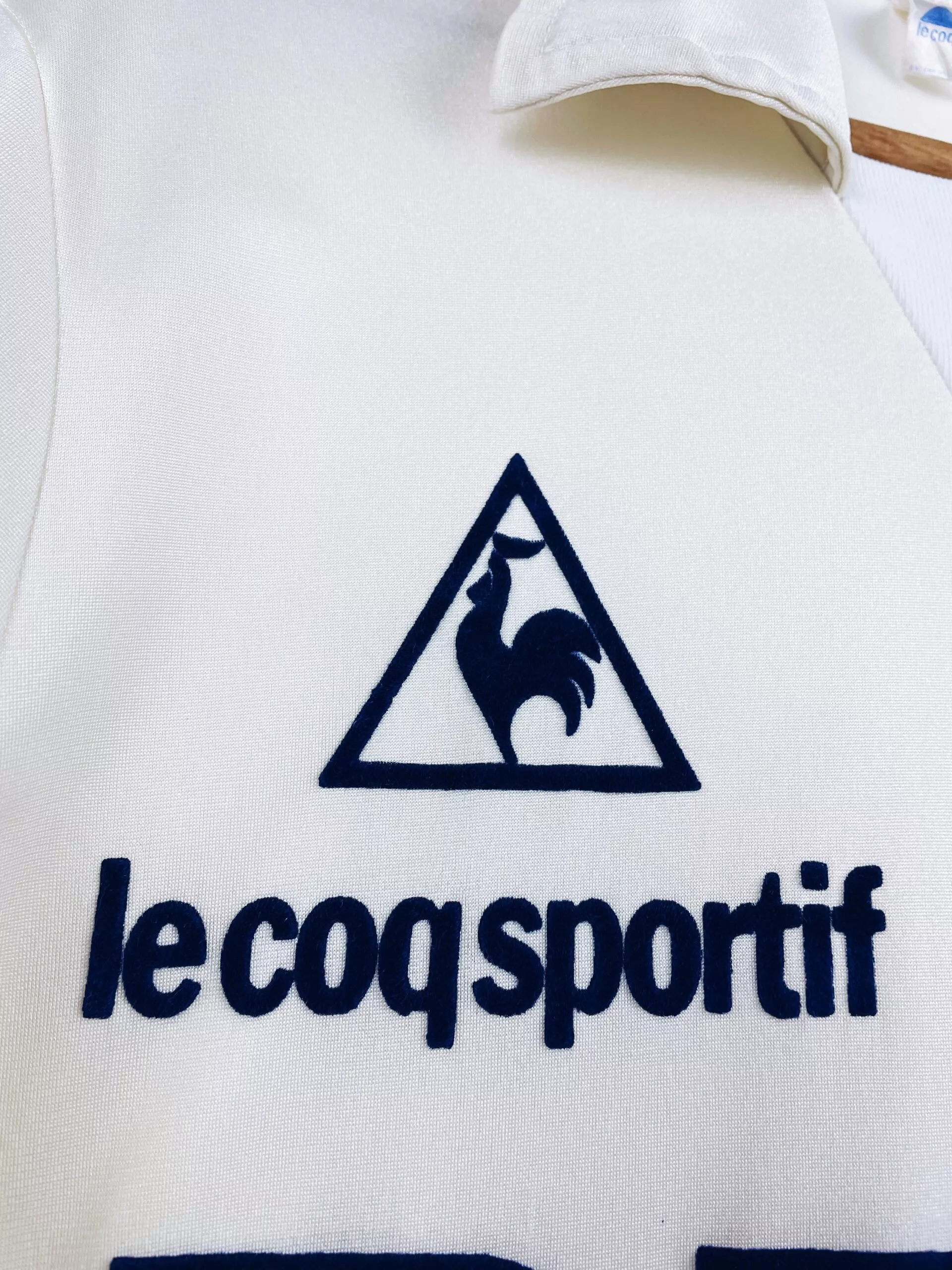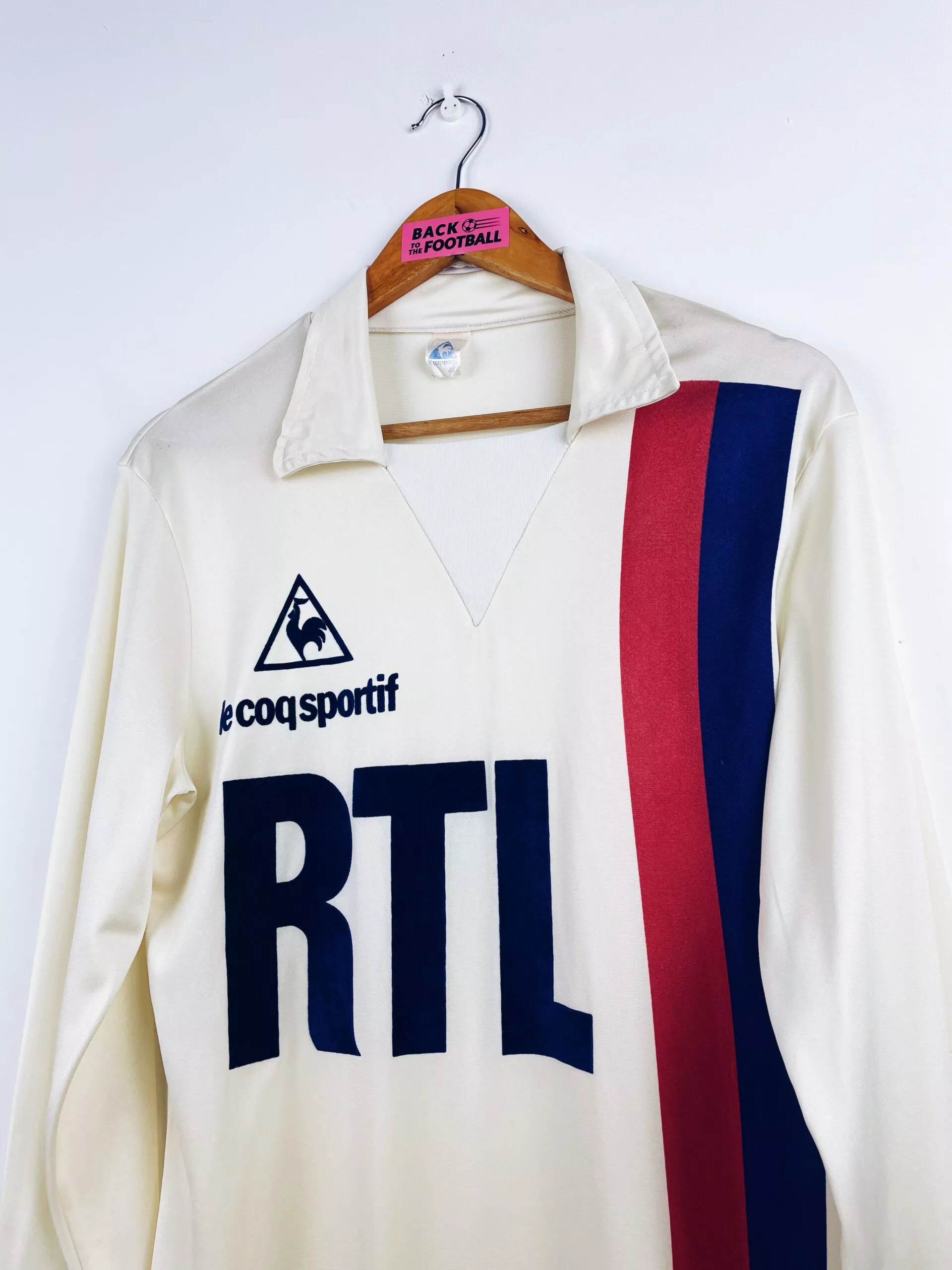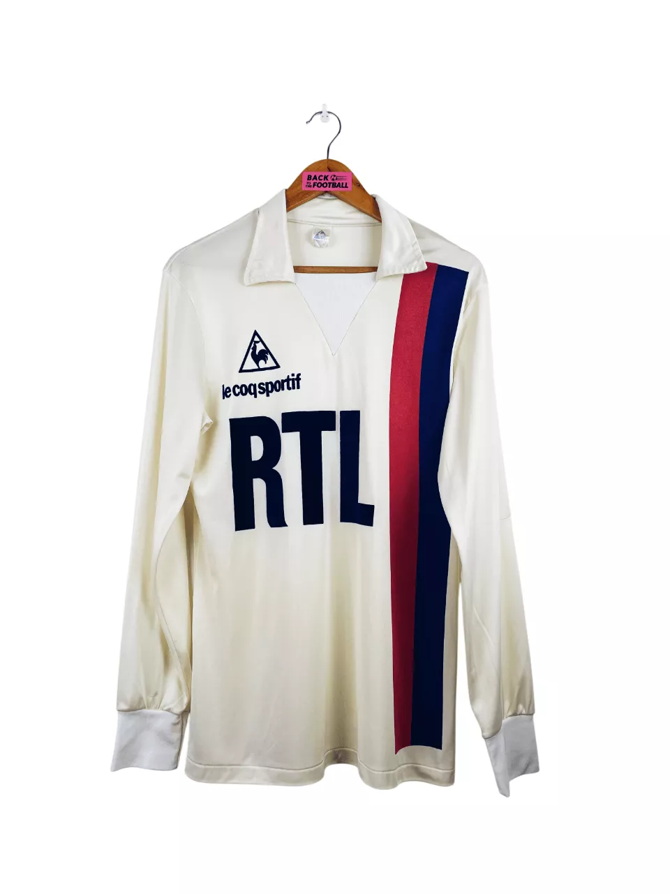 Taille : M Largeur : 48cm (aisselle à aisselle) Longueur : 71cm (base du col au bas) Si tu veux plus de détails, tu peux nous contacter par mail ou sur les réseaux 😉 Etat : 7/10, très bon état, les éléments en feutrine sont très bien conservés, mais des accrocs (voir photos) Le maillot : maillot vintage domicile du PSG 1982/1984 manches longues. Le logo Le Coq Sportif et le sponsor RTL sont en feutrine. Très beau maillot rétro du PSG ! Histoire : belle première saison des parisiens qui terminent sur le podium de Division 1, derrière Nantes…