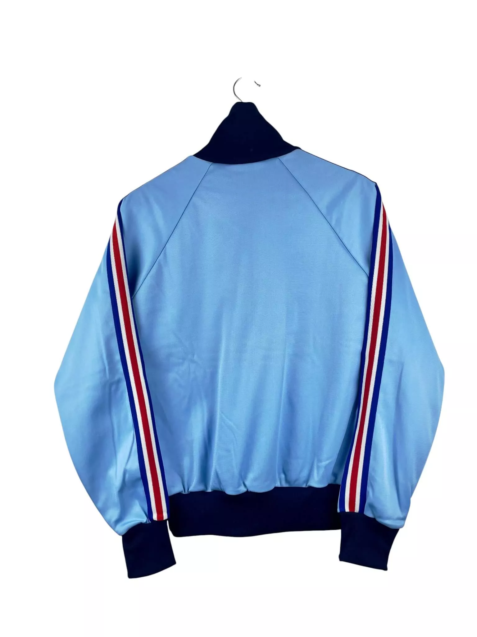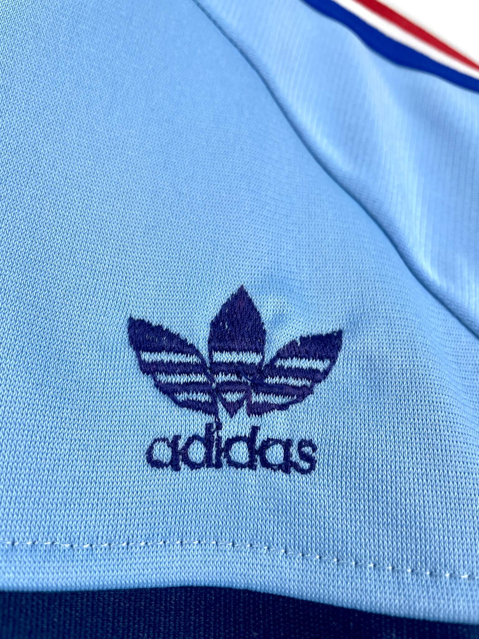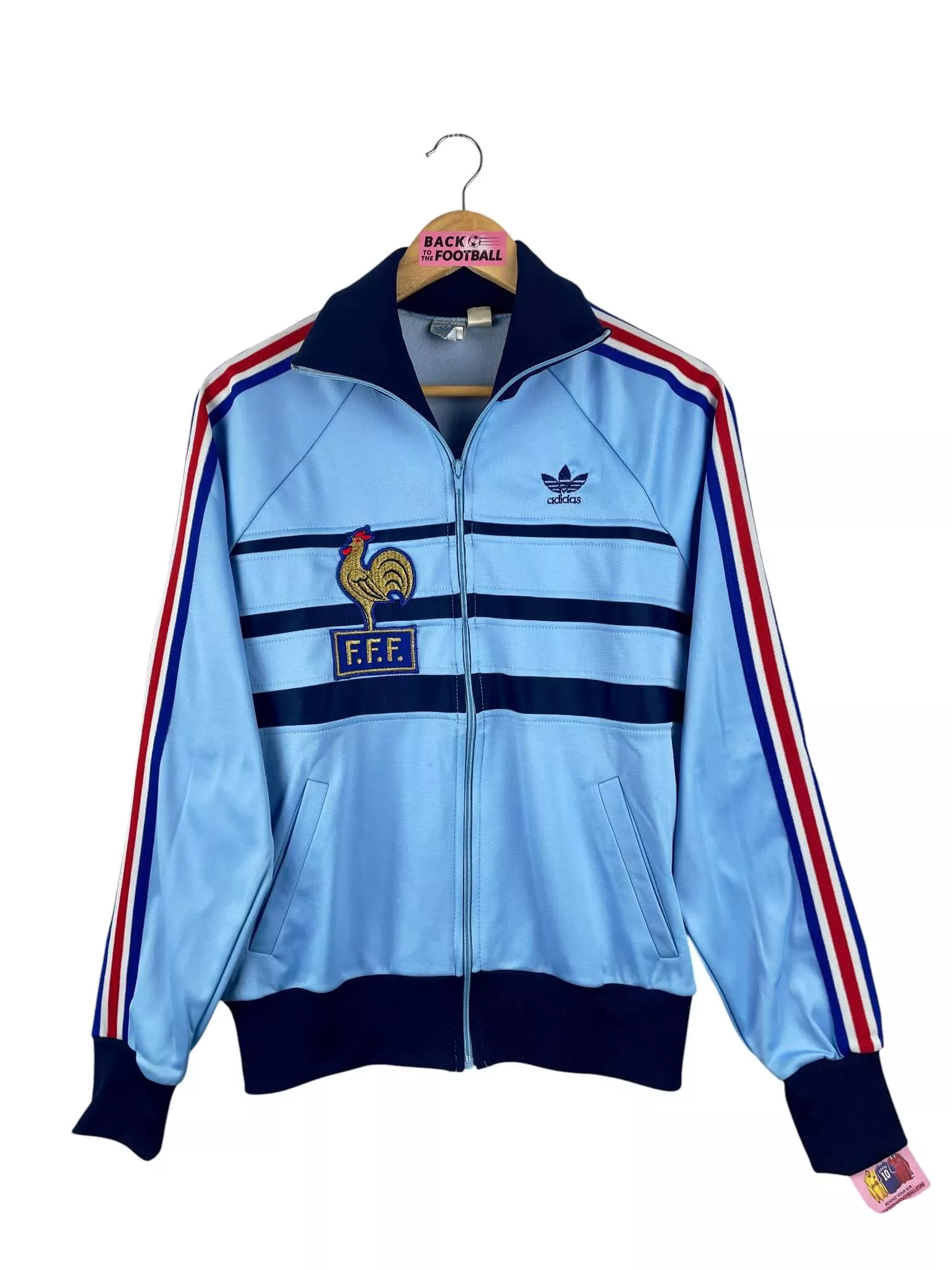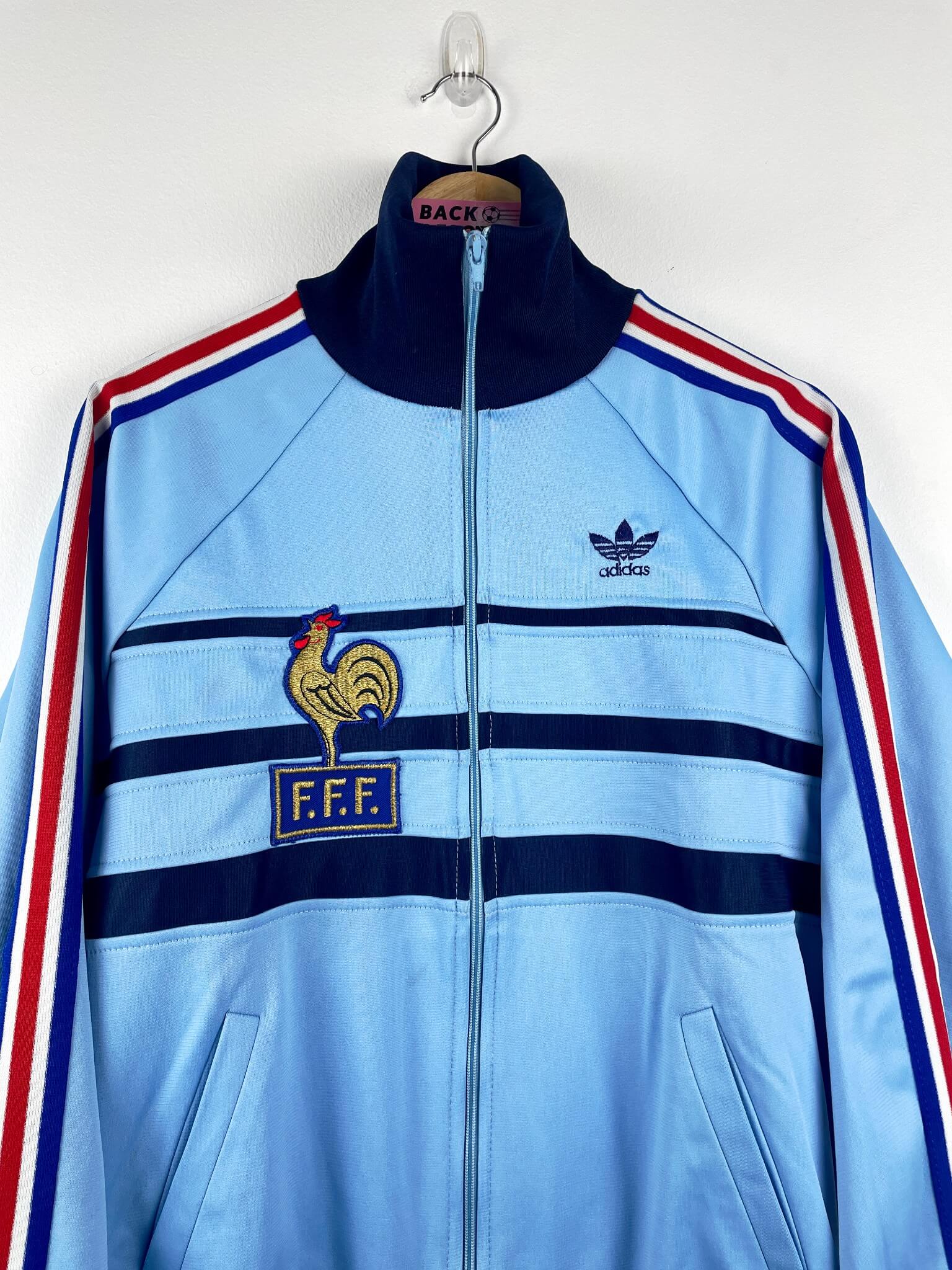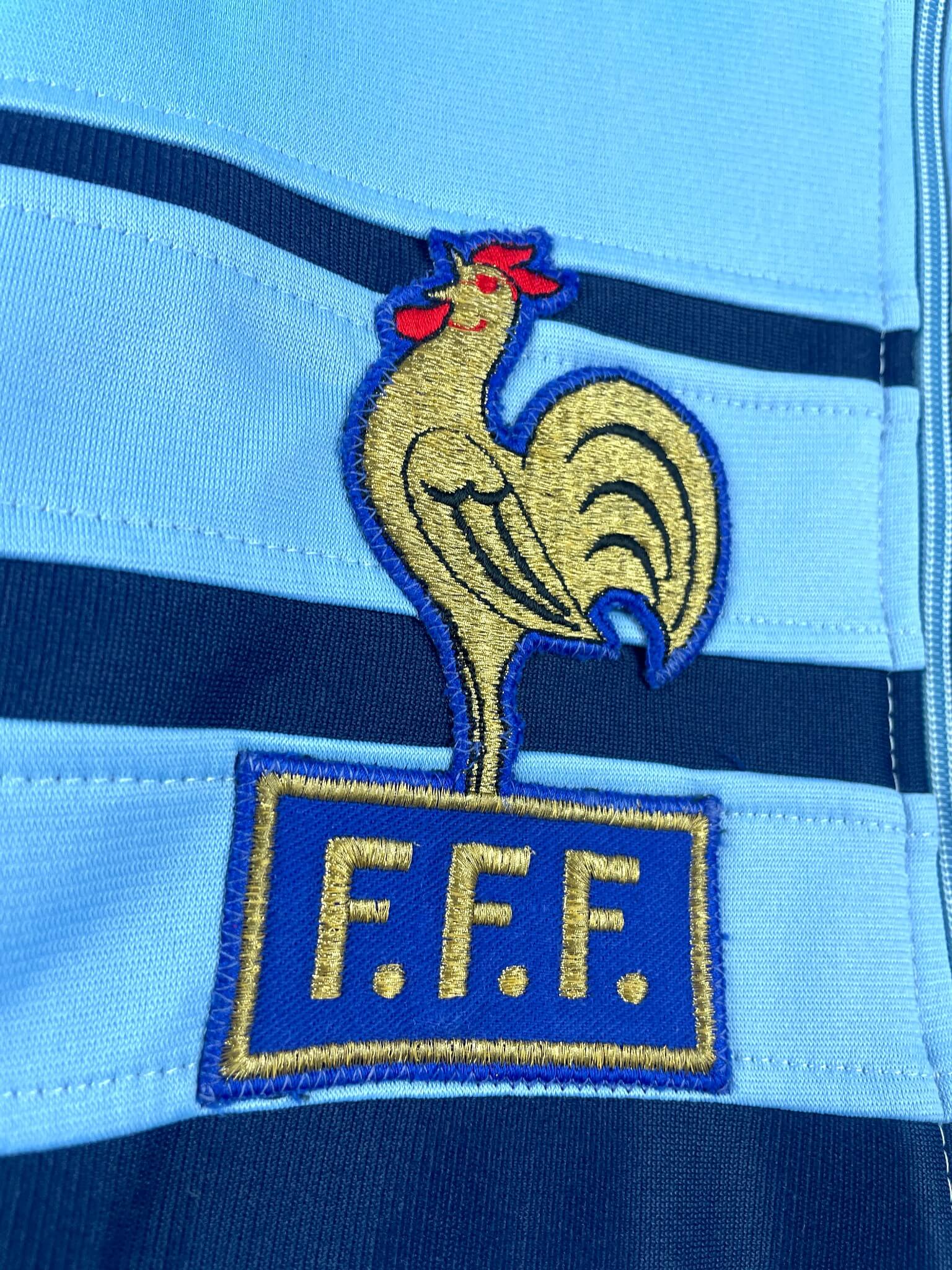 Taille : M – taille court Largeur : 55cm (aisselle à aisselle) Longueur : 66cm (col au bas) Si tu veux plus de détails, tu peux nous contacter par mail ou sur les réseaux 😉 Etat : 9/10, excellent état La veste : veste vintage de l’équipe de France 1982. L’écusson et le logo Adidas à trèfle sont brodés. Il y a 2 poches latérales. Production Ventex made in France. Très belle veste rétro de l’équipe de France ! Histoire : la France se qualifie tout juste pour la Coupe du Monde 1982 en finissant 2ème de leur groupe, derrière…