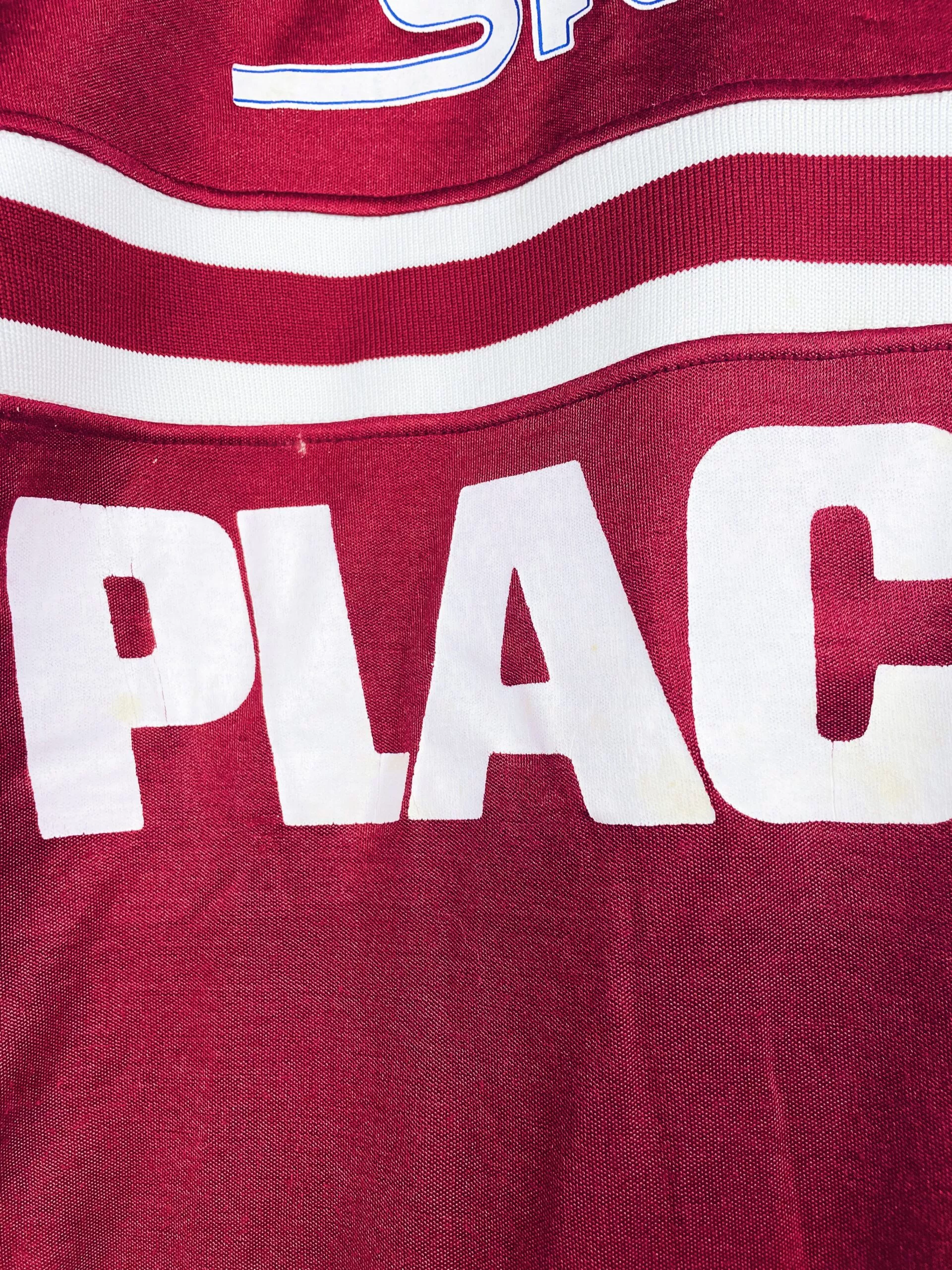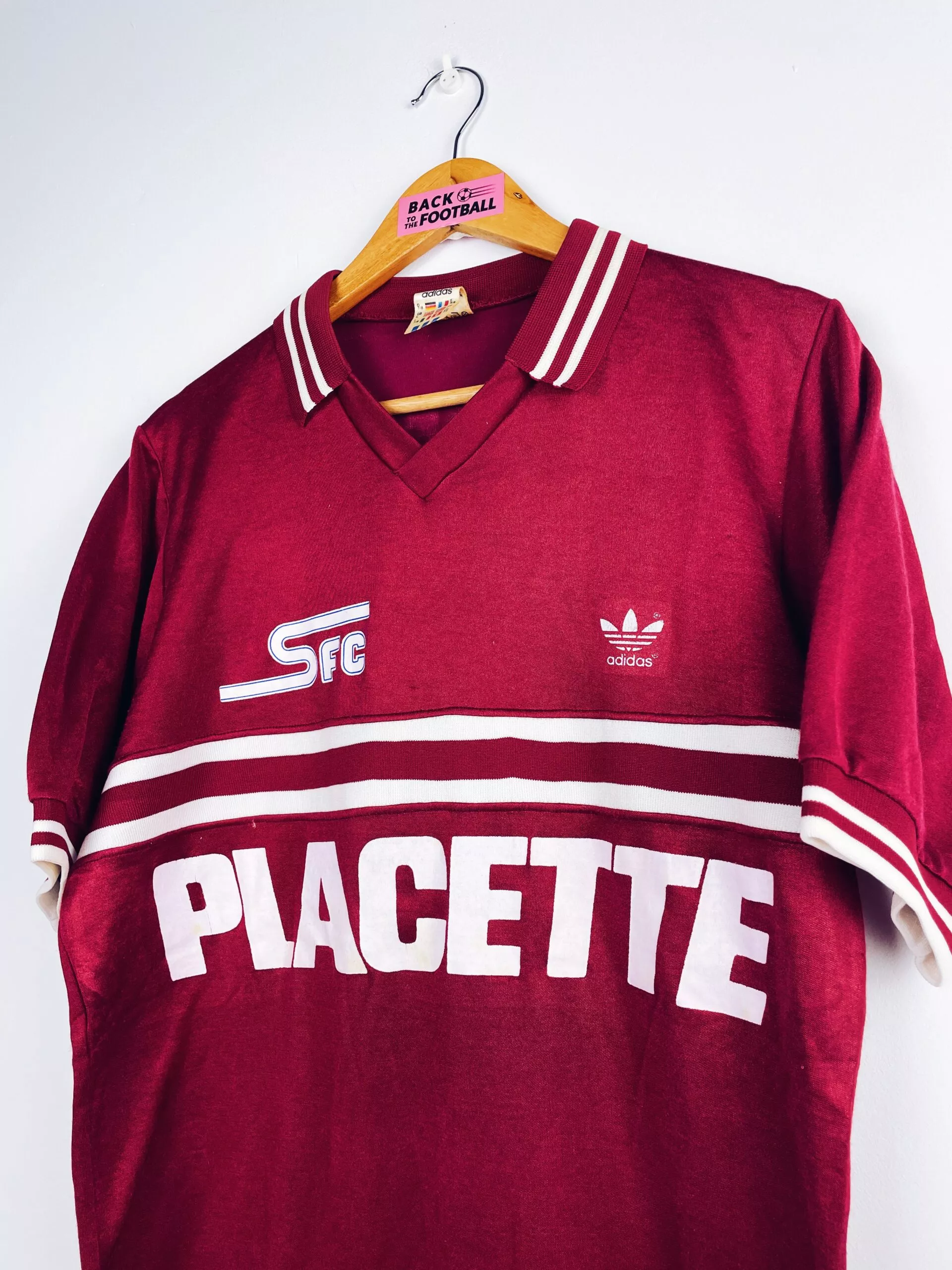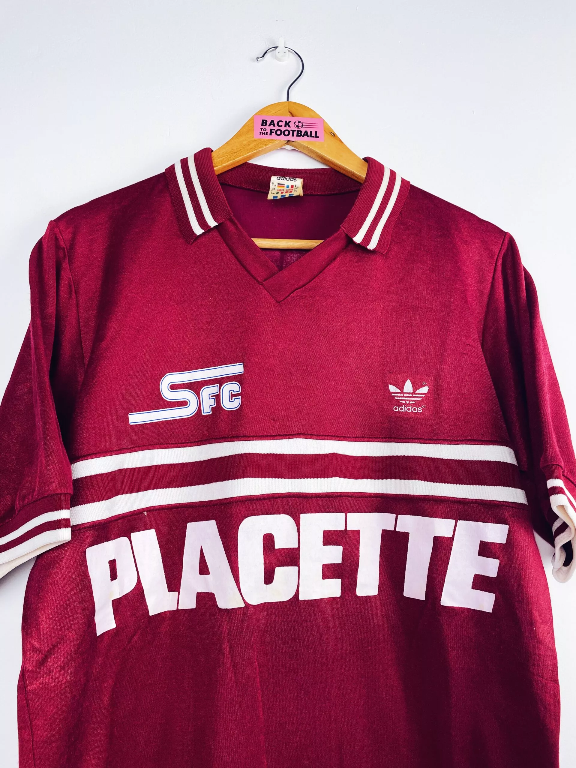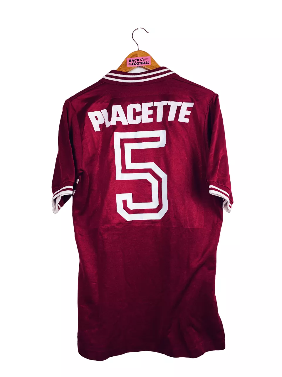 Taille : L Si tu veux plus d’infos, tu peux nous contacter par mail ou sur les réseaux 😉 Etat : 7/10, très bon état pour son âge mais le logo Adidas est un peu abimé, il y a des traces jaunes sur le sponsor et quelques bouloches (voir photos) Le maillot : maillot vintage du Servette Genève 1983/1987 domicile. Le maillot a été préparé (match issue) ou porté (match worn) par le numéro 5. Le logo Adidas, l’écusson du SFC et le sponsor Placette sont floqués. Le numéro 5 au dos aussi. Très beau maillot rétro du Servette FC…