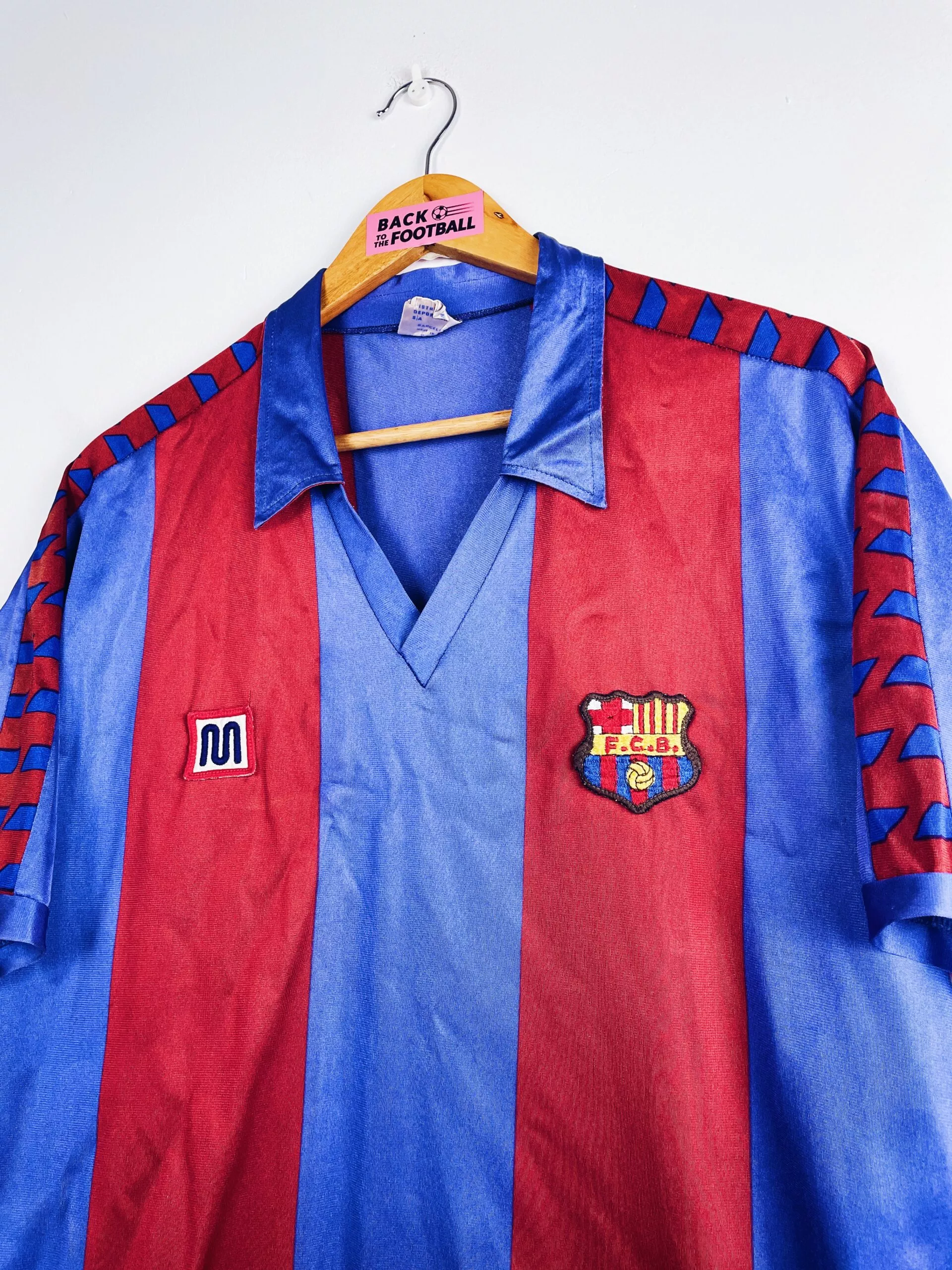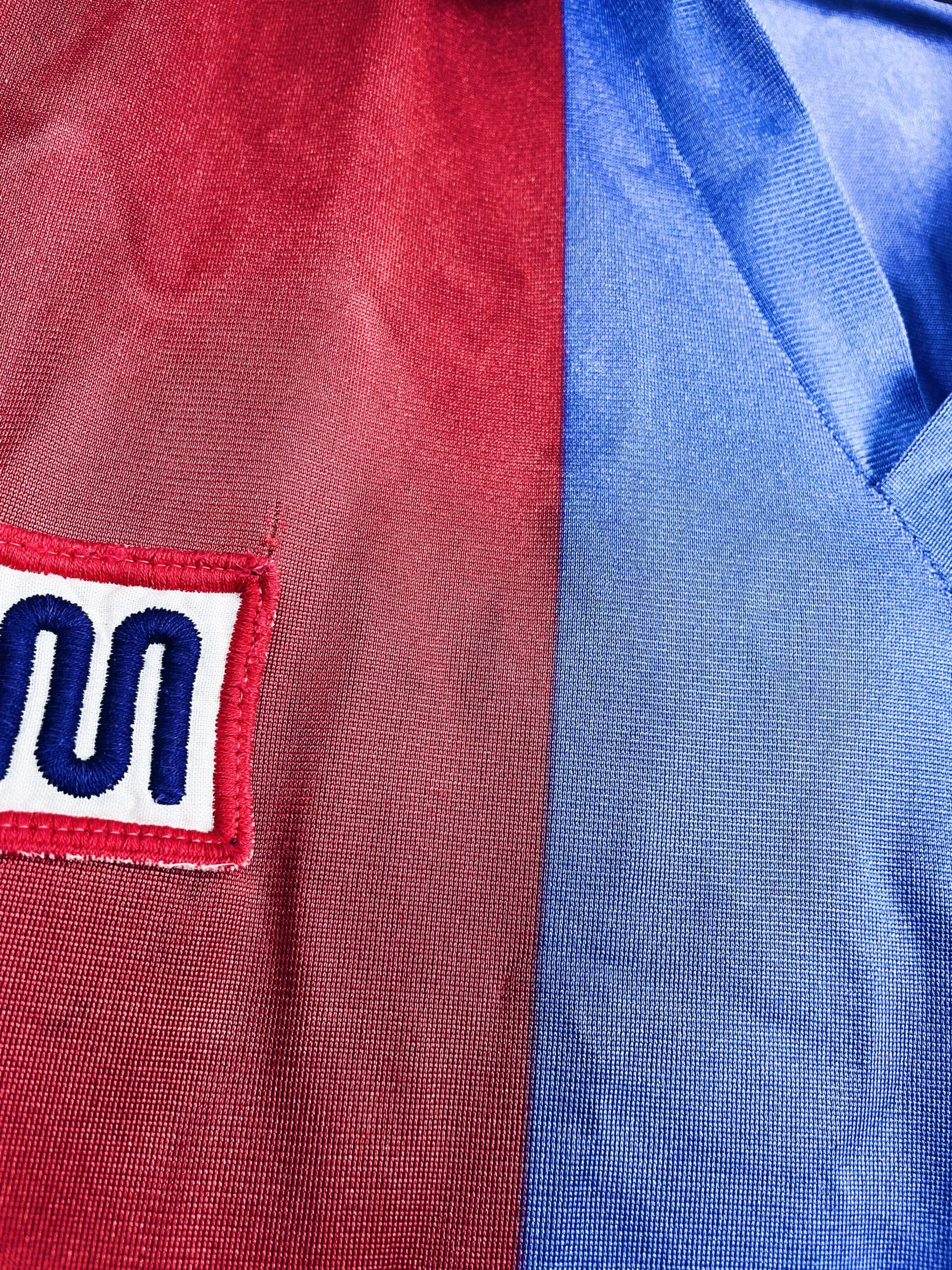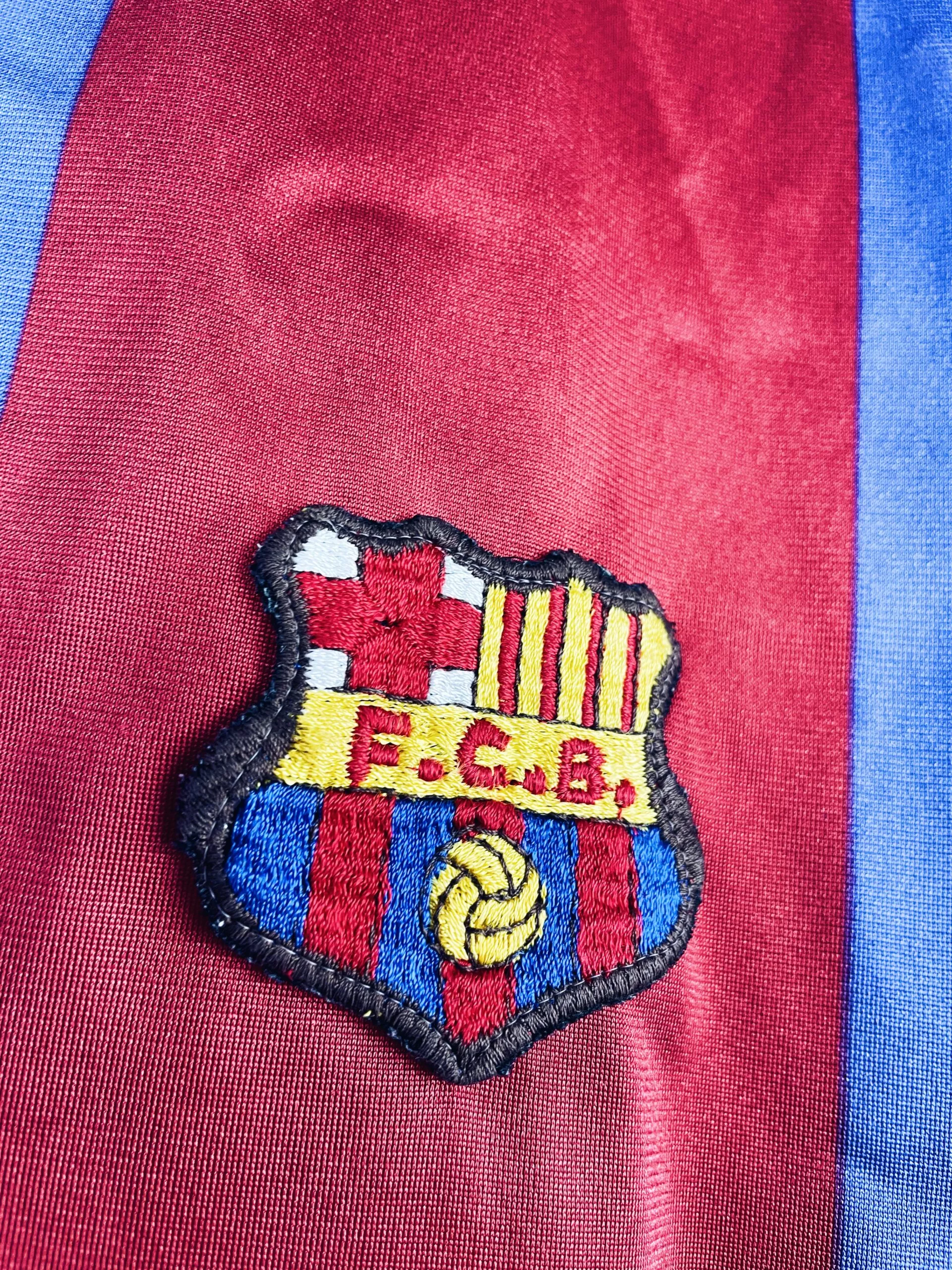 Taille : XL Etat : 7/10, bon état mais des petites traces et quelques fils tirés (voir photos) Le maillot : maillot vintage domicile du FC Barcelone 1984/1989. L’écusson du club est brodé, comme le logo de Meyba, la marque mythique barcelonaise. Très beau maillot rétro de Barcelone ! Histoire : Maradona quitta le club à l’été 84. Les Blaugranas s’en sortent bien sans lui puisqu’ils gagneront le championnat 84/85. Ils gagneront également une coupe du Roi en 87/88, une Coupe de la Liga en 85/86 et une coupe d’Europe des vainqueurs de Coupe en 88/89.