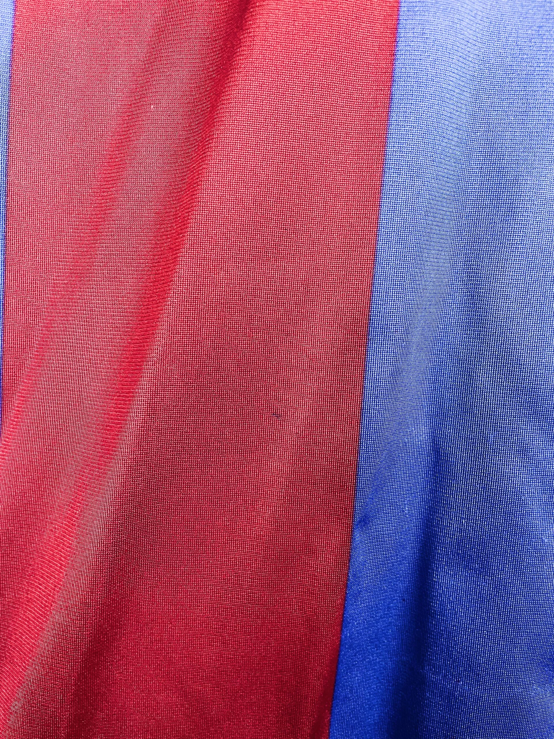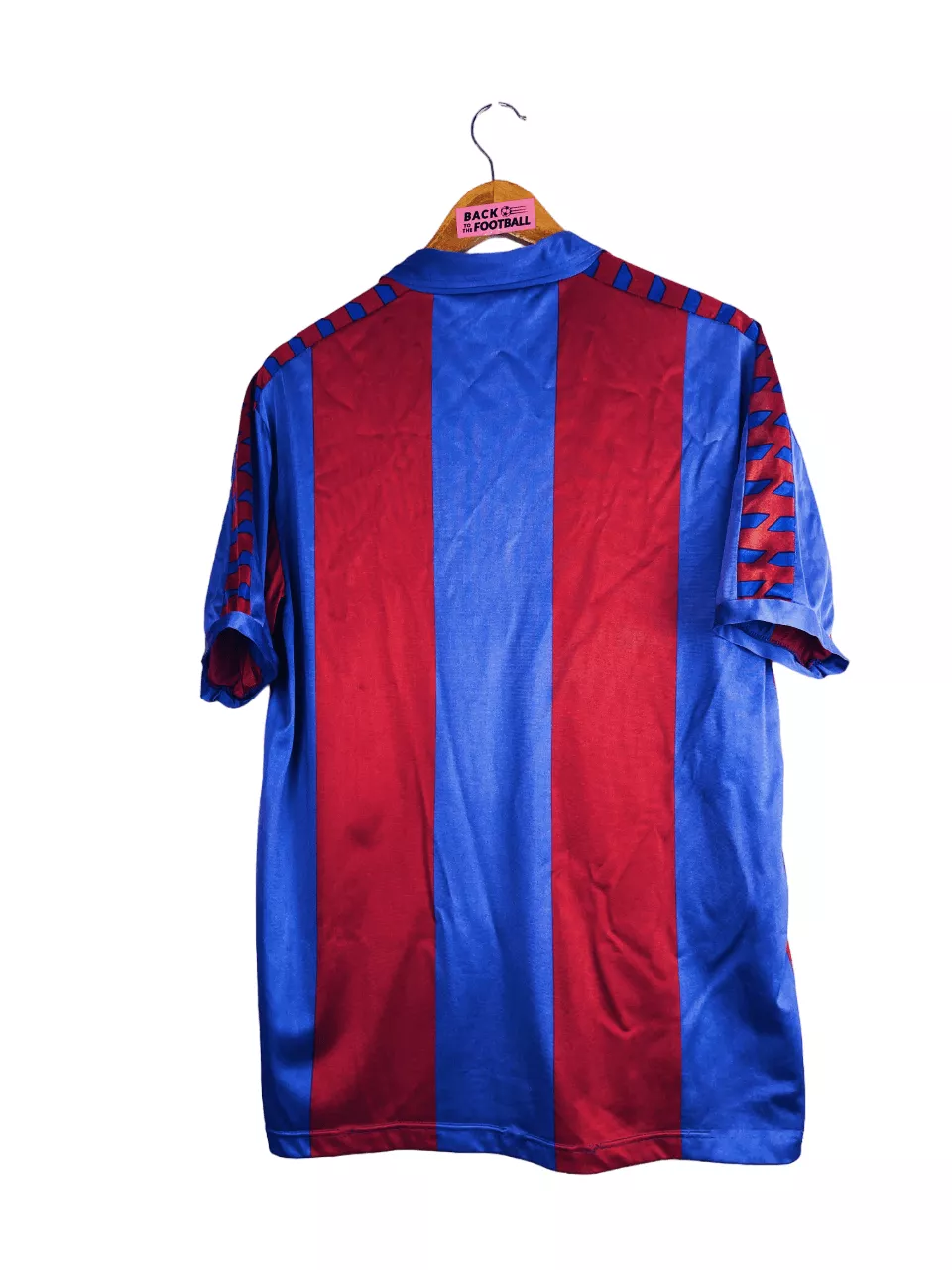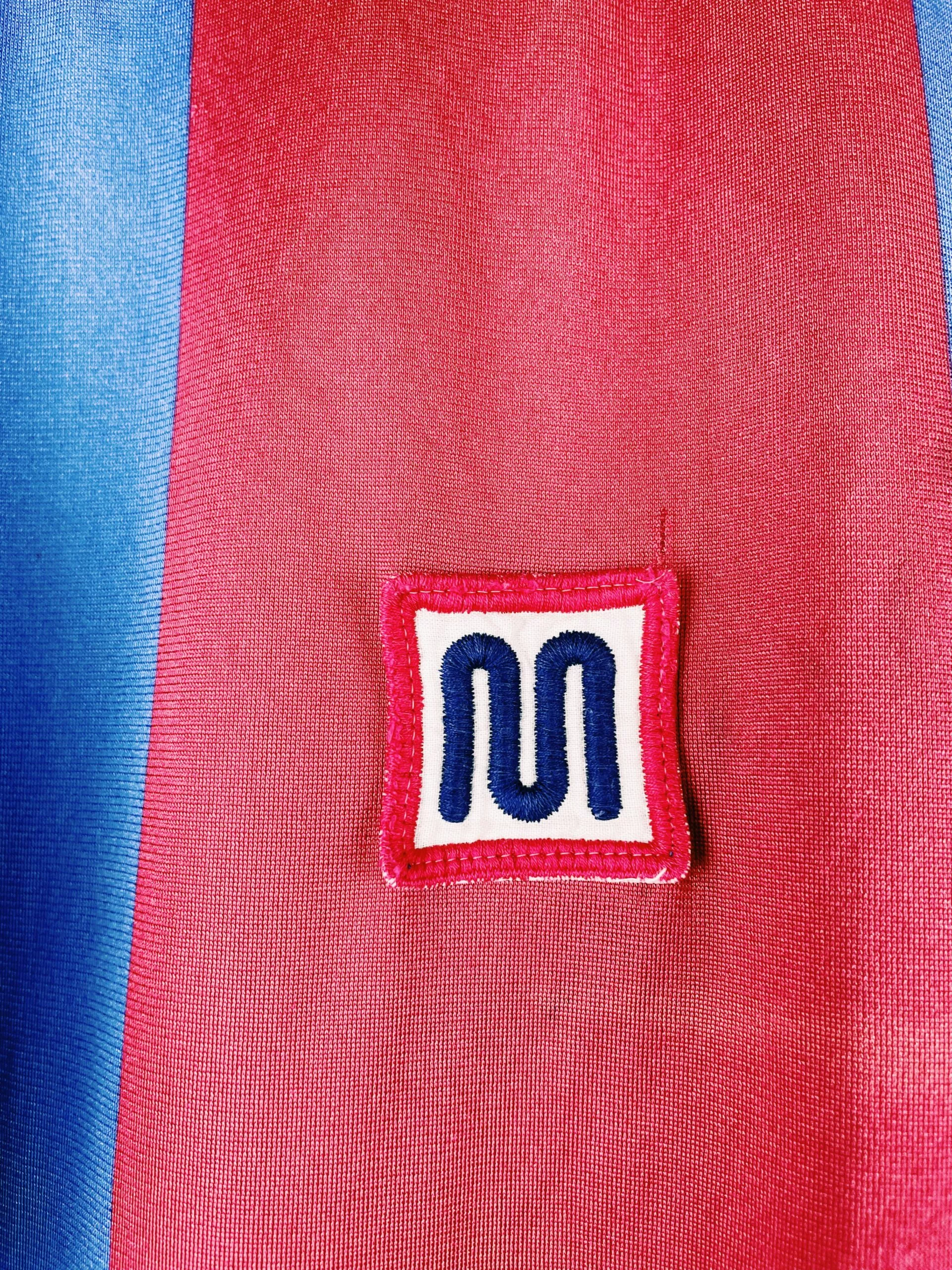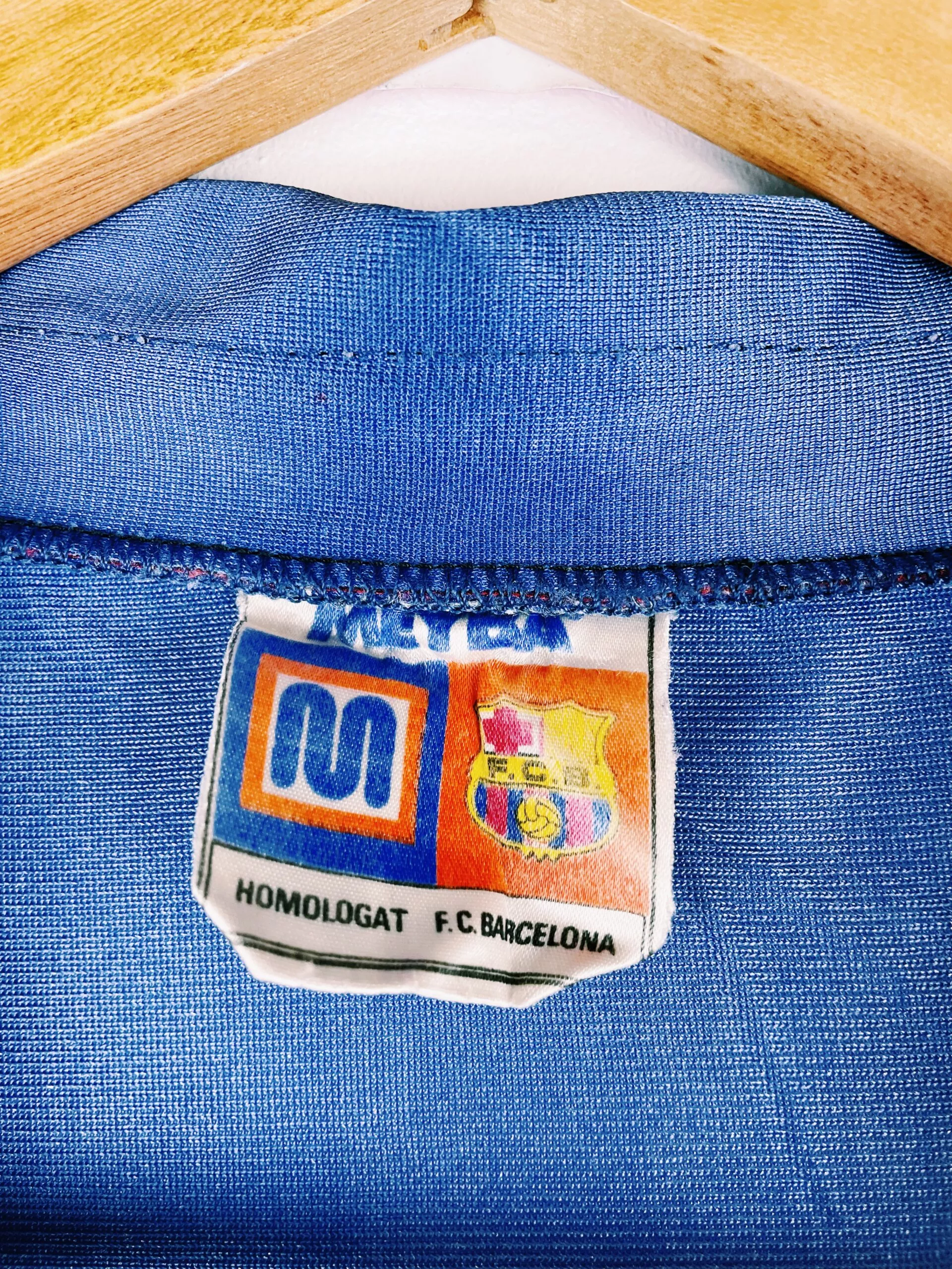 Taille : XL Etat : 7/10, bon état mais des petites traces et quelques fils tirés (voir photos) Le maillot : maillot vintage domicile du FC Barcelone 1984/1989. L’écusson du club est brodé, comme le logo de Meyba, la marque mythique barcelonaise. Très beau maillot rétro de Barcelone ! Histoire : Maradona quitta le club à l’été 84. Les Blaugranas s’en sortent bien sans lui puisqu’ils gagneront le championnat 84/85. Ils gagneront également une coupe du Roi en 87/88, une Coupe de la Liga en 85/86 et une coupe d’Europe des vainqueurs de Coupe en 88/89.