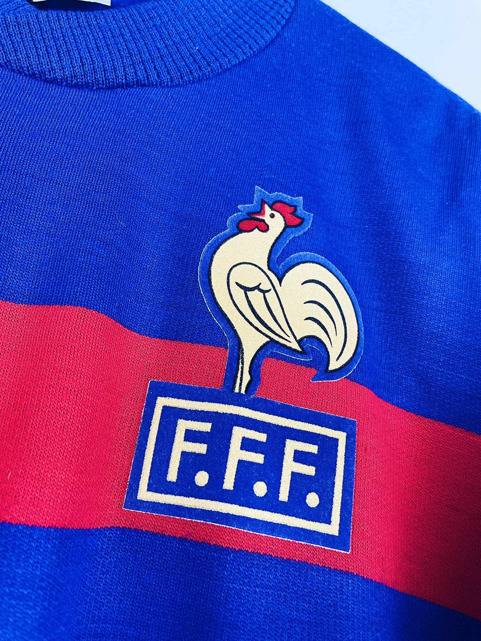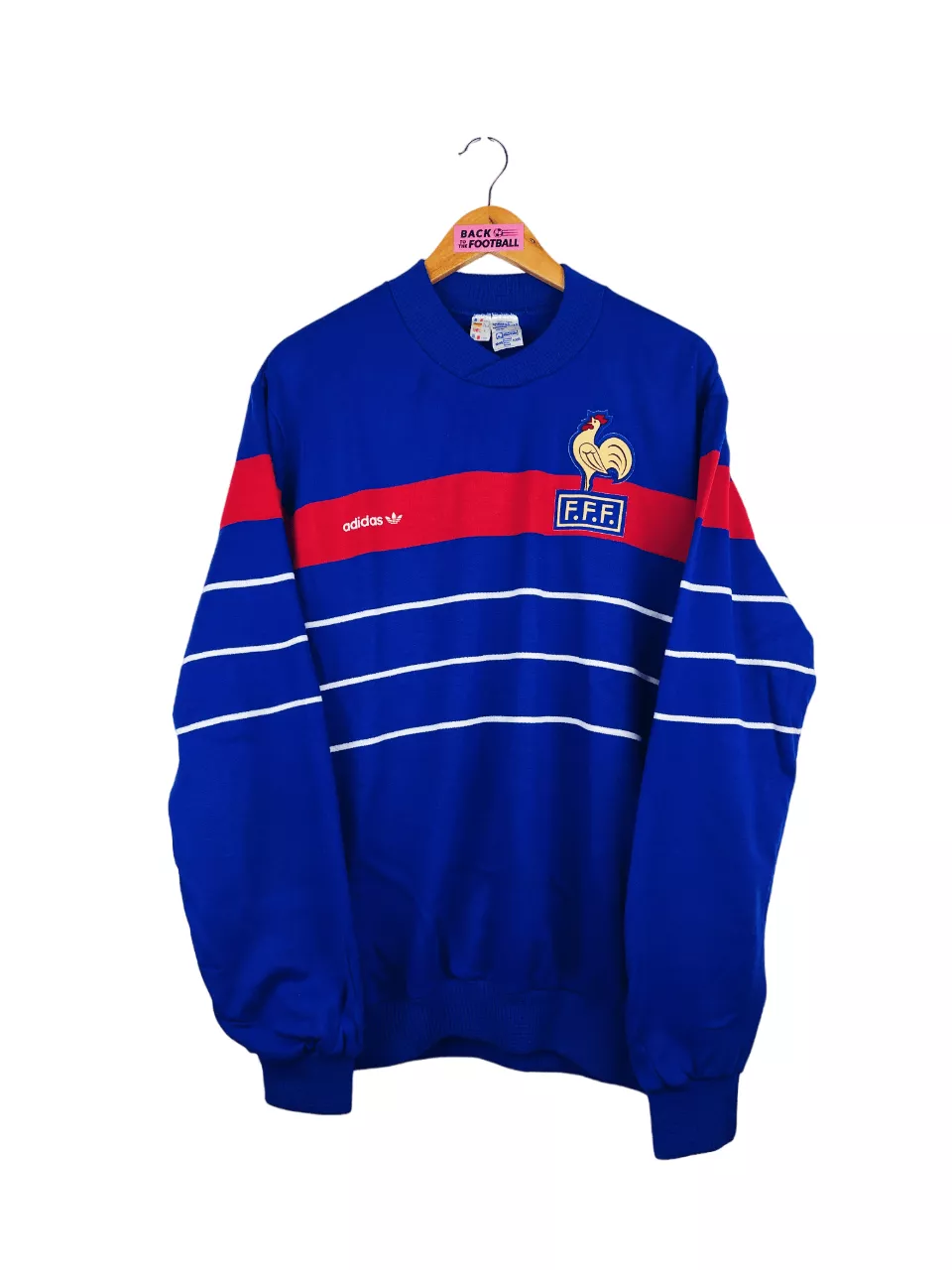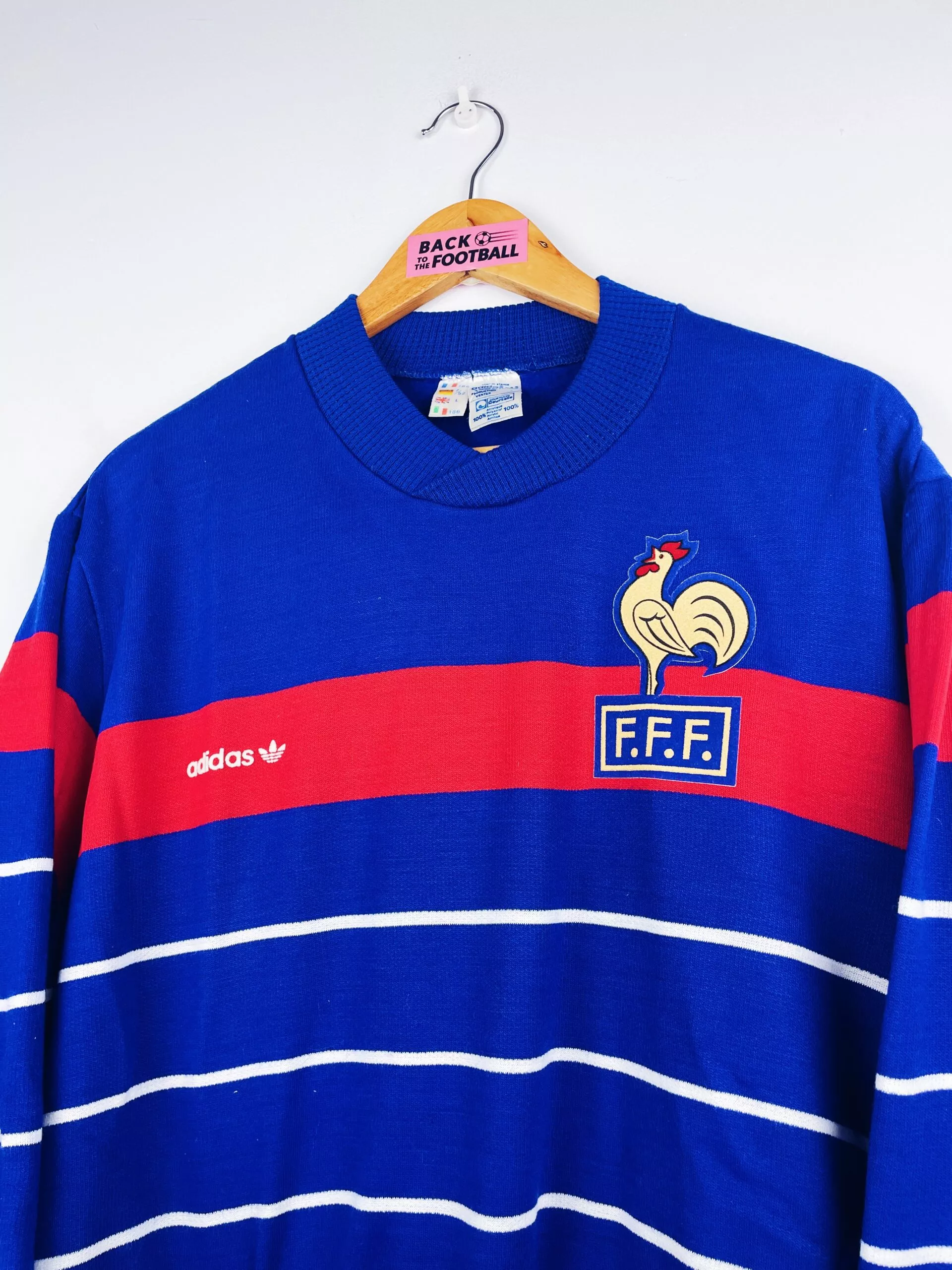 Taille : L Si tu veux plus de détails, tu peux nous contacter par mail ou sur les réseaux 😉 Etat : 8/10, excellent état pour son âge, un mini accro sur le devant (voir photo) Le sweat : sweat vintage de l’équipe de France 1984. L’écusson et le logo Adidas sont en feutrine. Très beau sweat rétro de l’équipe de France ! Histoire : la France est qualifiée d’office en tant que pays hôte de l’Euro 1984. L’équipe de France terminen à la première place de son groupe devant le Danemark, avec 3 victoires. En demi-finale, les Bleus s’opposent…