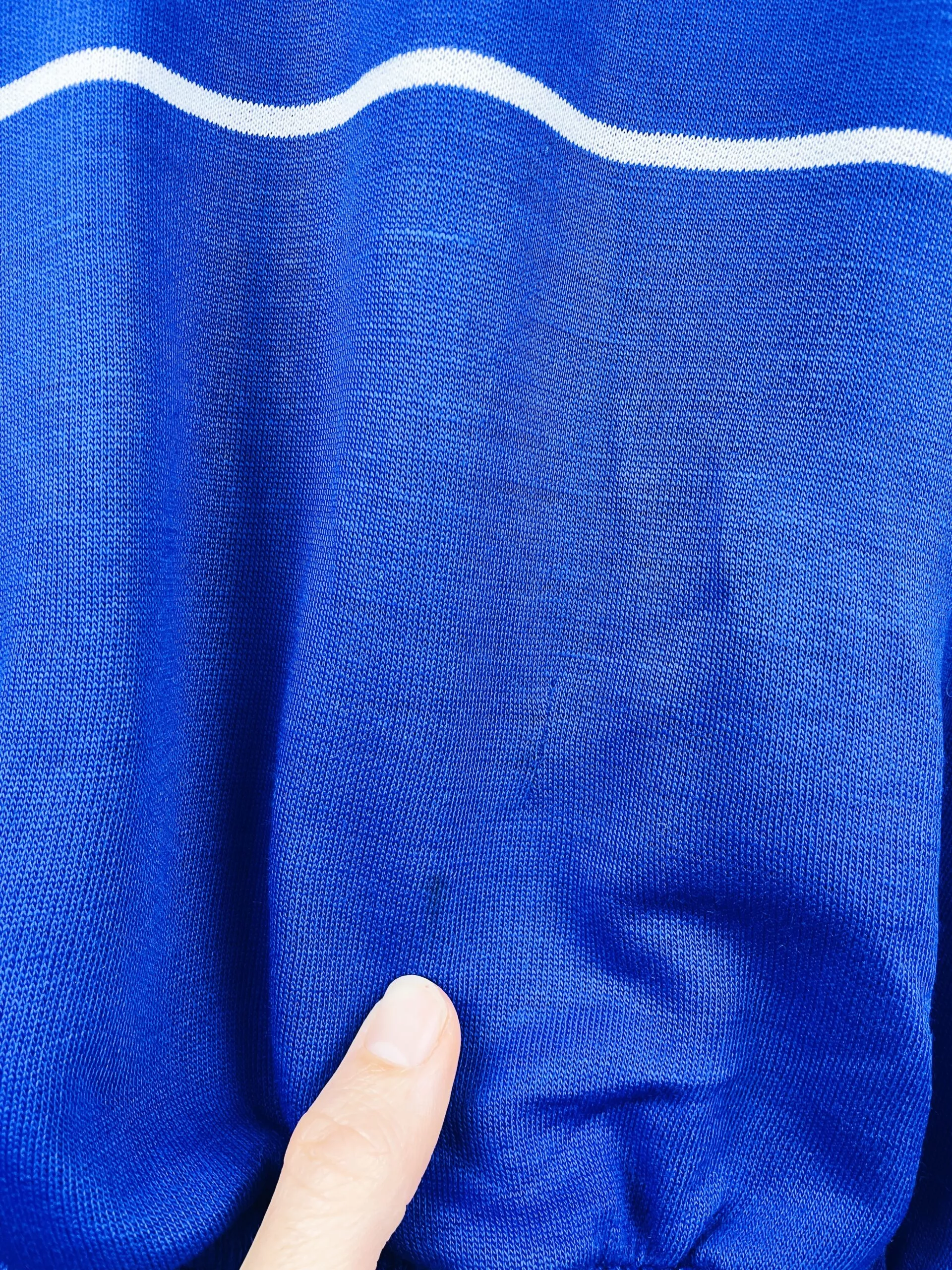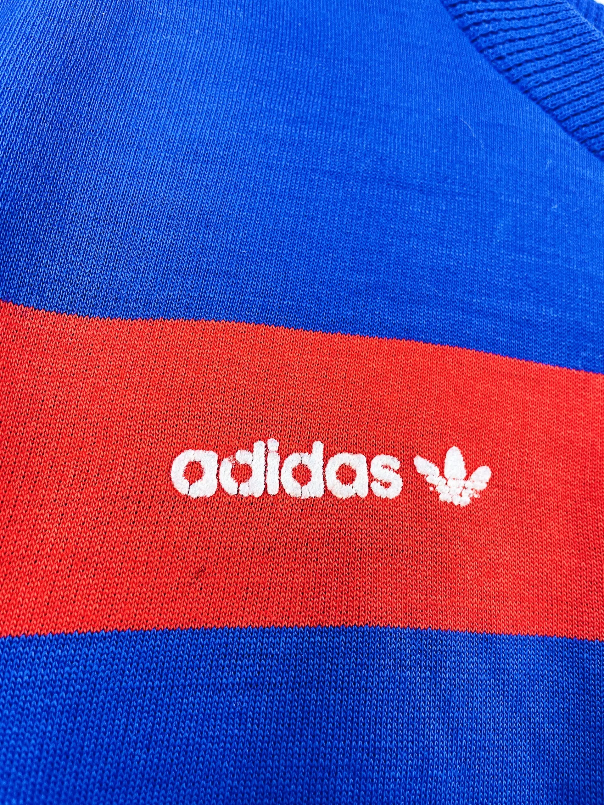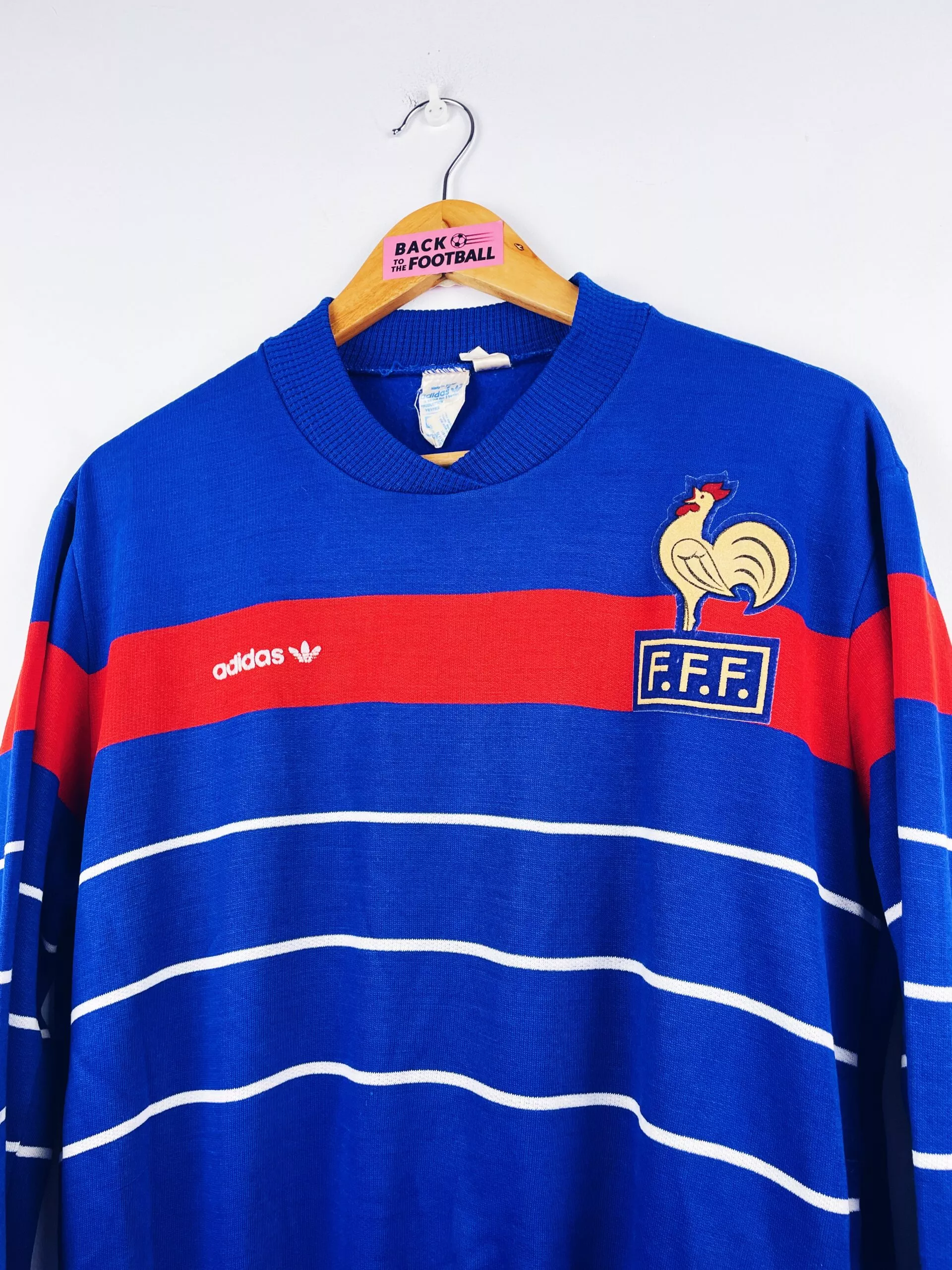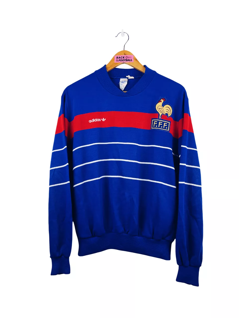 Taille : S Si tu veux plus de détails, tu peux nous contacter par mail ou sur les réseaux 😉 Etat : 7/10, bon état général, des bouloches, mini trace et le logo Adidas est légèrement abimé (voir photos) Le sweat : sweat vintage de l’équipe de France 1984. L’écusson et le logo Adidas sont en feutrine. Très beau sweat rétro de l’équipe de France ! Histoire : la France est qualifiée d’office en tant que pays hôte de l’Euro 1984. L’équipe de France terminen à la première place de son groupe devant le Danemark, avec 3 victoires. En demi-finale,…