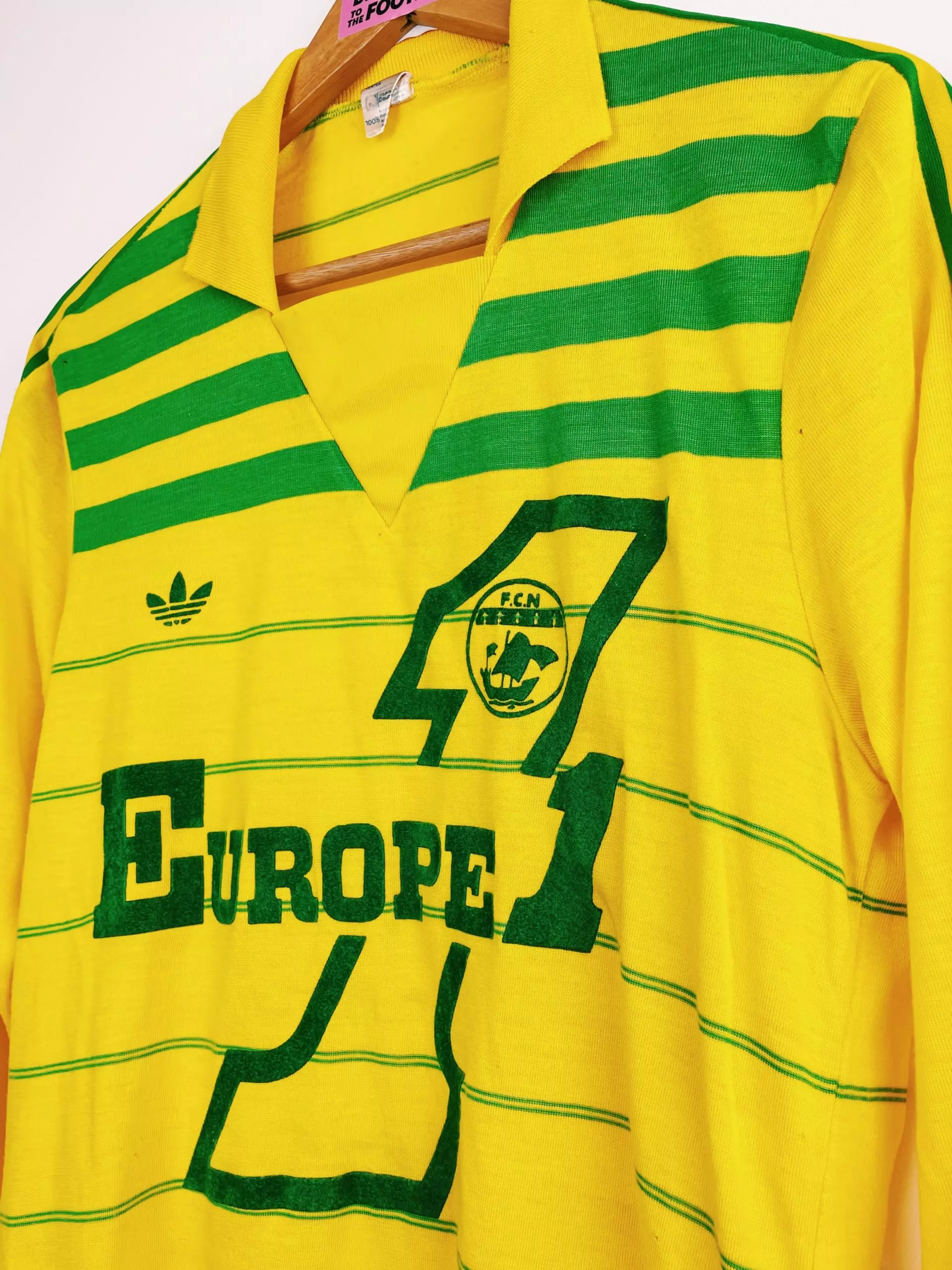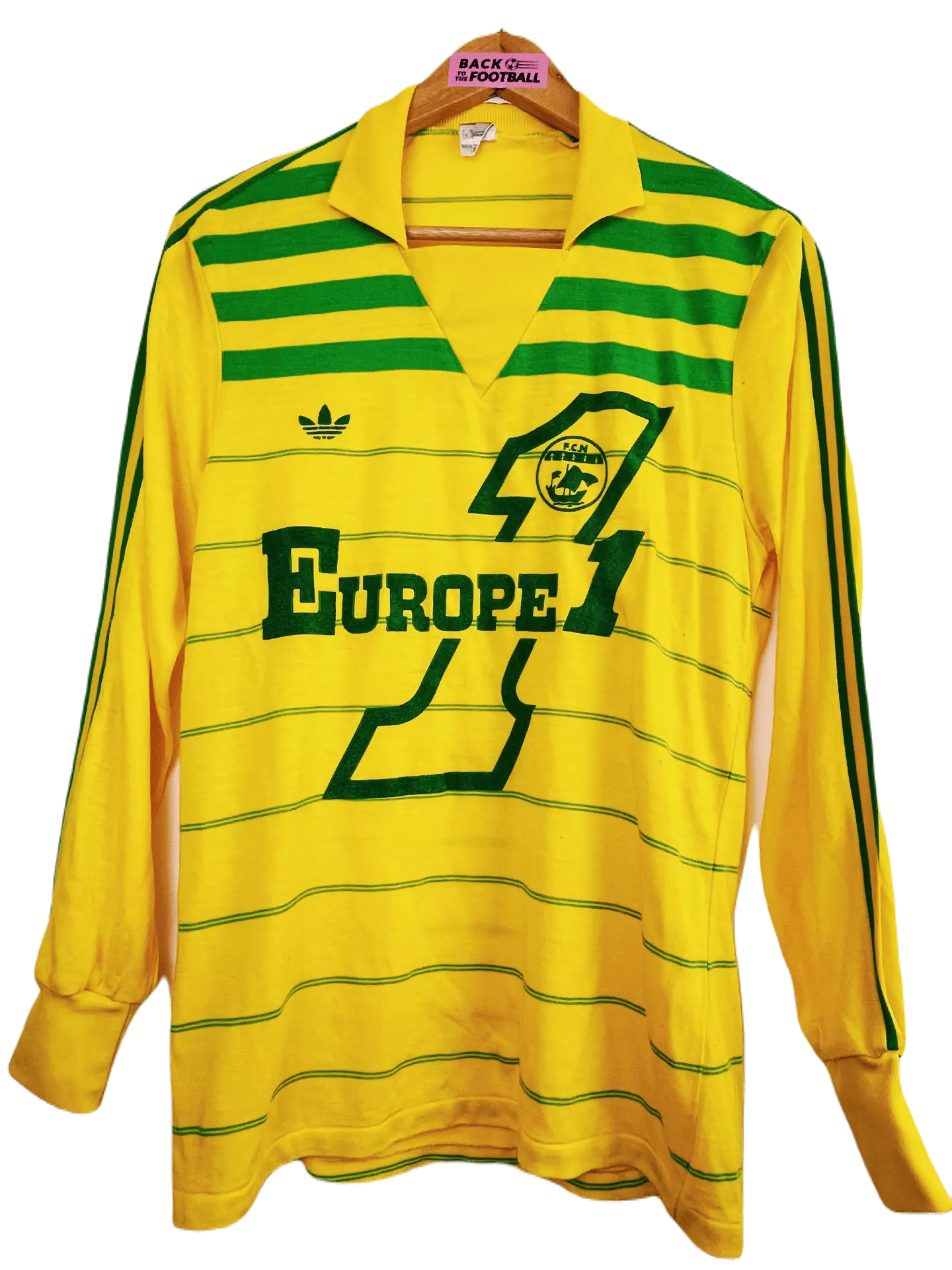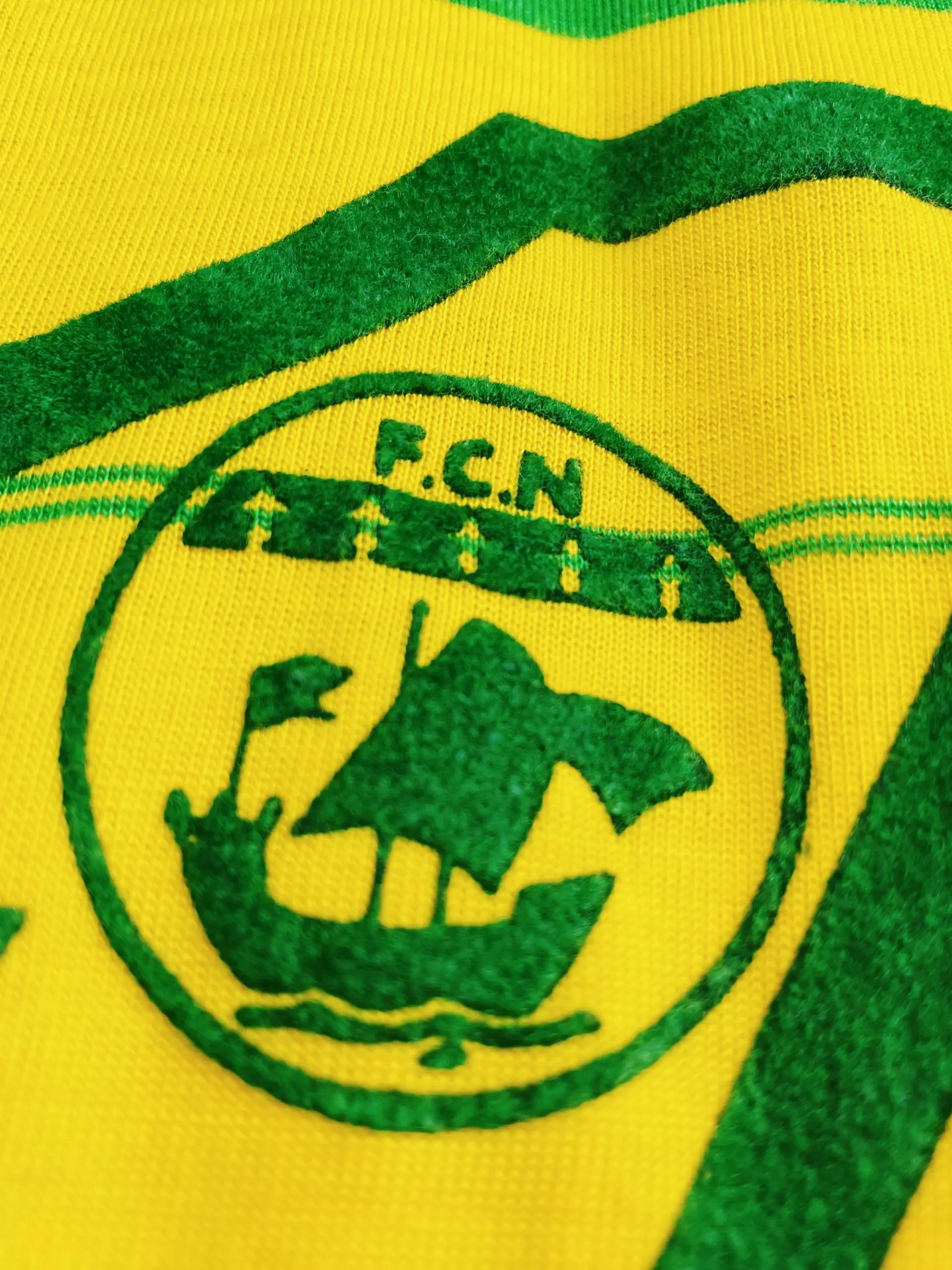 Taille : S Etat : 5/10, il y a des petits trous dans le dos (voir photo) Le maillot : rare maillot vintage du FC Nantes 1986/1987. L’ancien écusson, le logo Adidas à fleur et le sponsor Europe 1 sont en feutrine. Le maillot est fabriqué en France par Ventex. Histoire : saison moyenne pour les Nantais qui terminent à la 12ème place de Ligue 1. Ils seront éliminés très vite en coupes. Philippe Anziani sera le meilleur buteur des canaris avec 11 buts. Quelques joueurs : Deschamps, Desailly, Kombouaré, Zakarian, Morice…
