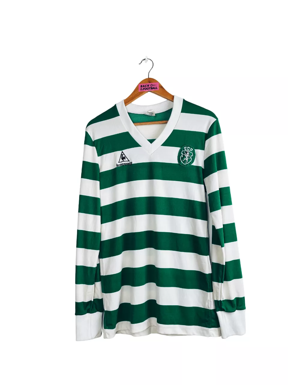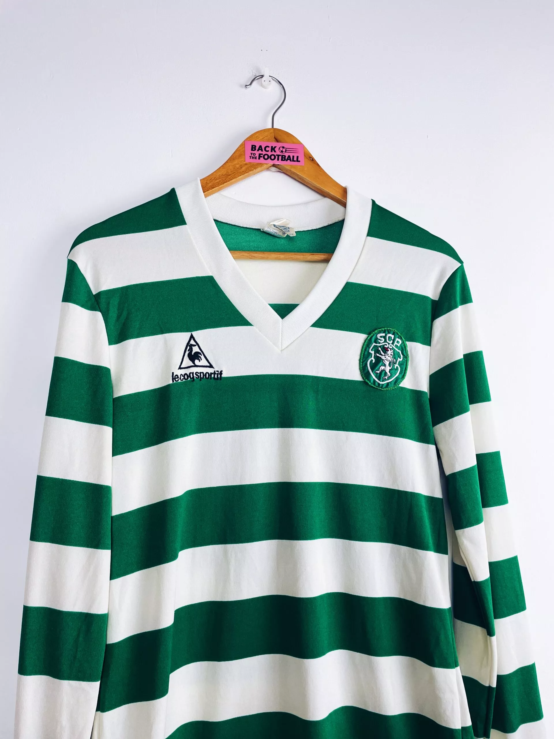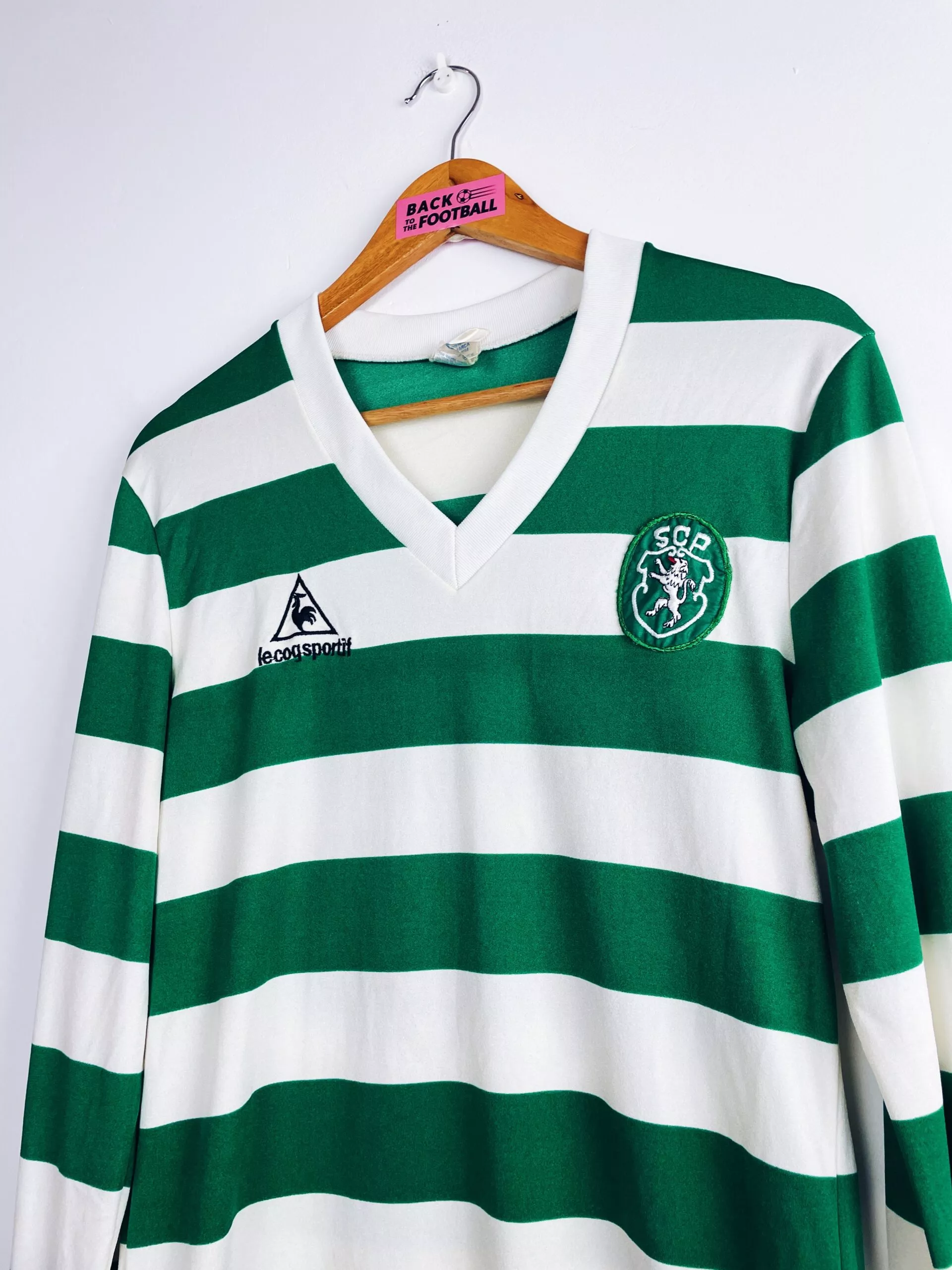 Taille : M Si tu veux plus d’infos, tu peux nous contacter par mail ou sur les réseaux 😉 Etat : 8.5/10. Excellent état, quelques légères bouloches Le maillot : maillot vintage domicile du Sporting CP 1986/1987 manches longues porté (match worn) par le numéro 13. L’écusson et le logo Le Coq Sportif sont brodés, le numéro 13 au dos est en feutrine. Si t’as le nom du joueur, on est preneur ! Histoire : en championnat, le Sporting Lisbonne termine à la 4ème place En Coupe du Portugal, le Sporting Portugal s’inclinera contre le rival de Lisbonne, le Benfica,…