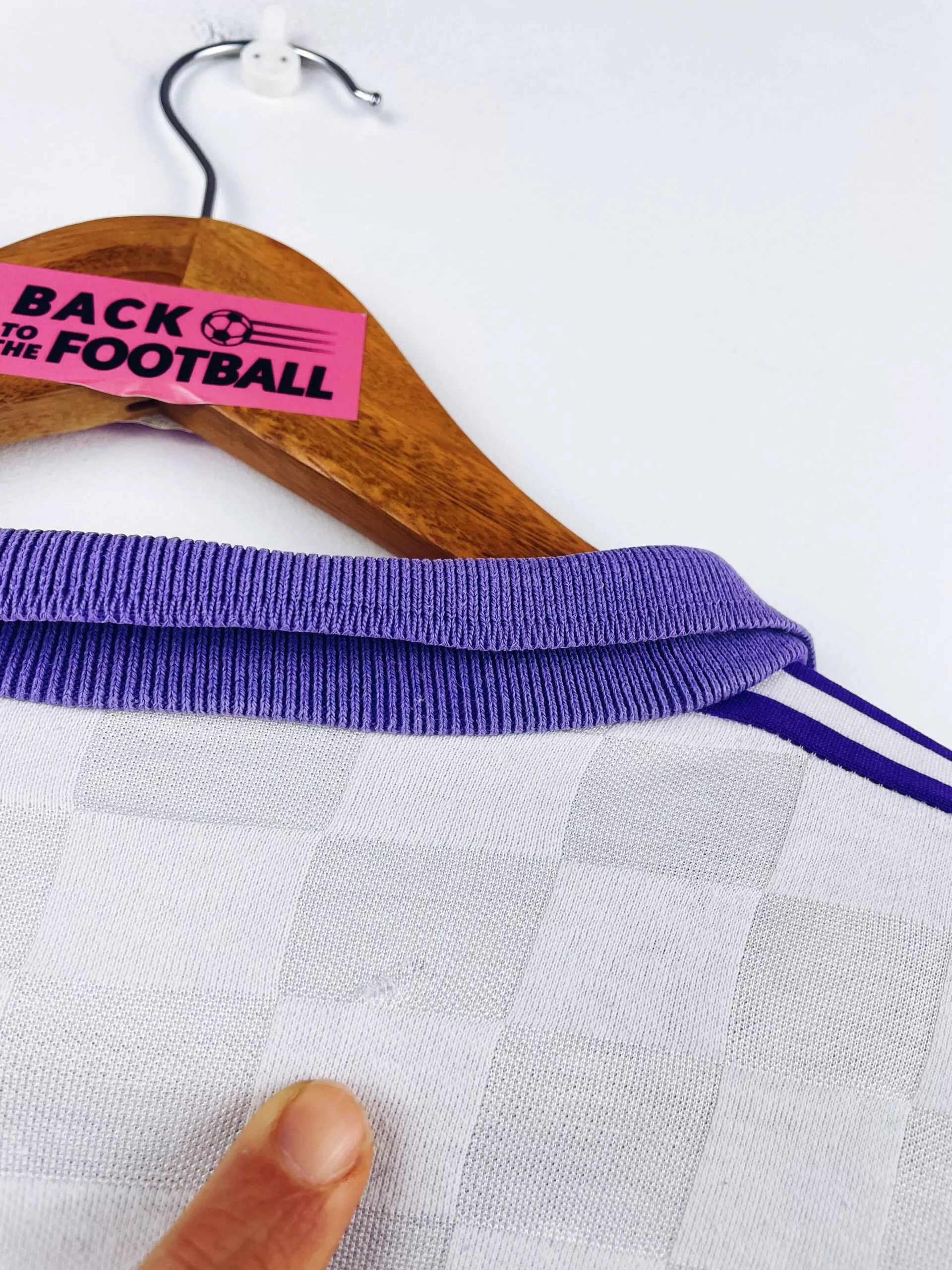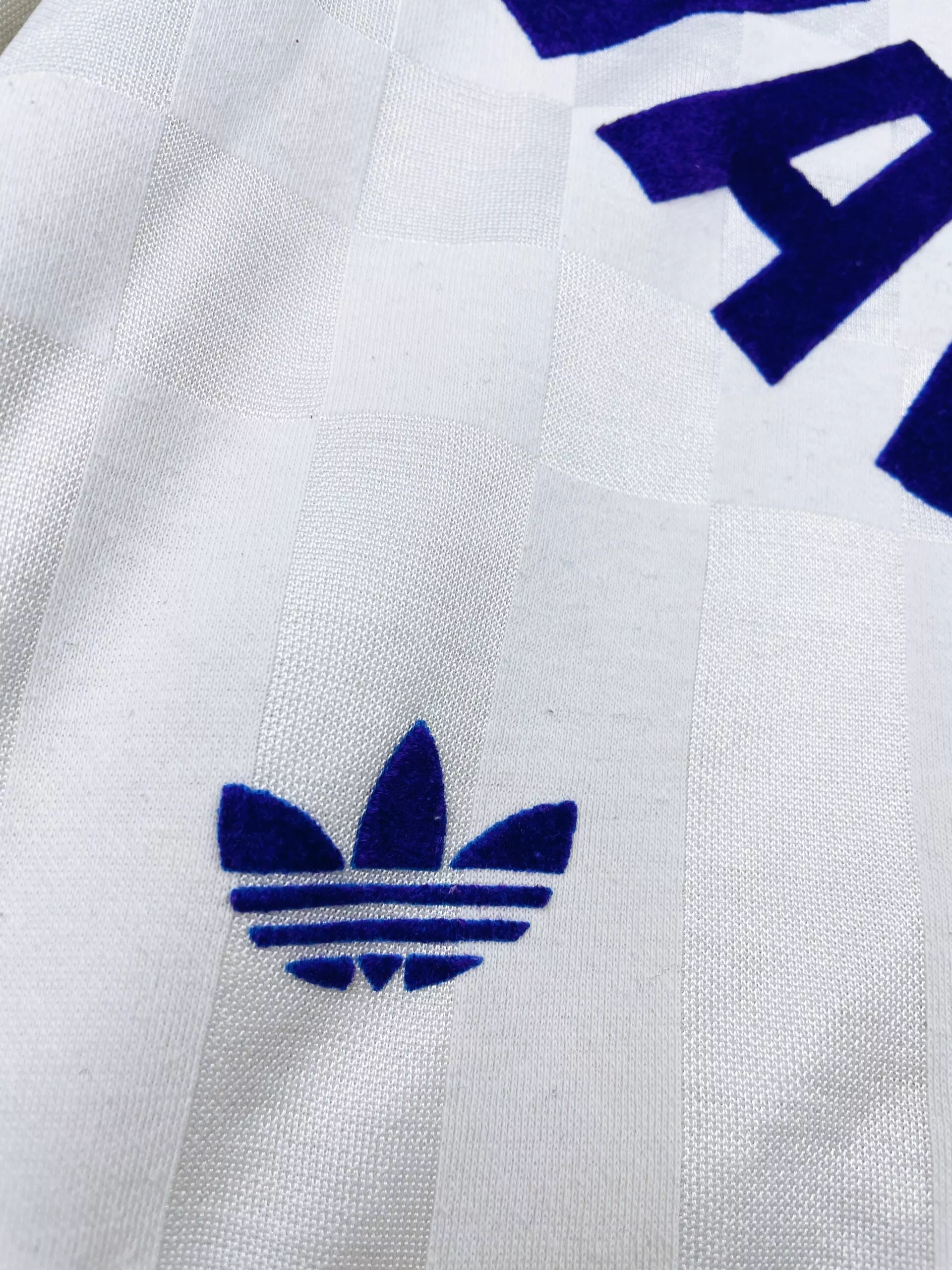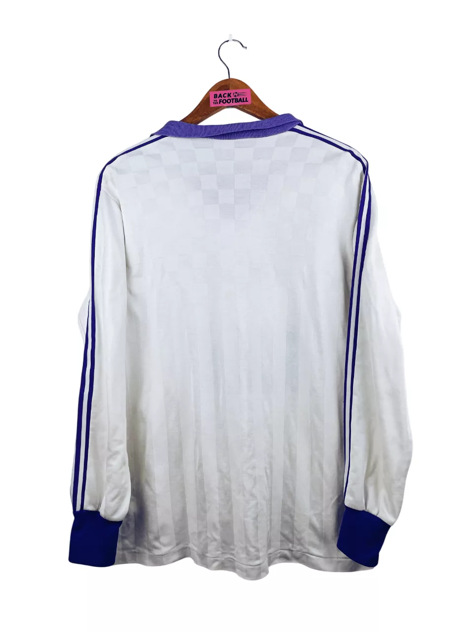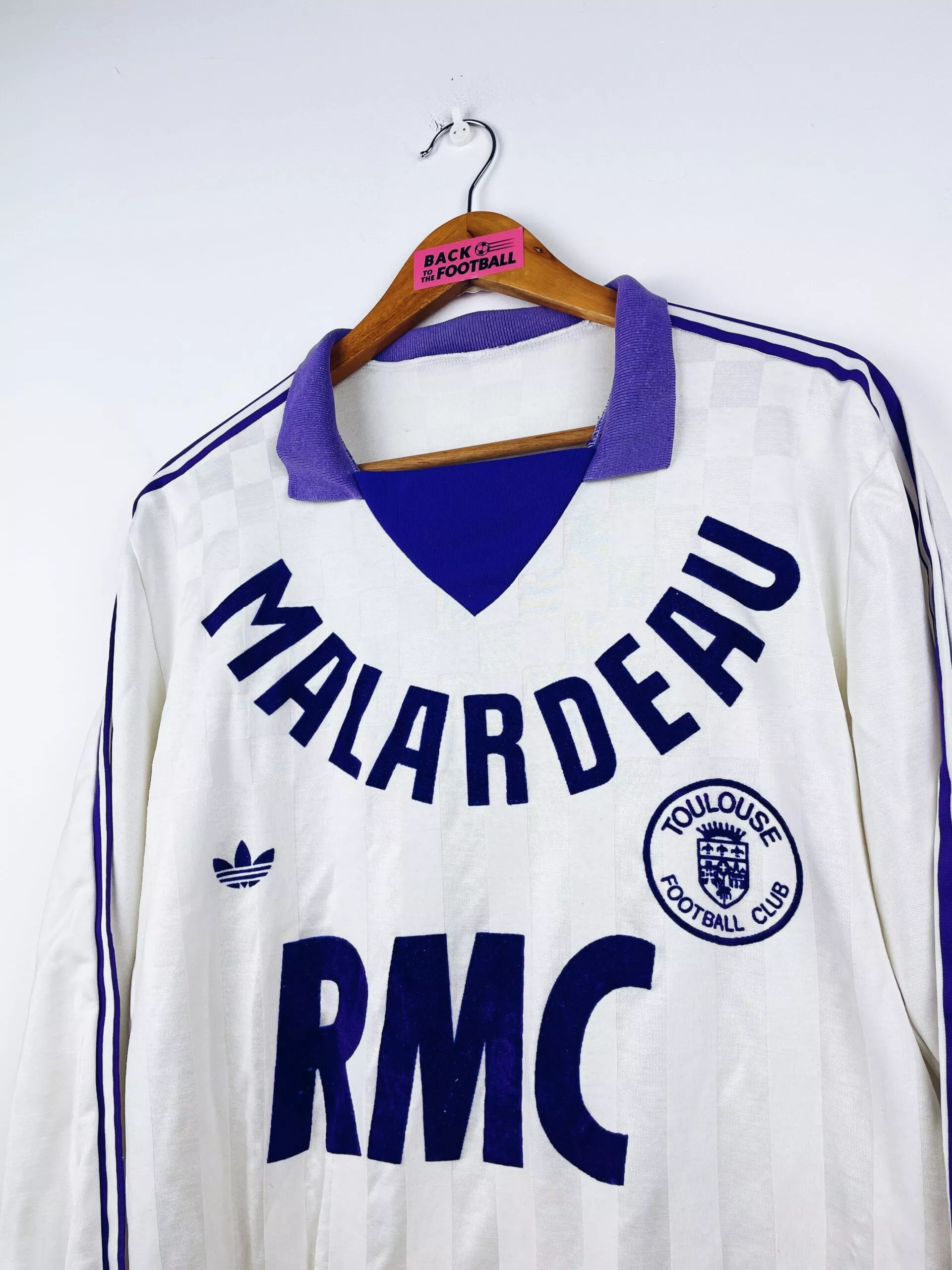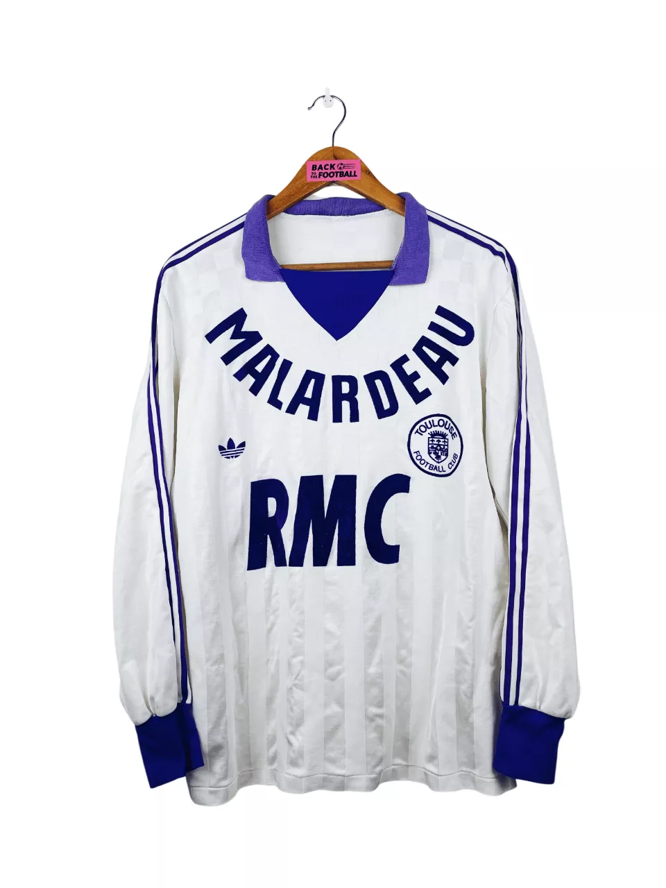 Taille : L Largeur : 53cm (aisselle à aisselle) Longueur : 69cm (base du col au bas) Si tu veux plus de détails, tu peux nous contacter par mail ou sur les réseaux 😉 Etat : 8/10, excellent état, les feutrines sont parfaitement conservées, le col est légèrement décoloré, petite trace jaune quasi invisible dans le dos (voir photos) Le maillot : maillot vintage domicile de Toulouse 1986/1988. L’écusson, le logo Adidas à trèfle et les sponsors Malardeau et RMC sont en feutrine. Les motifs en tramés sont splendides. Très beau maillot rétro du TFC ! Histoire : très belle…