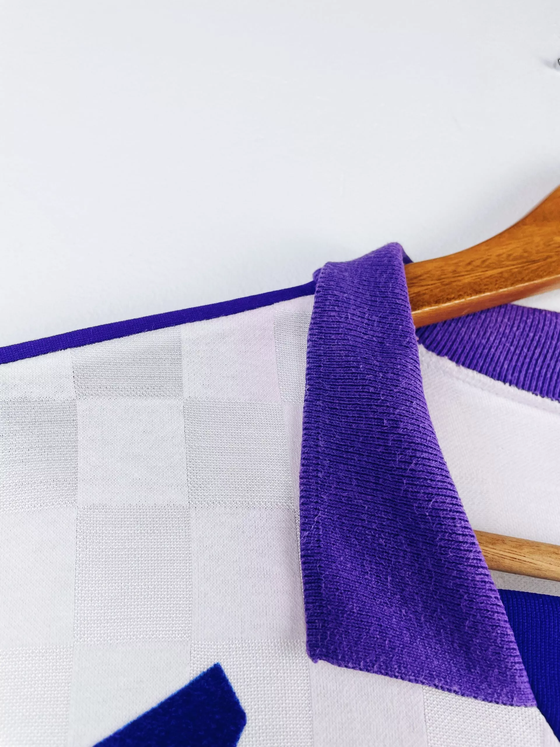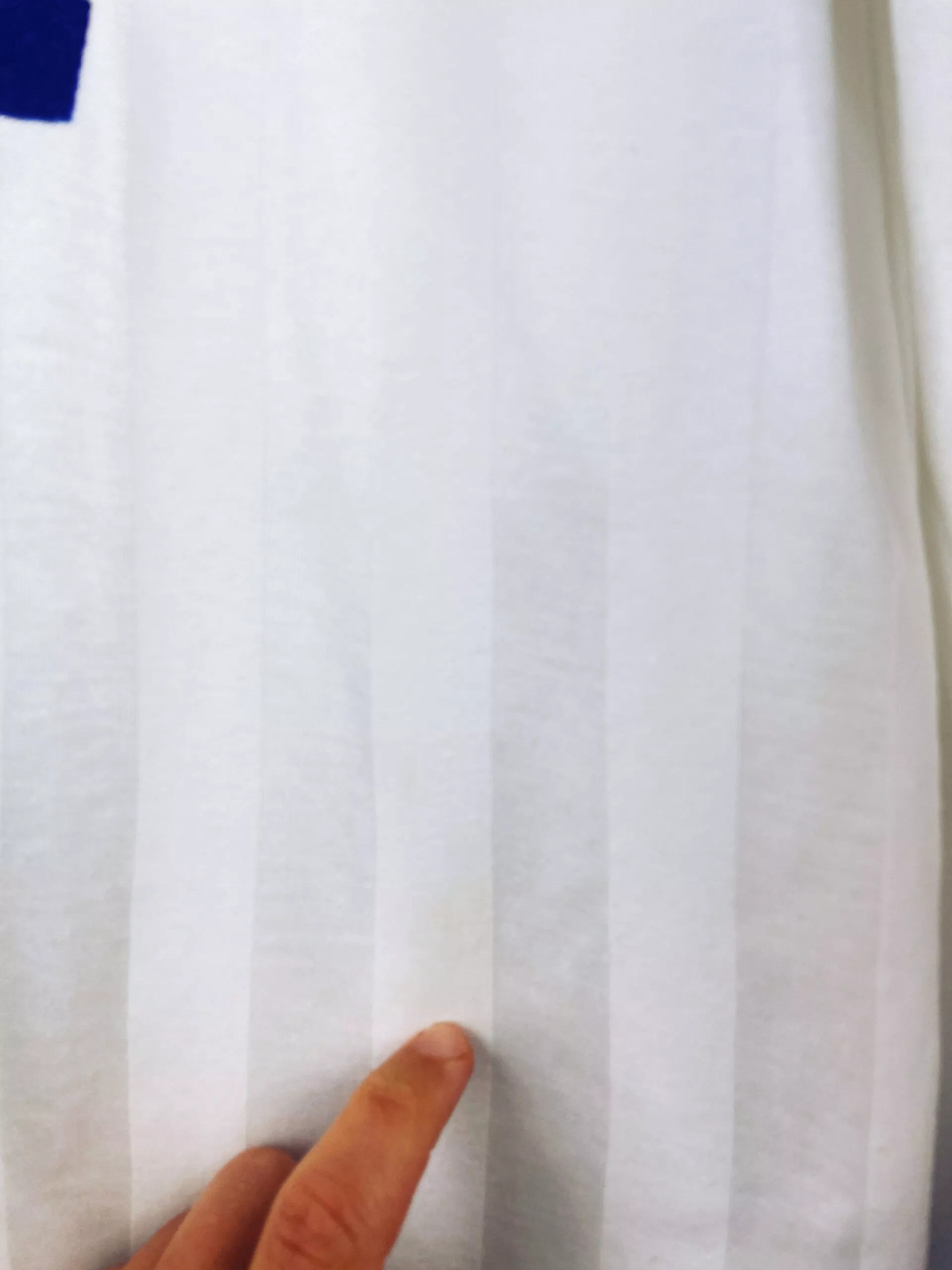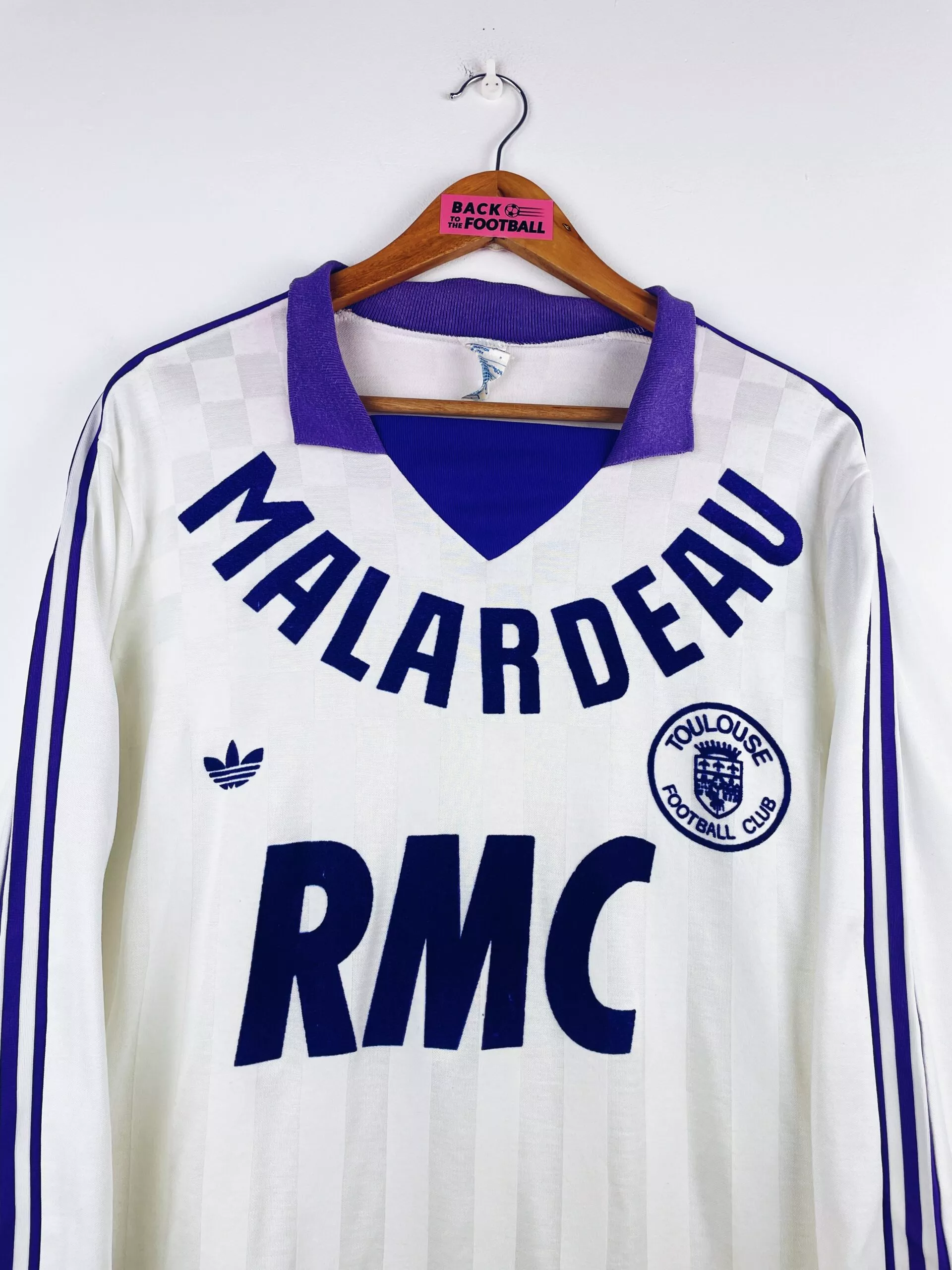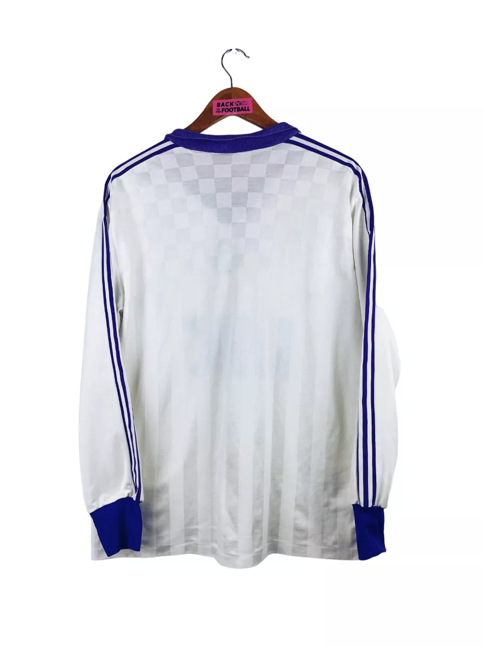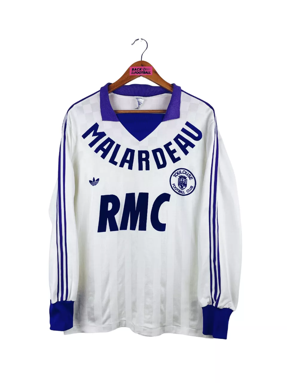 Taille : L Etat : 8/10, excellent état, les feutrines sont parfaitement conservées, le col a très légèrement décoloré autour, petite trace jaune quasi invisible en bas (voir photos) Le maillot : maillot vintage domicile de Toulouse 1986/1988. L’écusson, le logo Adidas à trèfle et les sponsors Malardeau et RMC sont en feutrine. Les motifs en tramés sont splendides. Très beau maillot rétro du TFC ! Histoire : très belle 1ère saison des Toulousains qui terminent sur le podium de Division 1. Ils sont éliminés en 8èmes de Coupe de France. C’est cette saison où le Tef l’emporte en 32èmes…
