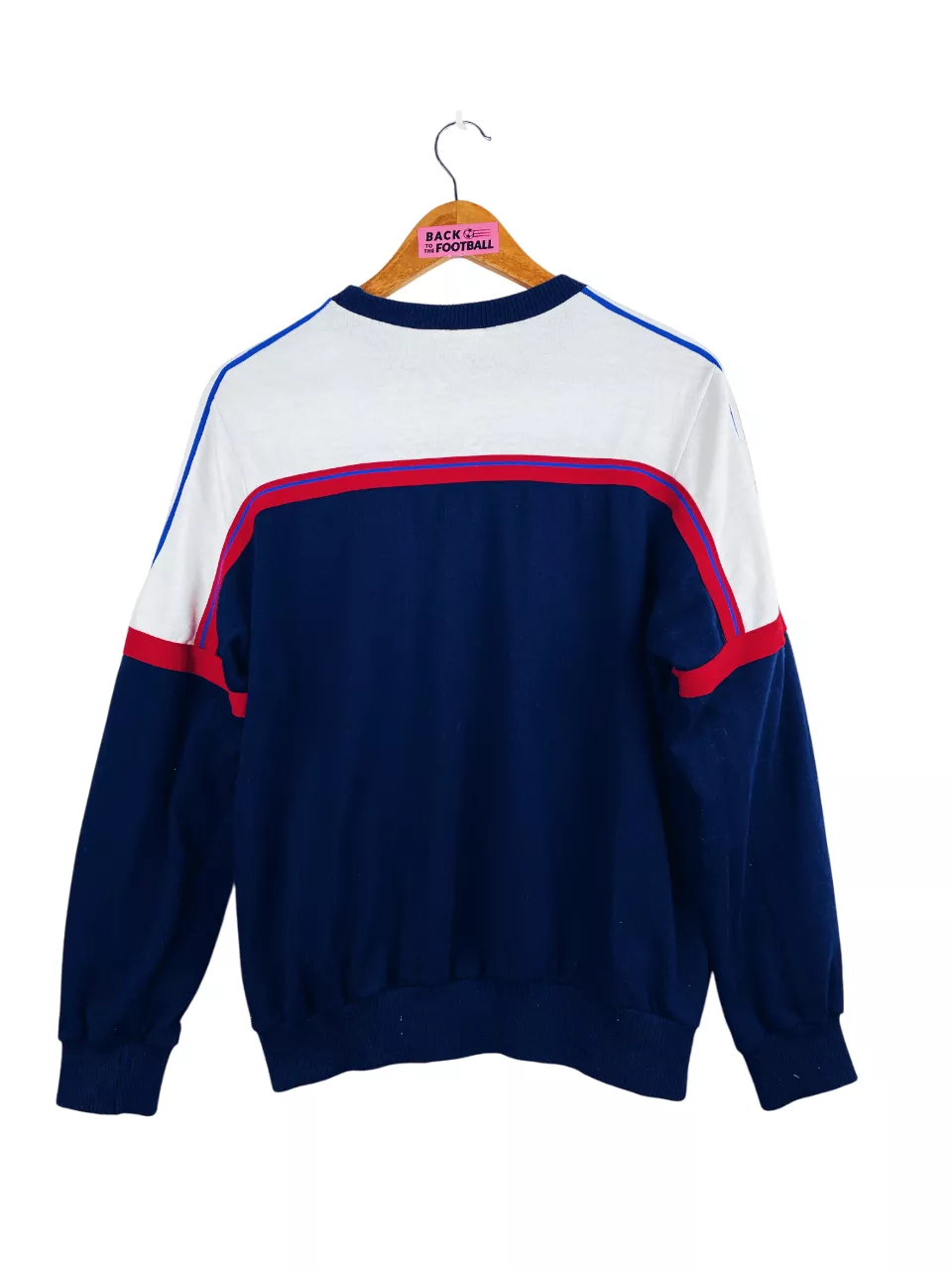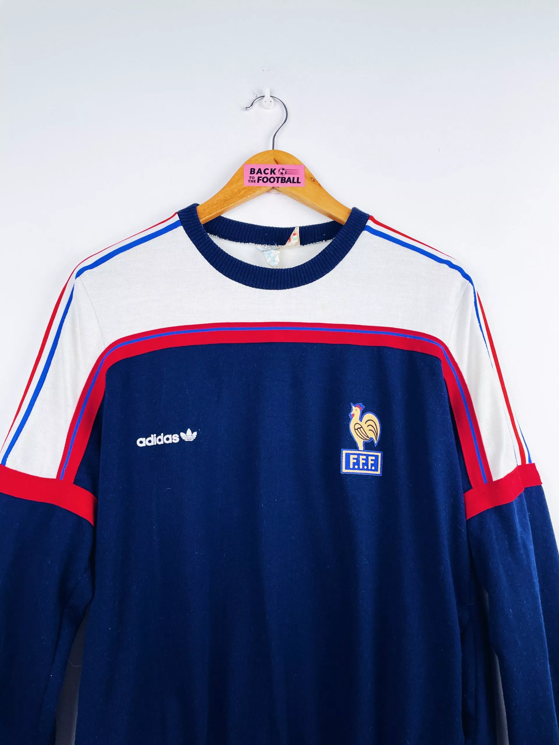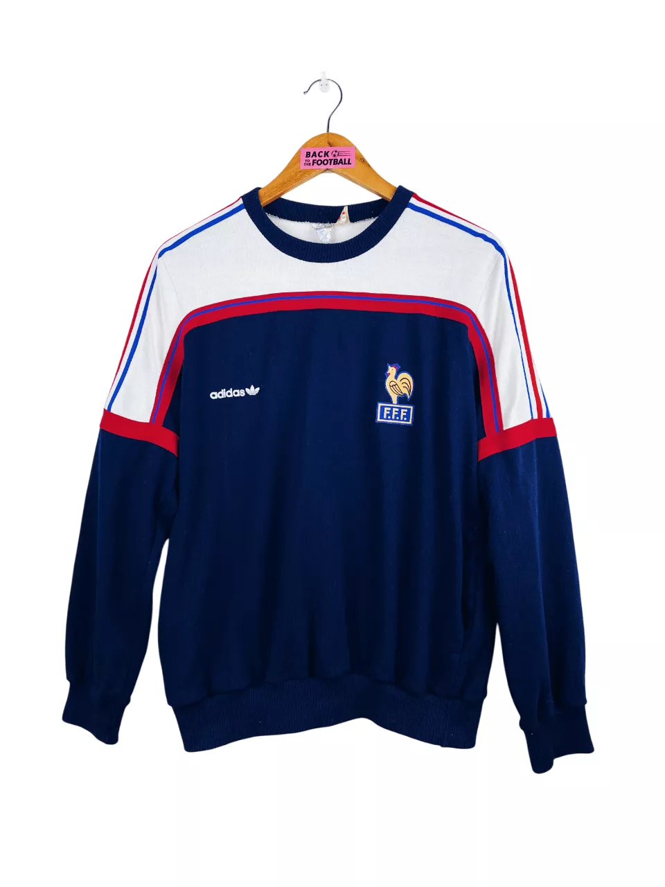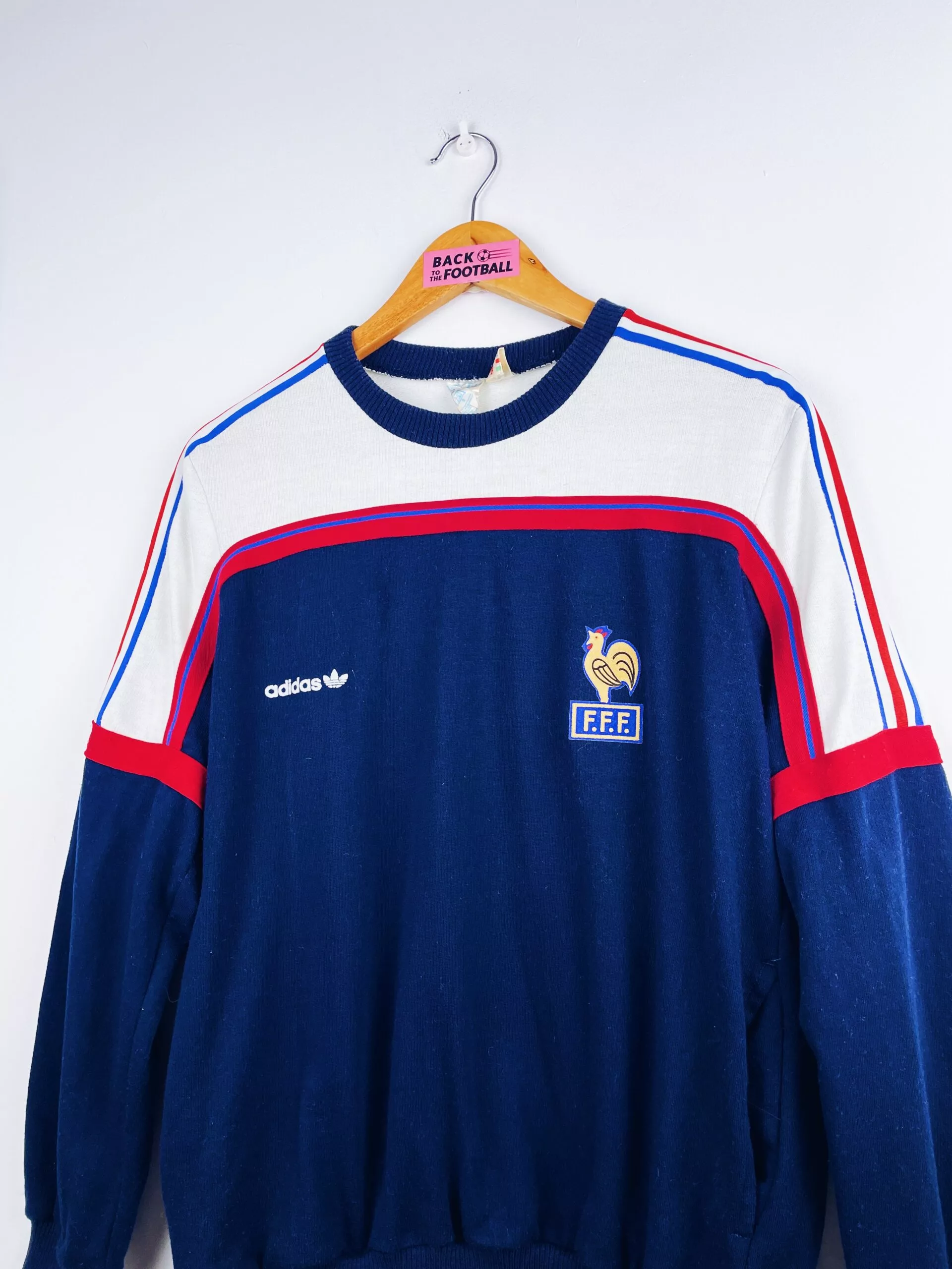 Taille : M Si tu veux plus de détails, tu peux nous contacter par mail ou sur les réseaux 😉 Etat : 8/10, très bon état, des peluches, mini trace en haut, quasi invisible (voir photos) Le sweat : sweat vintage de l’équipe de France 1986. L’écusson et le logo Adidas sont en feutrine. Made in France. Très beau sweatshirt rétro de la France ! Histoire : les Bleus se qualifient pour la Coupe du Monde 86 grâce à une première place dans un groupe très compliqué : Yougoslavie, Allemagne de l’Ouest ou encore Bulgarie. Les Bleus terminent deuxièmes de…