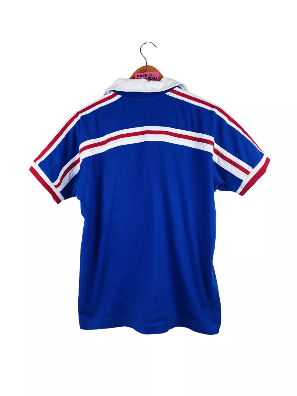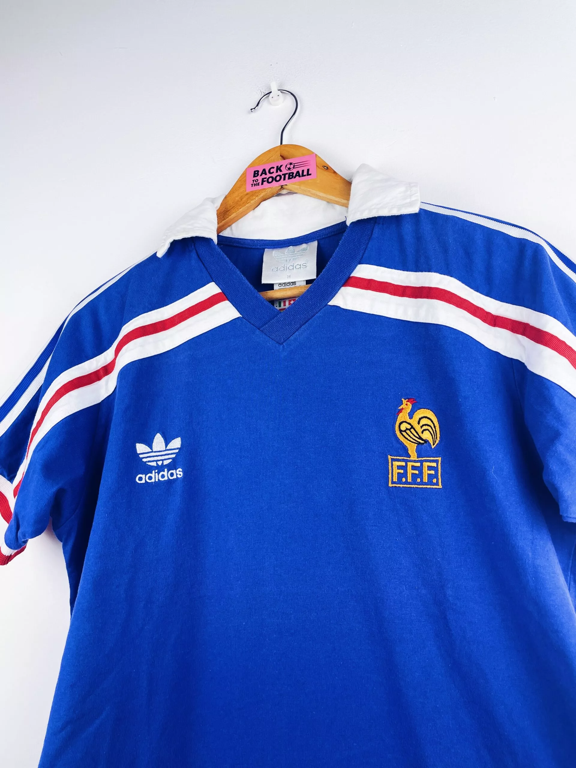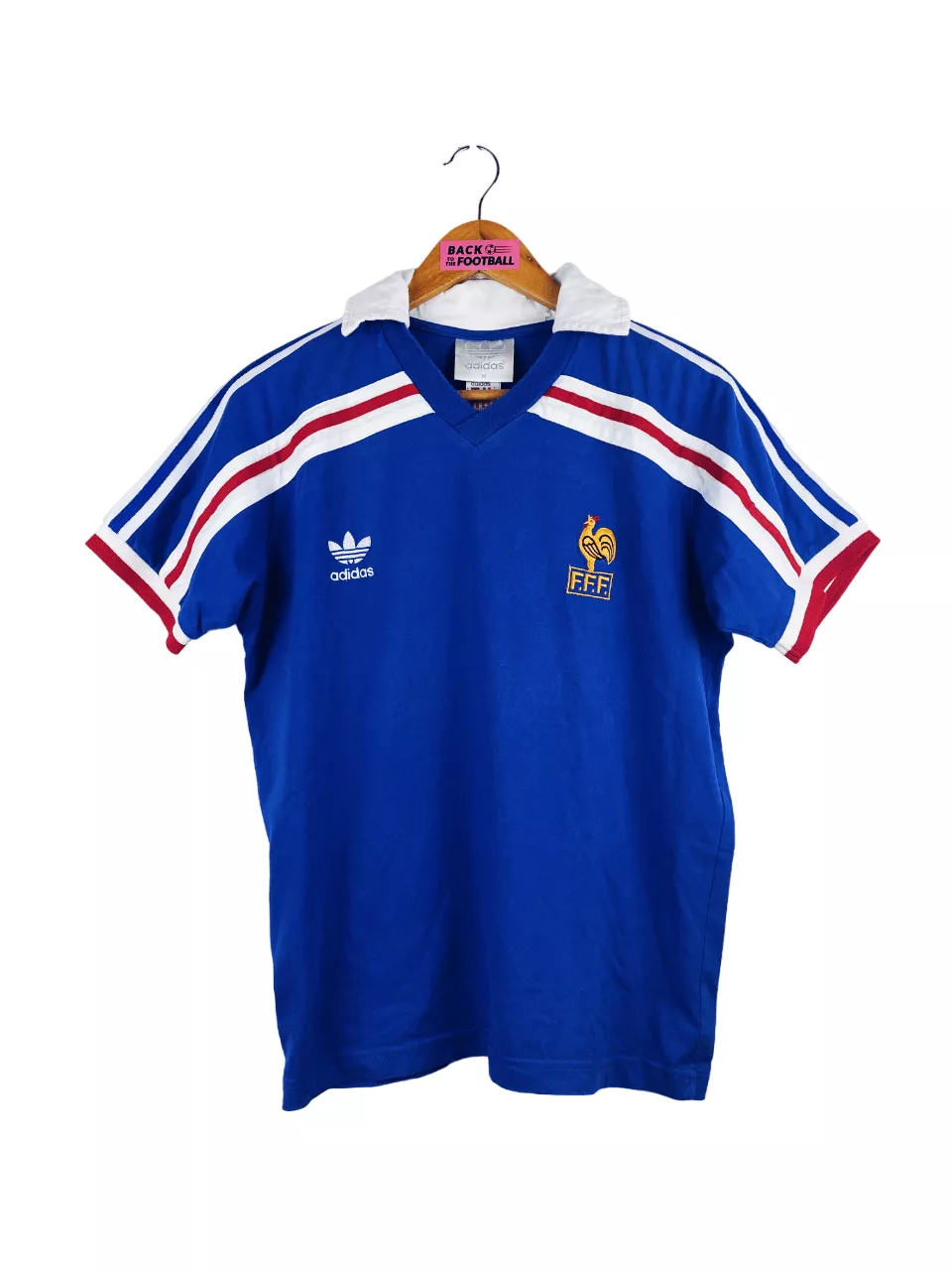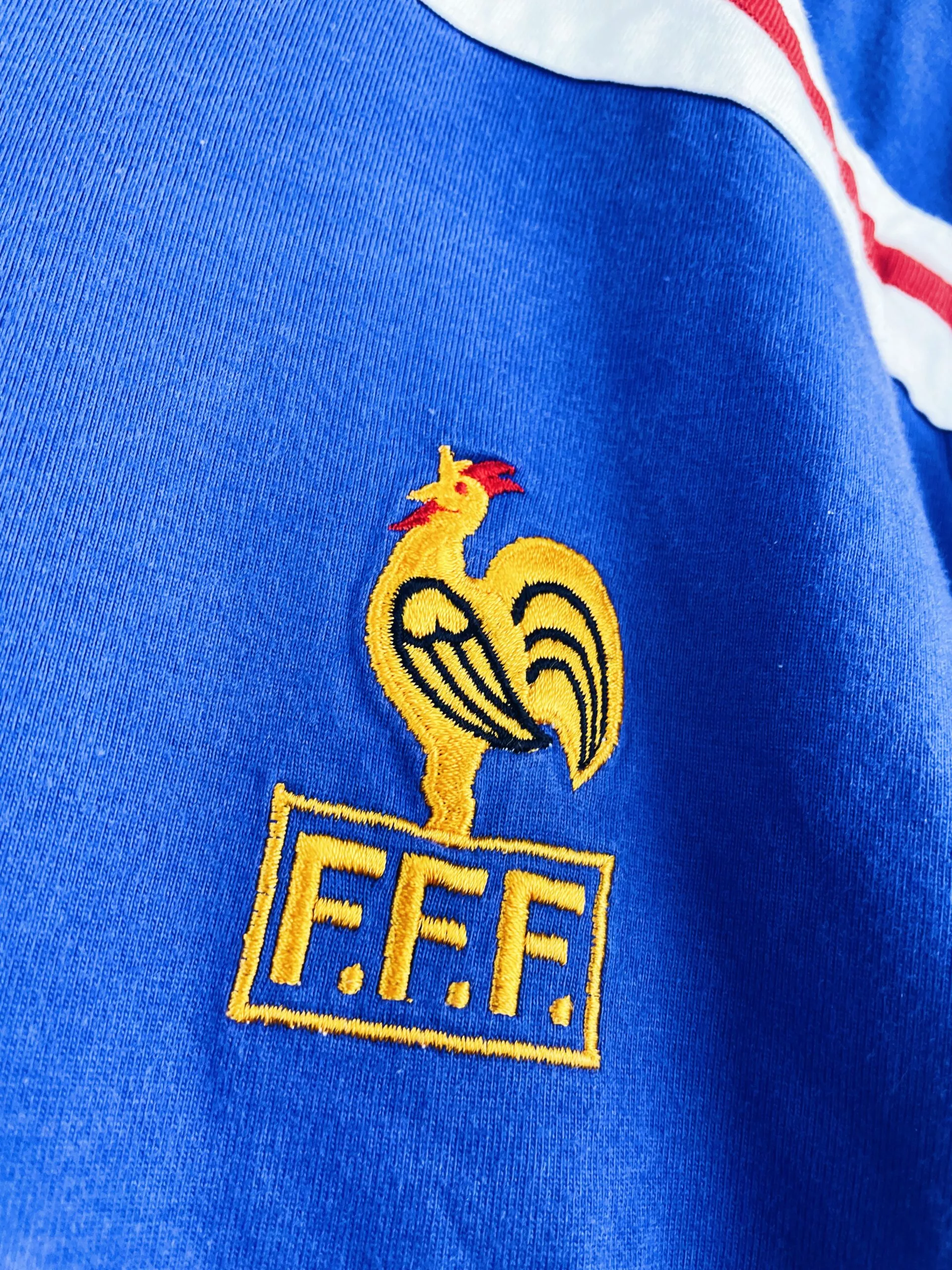 Taille : M Si tu veux plus de détails, tu peux nous contacter par mail ou sur les réseaux 😉 Etat : 8.5/10, excellent état, micros traces bleues à l’intérieur du col Le maillot : maillot vintage domicile de l’équipe de France 1986. L’écusson et le logo Adidas à trèfle sont brodés. Très beau maillot rétro de la France ! Histoire : les Bleus se qualifient pour la Coupe du Monde 86 grâce à une première place dans un groupe très compliqué : Yougoslavie, Allemagne de l’Est ou encore Bulgarie. Les Bleus terminent deuxièmes de leur groupe à la CDM,…