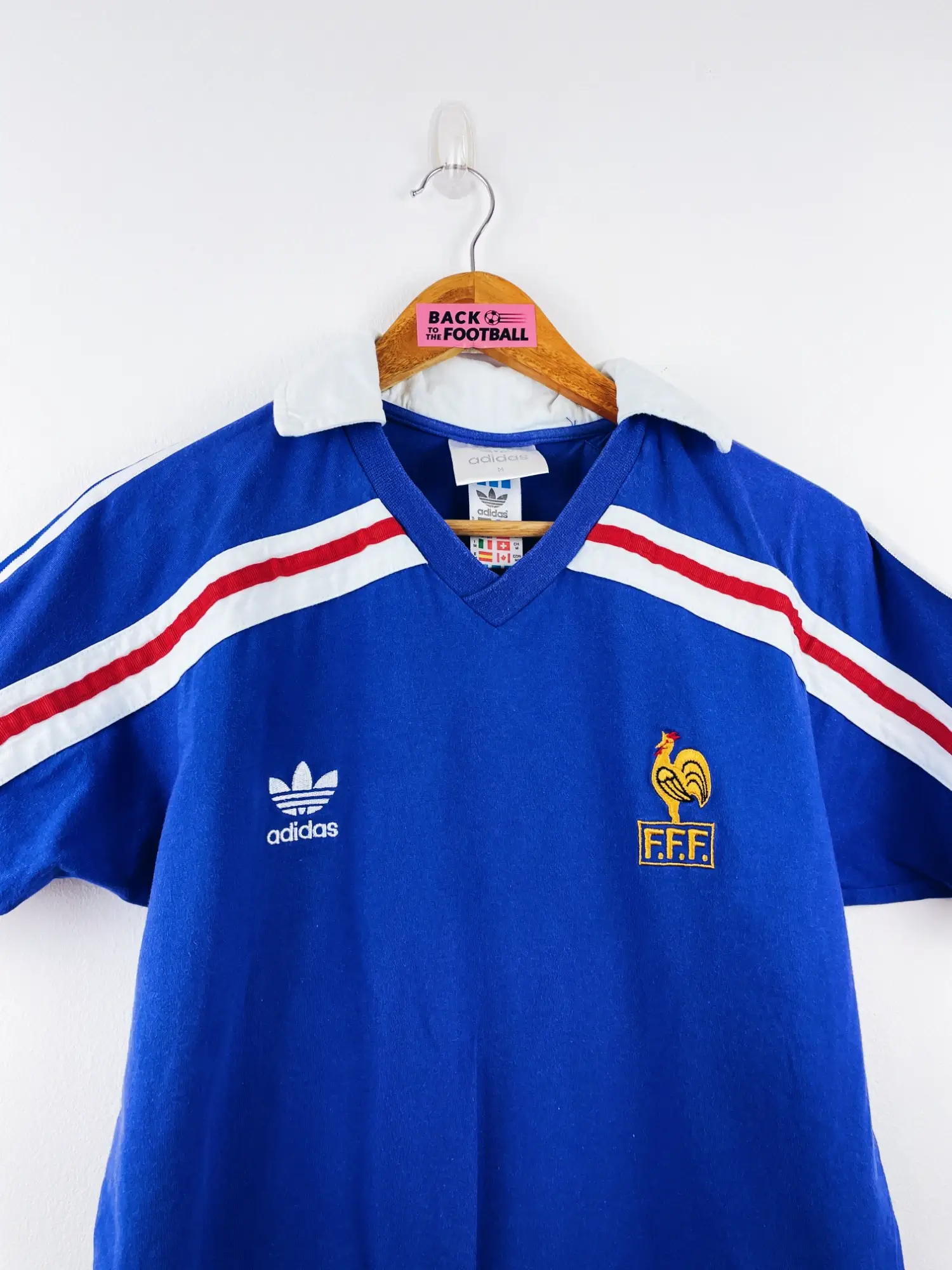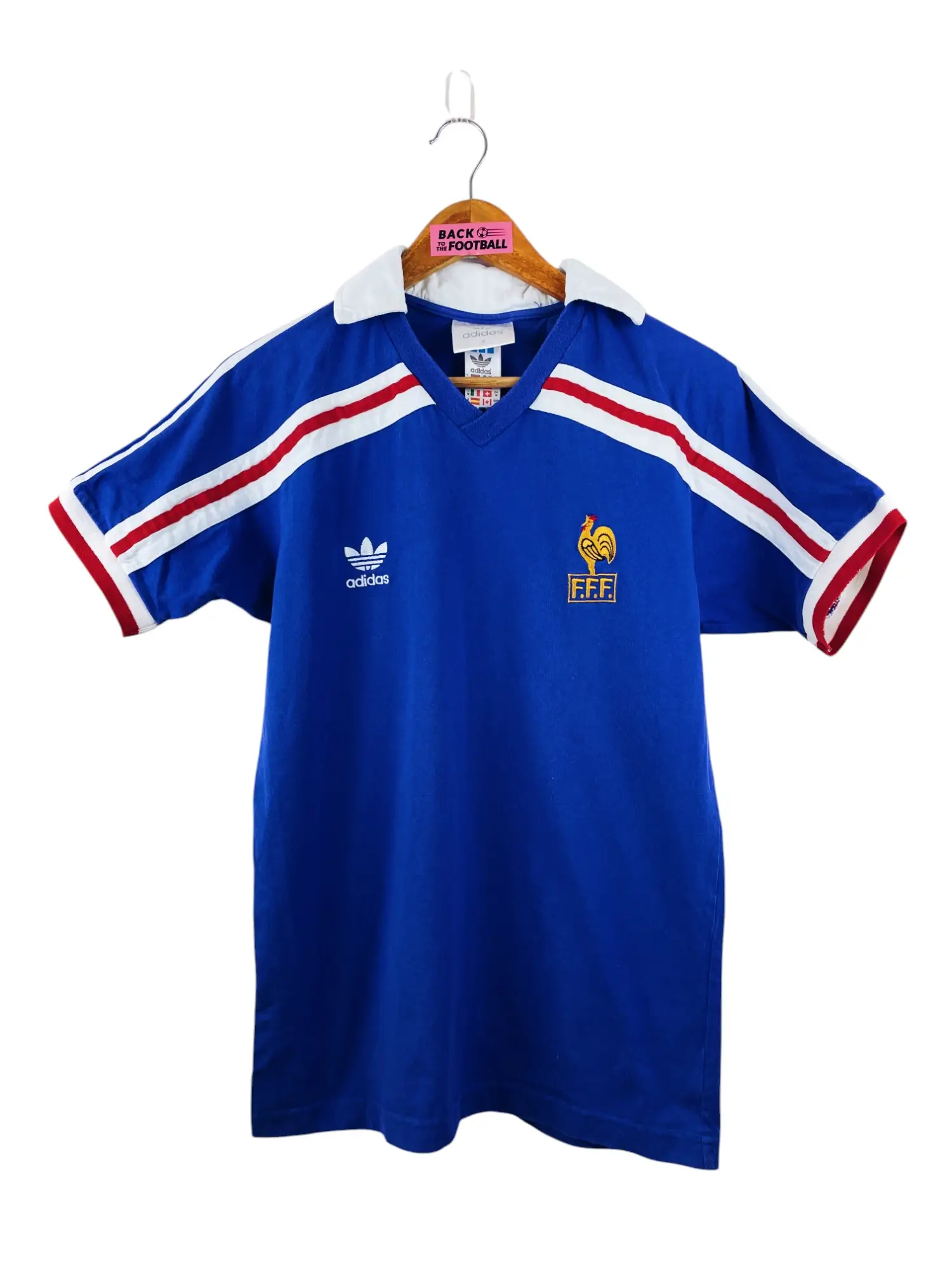 Taille : M Largeur : 48cm (aisselle à aisselle) Longueur : 69cm (col au bas) Si tu veux plus de détails, tu peux nous contacter par mail ou sur les réseaux 😉 Etat : 8.5/10, excellent état, des peluches Le maillot : maillot vintage domicile de l’équipe de France 1986. L’écusson et le logo Adidas à trèfle sont brodés. Très beau maillot rétro de la France ! Histoire : les Bleus se qualifient pour la Coupe du Monde 86 grâce à une première place dans un groupe très compliqué : Yougoslavie, Allemagne de l’Est ou encore Bulgarie. Les Bleus terminent…