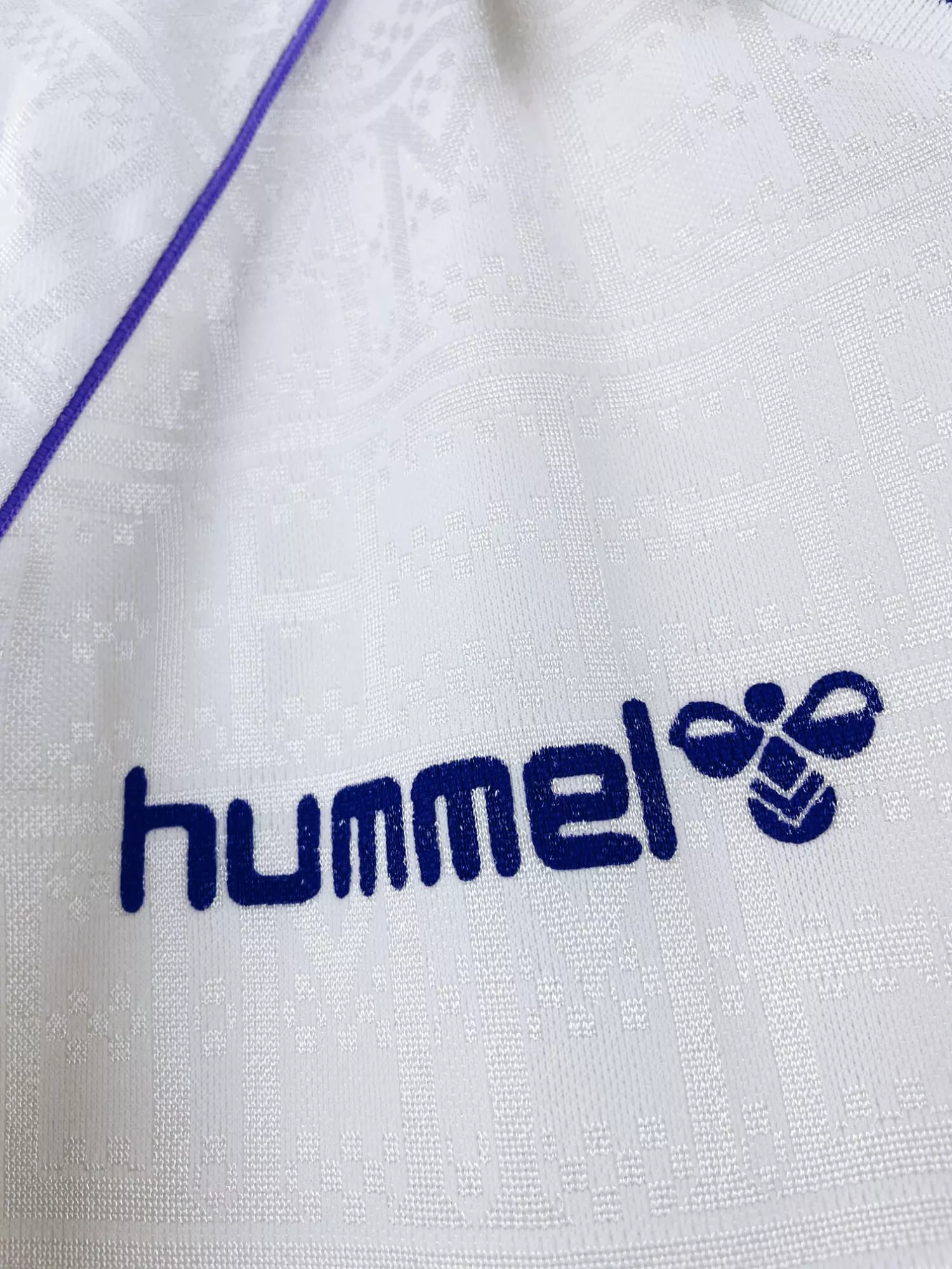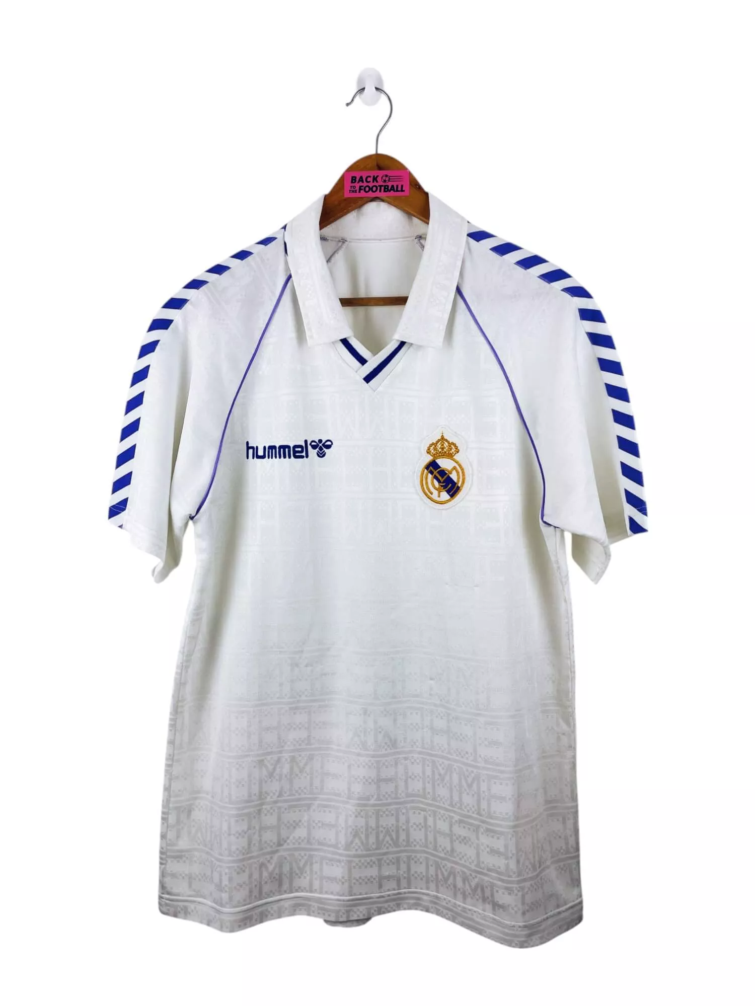 Taille : L Largeur : 52cm (aisselle à aisselle) Longueur : 73cm (base du col au bas du maillot) Si tu veux plus de détails, tu peux nous contacter par mail ou sur les réseaux 😉 Etat : 8.5/10, excellent état, mini accroc devant, étiquette dans le col coupée (voir photo) Le maillot : maillot vintage domicile du Real Madrid 1987/1988. L’écusson est brodé, le logo Hummel est en feutrine. On peut voir le logo Hummel en tramé sur le tissu. Très beau maillot rétro du Real Madrid ! Histoire : les madrilènes remportent la Liga devant la Real Sociedad.…