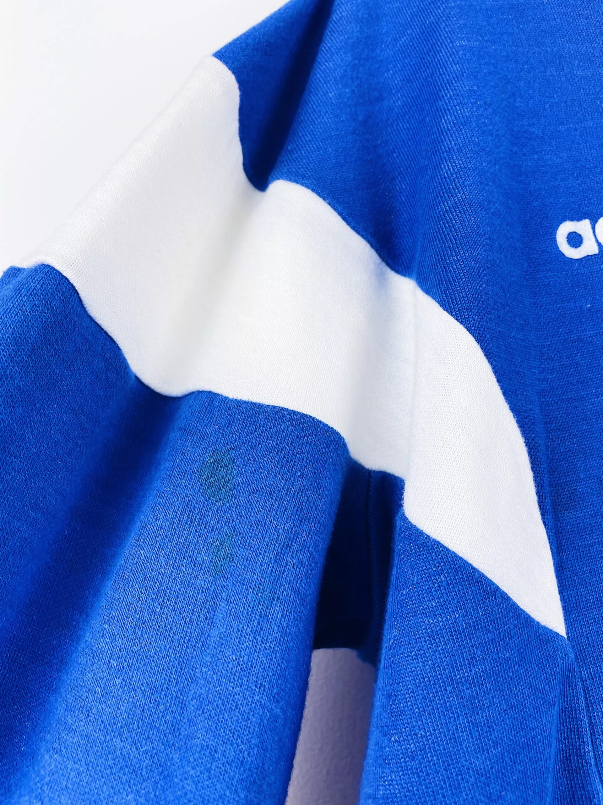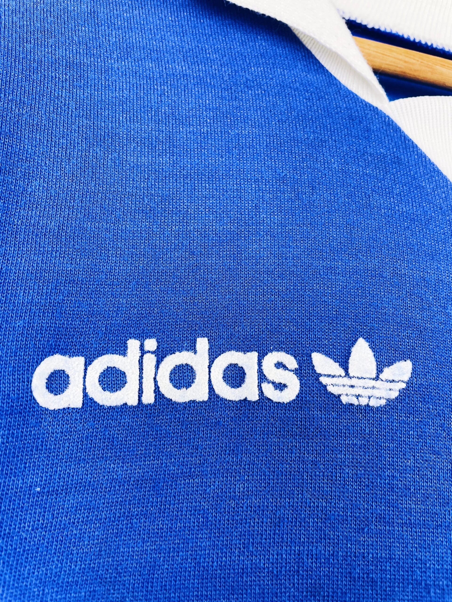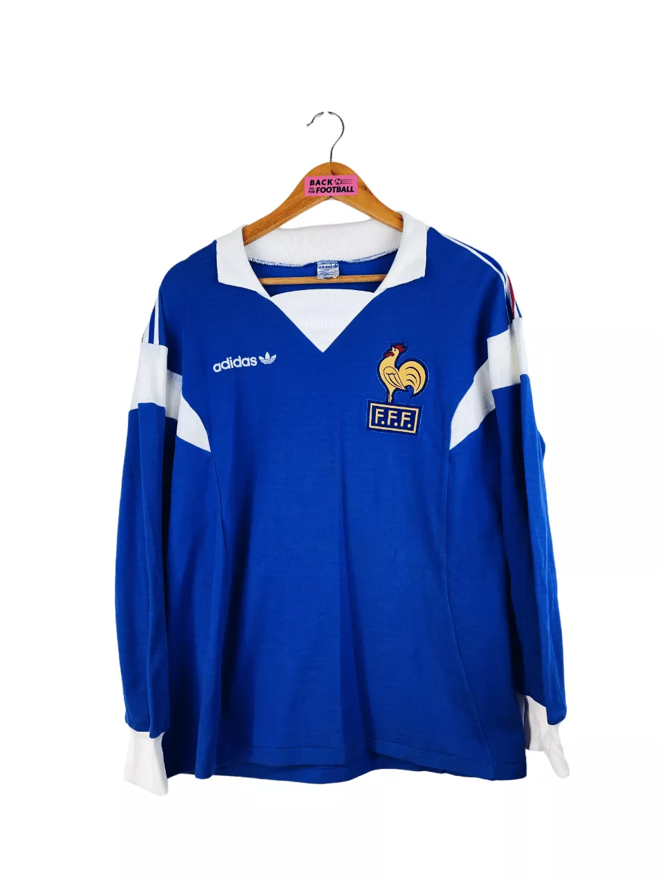 Taille : M Largeur : 52cm (aisselle à aisselle) Longueur : 65cm Si tu veux plus de détails, tu peux nous contacter par mail ou sur les réseaux 😉 Etat : 7/10, très bon état général, les feutrines sont en parfait état. Il y a des traces du match : au bout des manches et au niveau du biceps. Le bleu a un peu perdu de sa brillance. Le maillot : maillot vintage domicile de l’équipe de France 1987 manches longues porté (match worn) par le numéro 13. Le maillot a été porté par les espoirs : Zidane, Dugarry, Pedros…