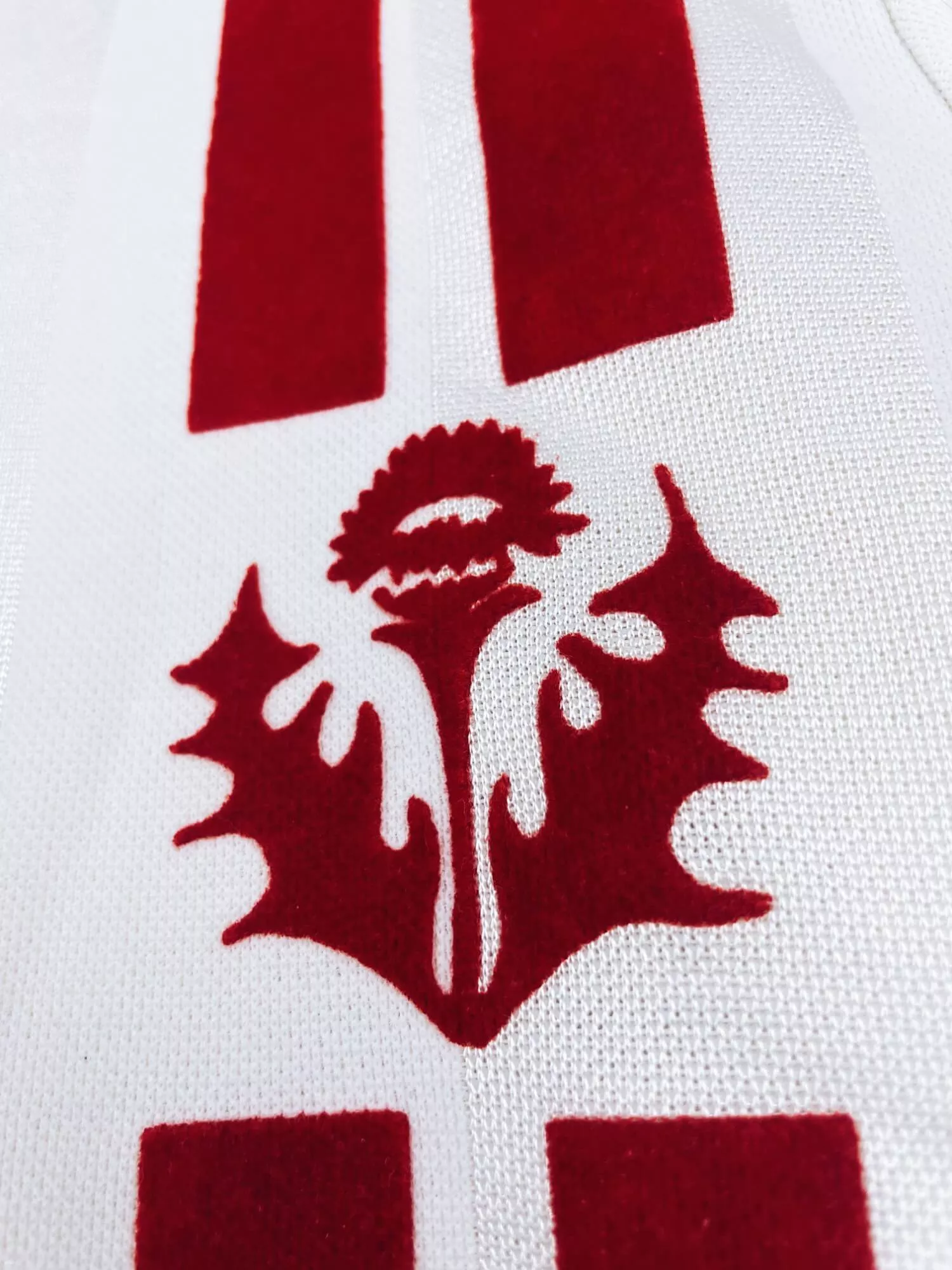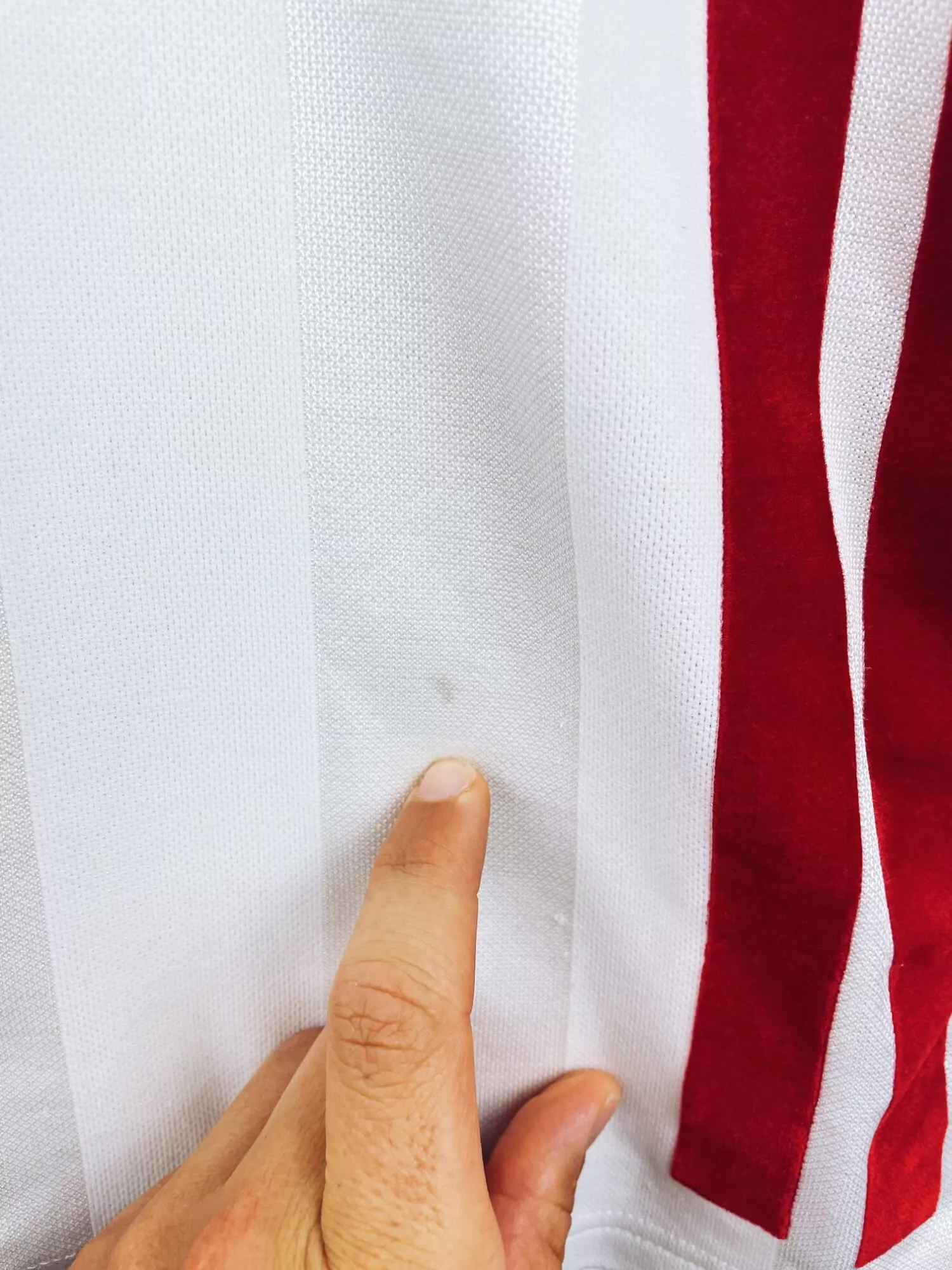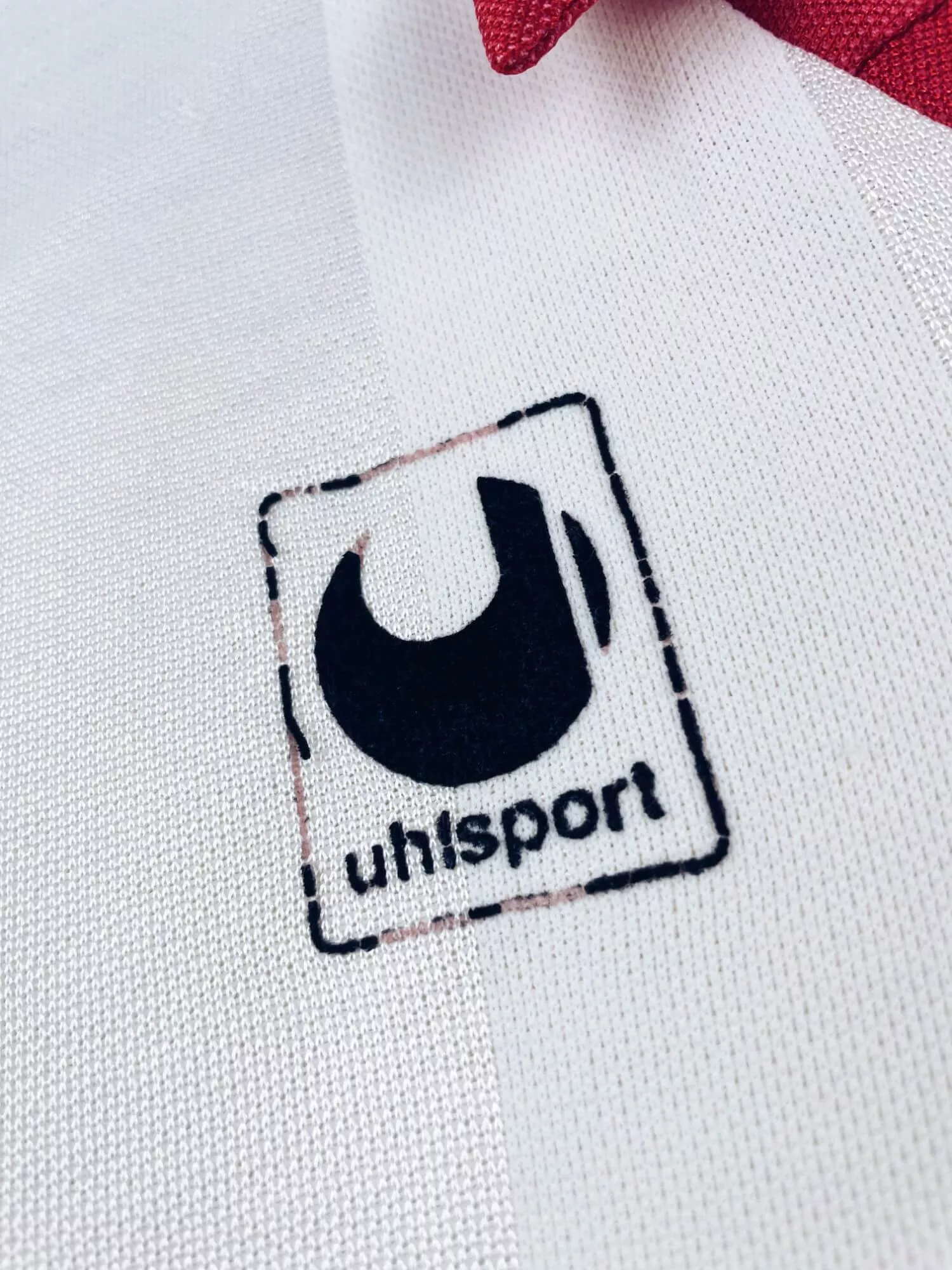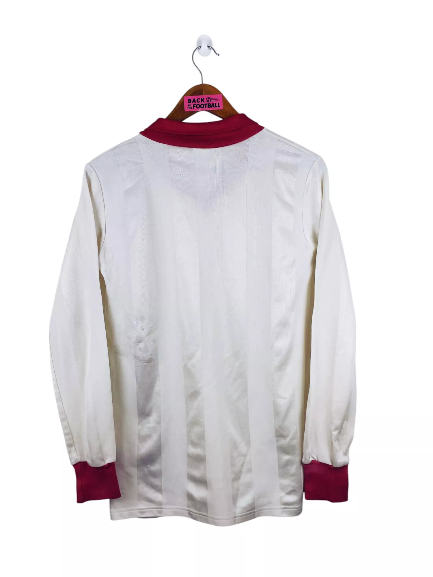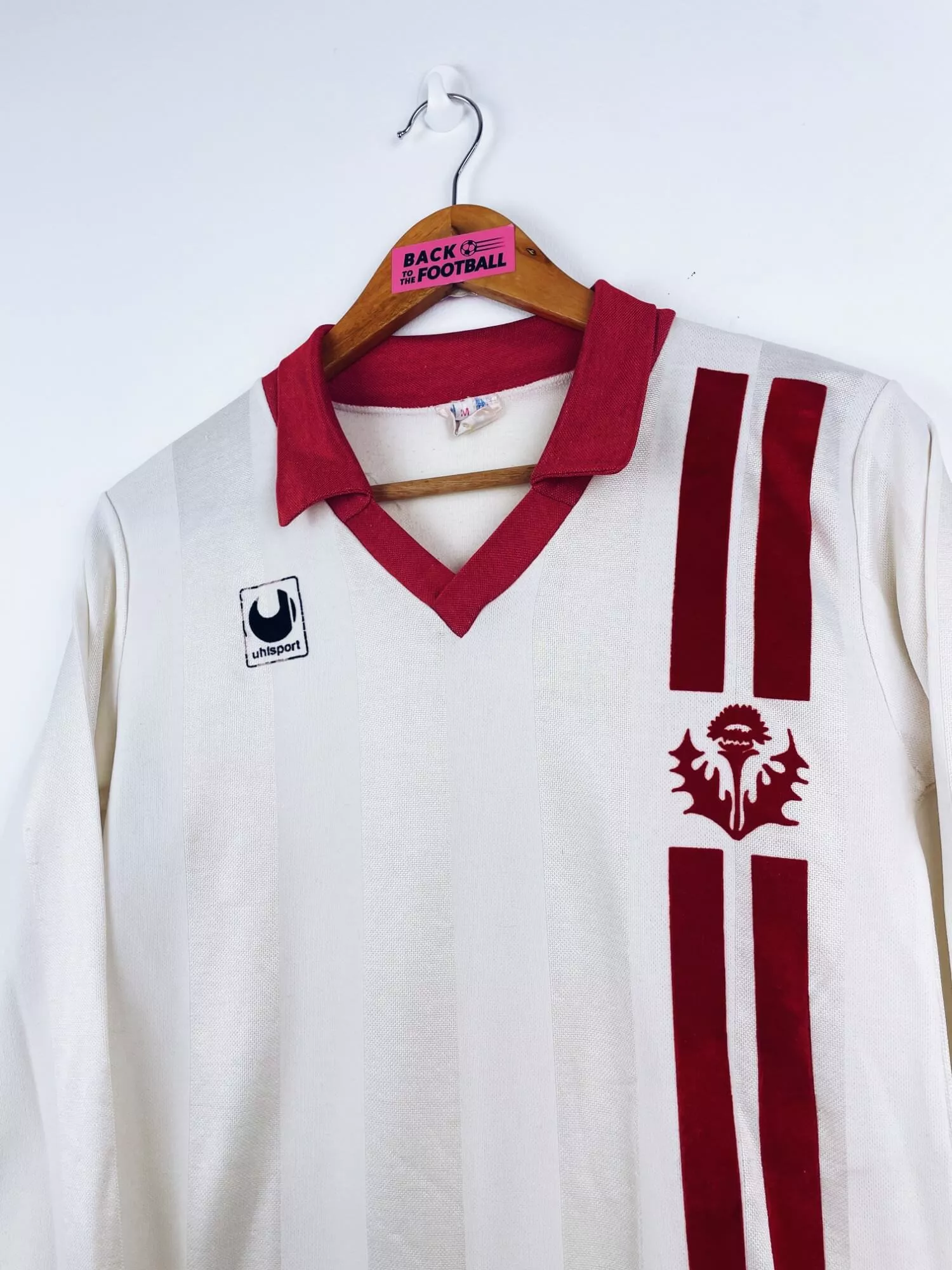 Taille : M, taille près du corps Largeur : 46cm (aisselle à aisselle) Longueur : 69cm (base du col au bas) Si tu veux plus de détails, tu peux nous contacter par mail ou sur les réseaux 😉 Etat : 6/10, bon état général. A noter : logo Uhlsport abimé, légères bouloches, petite trace en bas, tissu un peu abimé à un endroit dans le dos (voir photos) Le maillot : maillot vintage domicile de l’AS Nancy-Lorraine 1988/1989 en manches longues. L’écusson et le logo Uhlsport sont en feutrine. Très beau maillot rétro de Nancy ! Histoire : l’ASNL termine…