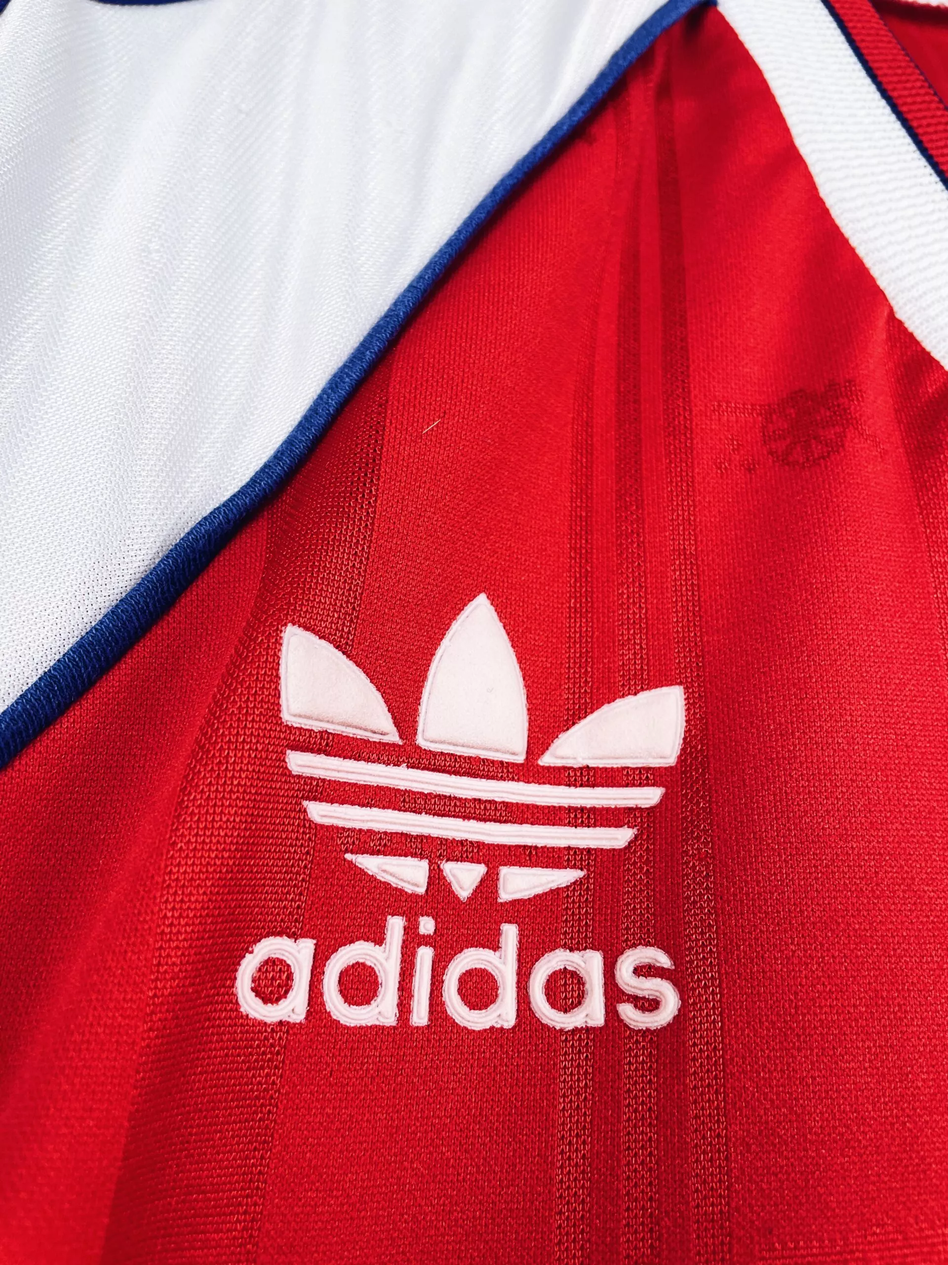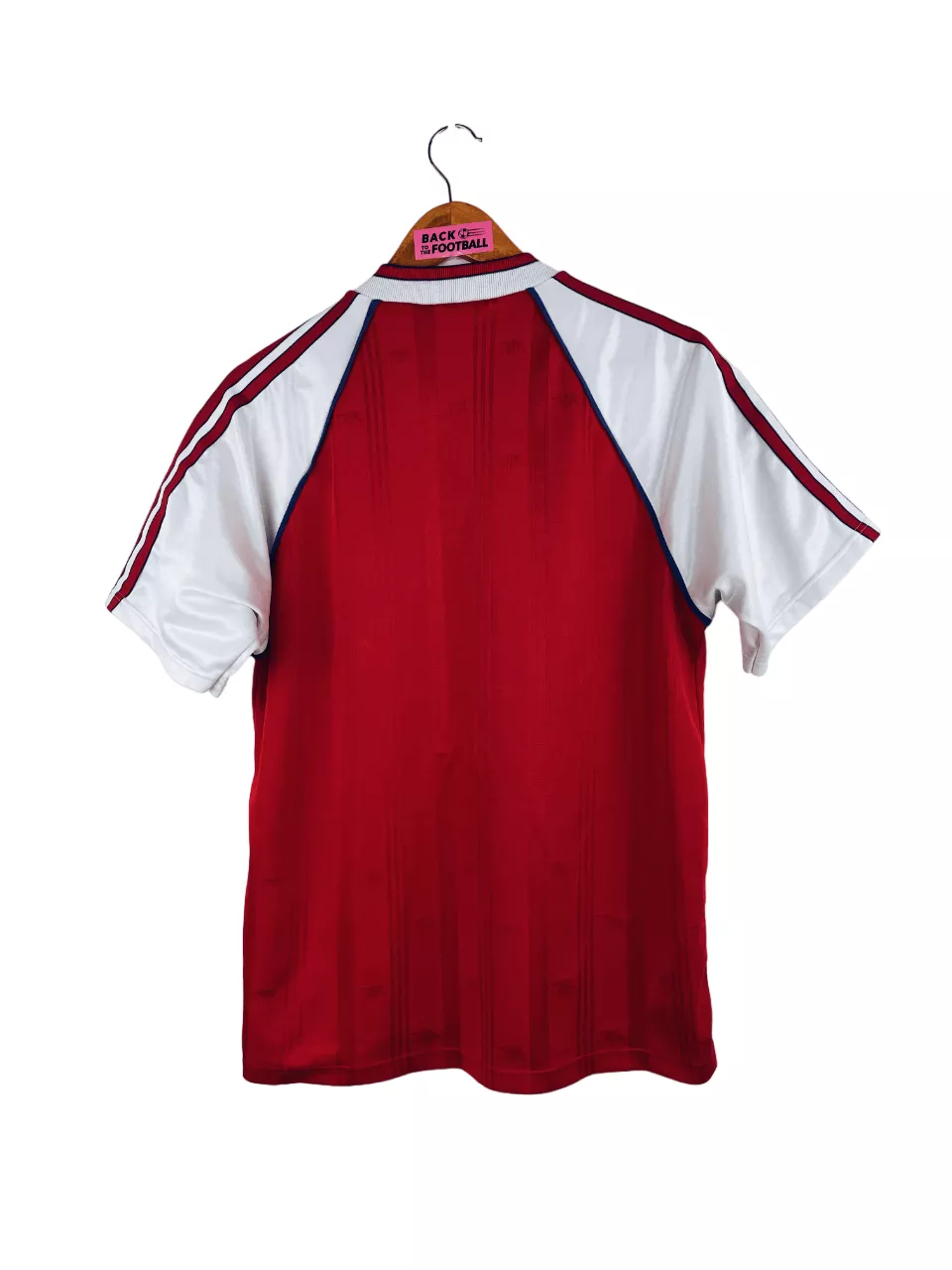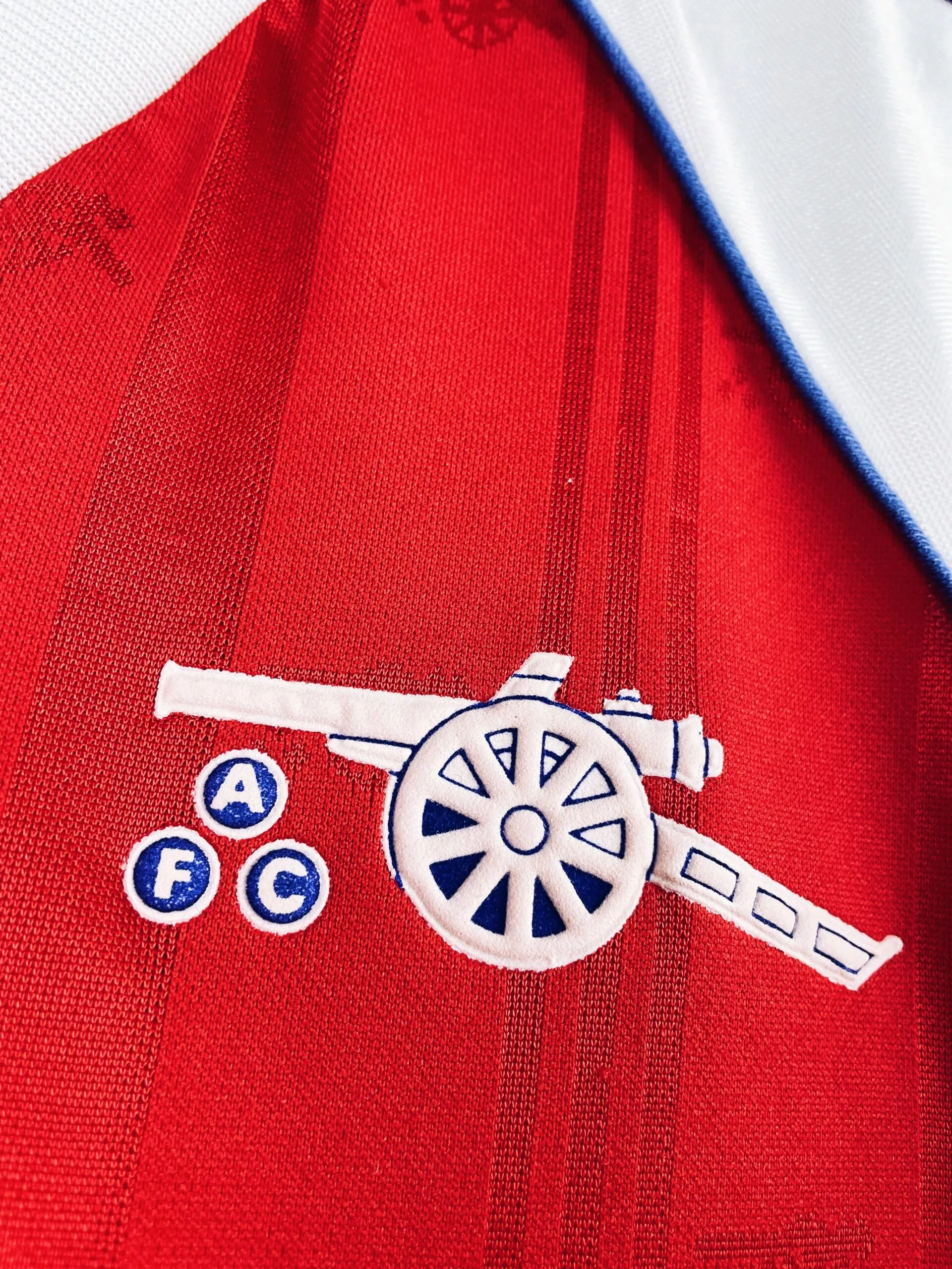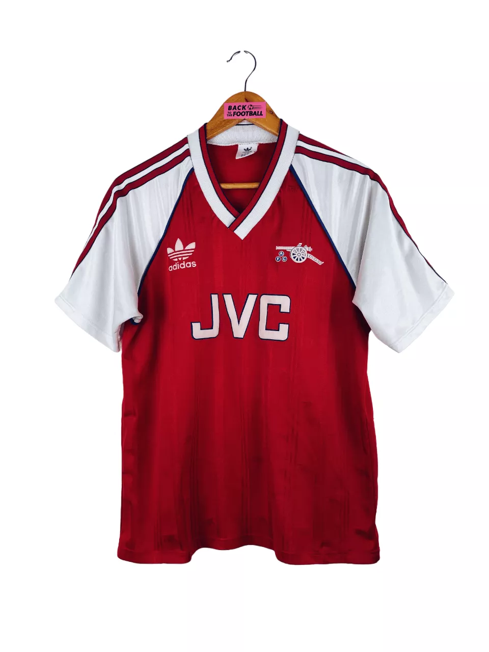 Taille : M (taille L mais taille petit) Largeur : 50cm (aisselle à aisselle) Longueur 65cm Si tu veux plus de détails, tu peux nous contacter par mail ou sur les réseaux 😉 Etat : 8/10, très bon état, mini accro dans le dos Le maillot : maillot vintage domicile d’Arsenal 1988/1990. L’écusson, le logo Adidas à trèfle et le sponsor JVC sont en feutrine. L’écusson avec le canon est incroyable. On peut le voir également en tramé sur tout le maillot. Très beau maillot rétro d’Arsenal ! Histoire : la première saison, les Gunners remportent le championnat à la…