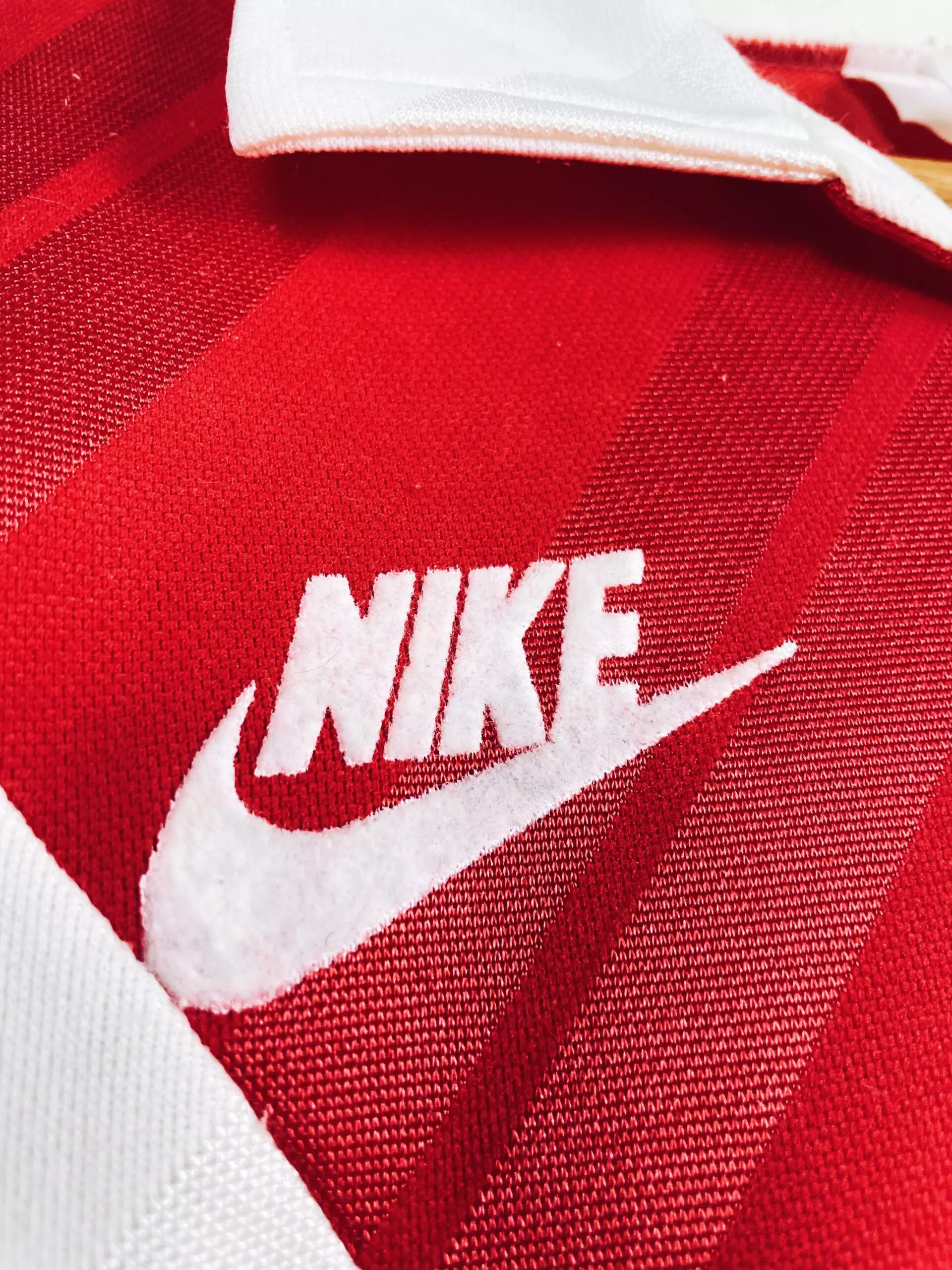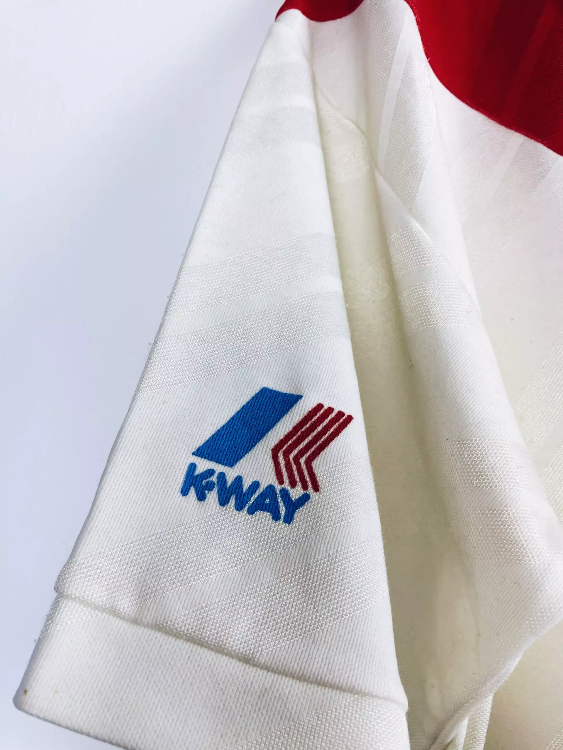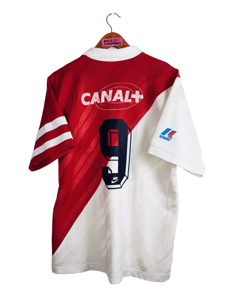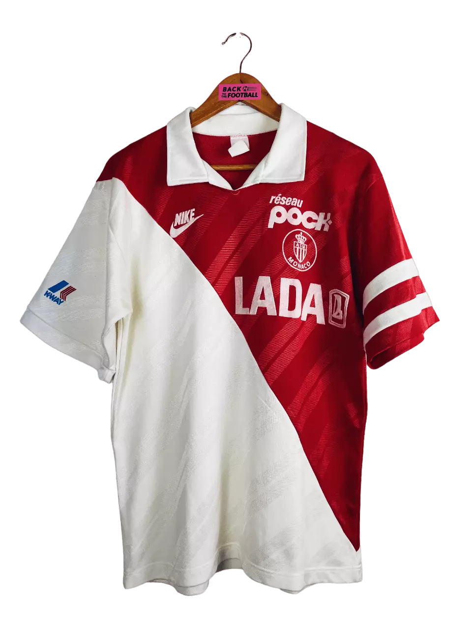 Taille : L Etat : 8.5/10, excellent état Le maillot : maillot vintage domicile de l’AS Monaco 1988/1990. L’écusson, le logo Nike et les sponsors sont en feutrine, hormis le sponsor Kway sur la manche qui est incrusté au maillot. Le numéro #9 est floqué, il ne s’agit pas d’un flocage officiel. Très beau maillot rétro de l’AS Monaco ! Histoire : sur la première saison, les monégasques d’Arsène Wenger termineront sur le podium du championnat de France, à 5 points de l’OM, champion. Ils iront jusqu’en finale de Coupe de France mais seront battus par l’OM encore une fois,…