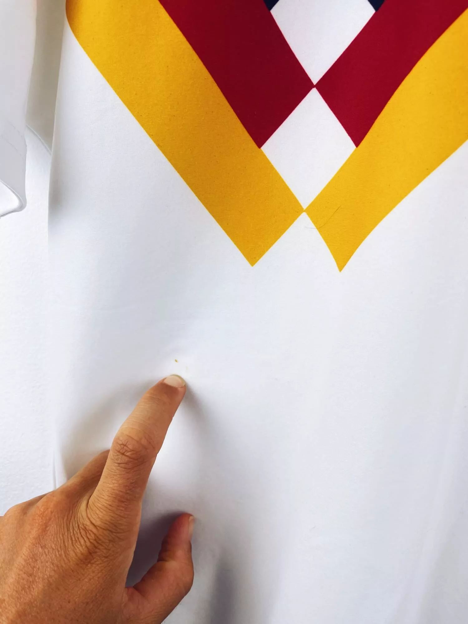 Taille : S – taille long, peut aller à du M Largeur : 50cm (aisselle à aisselle) Longueur : 75cm (base du col au bas) Si tu veux plus de détails, tu peux nous contacter par mail ou sur les réseaux 😉 Etat : 8.5/10, très bon état, micro trace sur un côté (voir photo) Le maillot : maillot vintage domicile de l’Allemagne 1988/1990. De la RFA pour être précis. L’écusson est brodé, le logo Adidas à trèfle est incrusté. Les bandes noires, rouges et jaunes sont incrustées au maillot. Très beau maillot rétro de l’Allemagne ! Histoire : La…