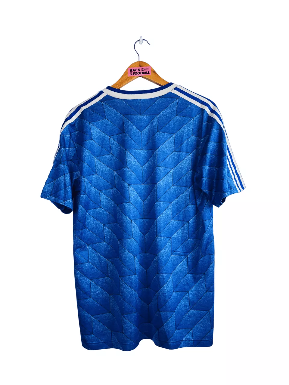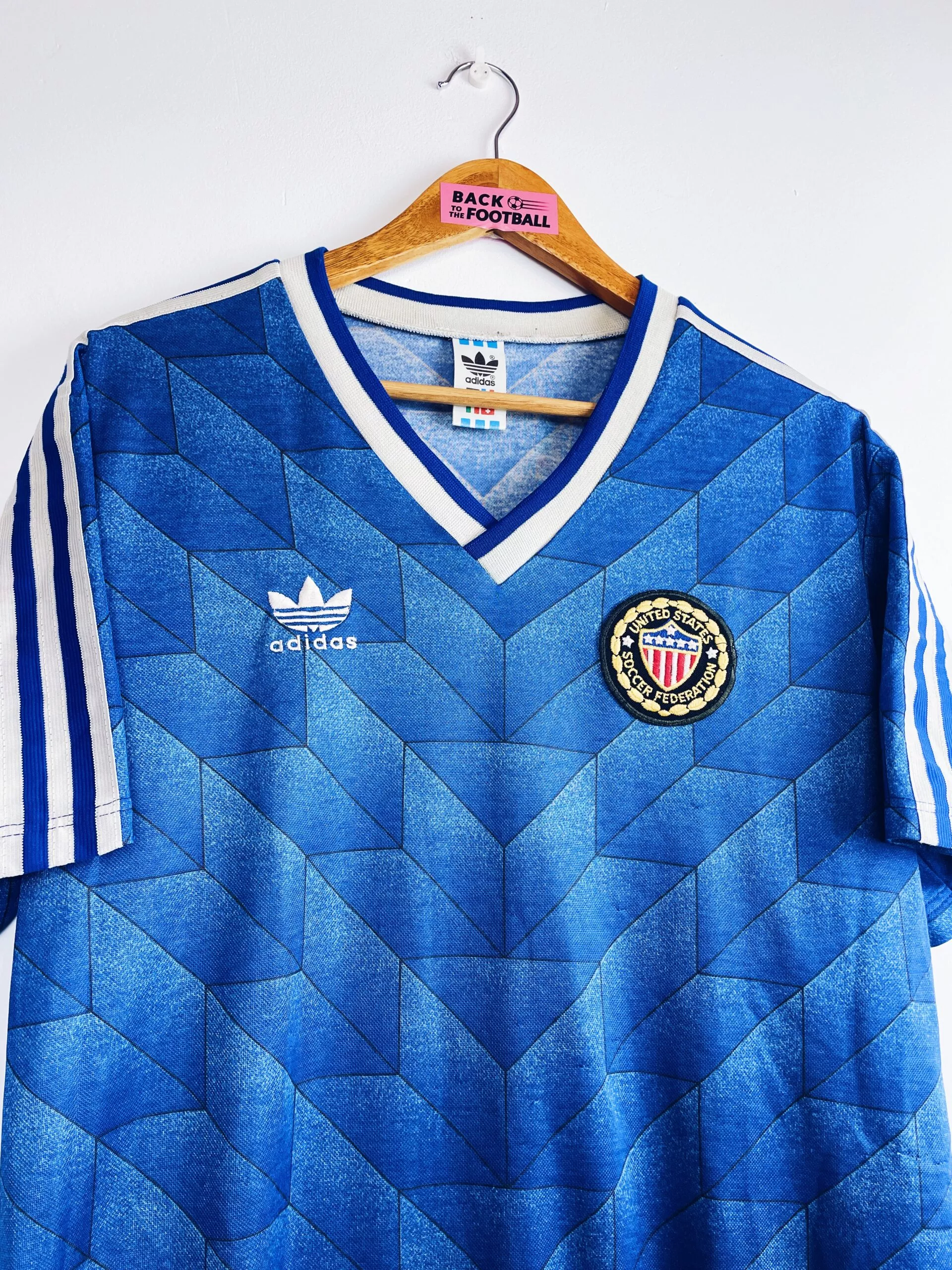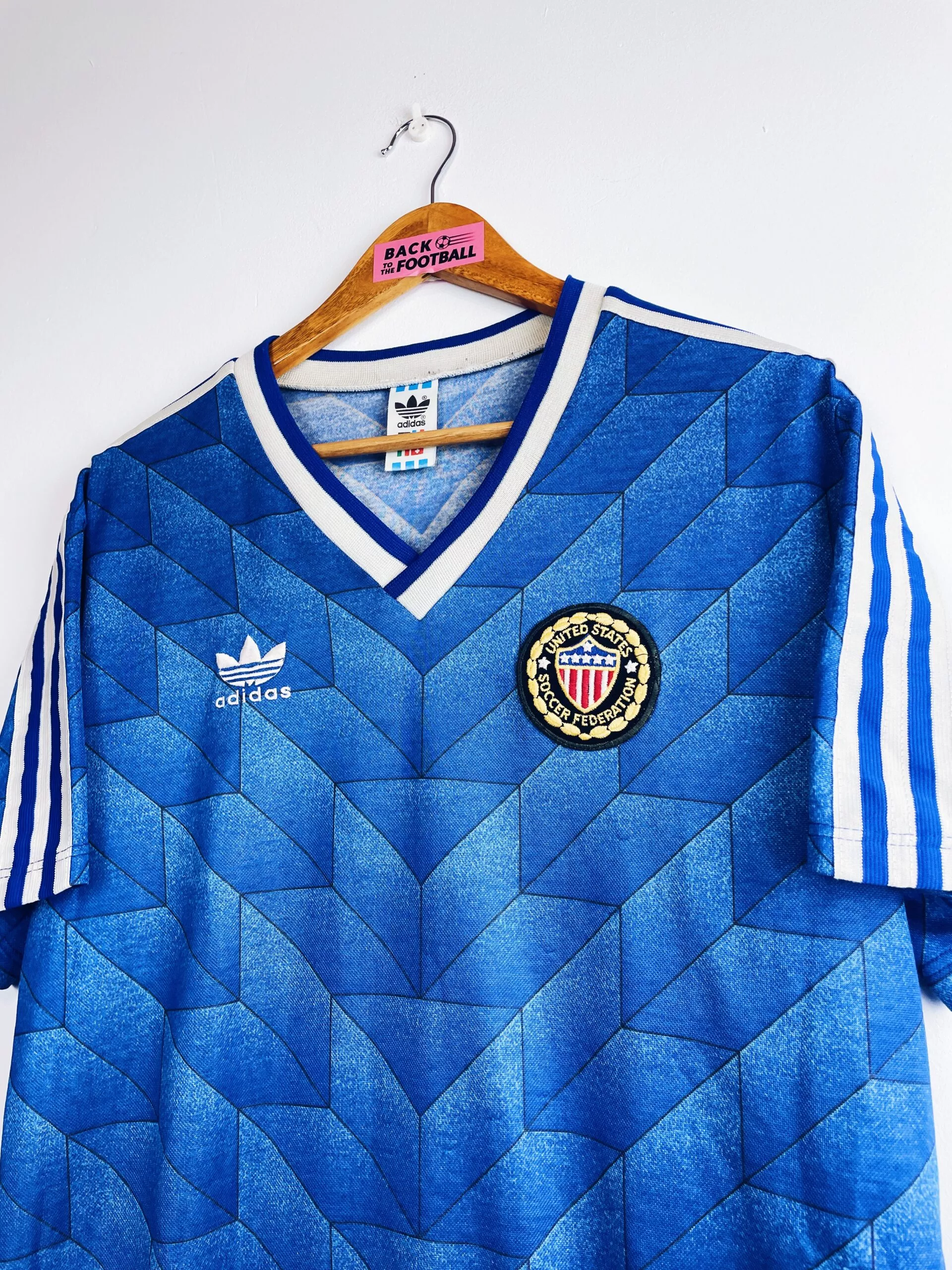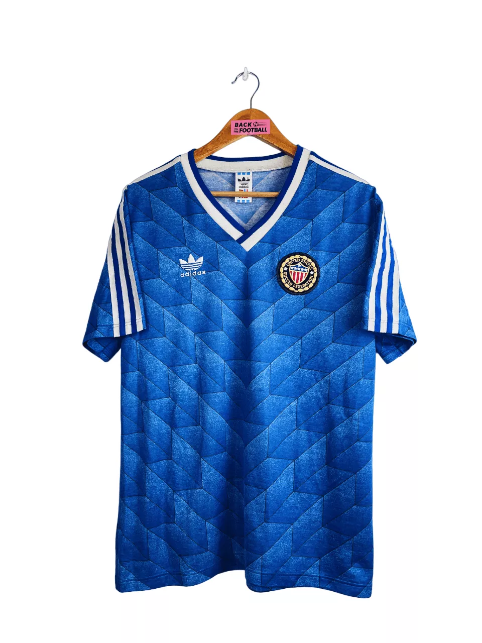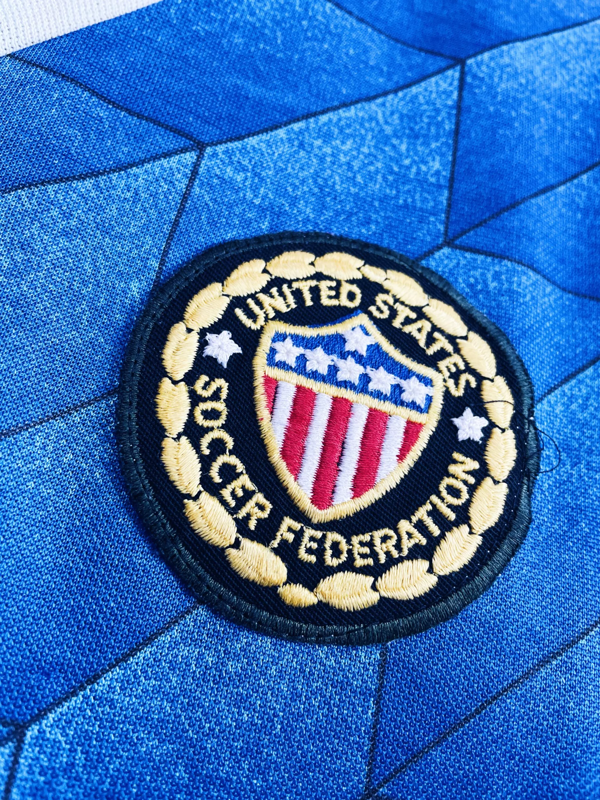 Taille : M Si tu veux plus de détails, tu peux nous contacter par mail ou sur les réseaux 😉 Etat : 8/10, très bon état, un accro dans le dos (voir photo) Le maillot : maillot vintage des USA 1988/1990 extérieur. L’écusson et le logo Adidas sont brodés. Le design est iconique ! Très beau maillot rétro des USA ! Histoire : les américains porteront ce maillot lors de la CONCACAF 1989, à la fois tournoi et qualifications au Mondial 1990. Les USA terminent à la deuxième place, derrière le Costa Rica et valident leur ticket pour la Coupe…