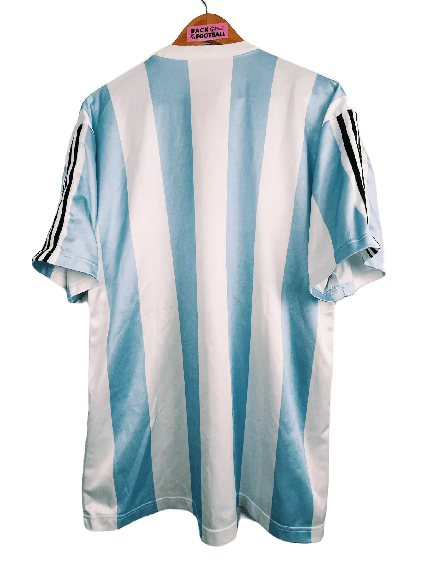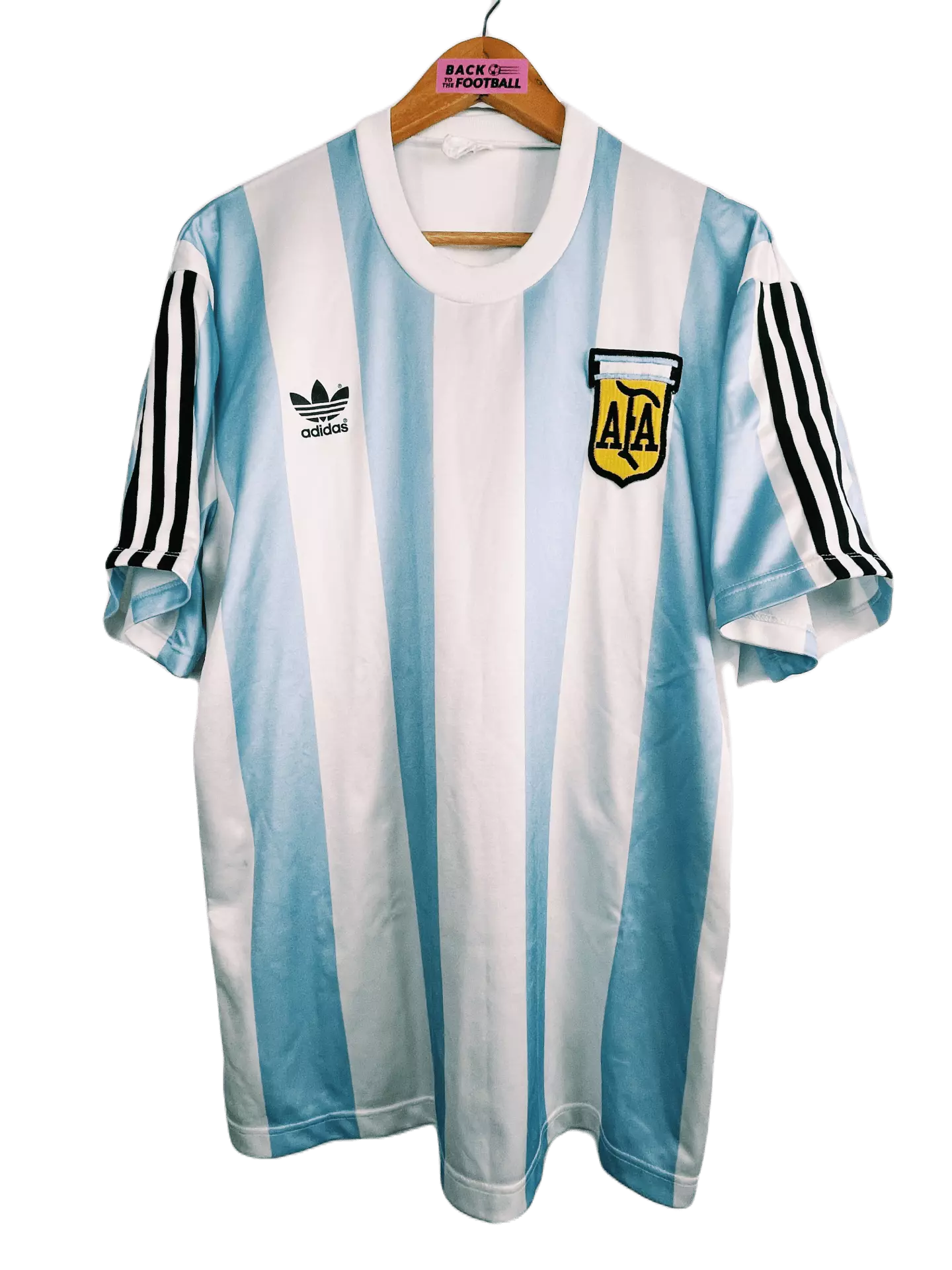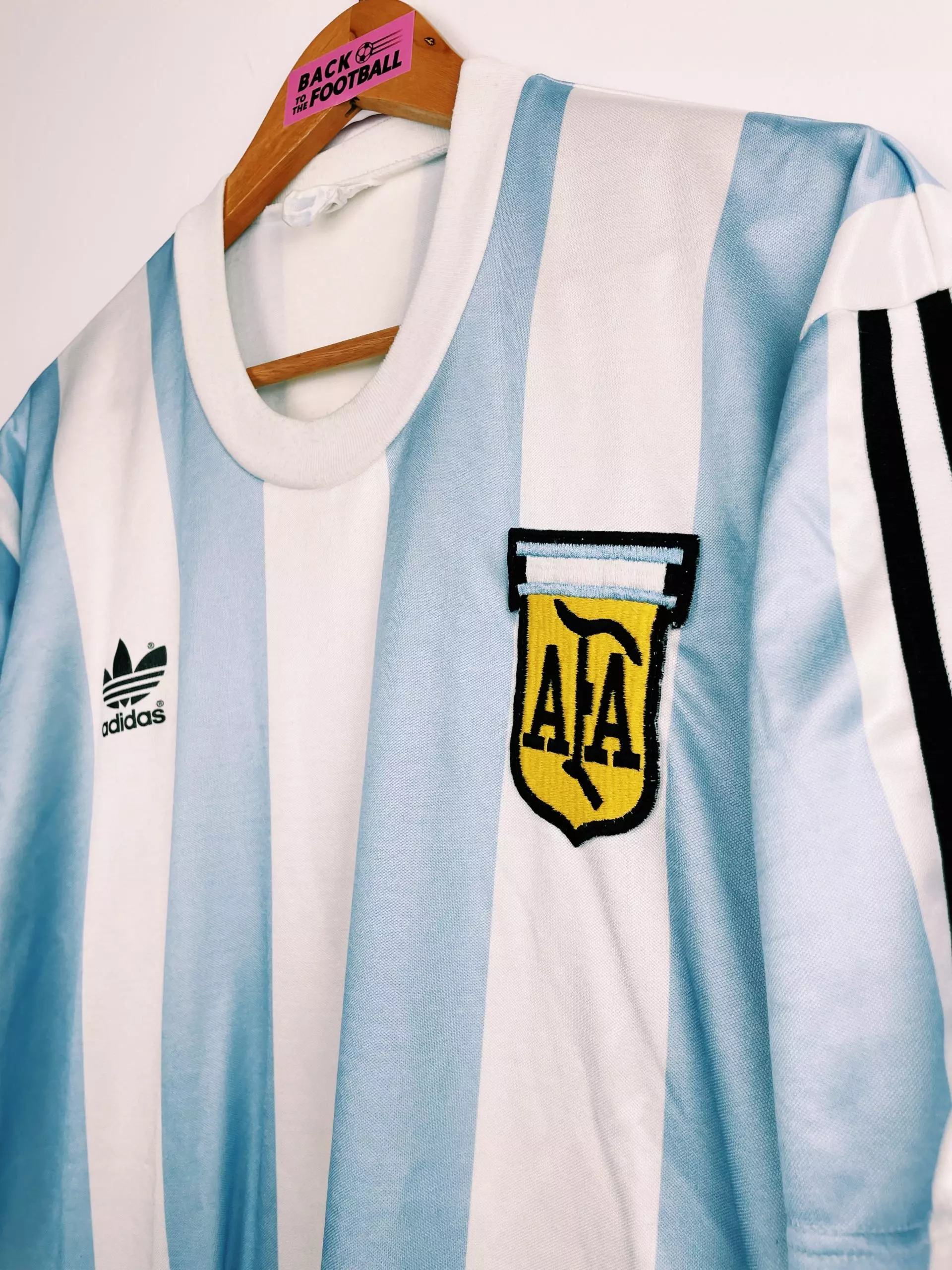 Taille : L Etat : 8/10, très bon état général. A noter 2 petites taches jaunes (voir photos) Le maillot : très beau maillot vintage de l’Argentine 1988. L’écusson est brodé, le logo Adidas à fleur est incrusté. Histoire : l’Argentine revient avec Adidas pour une année, juste avant la Copa America de 1989. Quelques joueurs : Maradona, Caniggia, Tapia, Batista, Diaz, Brown…