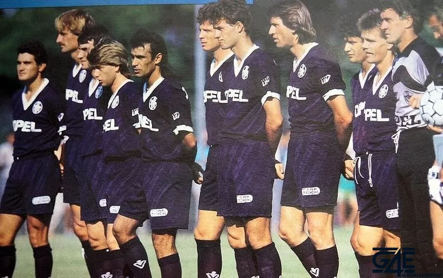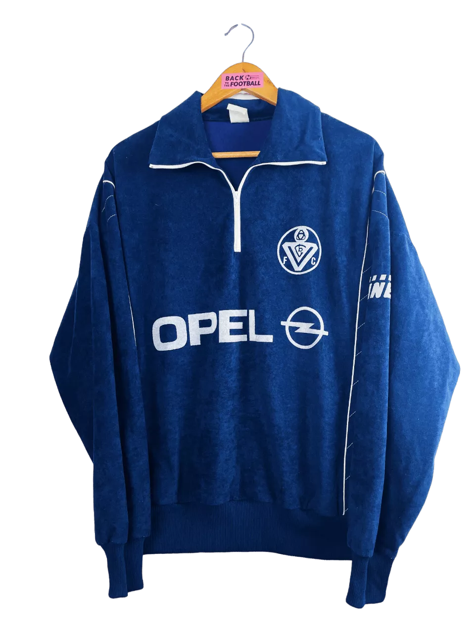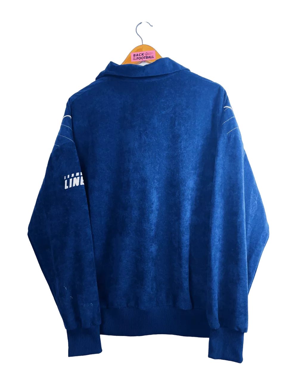 Taille : L Etat : 8/10, très bon état pour son âge. La feutrine est légèrement moins vive La veste : veste vintage des Girondins de Bordeaux 1989/1990. L’écusson et le logo Opel sont en feutrine. Le logo Line7 sur la manche est aussi en feutrine. Il y a 2 poches latérales. La veste est en tissu épais. Il n’y a pas d’équipementier cette saison. Très belle veste vintage des Girondins de Bordeaux ! Histoire : les Girondins terminent à la 2ème place du championnat, 2 points derrière l’OM. En Coupe de France, ils seront éliminés en quart contre le…