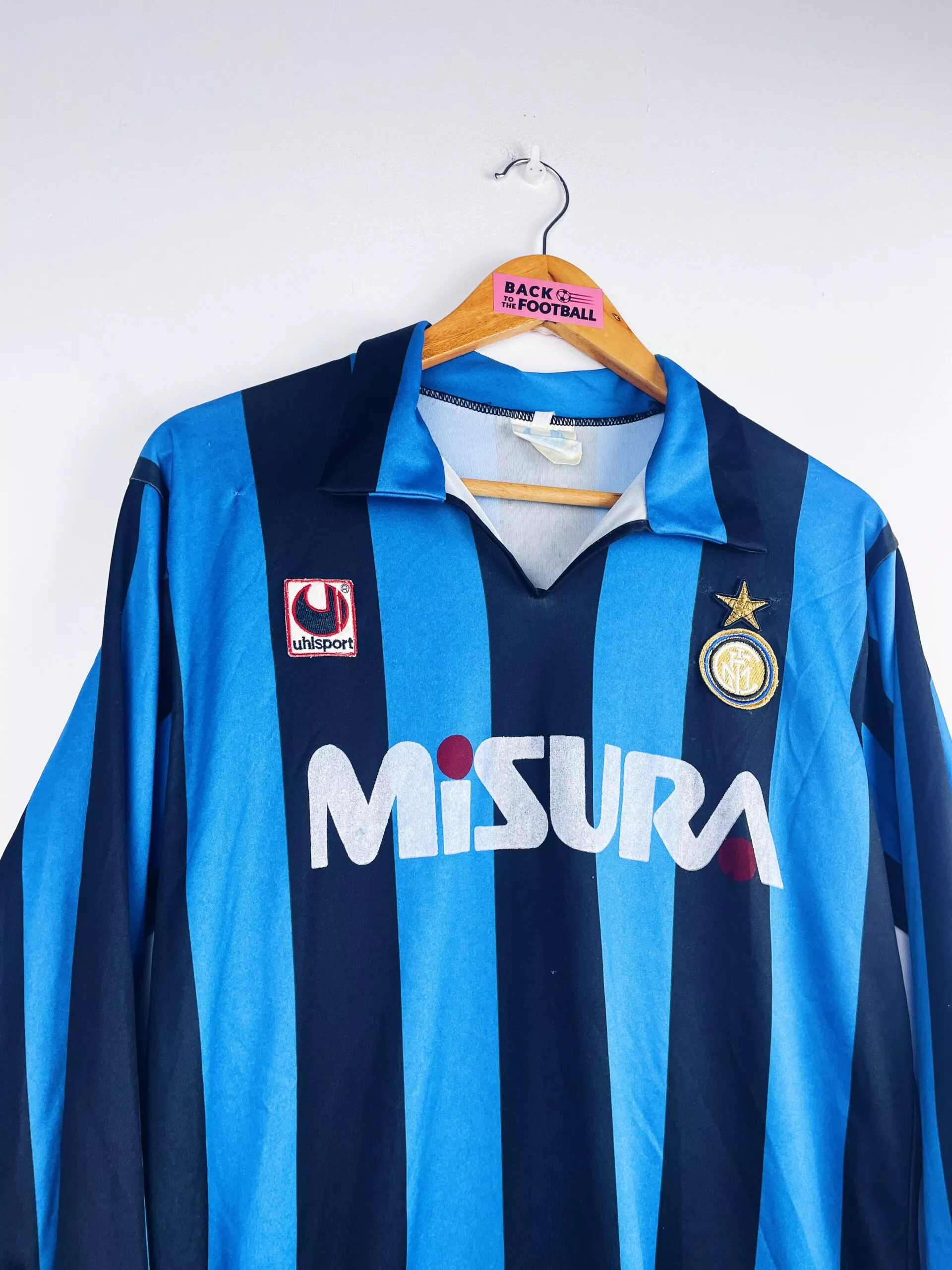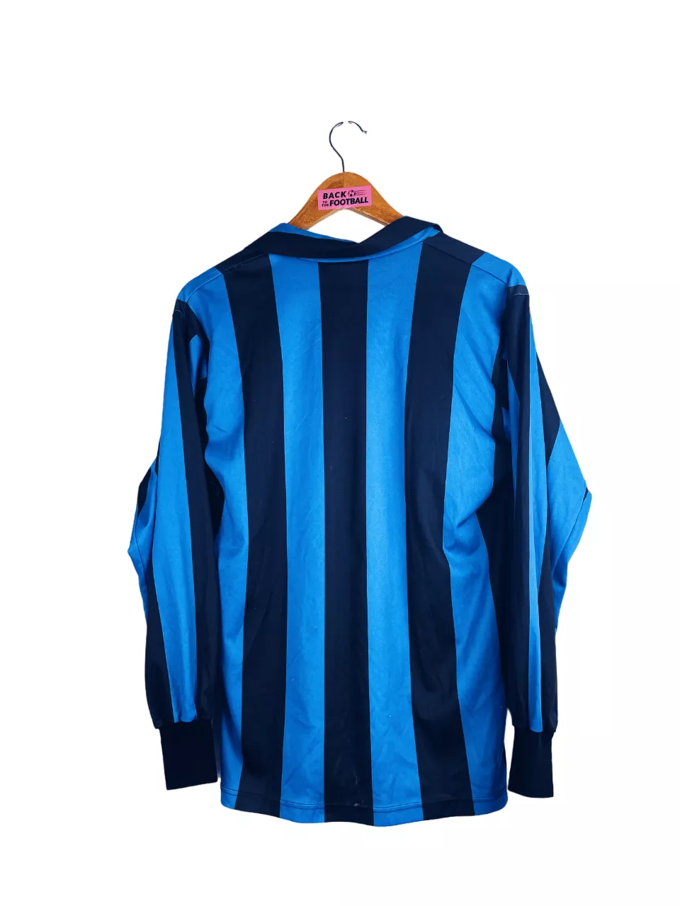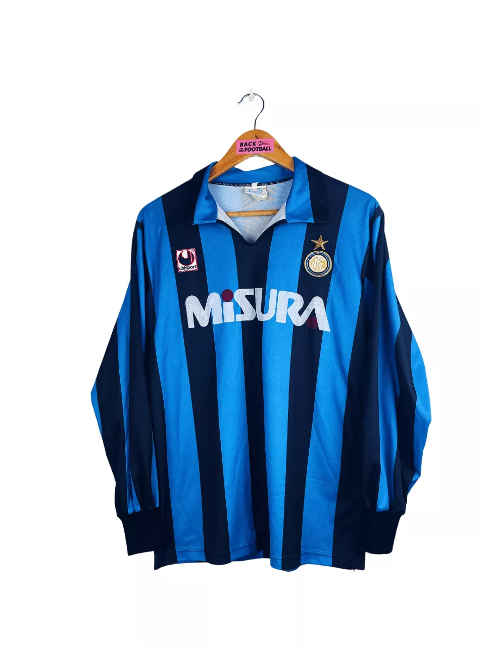 Taille : M Etat : 6/10, des bouloches et accros et le sponsor est fatigué (voir photos) Le maillot : maillot vintage domicile de l’Inter Milan 1989/1990 en manches longues. L’écusson et le logo Uhlsport sont brodés, le sponsor Misura est floqué. Joli maillot rétro de l’Inter ! Histoire : après avoir gagné le championnat la saison passée, l’Inter termine à la 3ème place cette année. Seul trophée cette année : la Super Coupe d’Italie, gagnée contre la Sampdoria. Quelques joueurs : Klinsmann, Aldo Serena, Lothar Matthäus, Baresi, Bergomi…