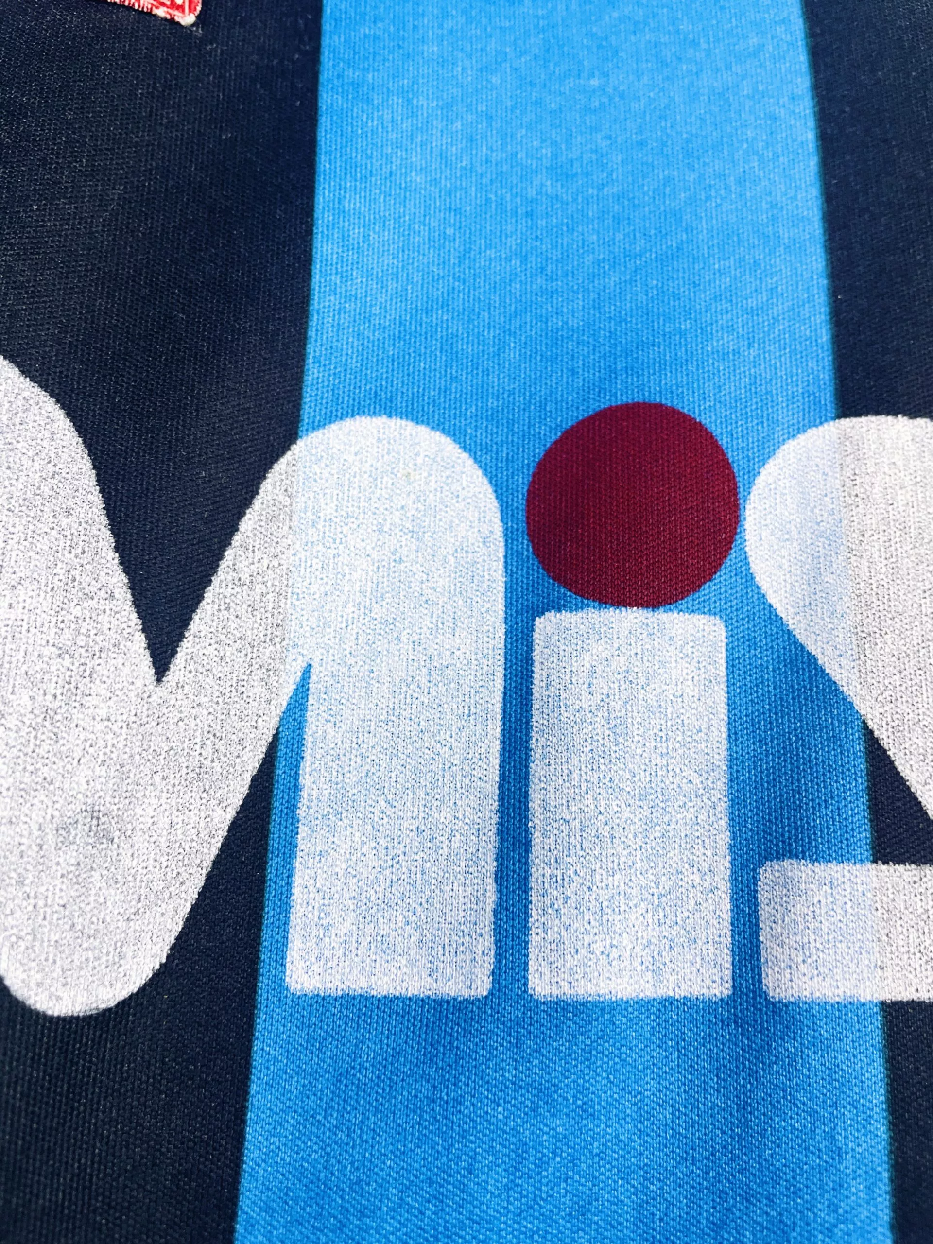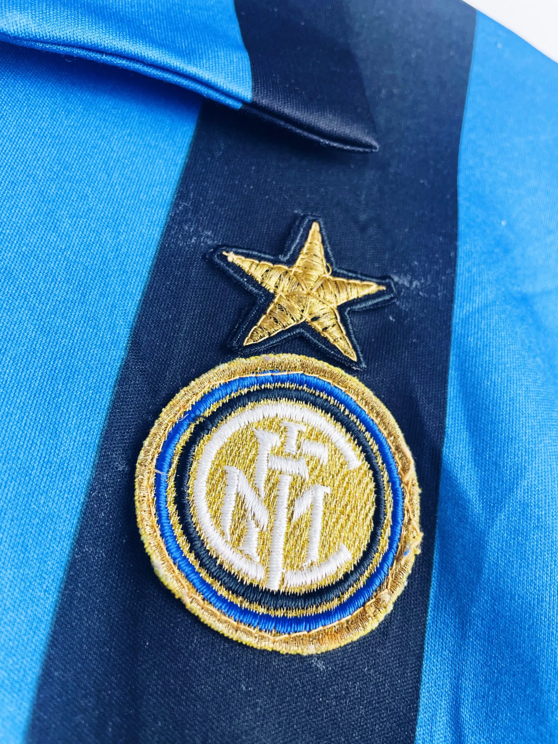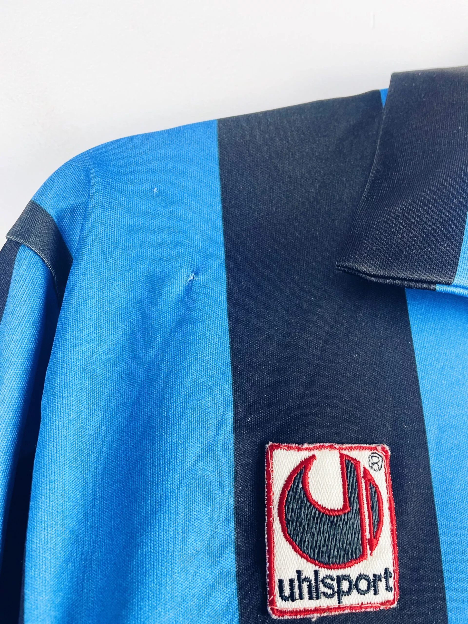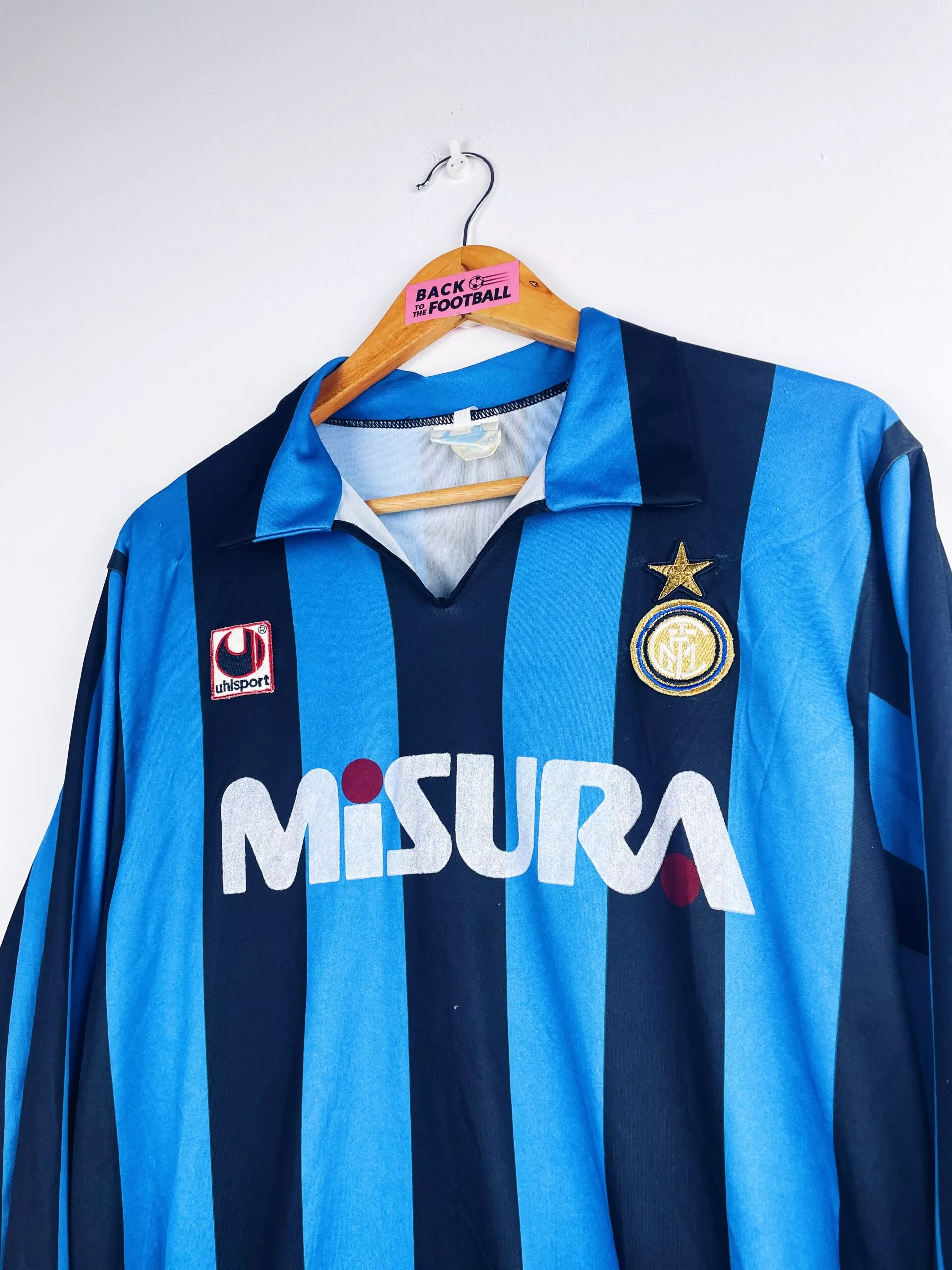 Taille : M Etat : 6/10, des bouloches et accros et le sponsor est fatigué (voir photos) Le maillot : maillot vintage domicile de l’Inter Milan 1989/1990 en manches longues. L’écusson et le logo Uhlsport sont brodés, le sponsor Misura est floqué. Joli maillot rétro de l’Inter ! Histoire : après avoir gagné le championnat la saison passée, l’Inter termine à la 3ème place cette année. Seul trophée cette année : la Super Coupe d’Italie, gagnée contre la Sampdoria. Quelques joueurs : Klinsmann, Aldo Serena, Lothar Matthäus, Baresi, Bergomi…