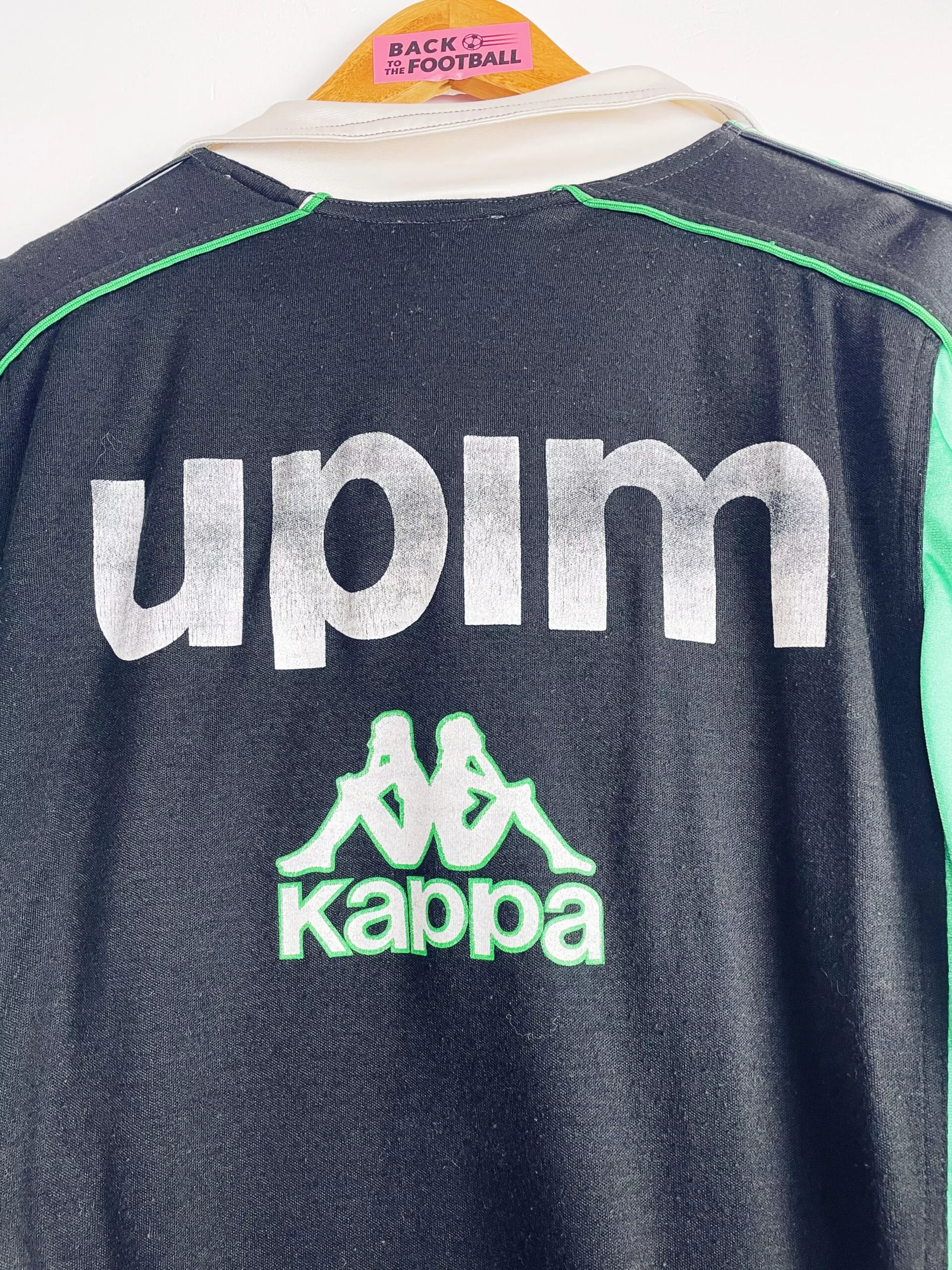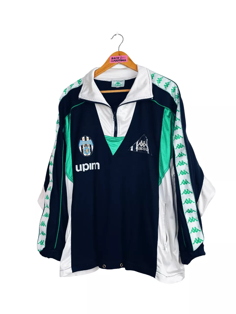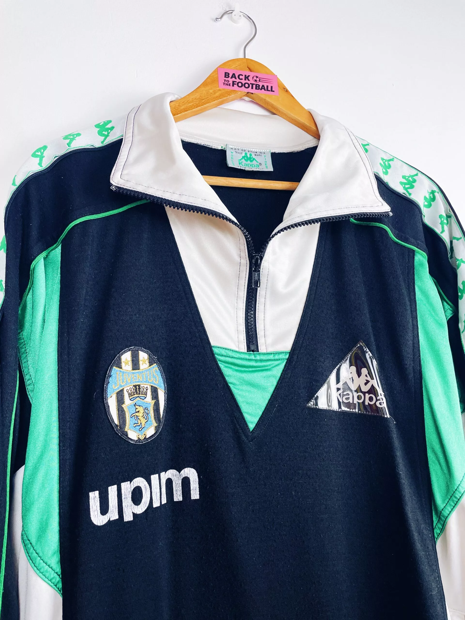 Taille : L Si tu veux plus de détails, tu peux nous contacter par mail ou sur les réseaux 😉 Etat : 7/10, très bon état mais le sponsor Upim est abimé à l’avant et surtout à l’arrière, des bouloches et il manque le cordon du bas (voir photos) La veste : veste vintage de la Juventus 1989/1990. Les manches Kappa vertes et blanches sont magnifiques ! L’ancien écusson de la Juve est brodé. Le logo Kappa est en plastique. Les poches sont zippées. Les sponsors Upim sont floqués. Très belle veste rétro de la Juventus ! Histoire : les…