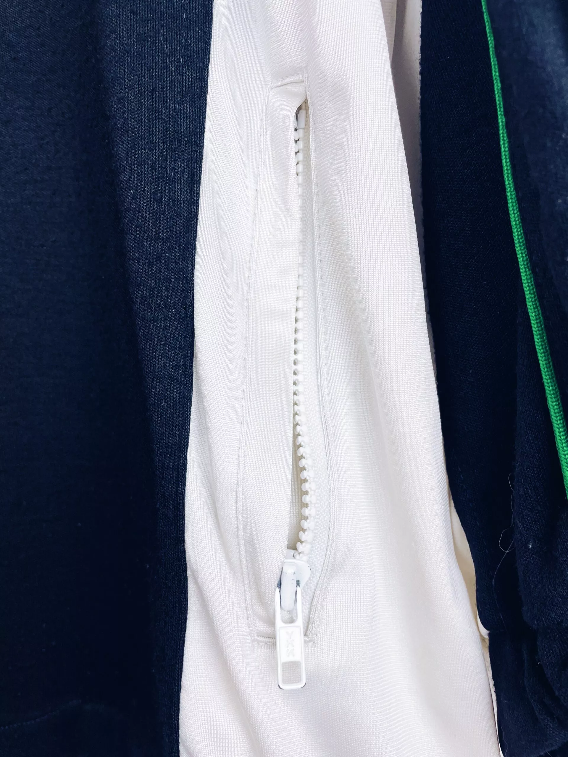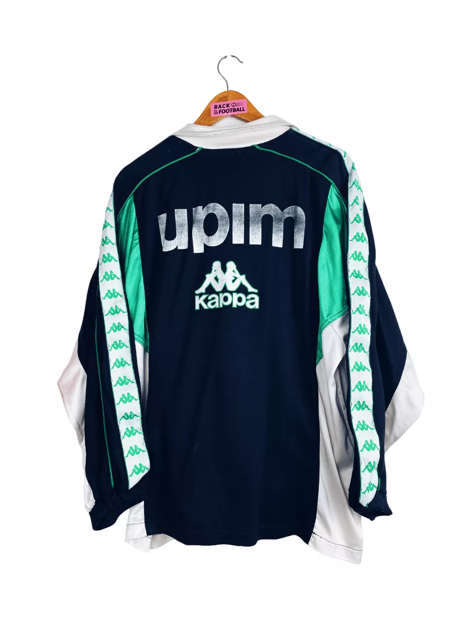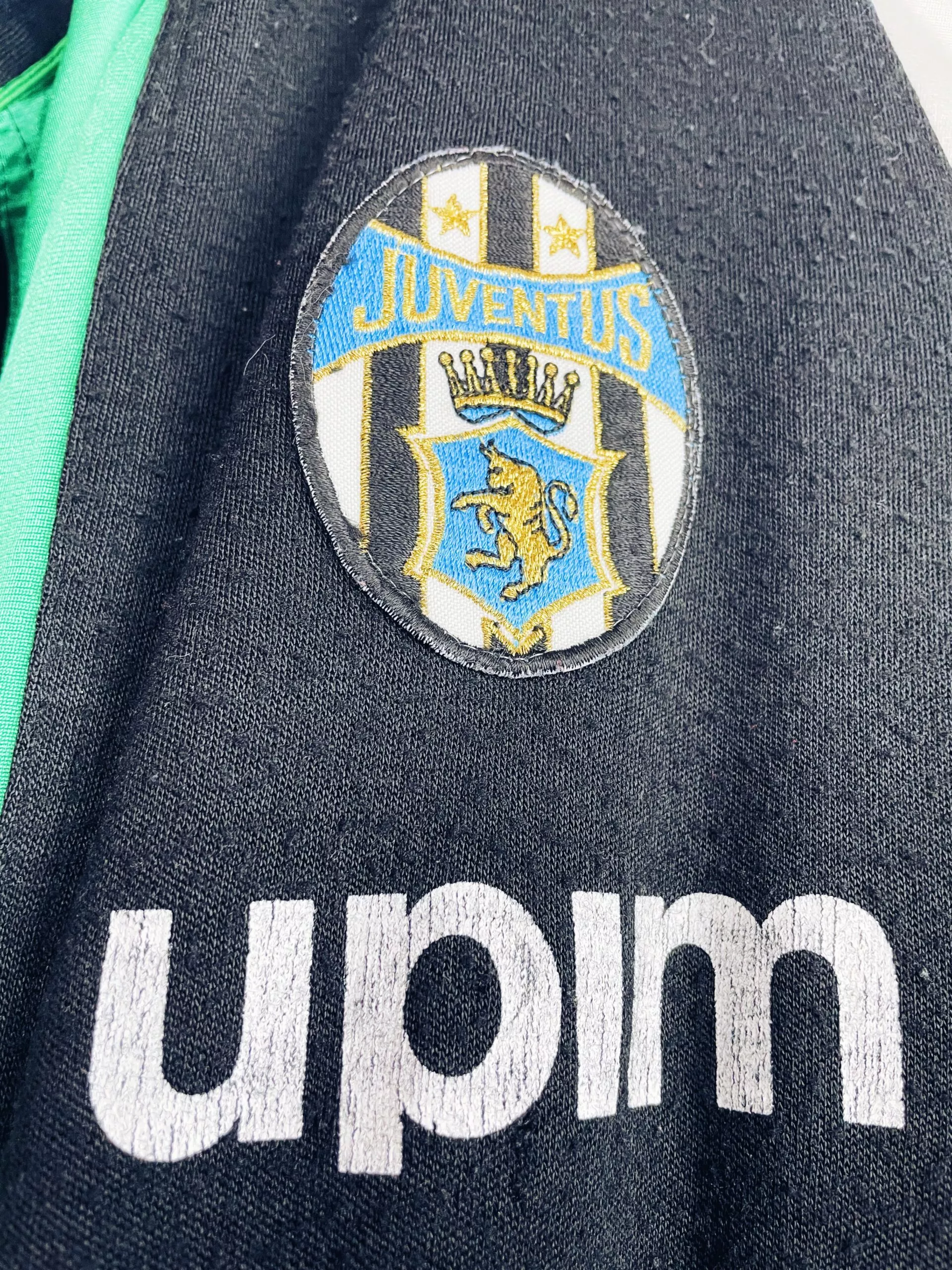 Taille : L Si tu veux plus de détails, tu peux nous contacter par mail ou sur les réseaux 😉 Etat : 7/10, très bon état mais le sponsor Upim est abimé à l’avant et surtout à l’arrière, des bouloches et il manque le cordon du bas (voir photos) La veste : veste vintage de la Juventus 1989/1990. Les manches Kappa vertes et blanches sont magnifiques ! L’ancien écusson de la Juve est brodé. Le logo Kappa est en plastique. Les poches sont zippées. Les sponsors Upim sont floqués. Très belle veste rétro de la Juventus ! Histoire : les…