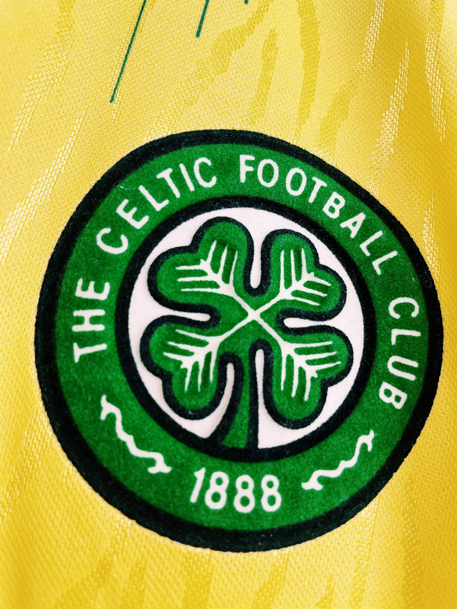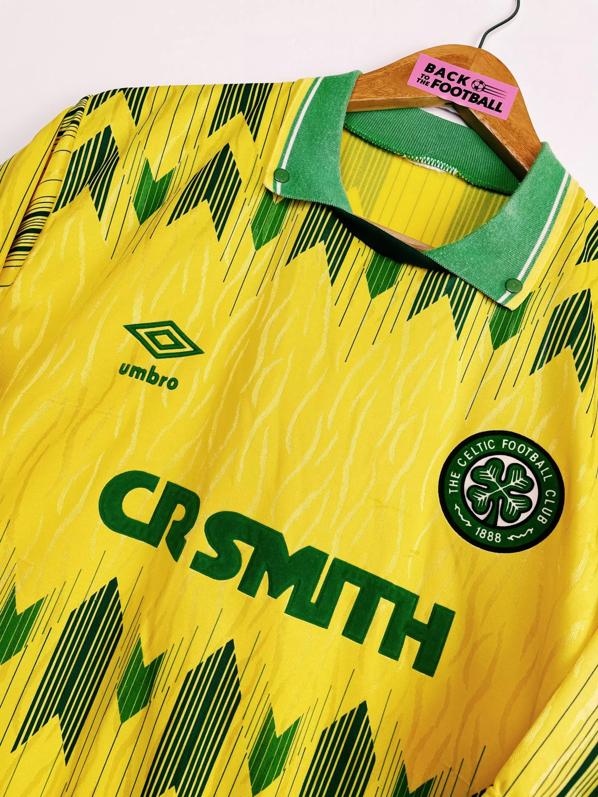 Taille : XL Etat : 7/10. Les feutrines sont superbes, le logo aussi. Il y a quelques accrocs sur le devant du maillot. Le maillot : superbe maillot extérieur vintage Umbro du Celtic, utilisé sur deux saisons de 1989 à 1991. Le logo Umbro et le sponsor CR Smith sont en feutrine, l’écusson du club est brodé. Histoire : la première saison, le club de Glasgow finira à la 5ème place du championnat. Ils atteindront la finale de Coupe d’Ecosse, qu’ils perdront aux penaltys contre Aberdeen. Ils feront un peu mieux la saison suivante avec une 3ème place en championnat.…