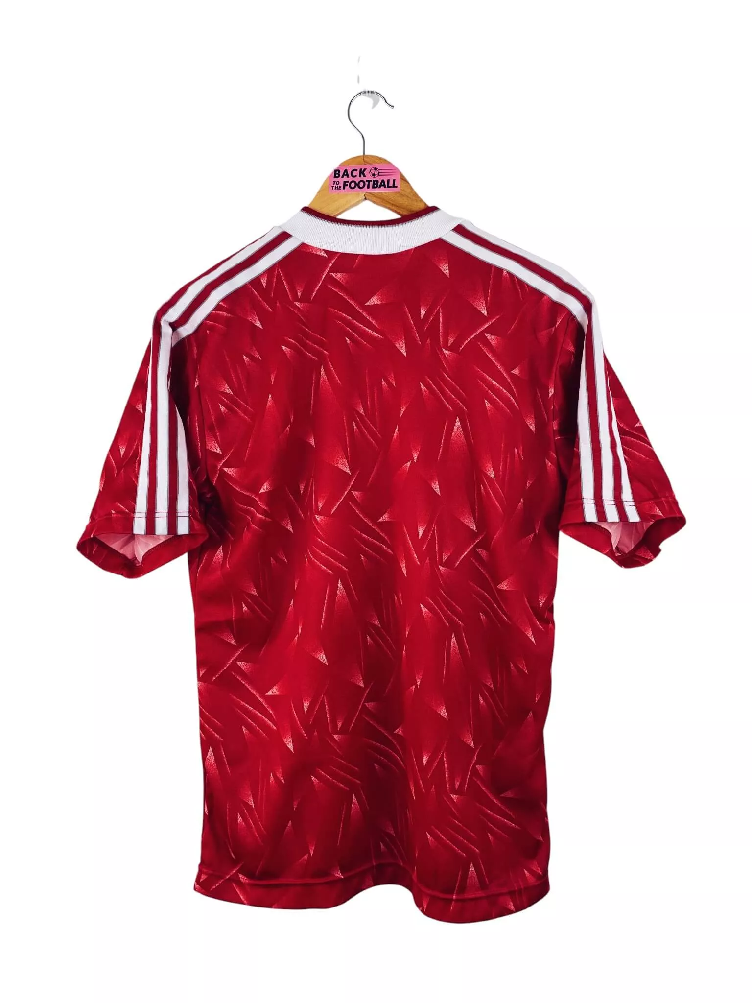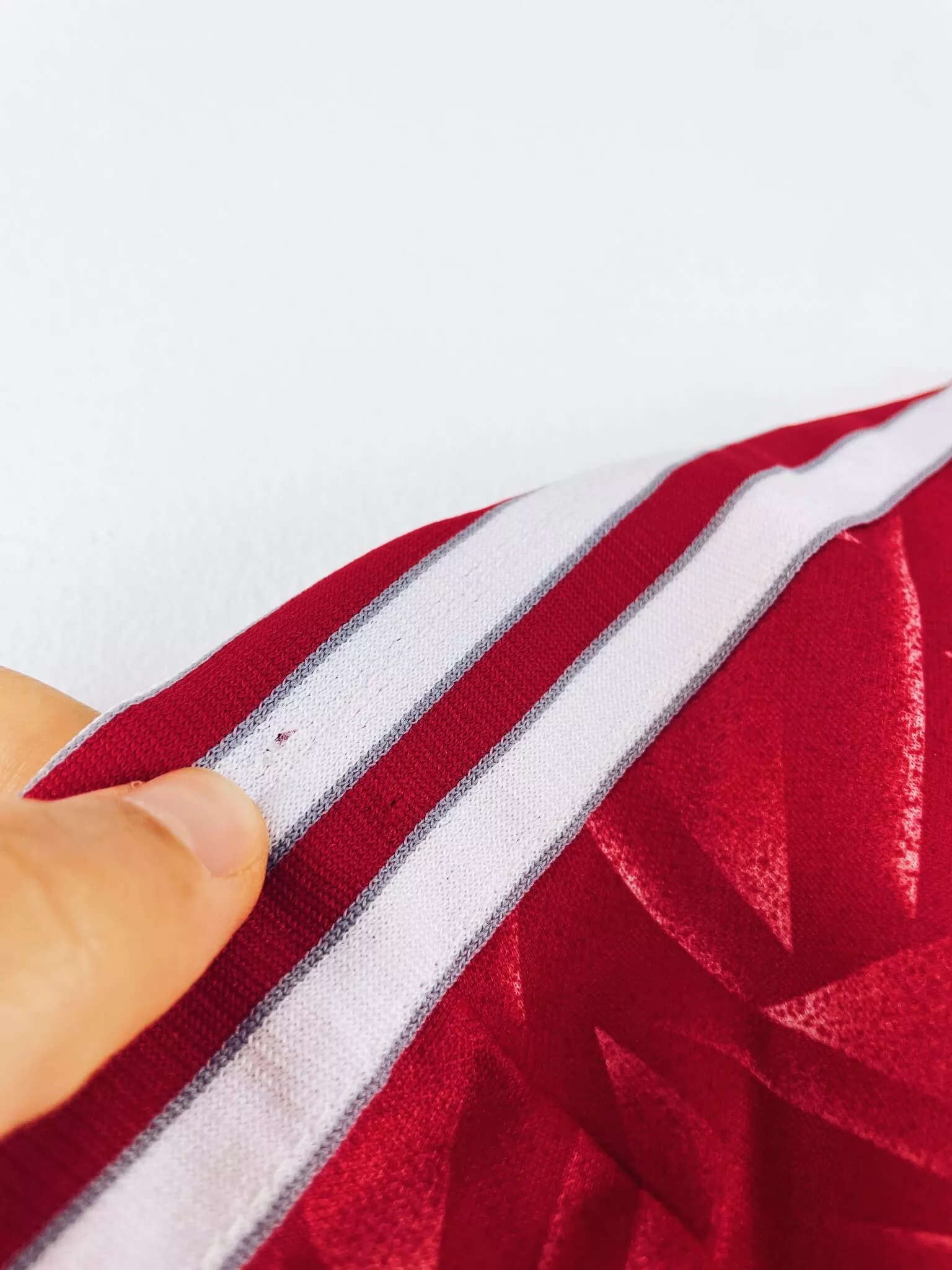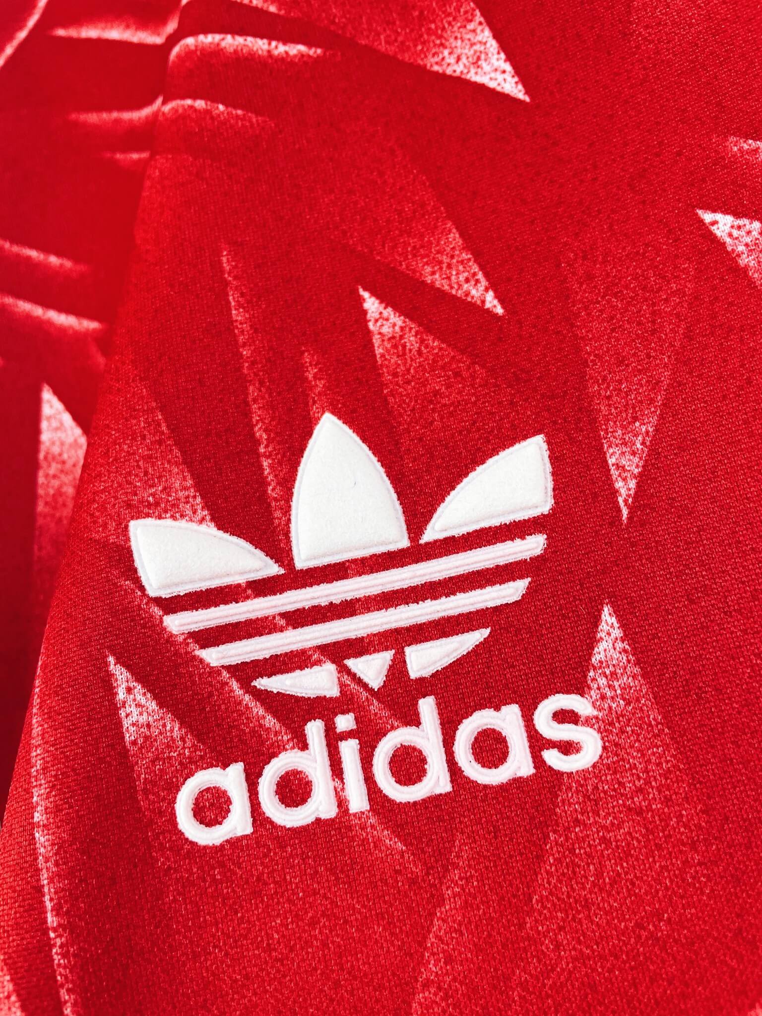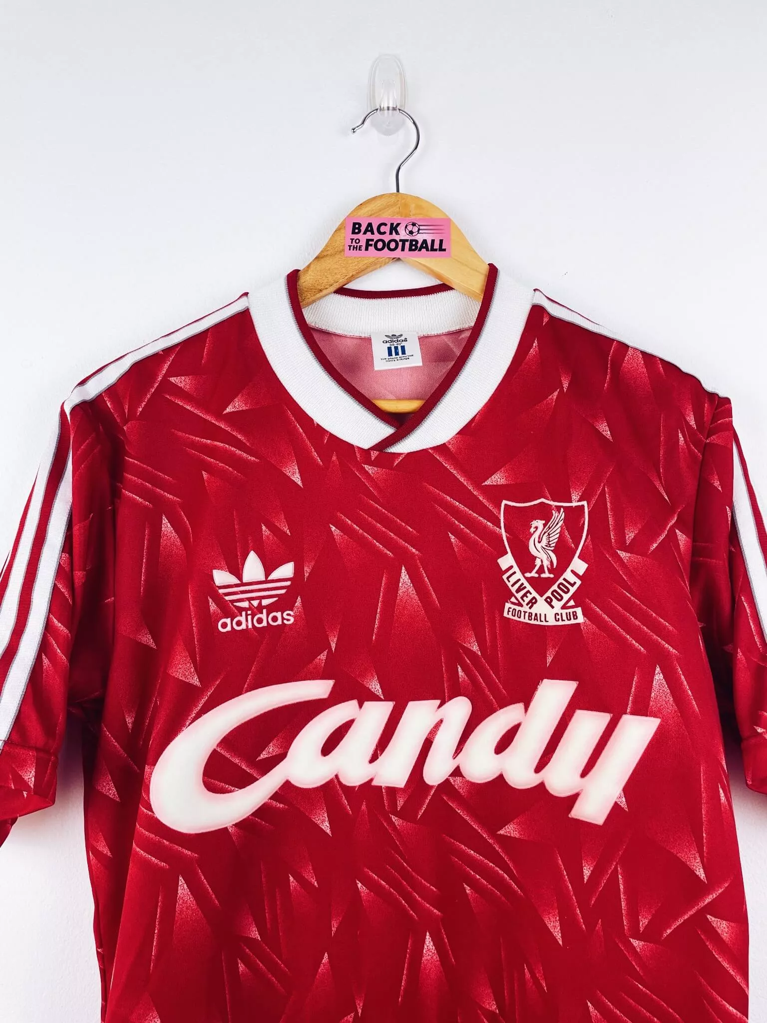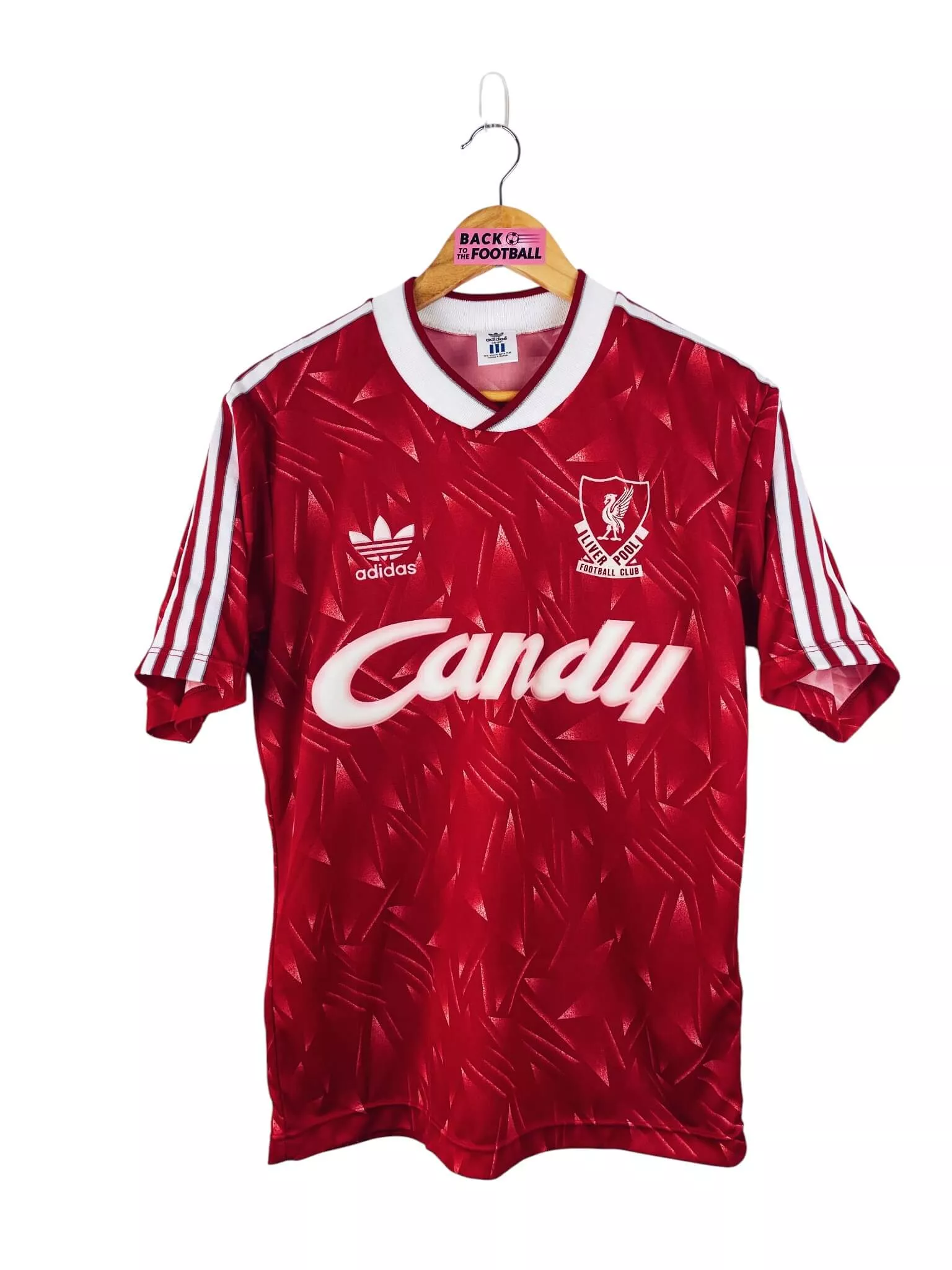 La taille : M (38/40) Largeur : 49cm (aisselle à aisselle) Longueur : 69cm Si tu veux plus d’infos, tu peux nous contacter par mail ou sur les réseaux 😉 Etat : 9/10, excellent état Le maillot : maillot vintage domicile de Liverpool 1989/1991. L’écusson, le logo Adidas et le sponsor Candy sont en feutrine. Les motifs sont magnifiques. Très beau maillot rétro de Liverpool ! Histoire : la première saison, les Reds remportent le championnat devant Aston Villa. Ils remportent également la Charity Shield, 1-0 contre Arsenal. Ils s’arrêteront en demi de FA Cup contre Crystal Palace. John Barnes…