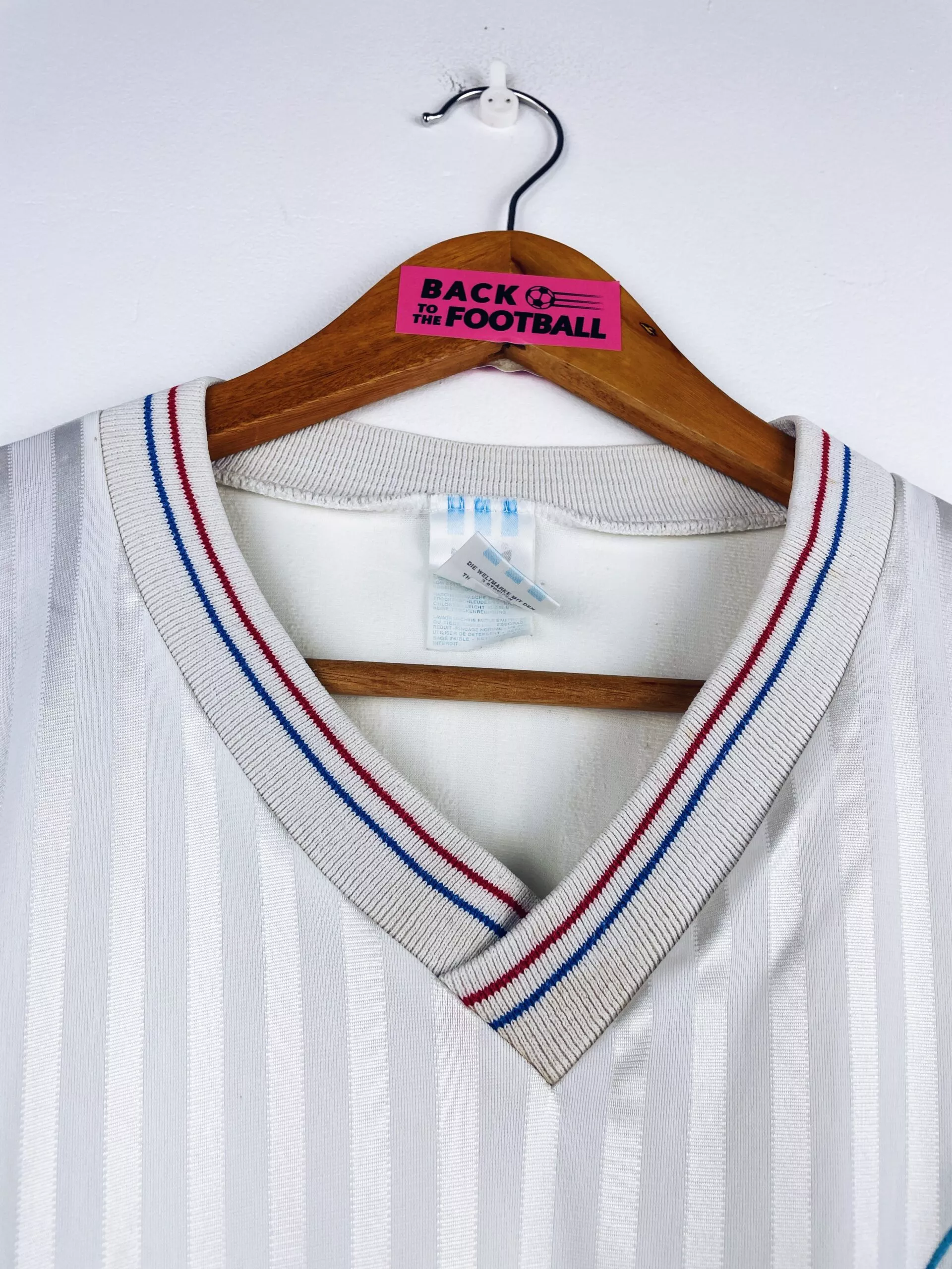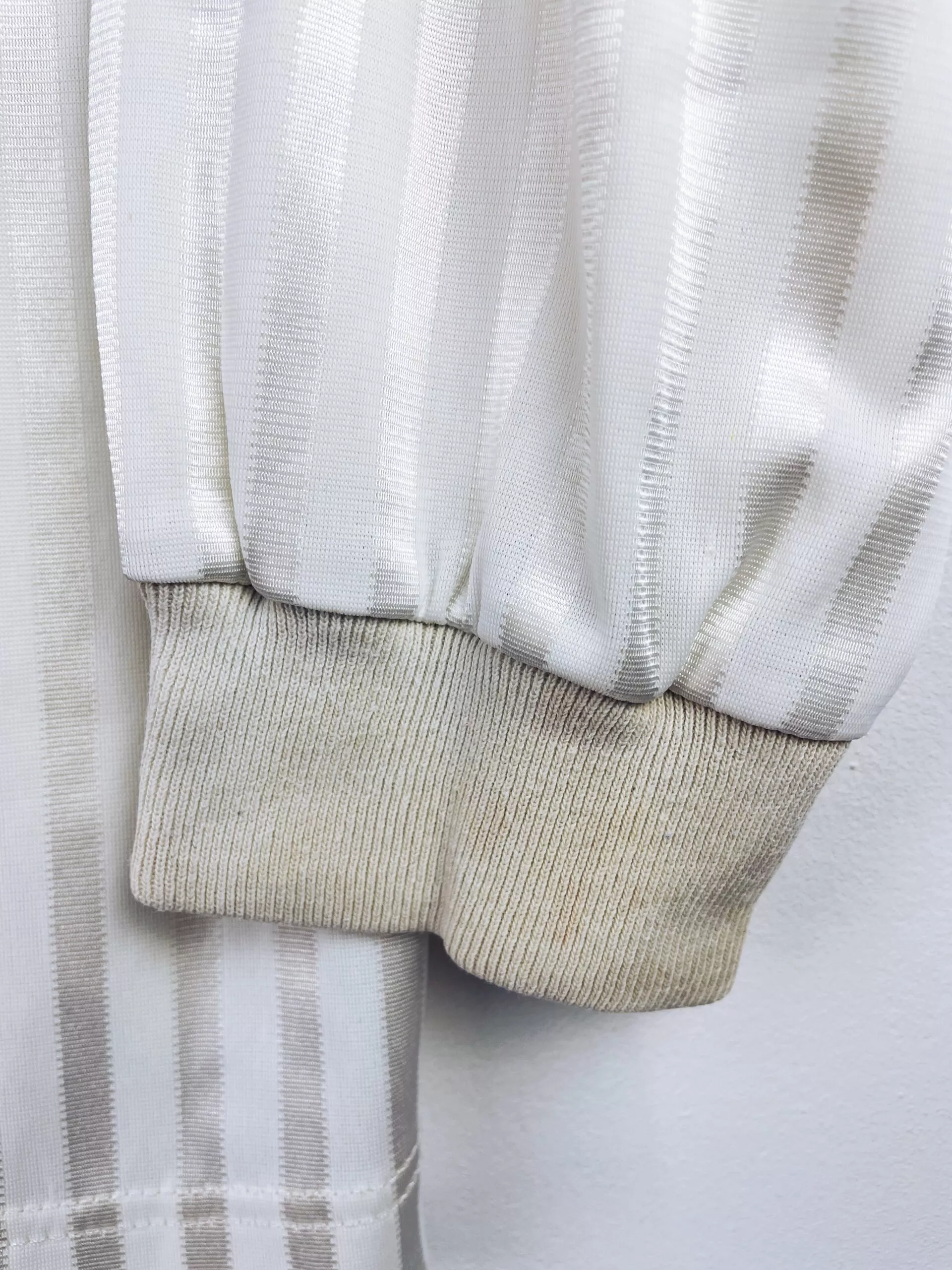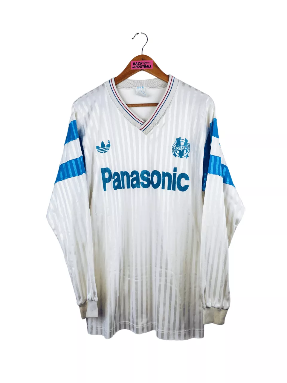 Taille : L Si tu veux plus de détails, tu peux nous contacter par mail ou sur les réseaux sociaux 😉 Etat : 8/10, très bon état hormis le bout des manches et le col légèrement jaunis (voir photos) Le maillot : maillot vintage domicile de l’OM 1989/1991 en manches longues. L’écusson, le logo Adidas à trèfle et le sponsor Panasonic sont en feutrine. Le tissu est satiné avec des bandes verticales, c’est splendide. Très beau maillot rétro de l’OM ! Histoire : sous Bernard Tapie, l’OM rafle tout sur son passage. Deux championnats lors de ces deux saisons. Jean-Pierre…