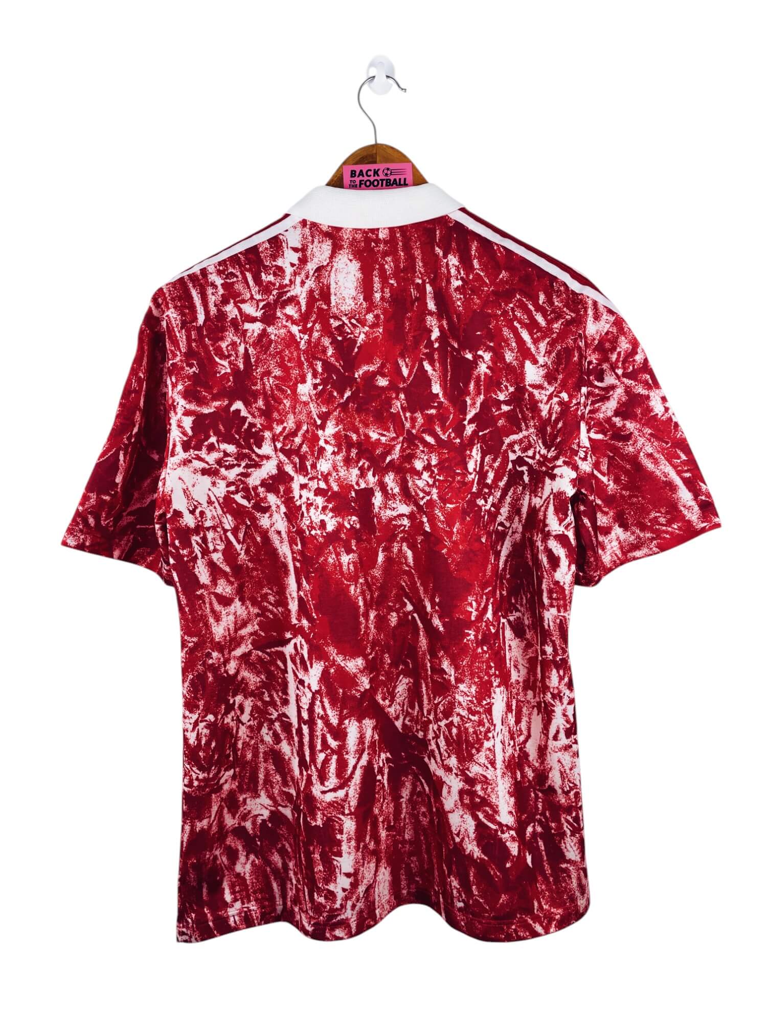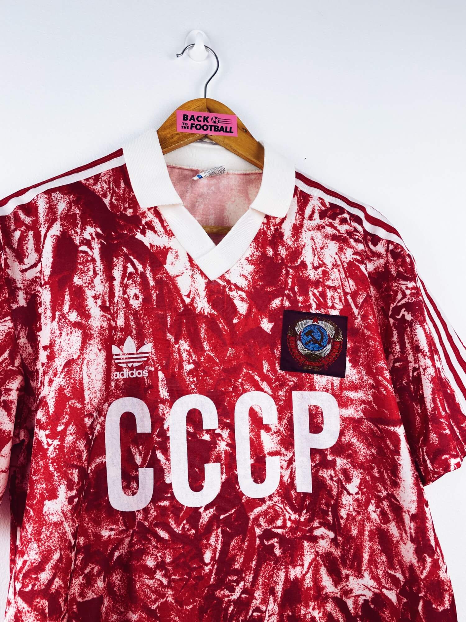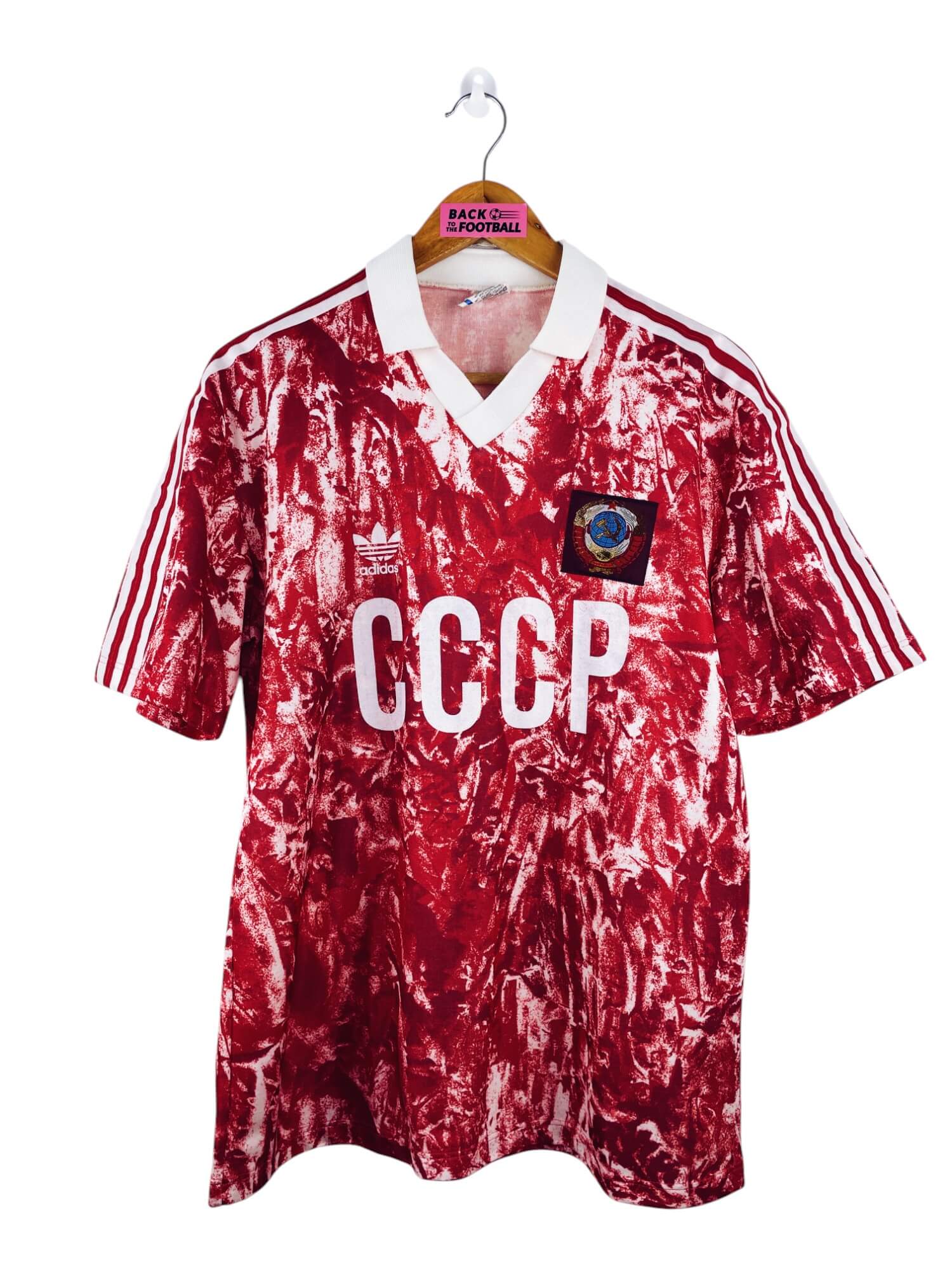 Taille : M Largeur : 52cm (aisselle à aisselle) Longueur : 70cm (base du col au bas) Si tu veux plus de détails, tu peux nous contacter par mail ou sur les réseaux 😉 Etat : 8.5/10, excellent état. Les logos Adidas et CCCP sont moins brillants qu’à l’origine (voir photo) Le maillot : maillot vintage domicile de l’URSS 1989/1991. L’écusson est brodé, le logo Adidas à trèfle et le CCCP sont en feutrine. Très beau maillot rétro de l’URSS ! Histoire : le maillot sera utilisé jusqu’à la chute du bloc soviétique en 1991. Pour la Coupe du Monde…