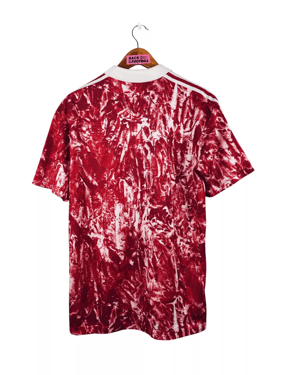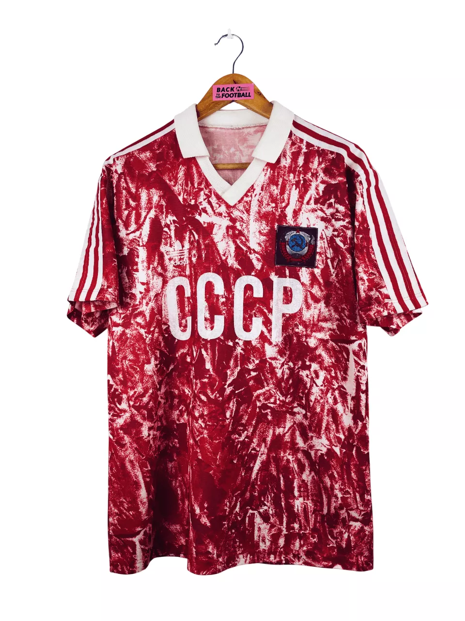 Taille : M Largeur : 52cm (aisselle à aisselle) Longueur : 70cm (base du col au bas) Si tu veux plus de détails, tu peux nous contacter par mail ou sur les réseaux 😉 Etat : 8/10, très bon état. La feutrine CCCP et Adidas est légèrement moins épaisse. L’étiquette dans le col a été coupée. Le maillot : maillot vintage domicile de l’URSS 1989/1991. L’écusson est brodé, le logo Adidas à trèfle et le CCCP sont en feutrine. Très beau maillot rétro de l’URSS ! Histoire : le maillot sera utilisé jusqu’à la chute du bloc soviétique en 1991.…