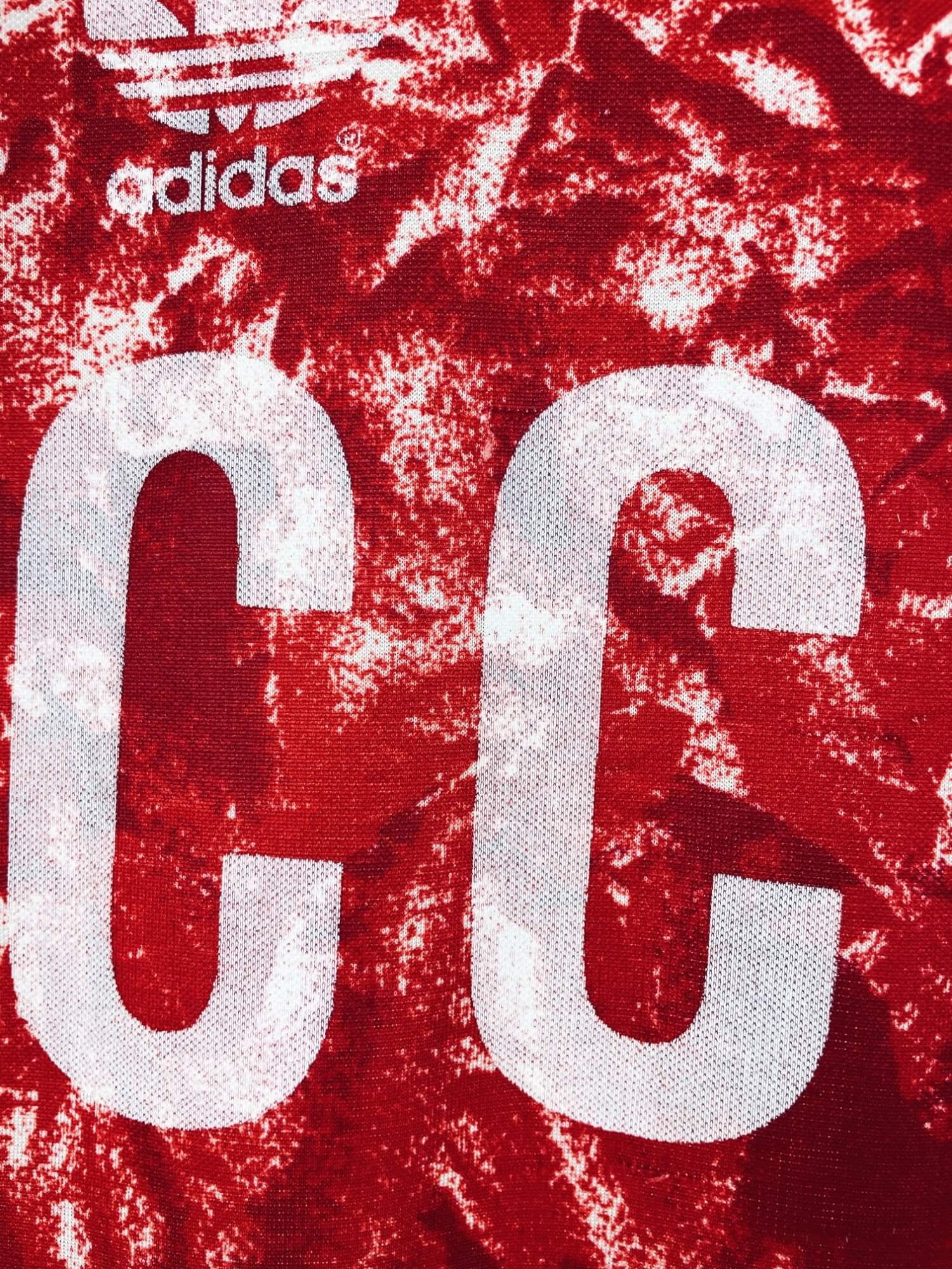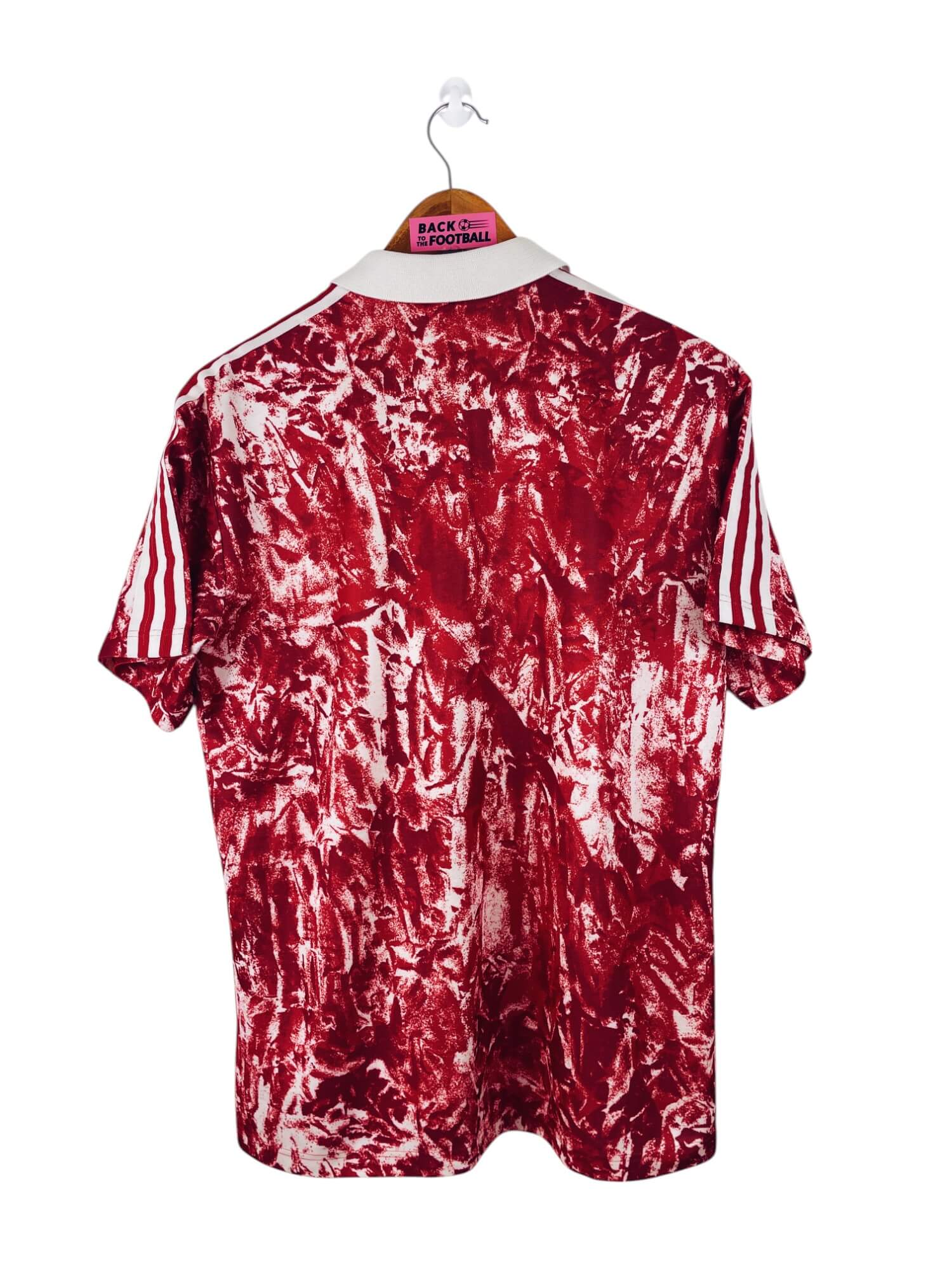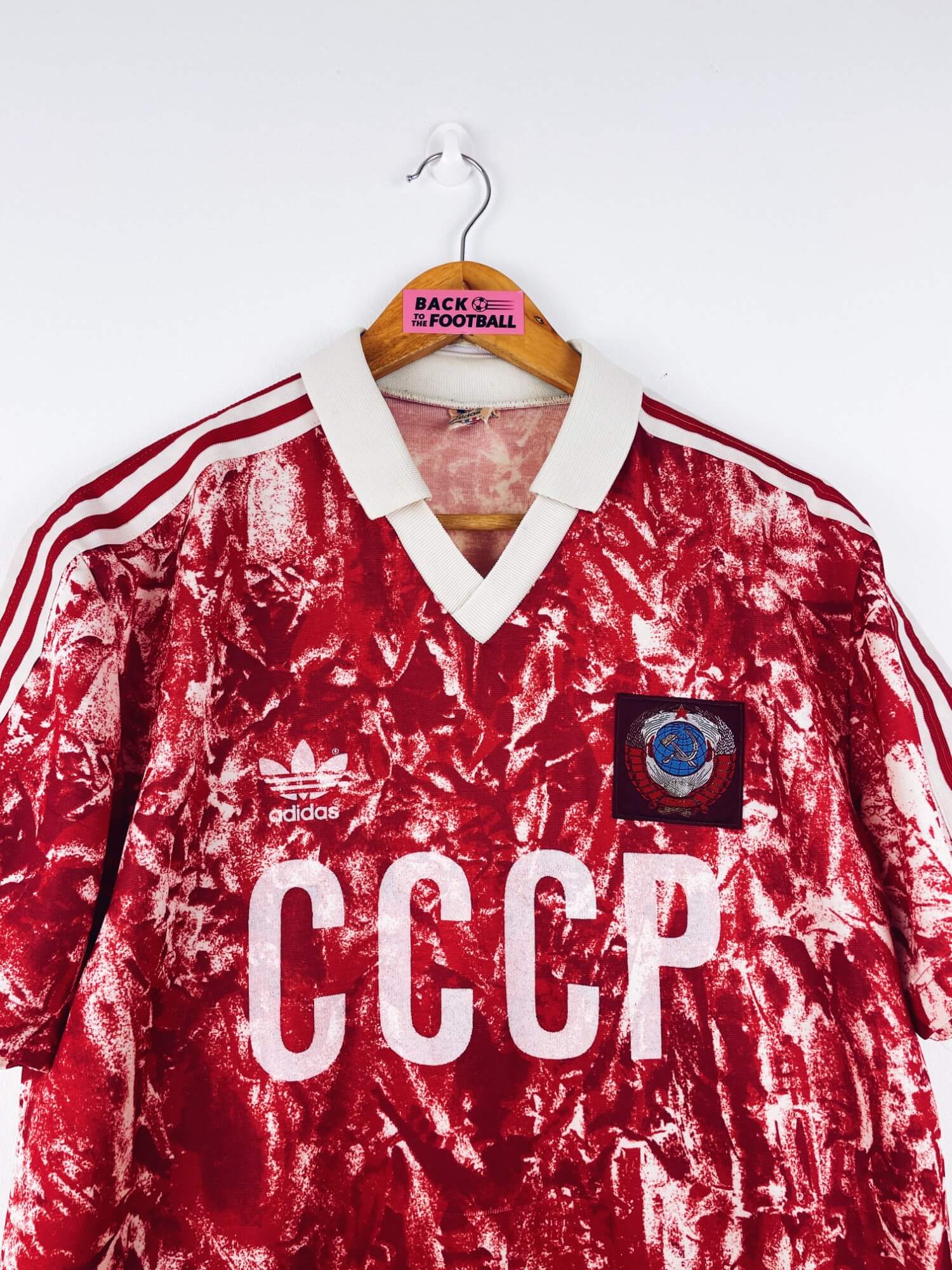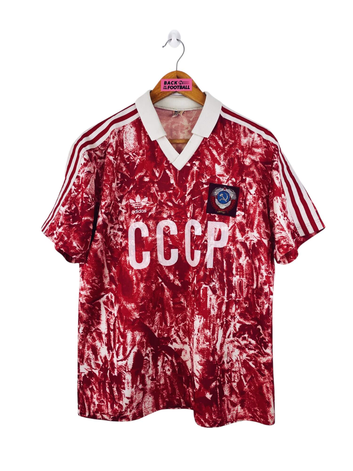 Taille : M Largeur : 52cm (aisselle à aisselle) Longueur : 69cm (base du col au bas) Si tu veux plus de détails, tu peux nous contacter par mail ou sur les réseaux 😉 Etat : 8.5/10, excellent état. Les logos Adidas et CCCP sont moins brillants qu’à l’origine (voir photo) Le maillot : maillot vintage domicile de l’URSS 1989/1991. L’écusson est brodé, le logo Adidas à trèfle et le CCCP sont en feutrine. Très beau maillot rétro de l’URSS ! Histoire : le maillot sera utilisé jusqu’à la chute du bloc soviétique en 1991. Pour la Coupe du Monde…