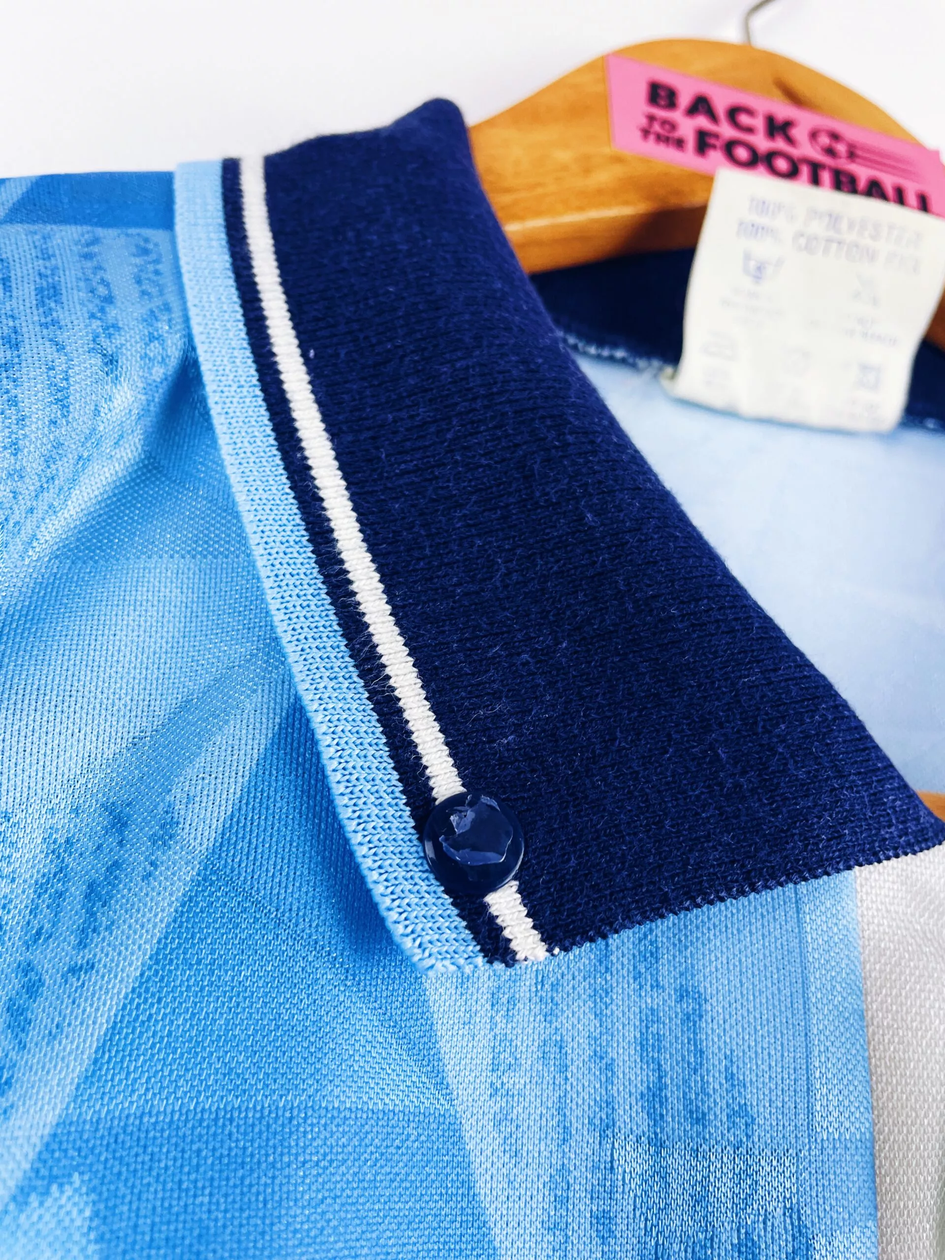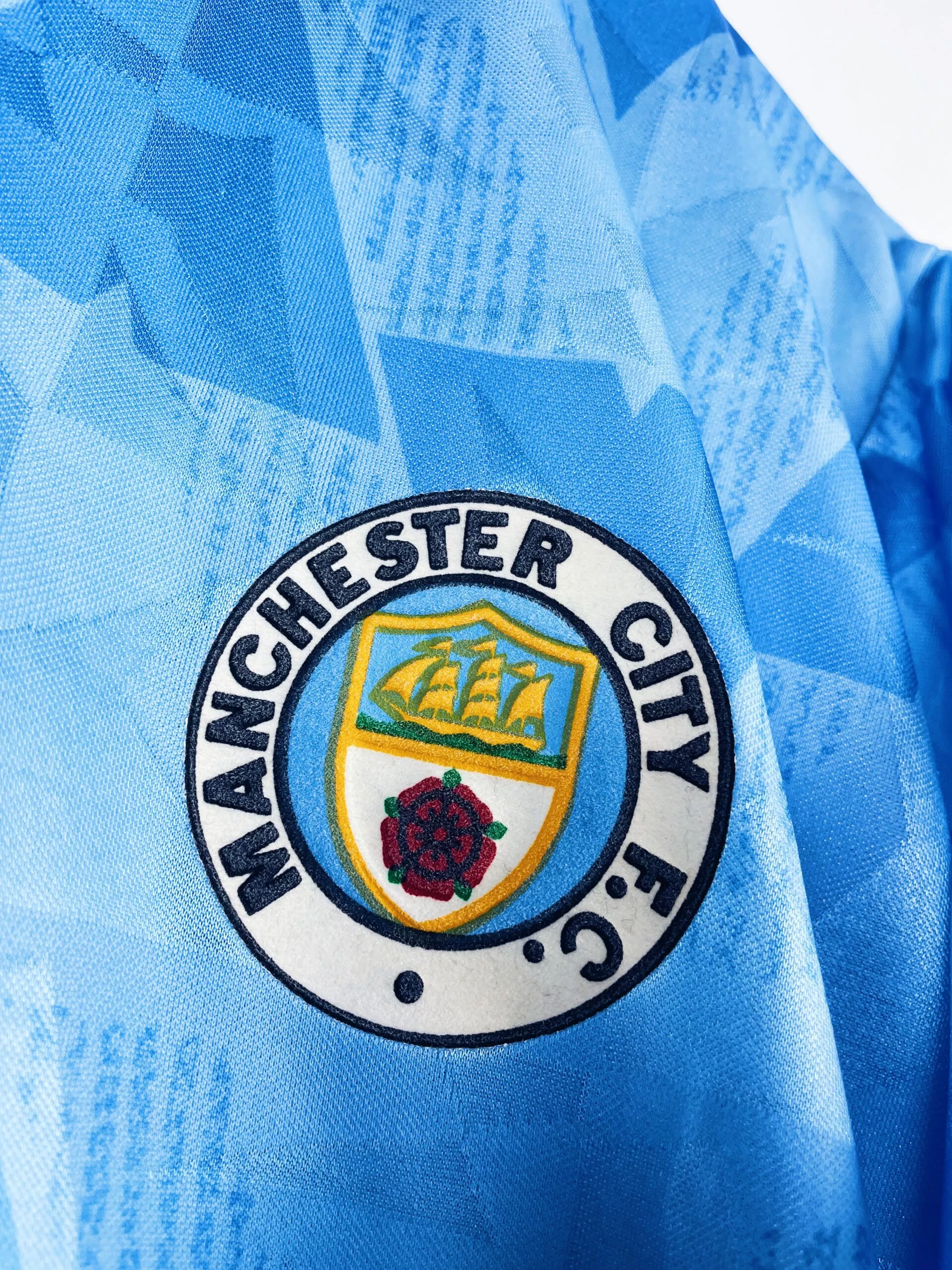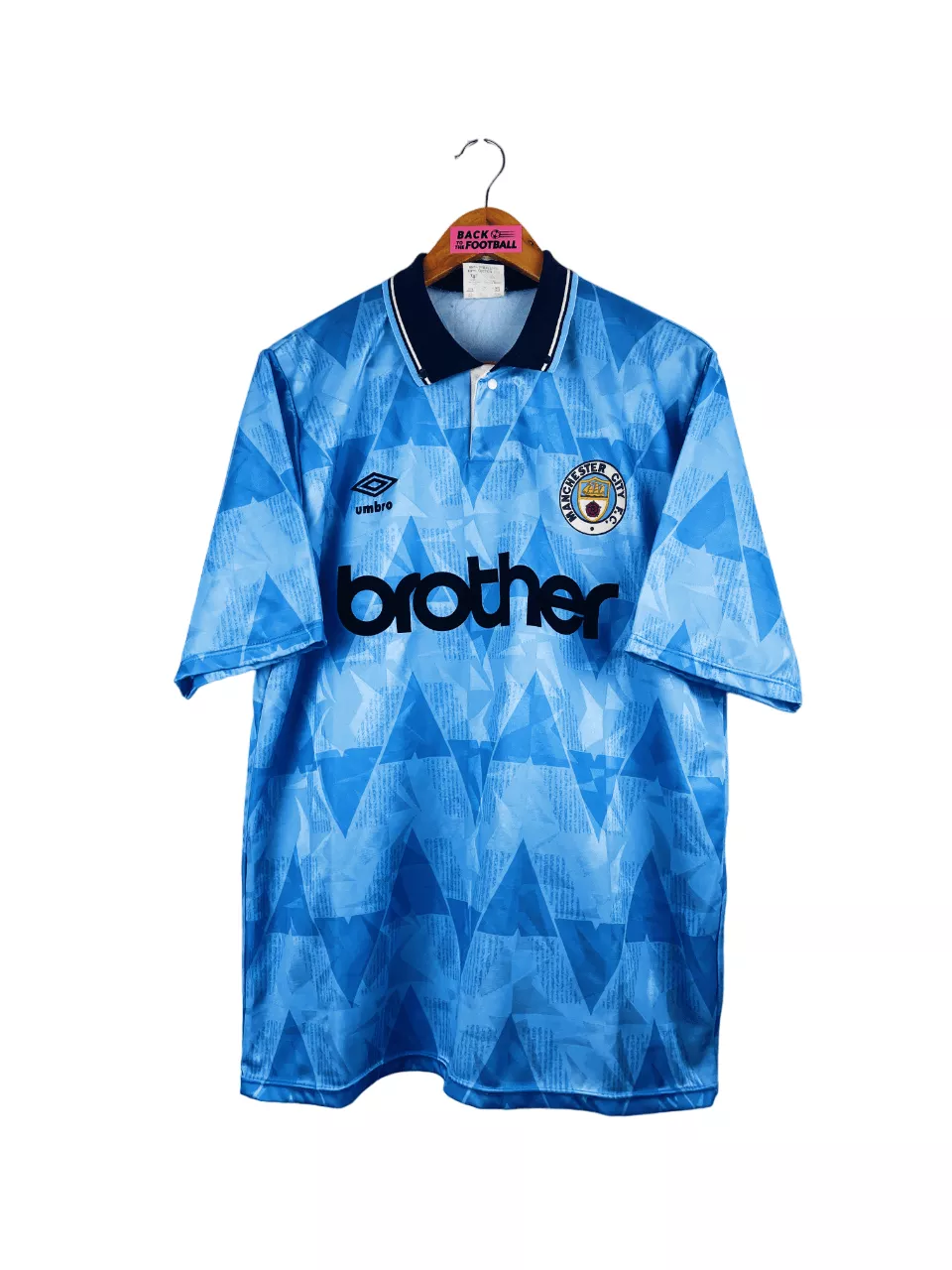 Taille : L Si tu veux plus de détails, tu peux nous contacter par mail ou sur les réseaux 😉 Etat : 8.5/10, excellent état hormis les boutons du col qui ont perdu leur vernis (voir photo) Le maillot : maillot vintage domicile de Manchester City 1989/1991. L’écusson, le logo Umbro et le sponsor Brother sont en feutrine. Magnifique maillot rétro de Man City ! Histoire : la 1ère saison, les Citizens terminent à la 14ème place de Division 1. Ils seront éliminés au 3ème round de FA Cup face à Millwall. 2ème saison bien meilleure avec une 5ème place…