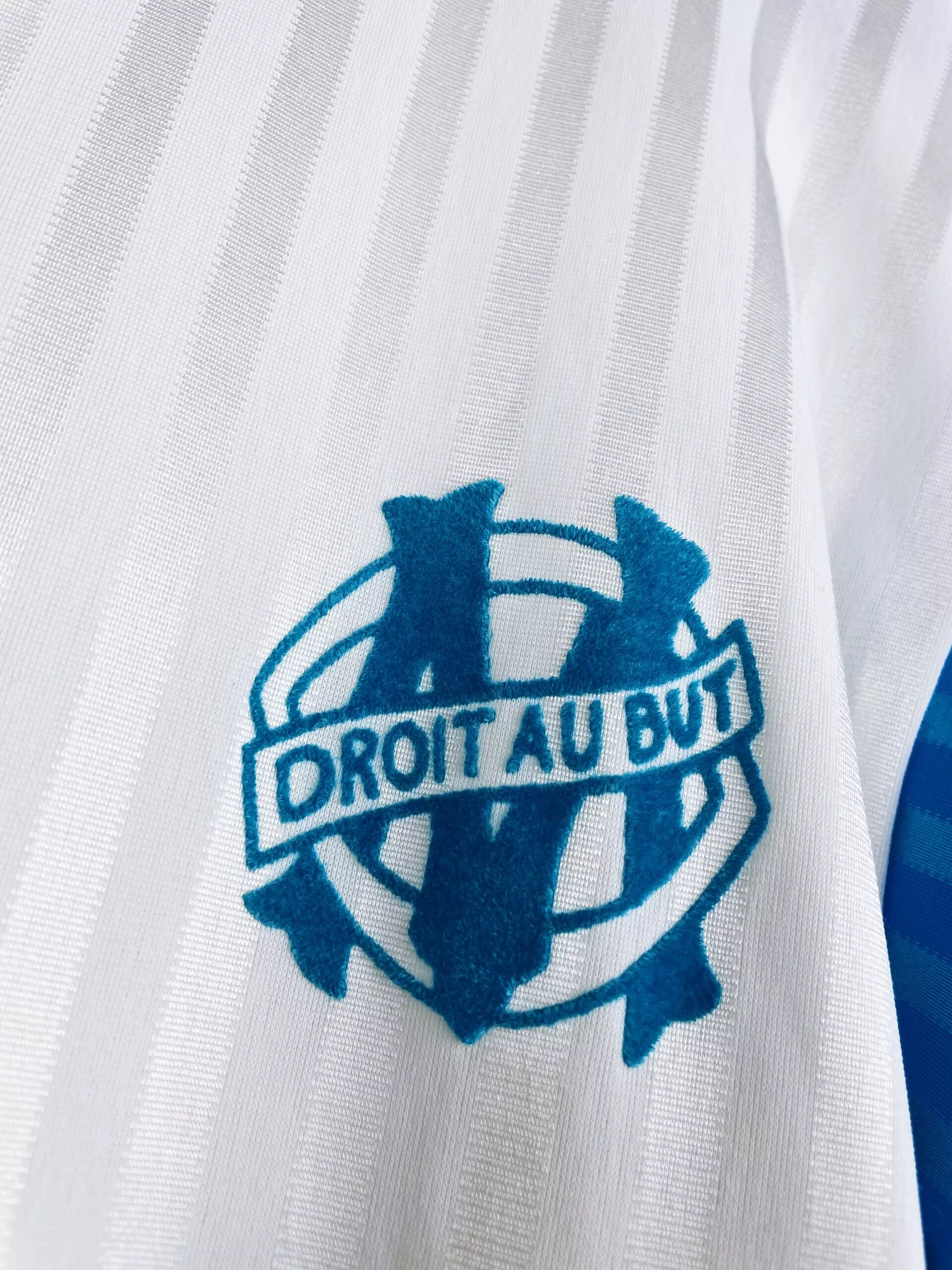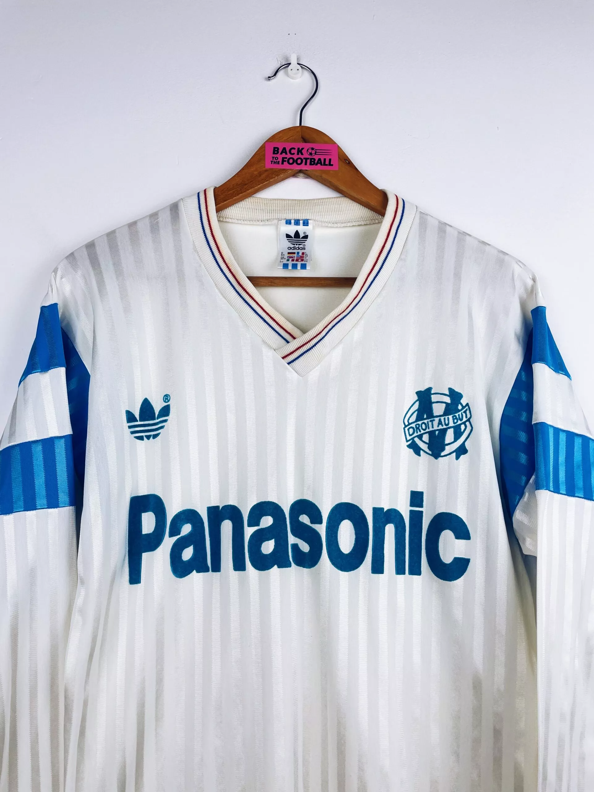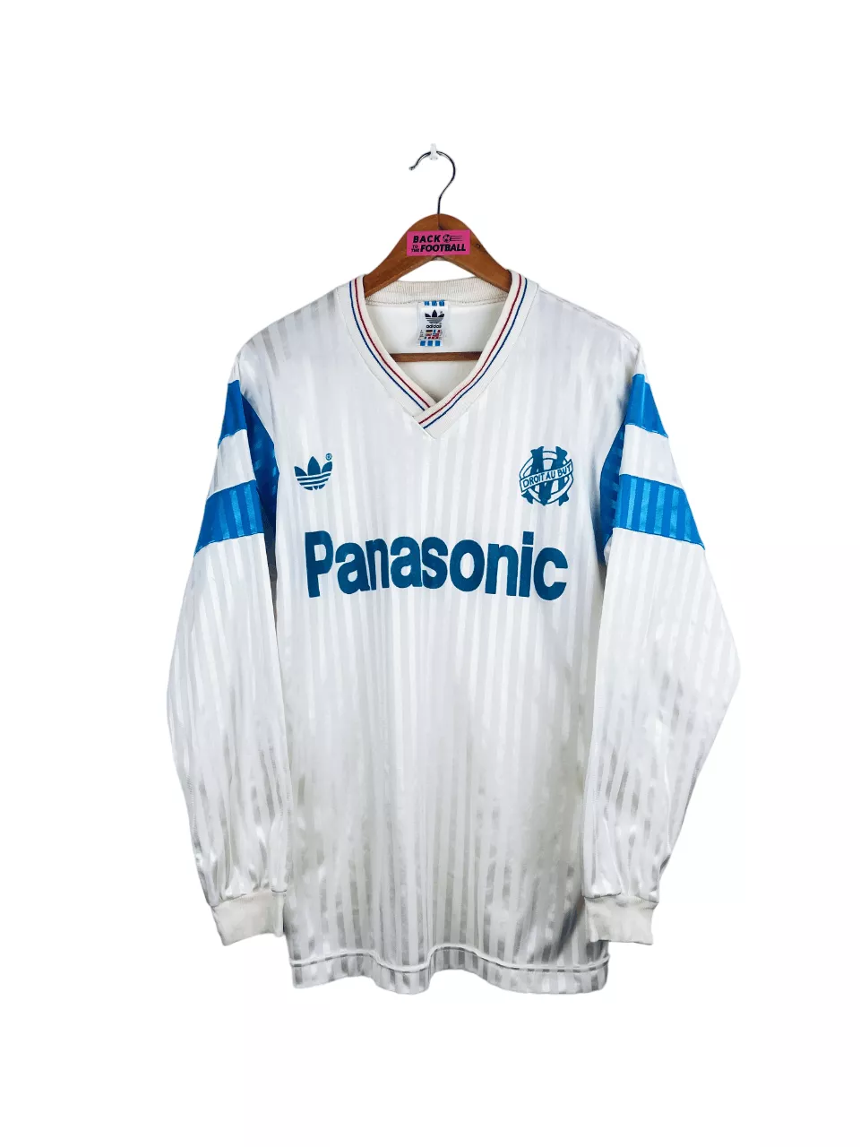 Taille : M Si tu veux plus de détails, tu peux nous contacter par mail ou sur les réseaux sociaux 😉 Etat : 8/10, excellent état hormis le col légèrement jauni (voir photo) Le maillot : maillot vintage domicile de l’OM 1989/1991 en manches longues. L’écusson, le logo Adidas à fleur et le sponsor Panasonic sont en feutrine. Le tissu est satiné avec des bandes verticales, c’est splendide. Très beau maillot rétro de l’OM ! Histoire : sous Bernard Tapie, l’OM rafle tout sur son passage. Deux championnats lors de ces deux saisons. Jean-Pierre Papin est inarrêtable avec 74 buts…