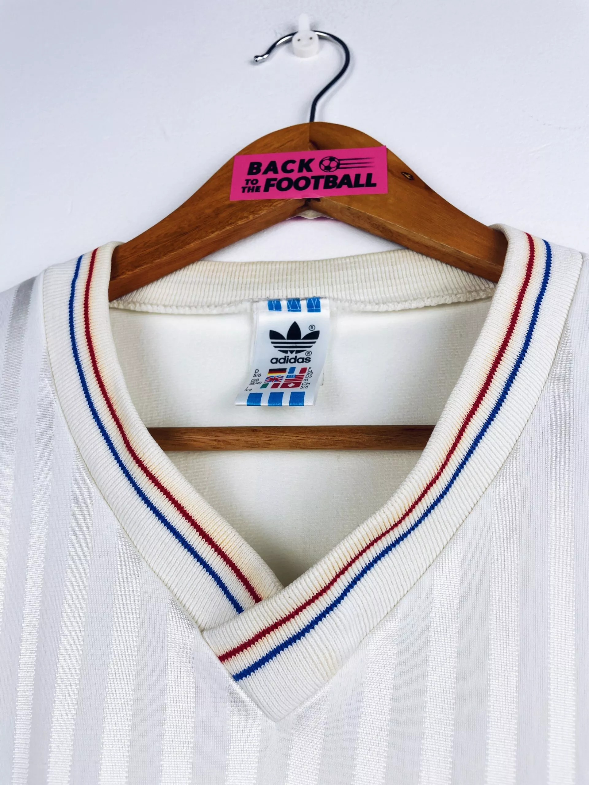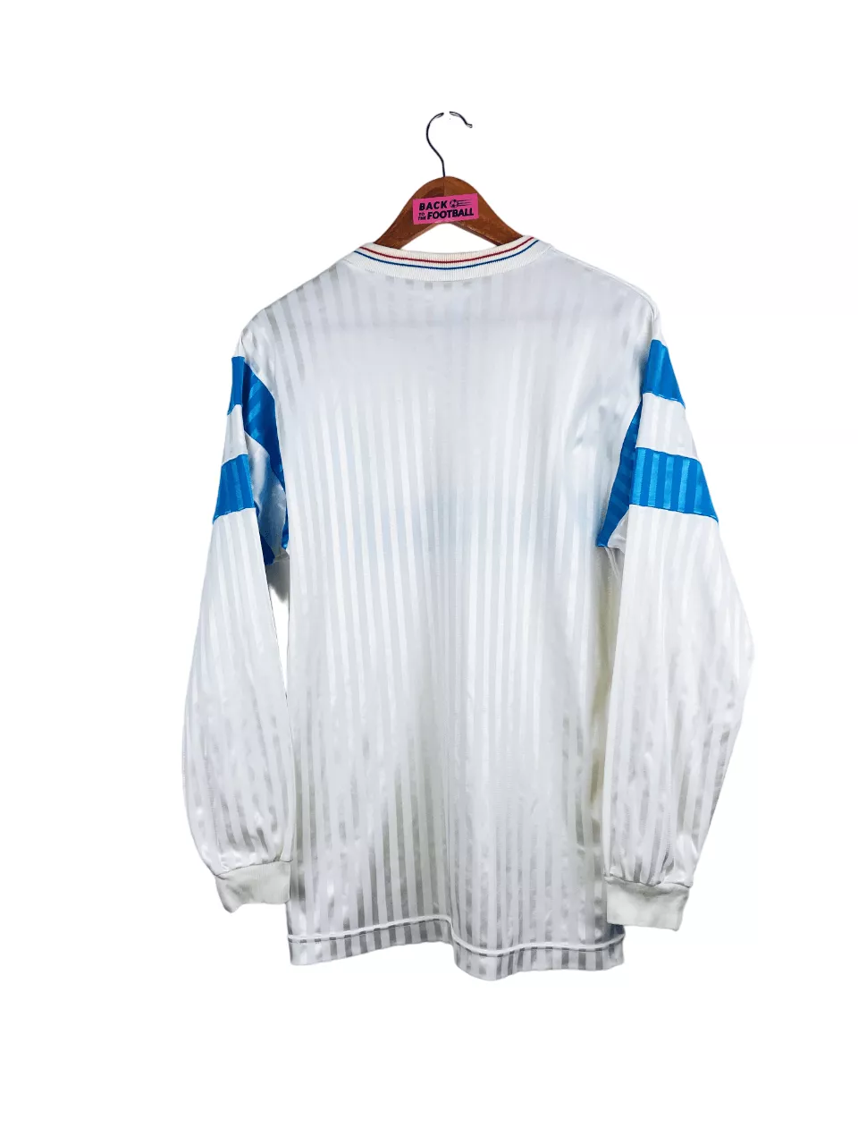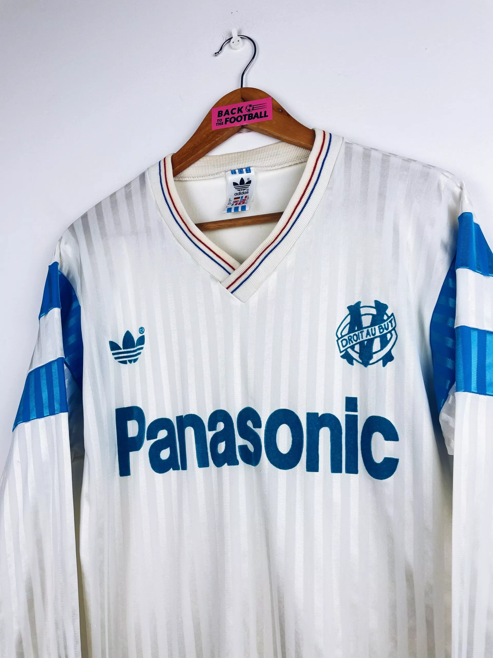 Taille : M Si tu veux plus de détails, tu peux nous contacter par mail ou sur les réseaux sociaux 😉 Etat : 8/10, excellent état hormis le col légèrement jauni (voir photo) Le maillot : maillot vintage domicile de l’OM 1989/1991 en manches longues. L’écusson, le logo Adidas à fleur et le sponsor Panasonic sont en feutrine. Le tissu est satiné avec des bandes verticales, c’est splendide. Très beau maillot rétro de l’OM ! Histoire : sous Bernard Tapie, l’OM rafle tout sur son passage. Deux championnats lors de ces deux saisons. Jean-Pierre Papin est inarrêtable avec 74 buts…