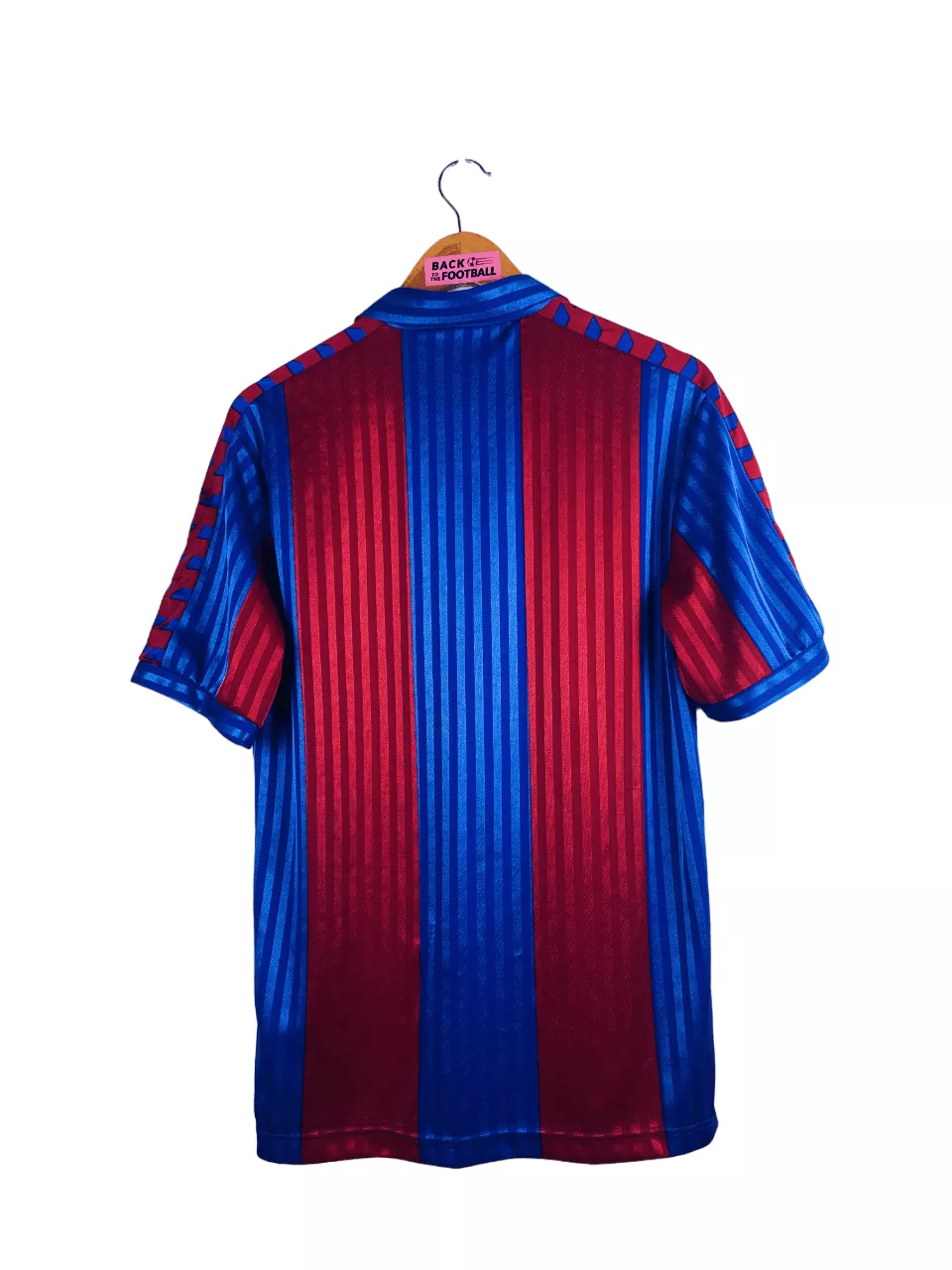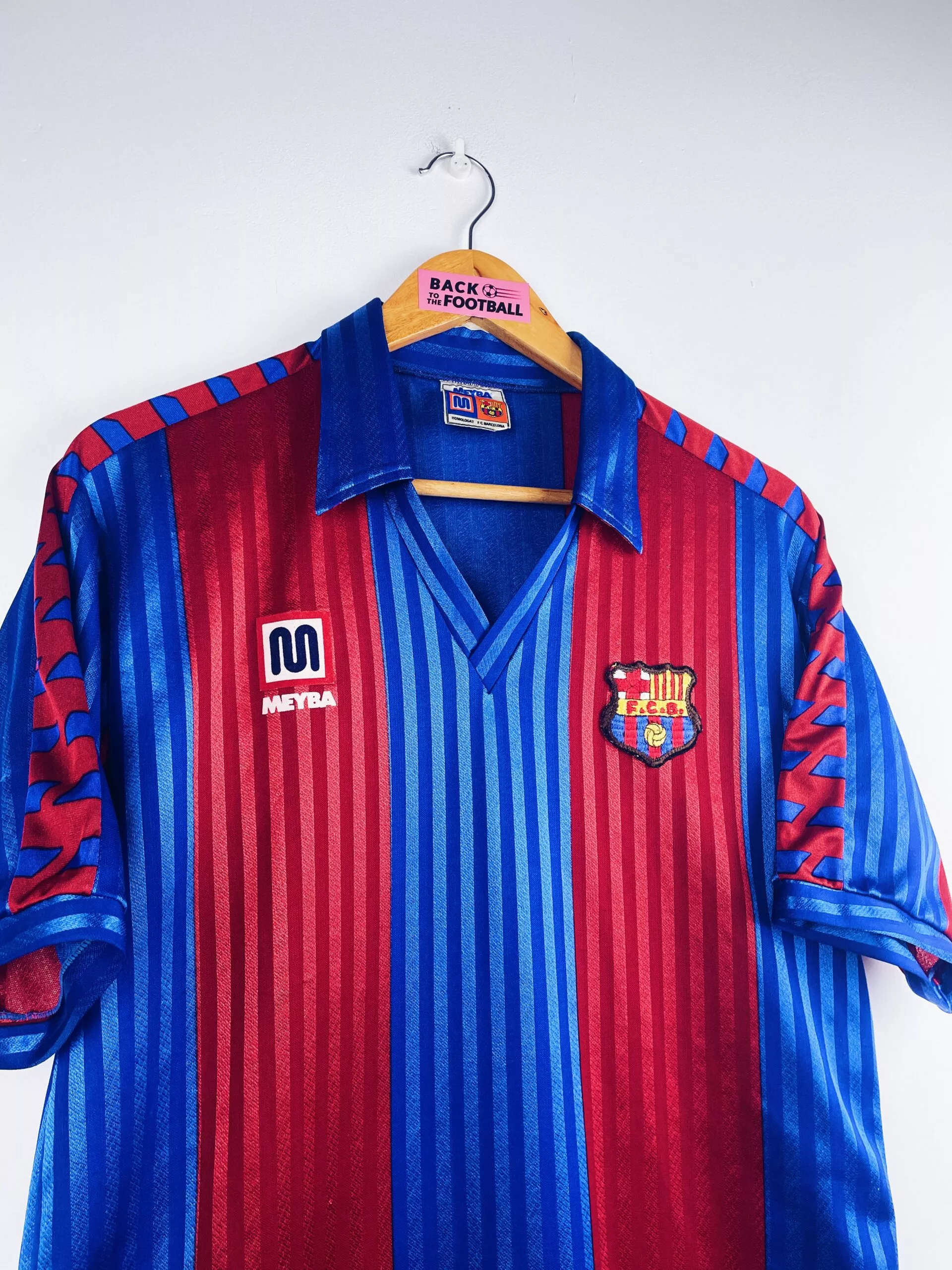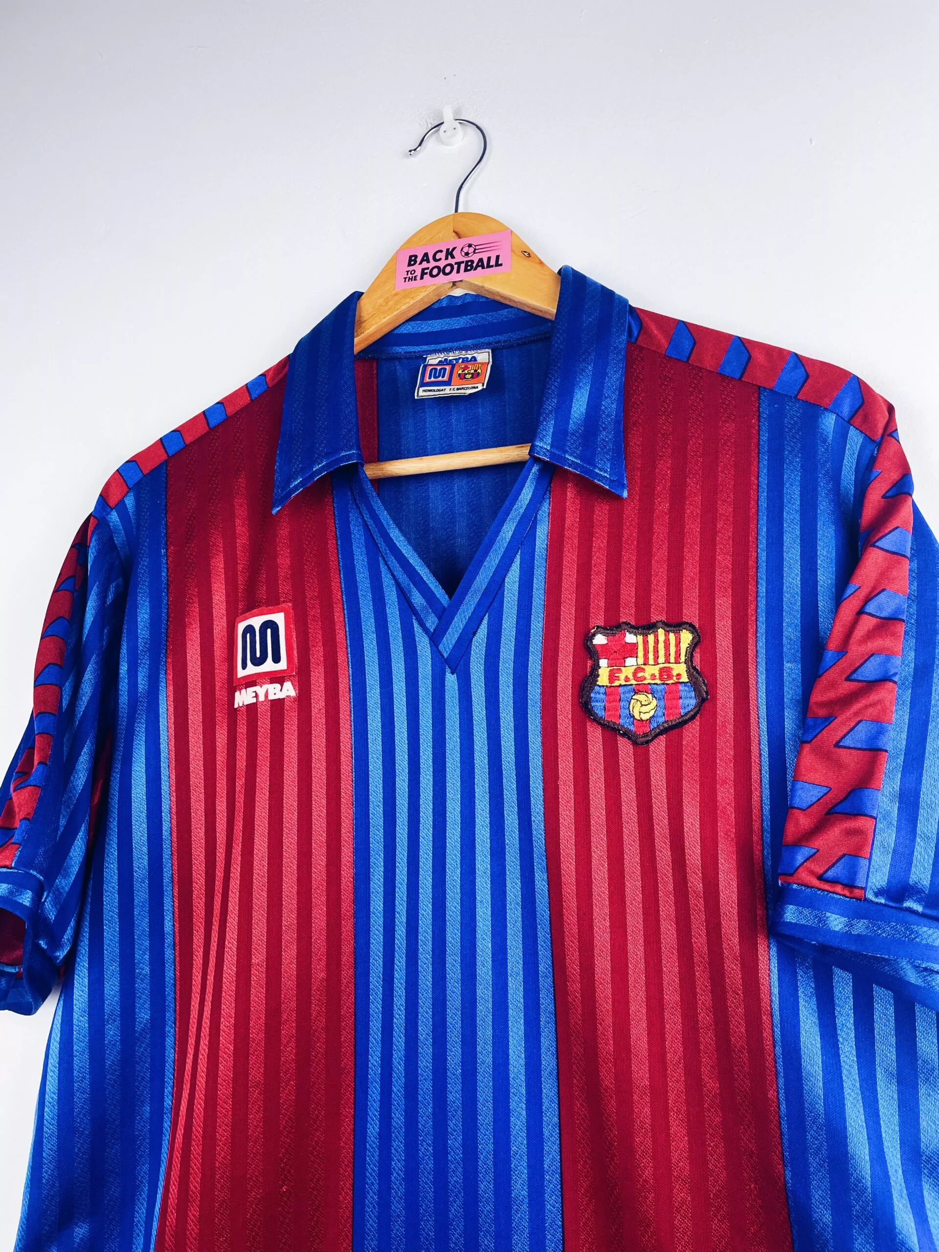Taille : M Largeur : 48cm (aisselle à aisselle) Longueur : 68cm (base du col au bas) Si tu veux plus de détails, tu peux nous contacter par mail ou sur les réseaux 😉 Etat : 8/10, très bon état, 2/3 légères bouloches. Le maillot : maillot vintage domicile du FC Barcelone 1989/1992 de l’ère Cruyff. L’écusson est brodé, le logo Meyba est en feutrine. Il y a des aérations au niveau des aisselles. Les couleurs en satin sont magnifiques. Très beau maillot rétro de Barcelone ! Histoire : sur ces 3 saisons, les Blaugranas coaché par Johan Cruyff gagneront…