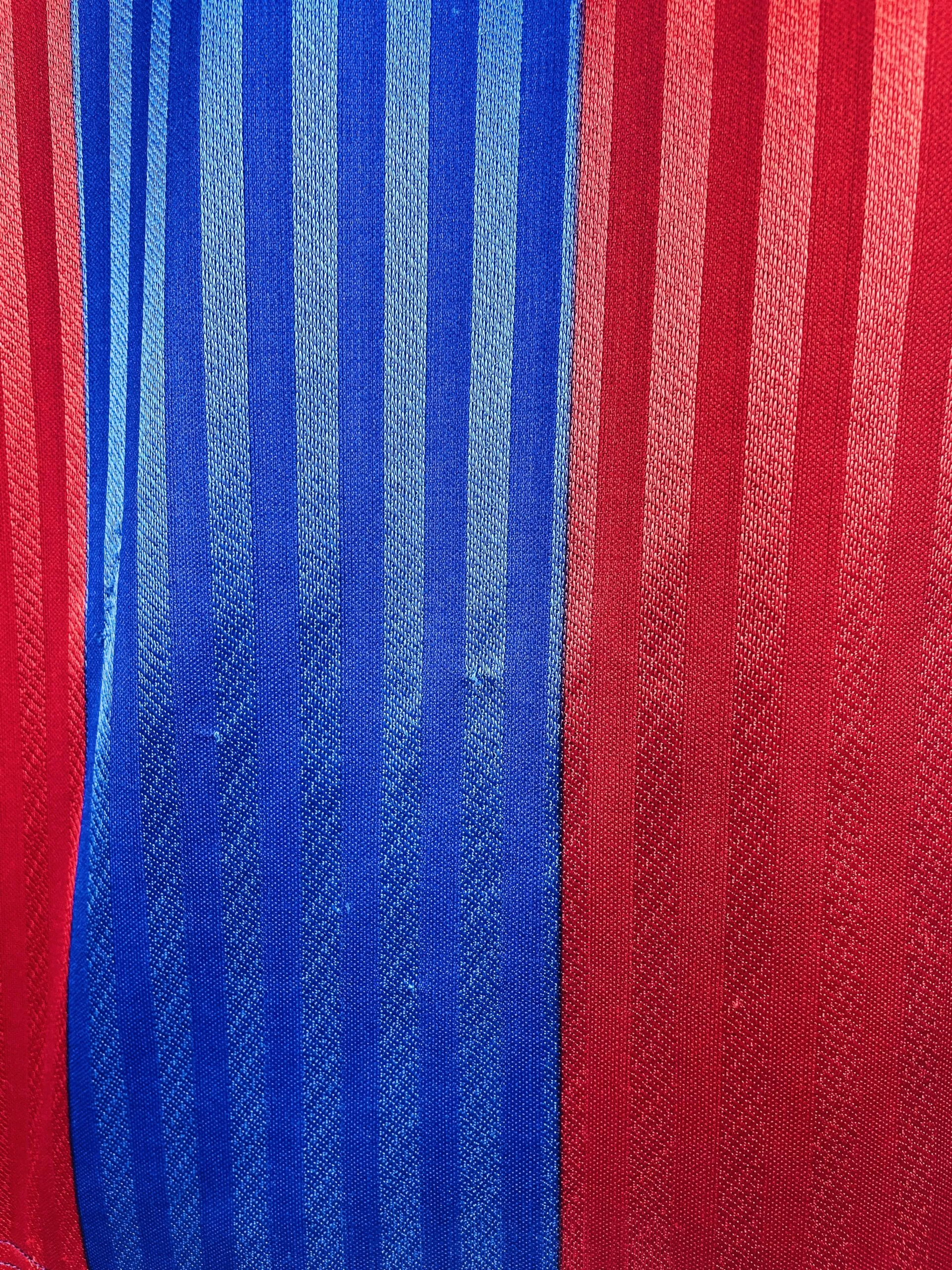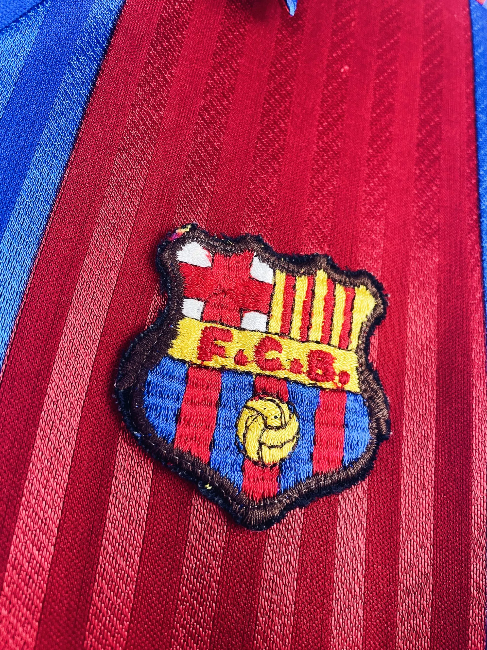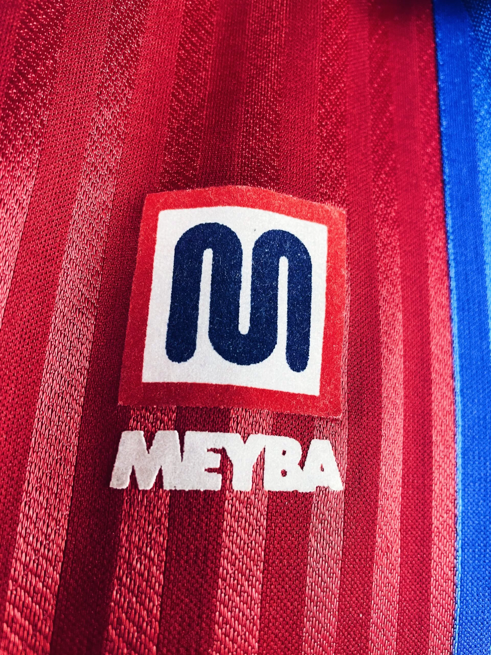 Taille : M Largeur : 48cm (aisselle à aisselle) Longueur : 68cm (base du col au bas) Si tu veux plus de détails, tu peux nous contacter par mail ou sur les réseaux 😉 Etat : 8/10, très bon état, 2/3 légères bouloches. Le maillot : maillot vintage domicile du FC Barcelone 1989/1992 de l’ère Cruyff. L’écusson est brodé, le logo Meyba est en feutrine. Il y a des aérations au niveau des aisselles. Les couleurs en satin sont magnifiques. Très beau maillot rétro de Barcelone ! Histoire : sur ces 3 saisons, les Blaugranas coaché par Johan Cruyff gagneront…