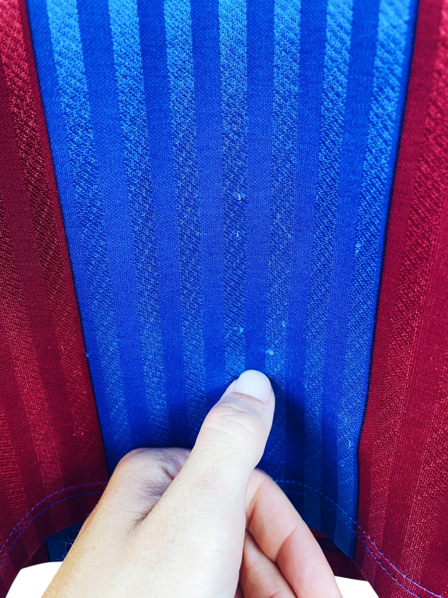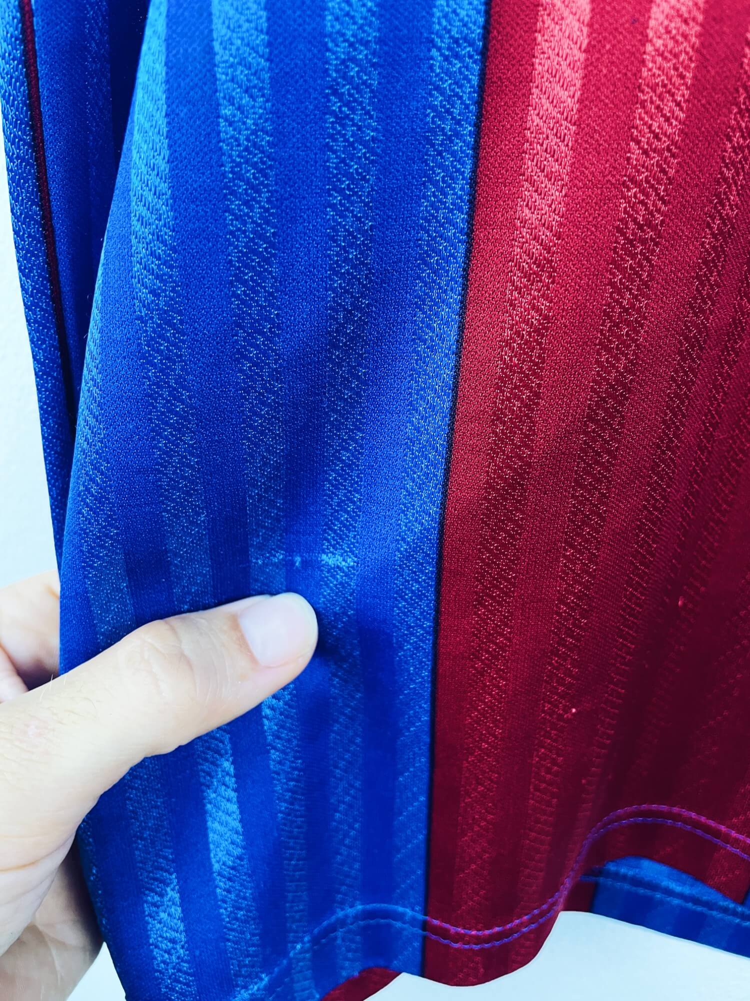 Taille : M Largeur : 51cm (aisselle à aisselle) Longueur : 72cm (base du col au bas) Si tu veux plus de détails, tu peux nous contacter par mail ou sur les réseaux 😉 Etat : 7.5/10, très bon état mais le logo Meyba est abimé et des bouloches (voir photos) Le maillot : maillot vintage domicile du FC Barcelone 1989/1992. L’écusson est brodé, le logo Meyba est en feutrine. Il y a des aérations au niveau des aisselles. Les couleurs en satin sont magnifiques. Très beau maillot rétro de Barcelone ! Histoire : sur ces 3 saisons, les Blaugranas…