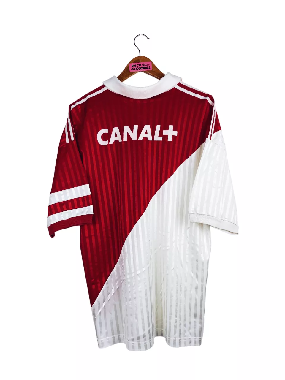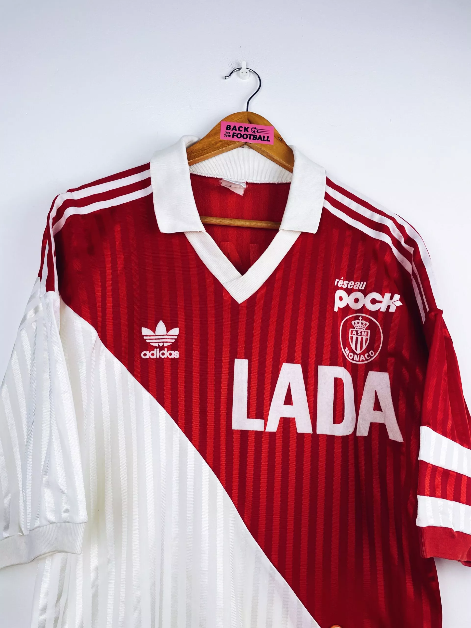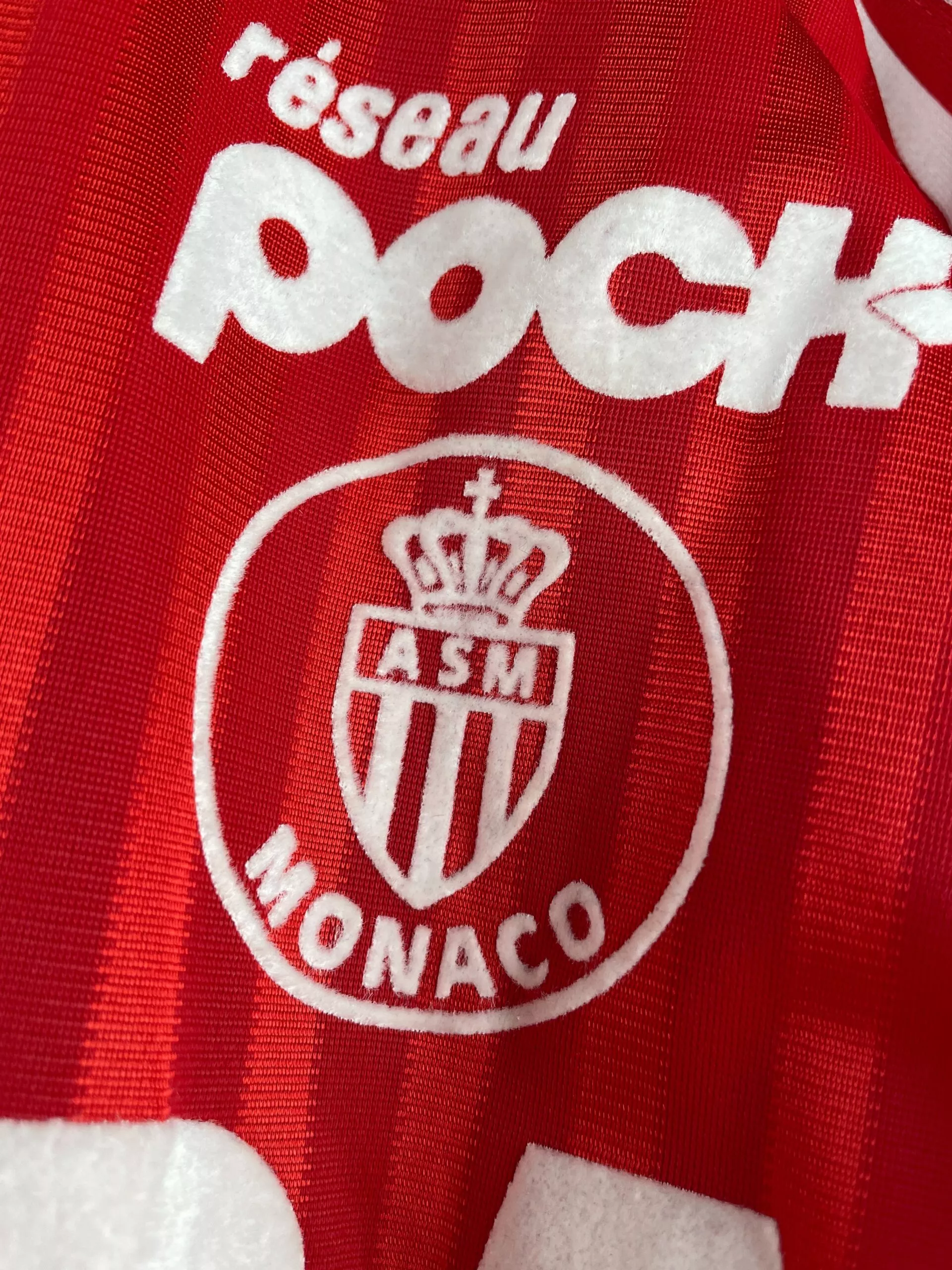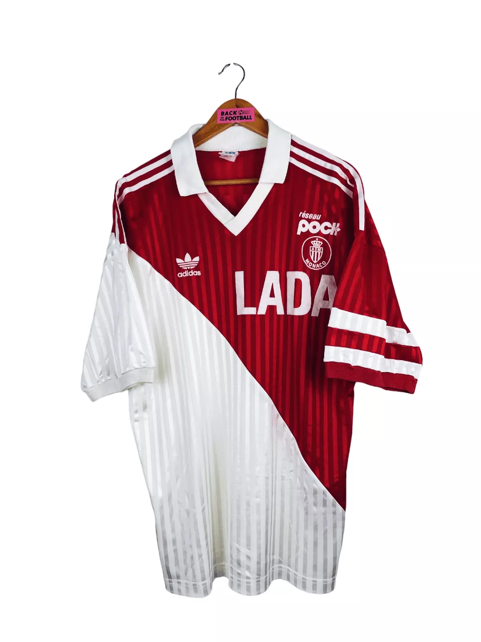 Taille : L Si tu veux plus de détails, tu peux nous contacter par mail ou sur les réseaux 😉 Etat : 8.5/10, excellent état Le maillot : maillot vintage domicile de l’AS Monaco 1990/1991. L’écusson, le logo Adidas à trèfle et les sponsors Lada et Poch sont en feutrine. Très beau maillot rétro de Monaco ! Histoire : belle saison des Monégasques coachés par Arsène Wenger, qui terminent à la 2ème place de Division 1 derrière l’OM de Tapie. Les Monégasques remporteront la Coupe de France face à l’OM grâce à un but de Passi à la 90ème. Marcel…