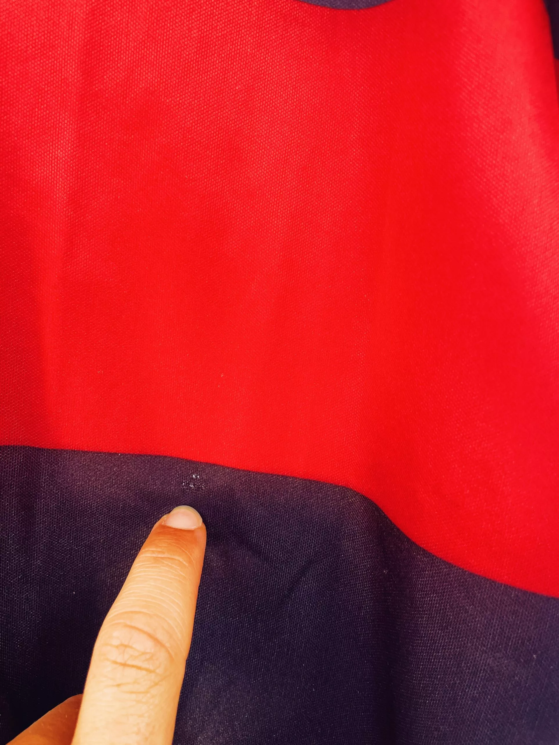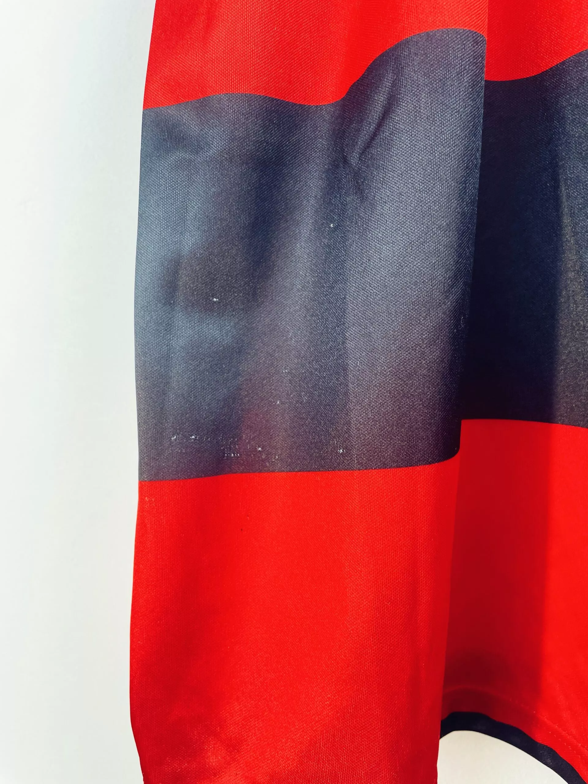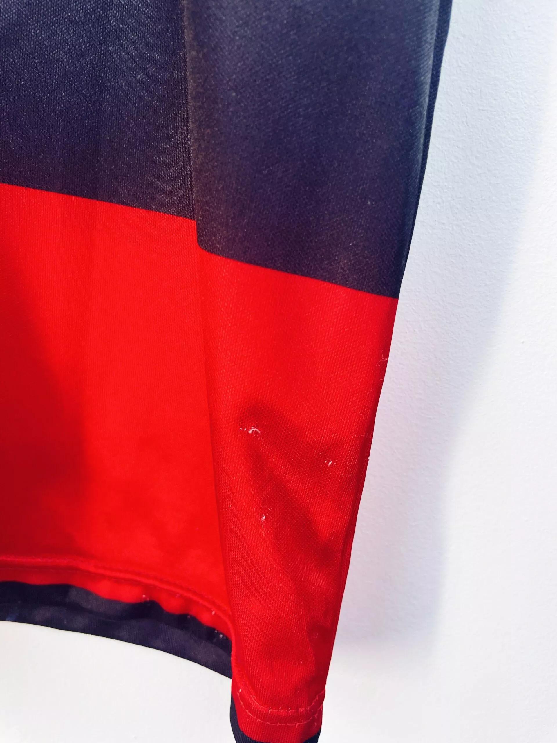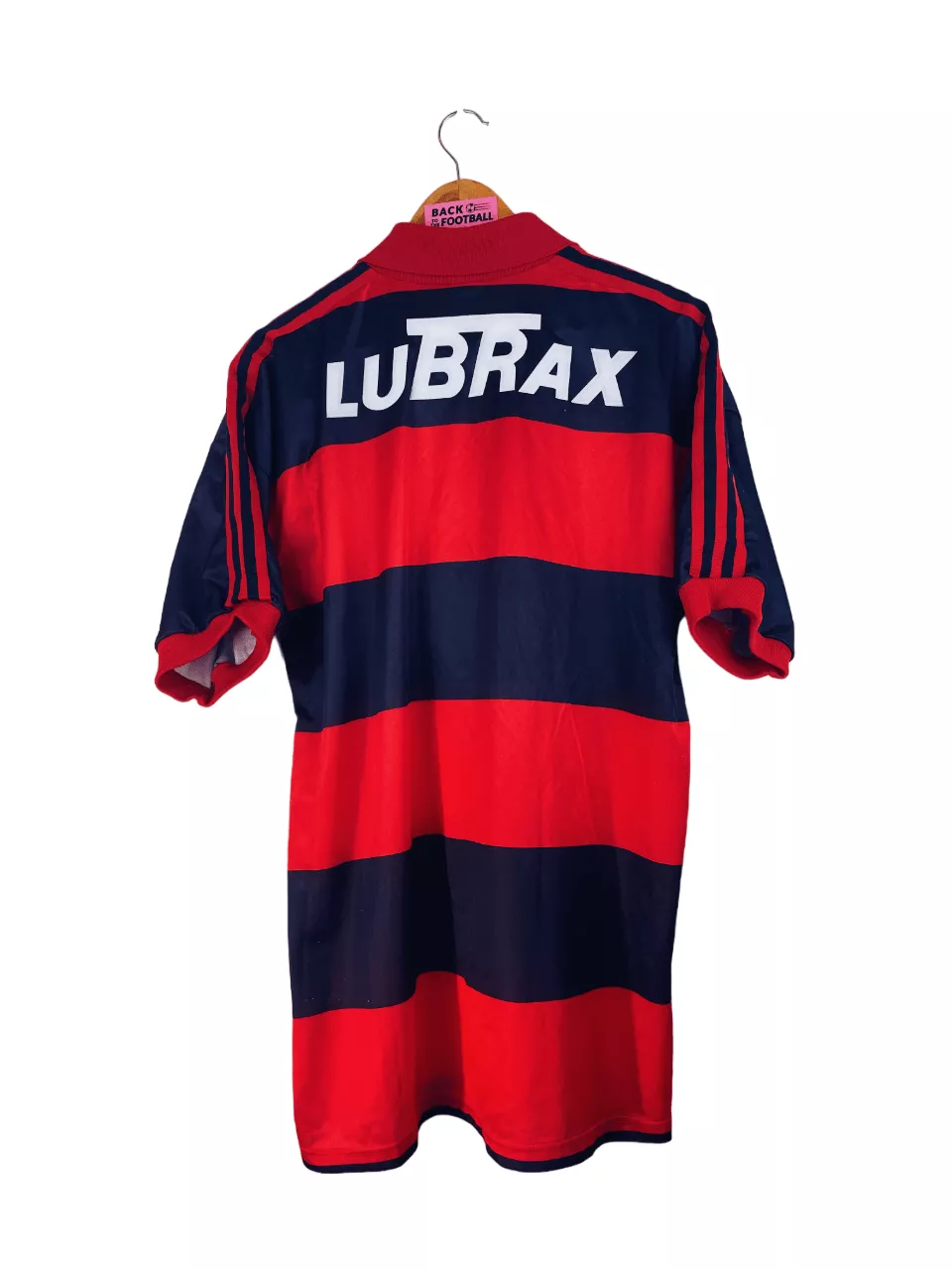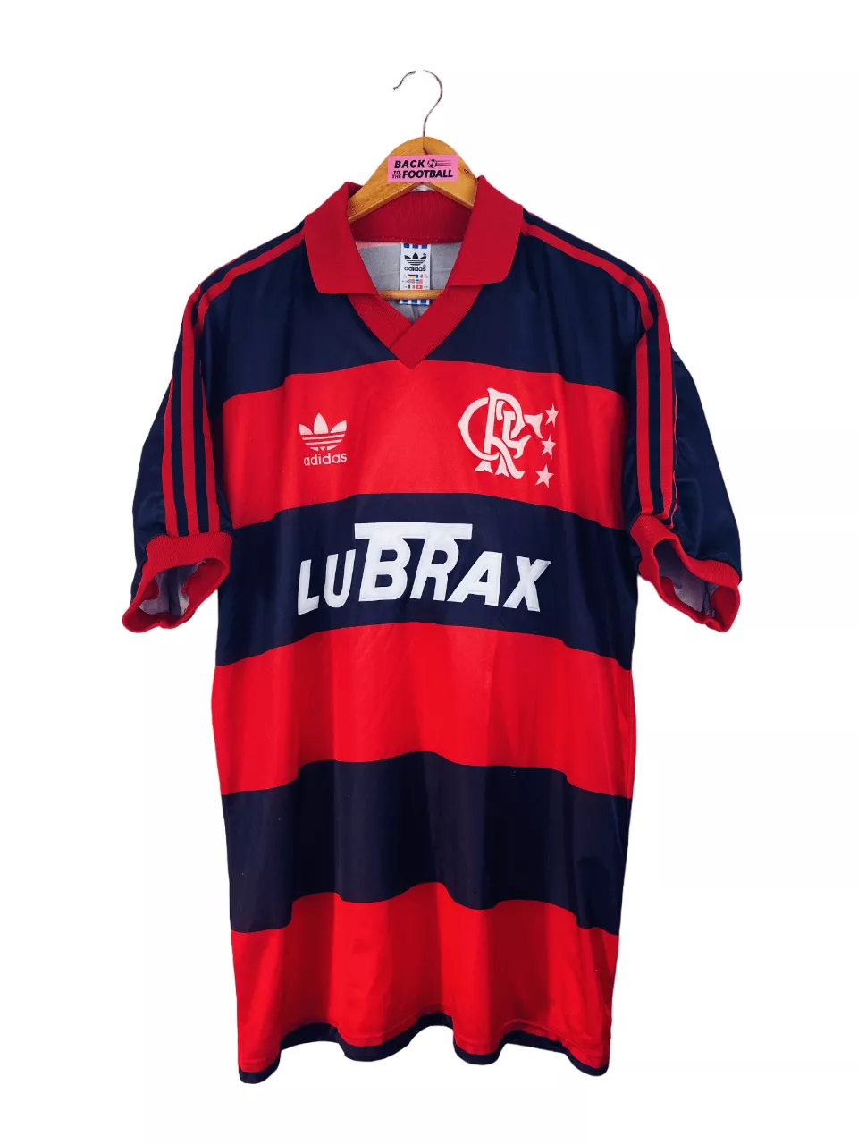Taille : L Si tu veux plus de détails, tu peux nous contacter par mail ou sur les réseaux 😉 Etat : 8/10, très bon état, quelques bouloches (voir photos) Le maillot : maillot vintage domicile de Flamengo 1990/1991. L’écusson, le logo Adidas à trèfle et le sponsor Lubrax sont en feutrine. Très beau maillot rétro de Flamengo ! Histoire : la première saison, le club de Rio de Janeiro terminene à la 11ème place du championnat brésilien. Par contre, ils remportent la Coupe du Brésil face à Goiás. La deuxième saison, ils terminent 9èmes du championnat et seront éliminés…