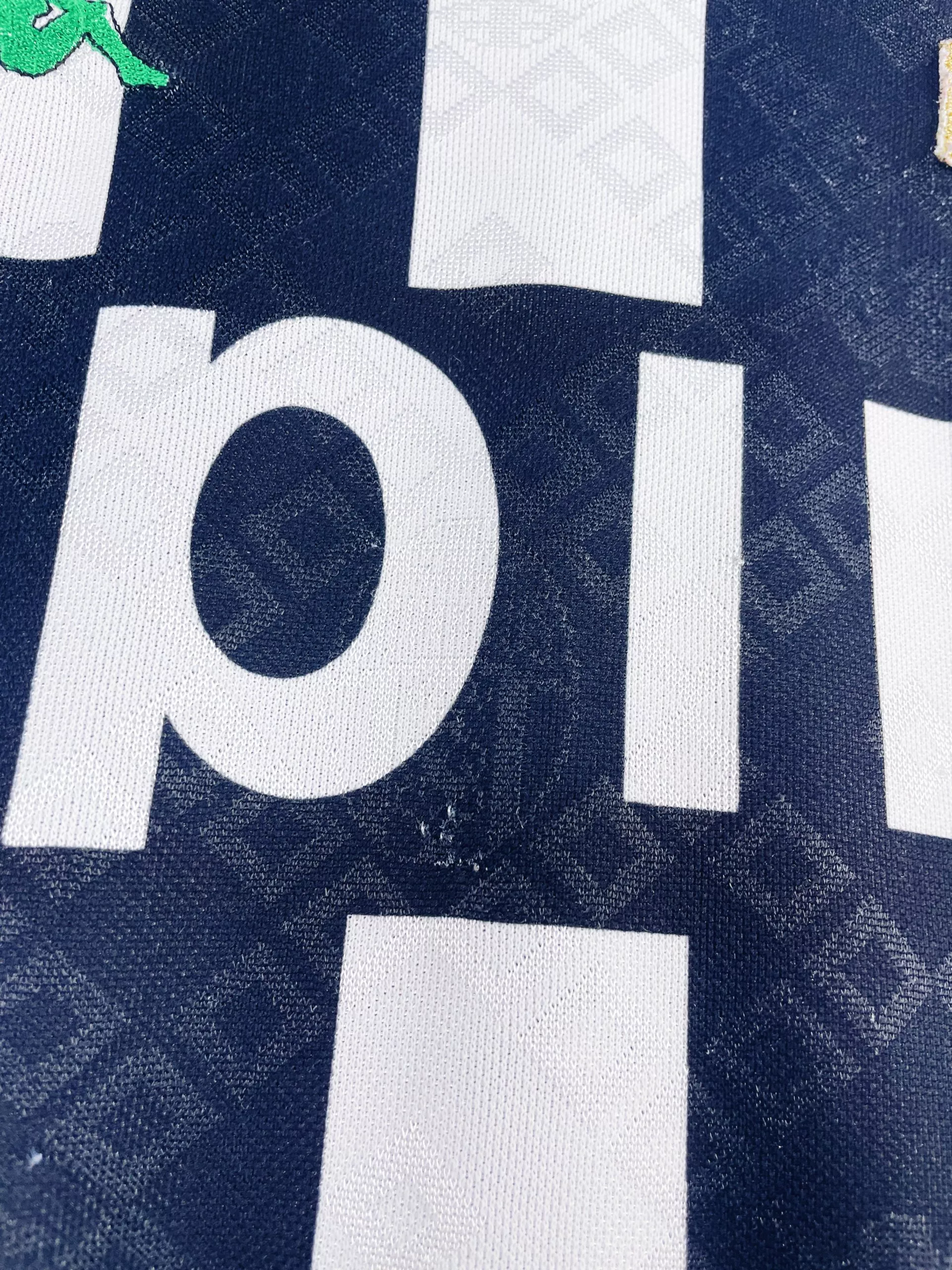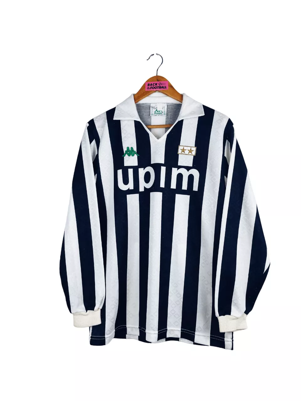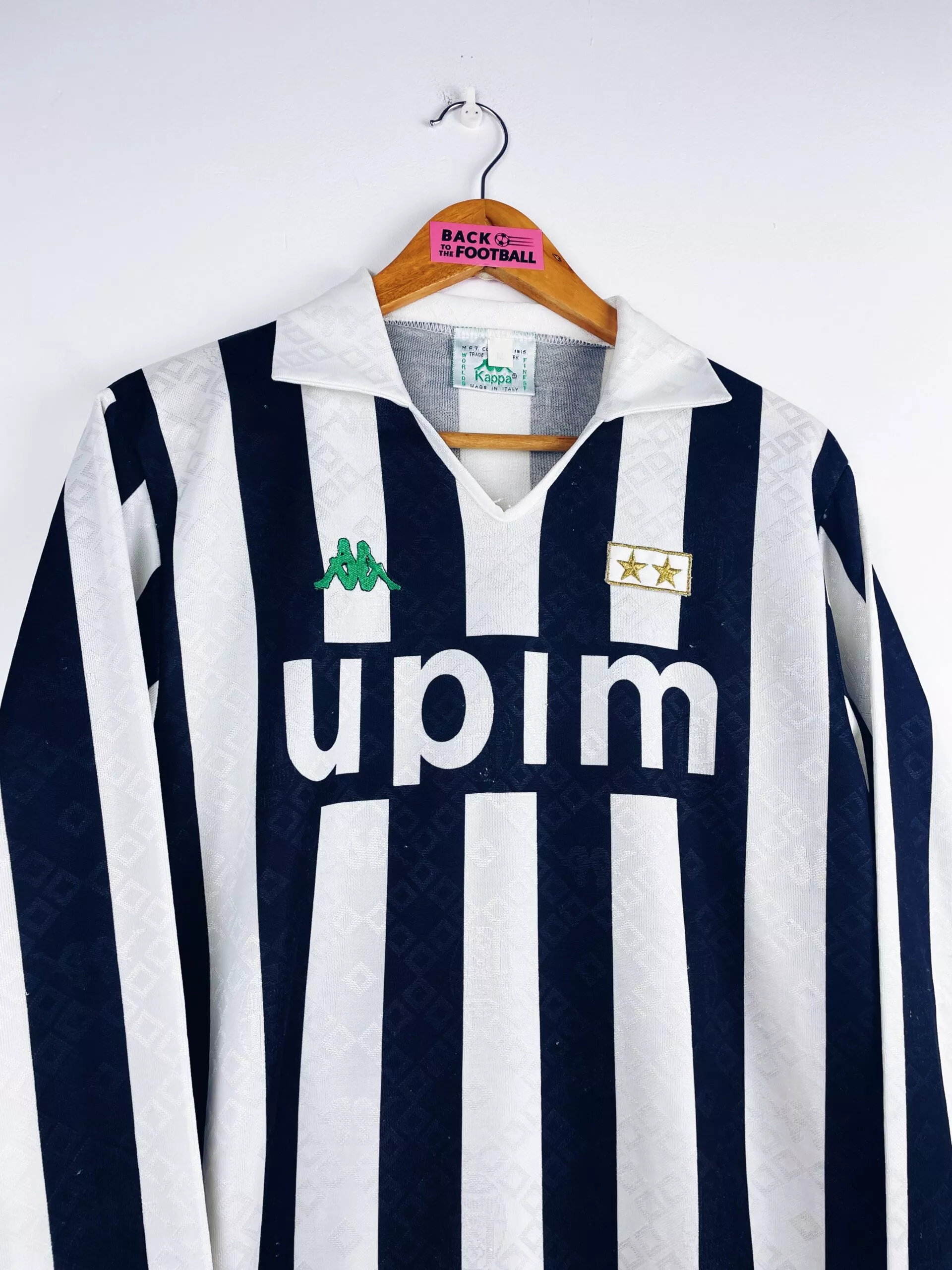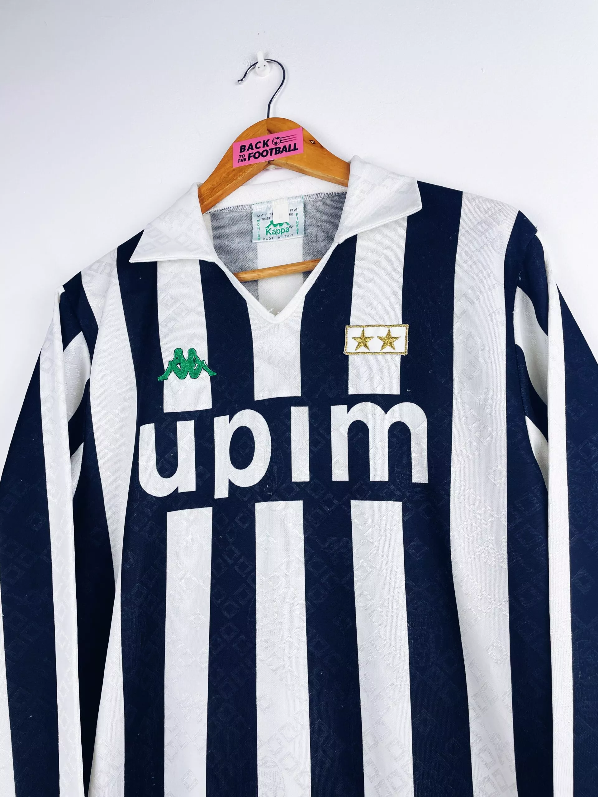 Taille : L Si tu veux plus de détails, tu peux nous contacter par mail ou sur les réseaux 😉 Etat : 6.5/10, bon état mais de nombreuses bouloches (voir photos) Le maillot : maillot vintage domicile de la Juventus 1990/1991 manches longues. Les 2 étoiles et le logo Kappa sont brodés. Le sponsor Upim est incrusté. On peut voir en tramé l’écusson de la Juventus et le logo Kappa. Très beau maillot rétro de la Juventus ! Histoire : les Bianconeri terminent à la 7ème place de Serie A. Ils seront éliminés en quart de Coupe d’Italie et en…