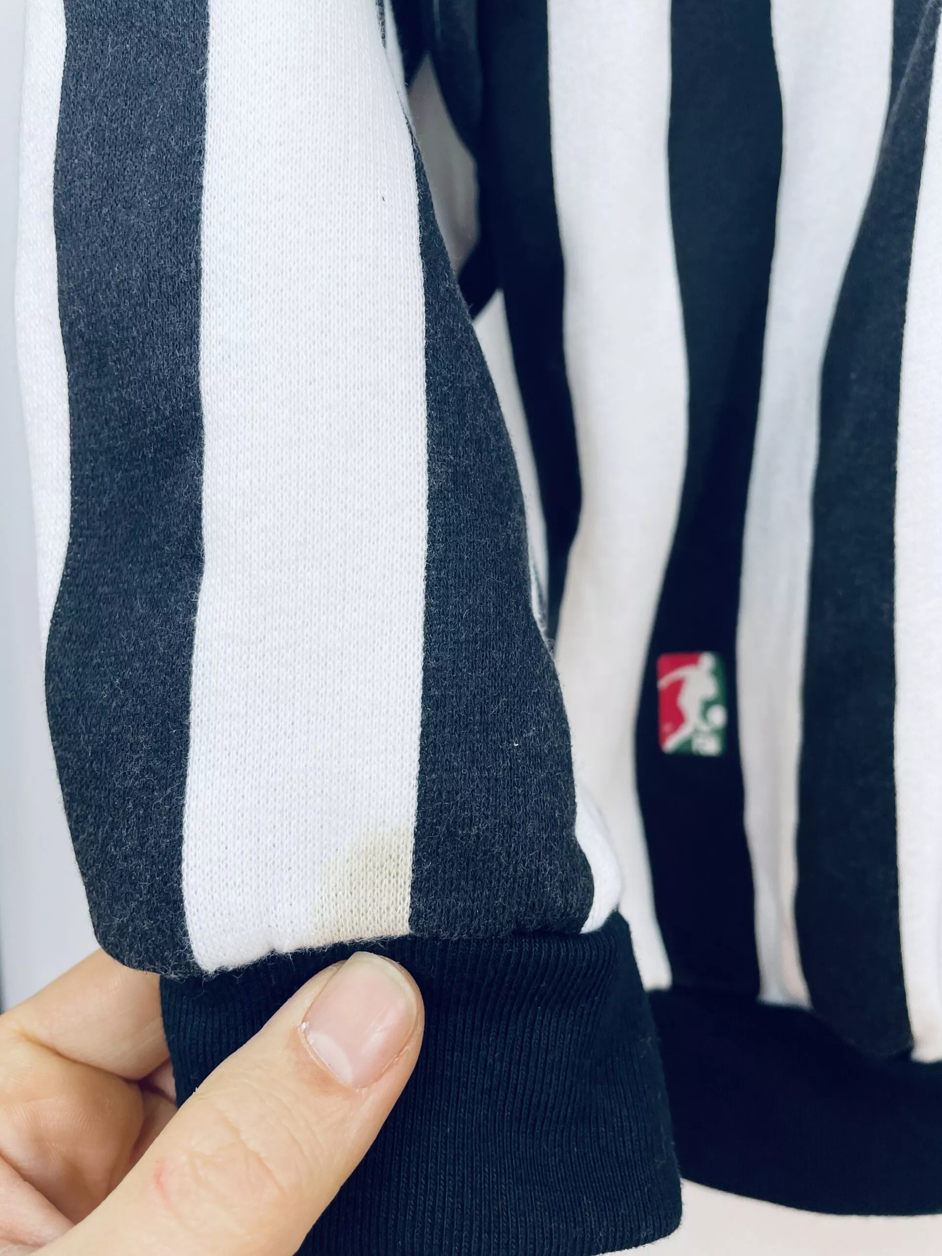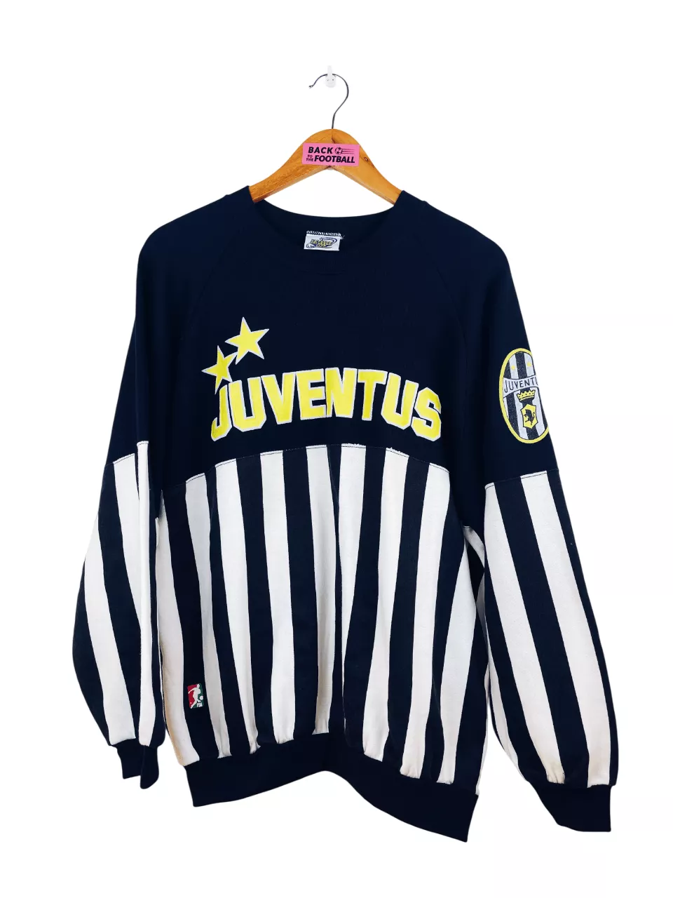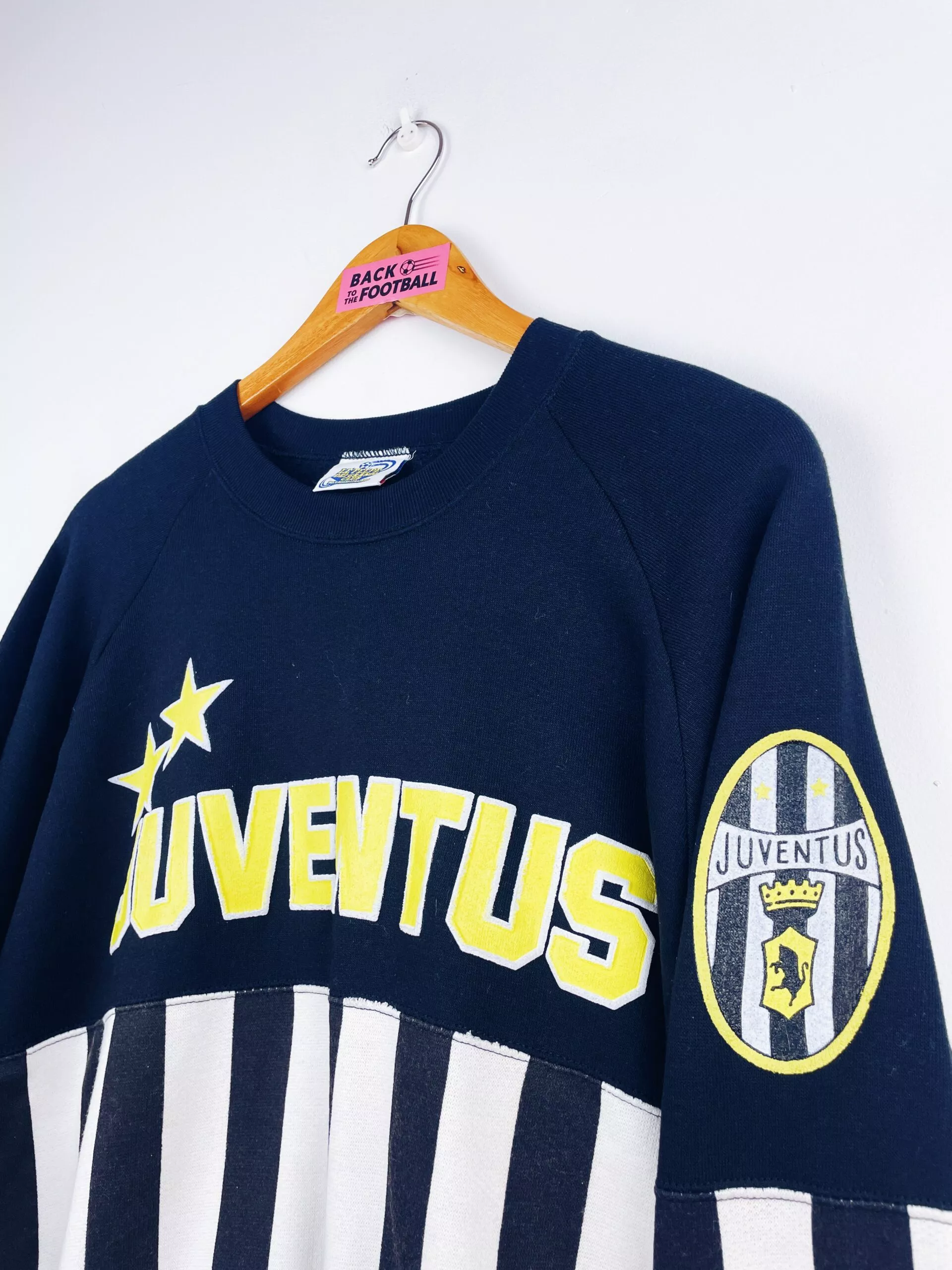 Taille : M Largeur : 56cm (aisselle à aisselle) Longueur : 66cm (base du col au bas) Si tu veux plus de détails, tu peux nous contacter par mail ou sur les réseaux 😉 Etat : 7.5/10, très bon état général, trace au bout d’une manche, bouloches (voir photo) Le sweat : sweatshirt vintage de la Juventus 1990/1991. L’écusson et la mention « Juventus » sont en flocage épais. Très beau sweat rétro de la Juventus ! Histoire : les Bianconeri terminent à la 7ème place de Serie A. Ils seront éliminés en quart de Coupe d’Italie et en demi de Coupe…