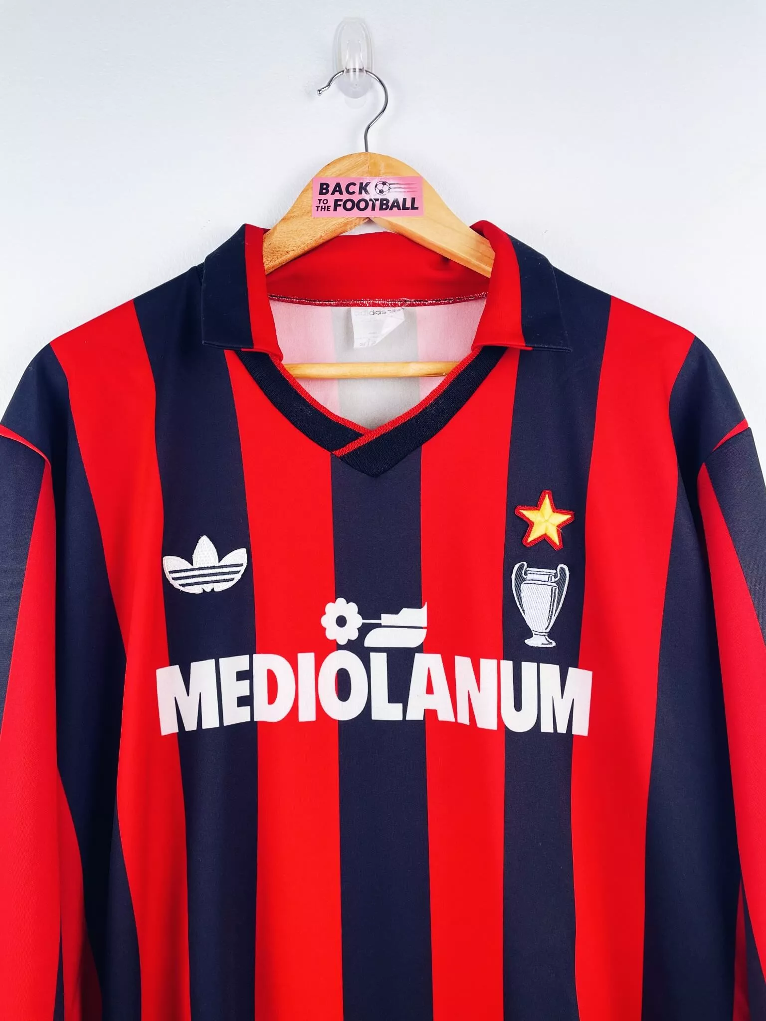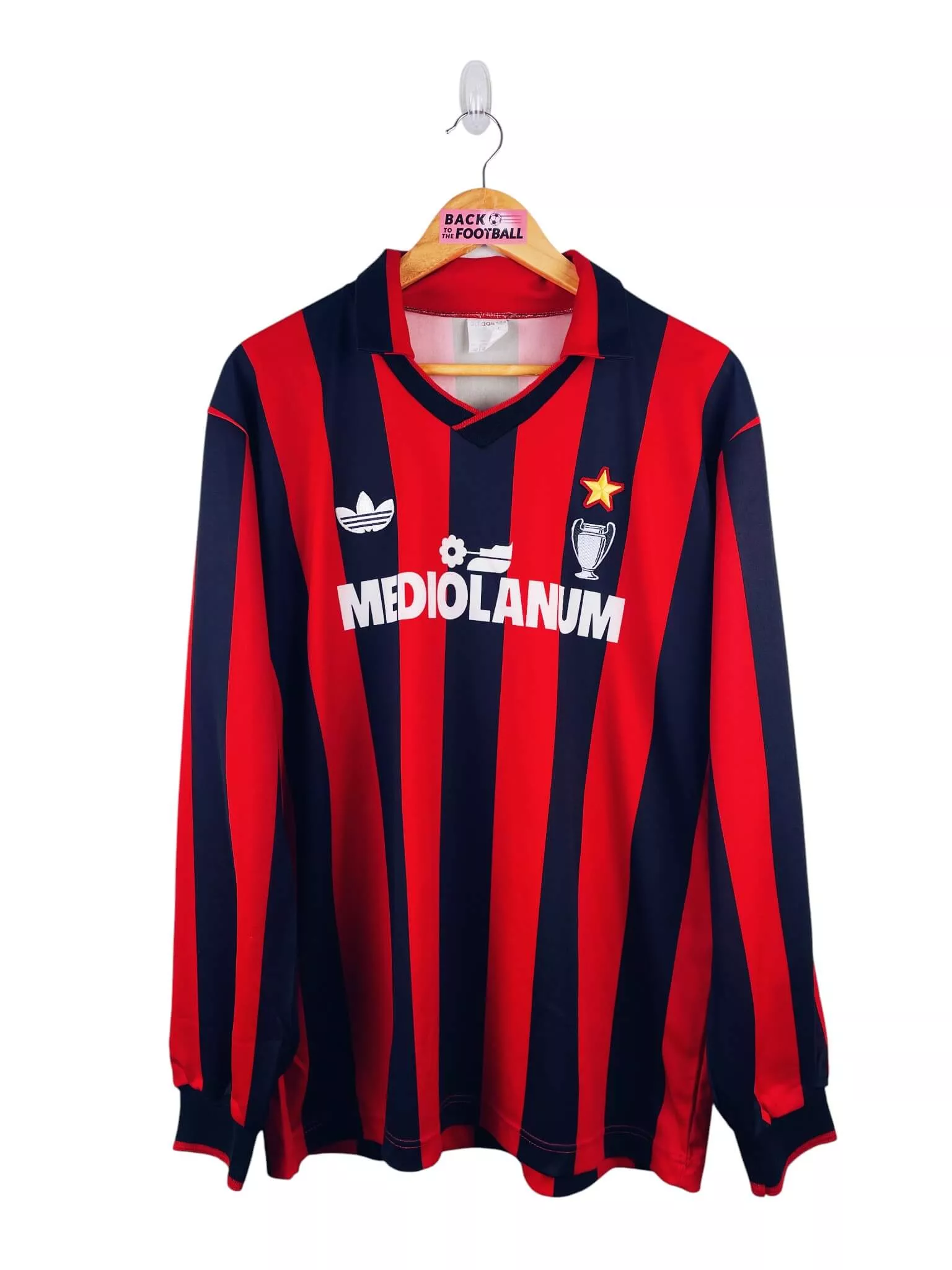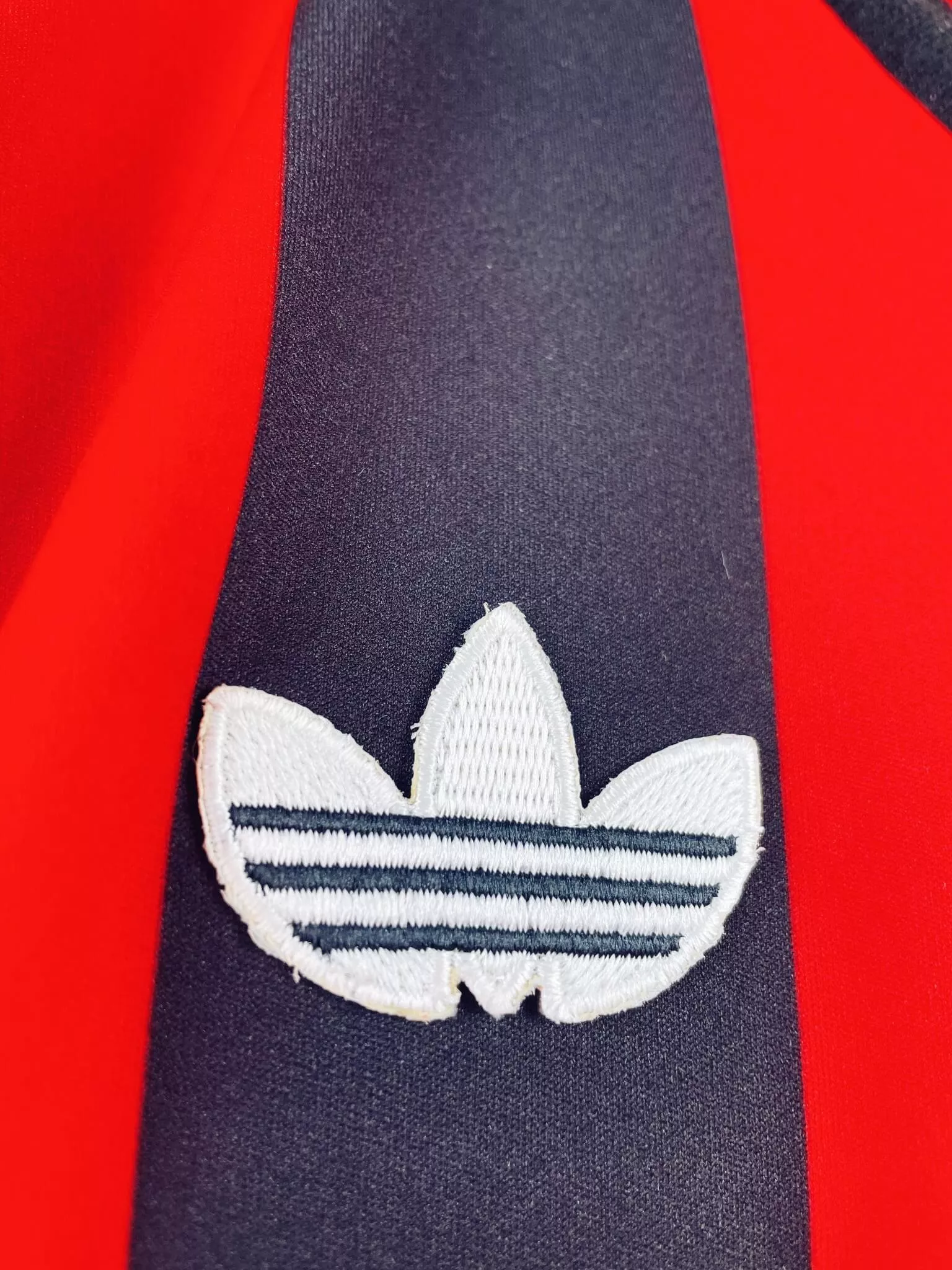 Taille : L Largeur : 54cm (aisselle à aisselle) Longueur : 73cm (base du col au bas) Si tu veux plus de détails, tu peux nous contacter par mail ou sur les réseaux 😉 Etat : 9/10, excellent état Le maillot : maillot vintage domicile AC Milan 1990/1991 manches longues. L’étoile, le logo de la Ligue des Champions et le logo Adidas Trefoil sont brodés, le sponsor Mediolanum est incrusté. Made in Italy. Très beau maillot rétro du Milan AC ! Histoire : après leur énorme saison 89/90, les Rossoneri termineront 2èmes de Serie A, seront éliminés en demi de…