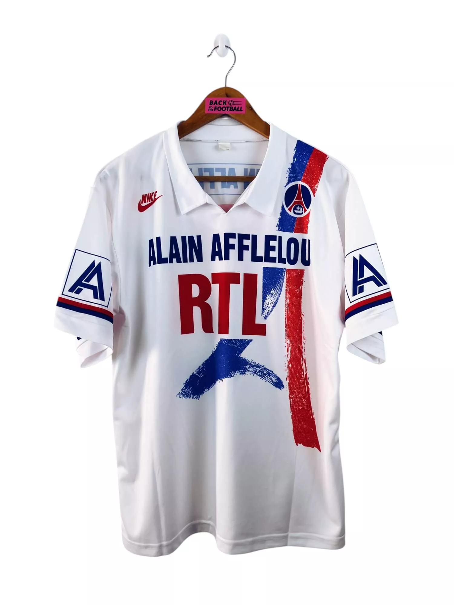 Taille : M Largeur : 52cm (aisselle à aisselle) Longueur : 69cm (base du col au bas) Si tu veux plus de détails, tu peux nous contacter par mail ou sur les réseaux 😉 Etat : 9/10, excellent état Le maillot : maillot vintage domicile du PSG 1990/1991 floqué du numéro 9. L’écusson, le logo Nike et les sponsors RTL et Alain Afflelou sont incrustés. Très beau maillot rétro du Paris Saint Germain ! Histoire : saison moyenne des parisiens qui terminent 9èmes de Division 1. Ils seront éliminés en huitièmes de Coupe de France face à l’OM. Susic et…