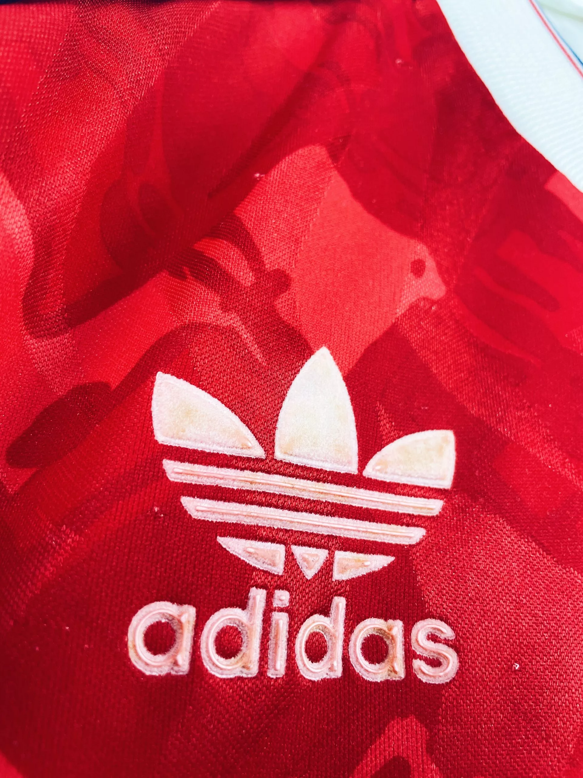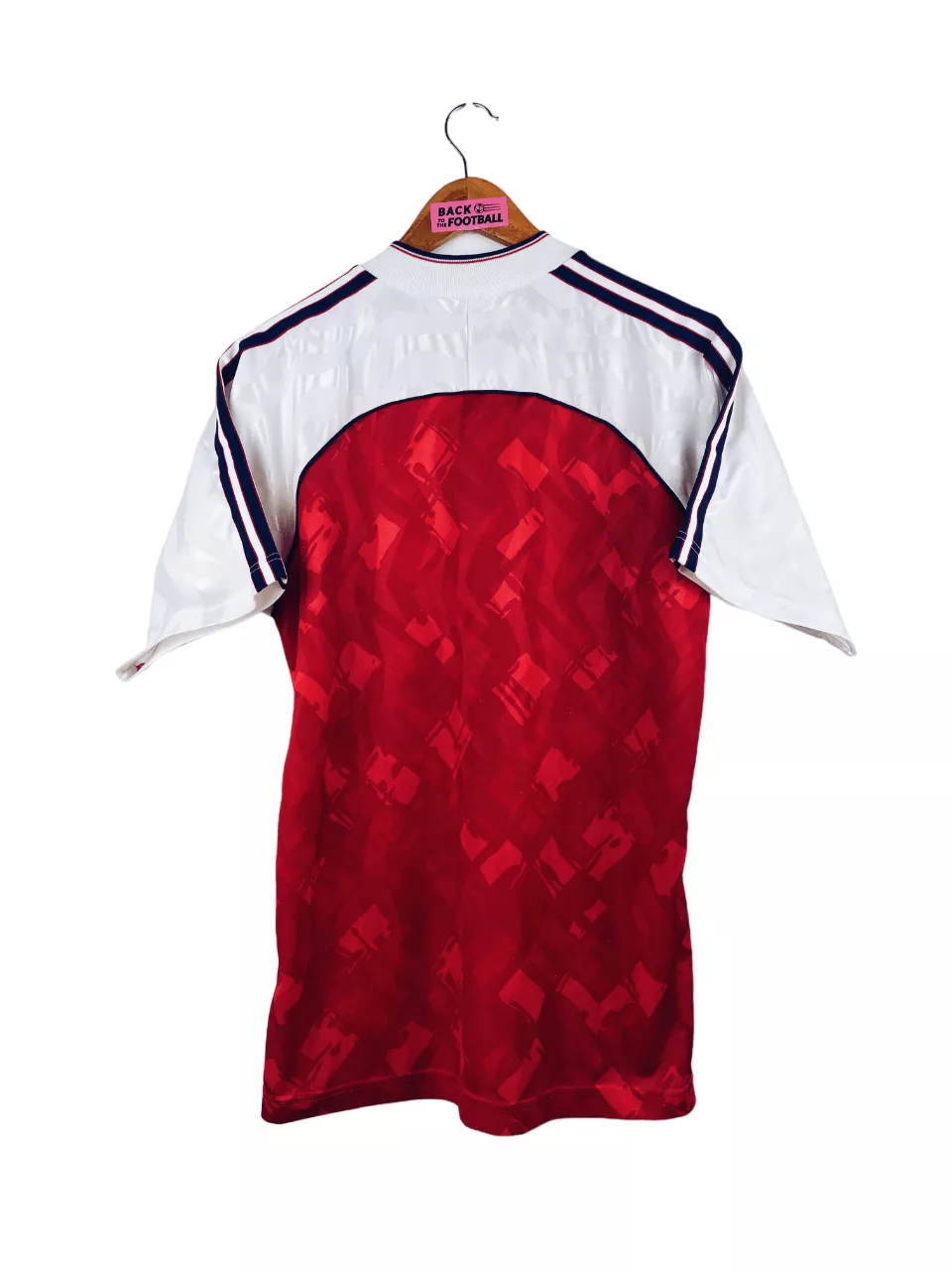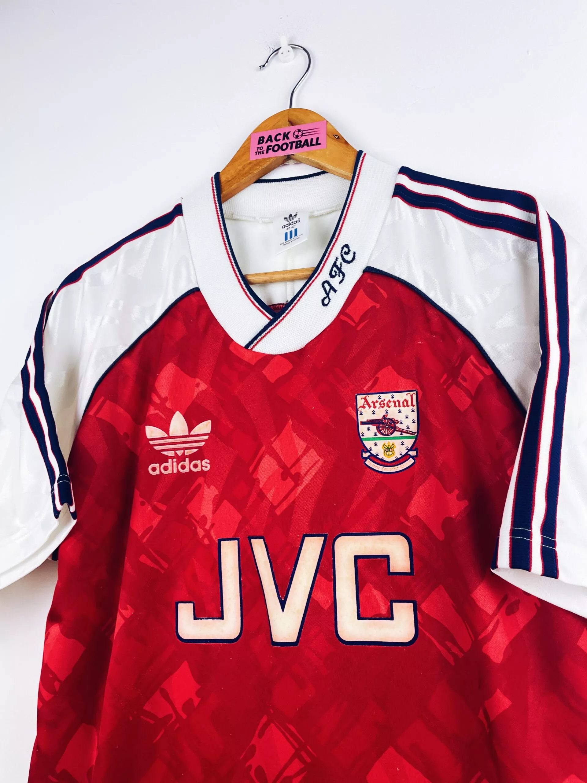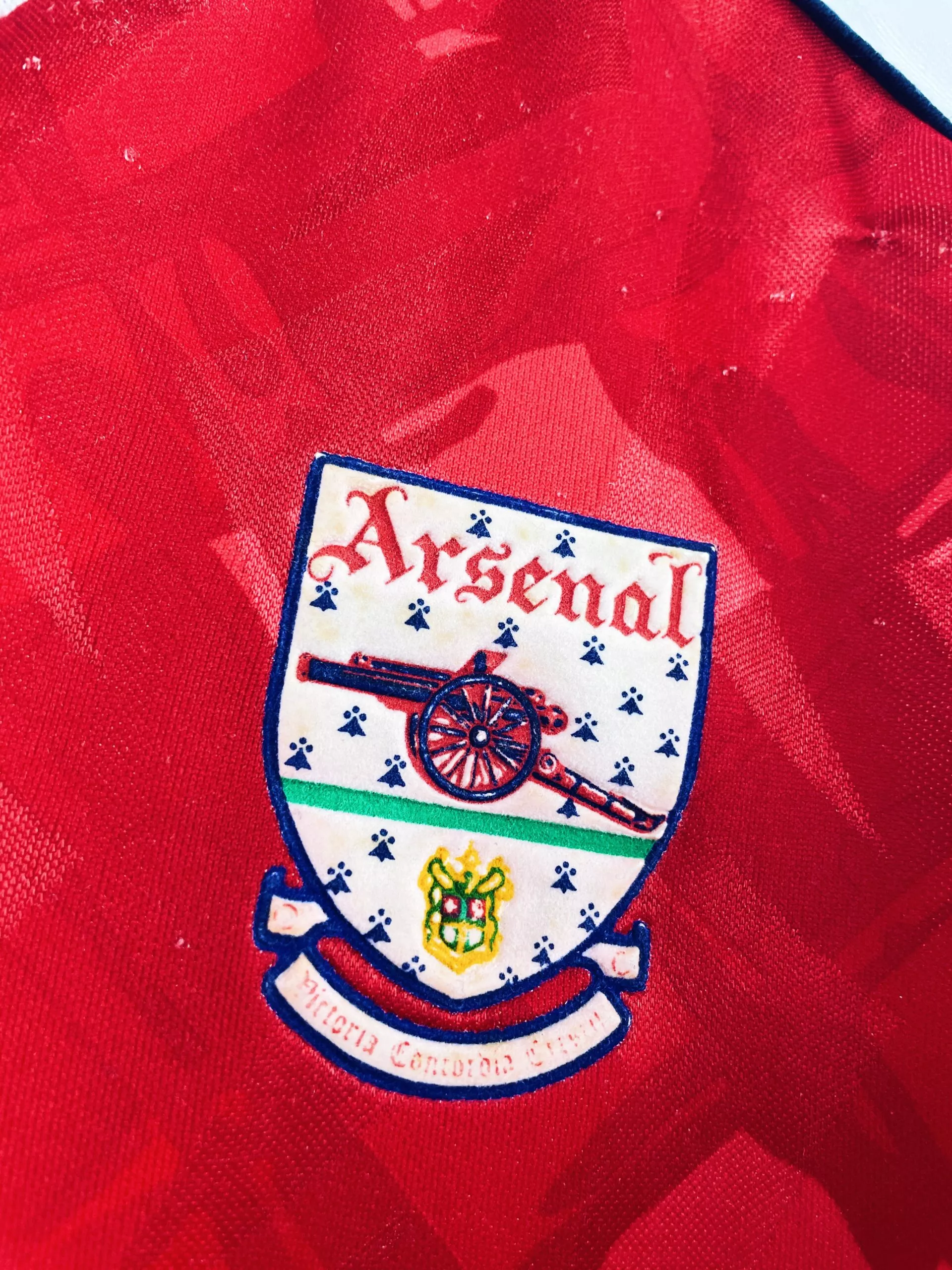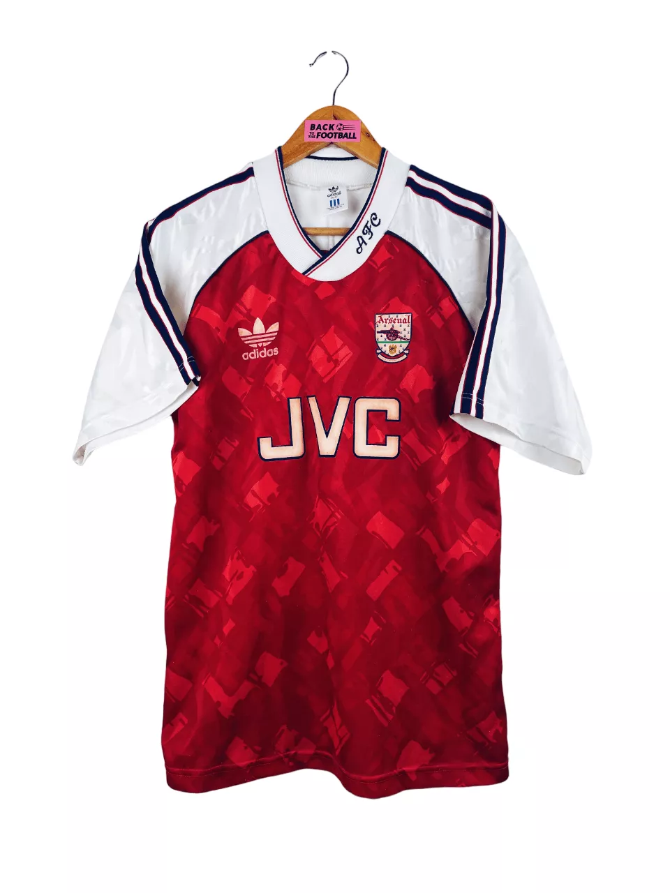 Taille : L Si tu veux plus de détails, tu peux nous contacter par mail ou sur les réseaux 😉 Etat : 7.5/10, très bon état général, mais beaucoup de bouloches (voir photos) Le maillot : maillot vintage domicile d’Arsenal 1990/1992. L’écusson, le logo Adidas et le sponsor JVC sont en feutrine. Les motifs sont magnifiques. Très beau maillot rétro d’Arsenal ! Histoire : la première saison, les Gunners remportent la Premier League devant Liverpool. Ils iront jusqu’en demi de FA Cup mais seront éliminés par le rival Tottenham… Alan Smith marquera 27 buts. La saison suivante, les Londonniens n’arriveront…